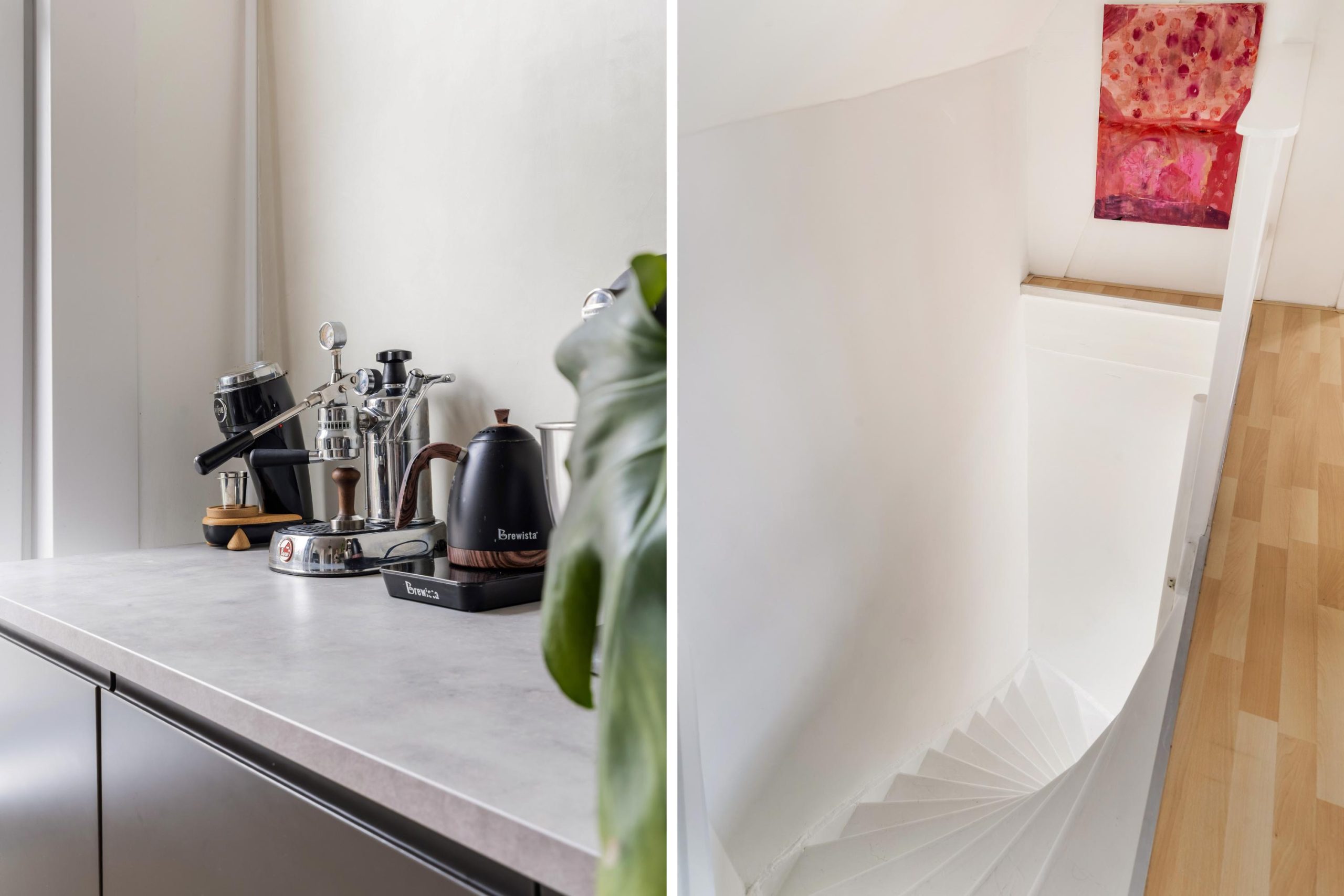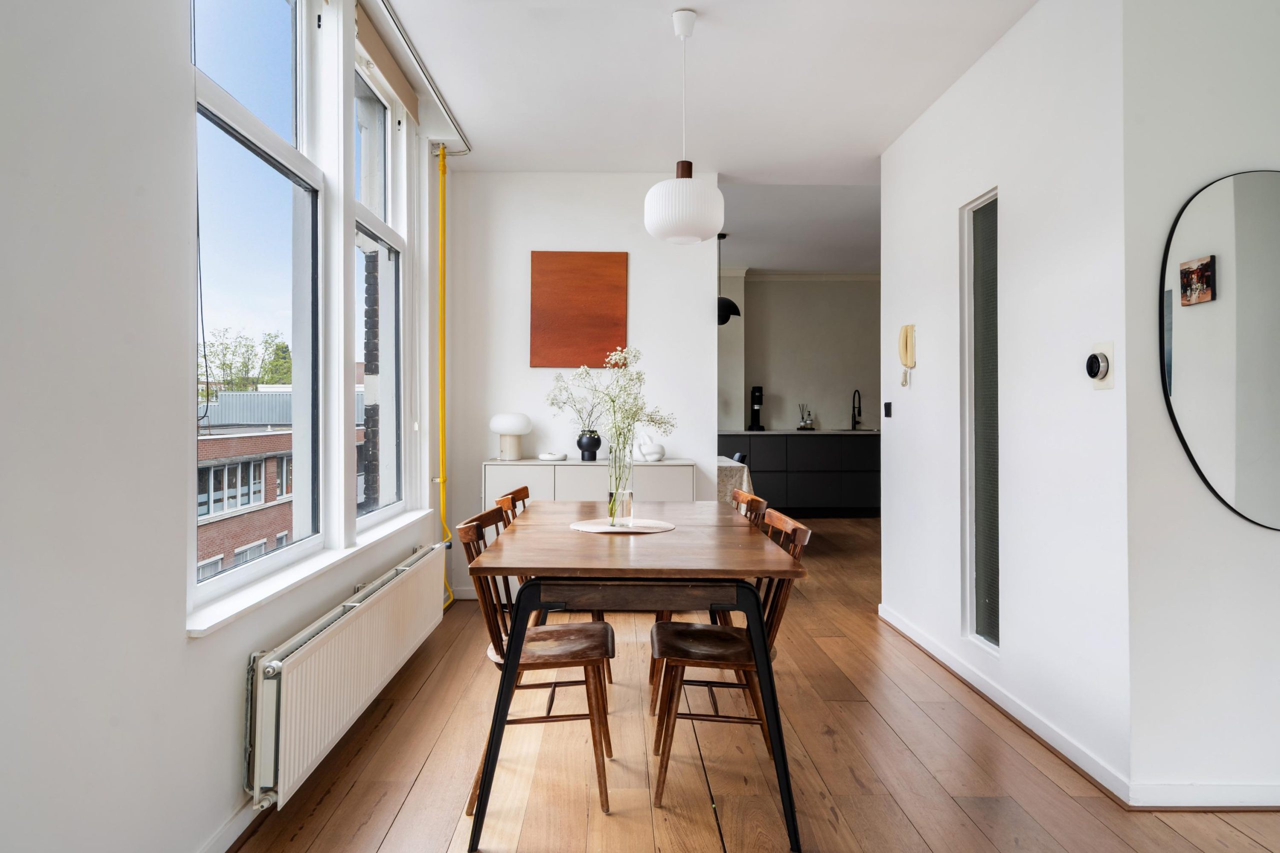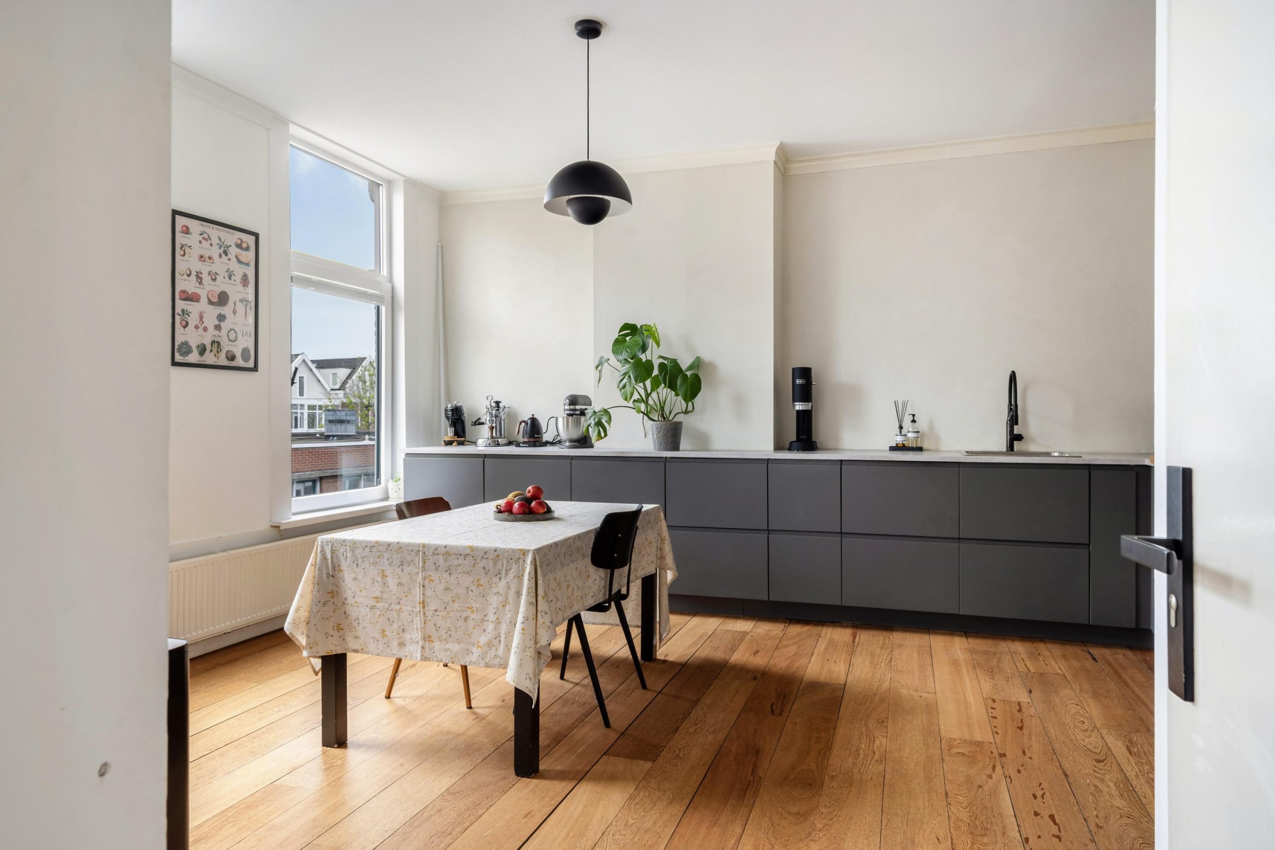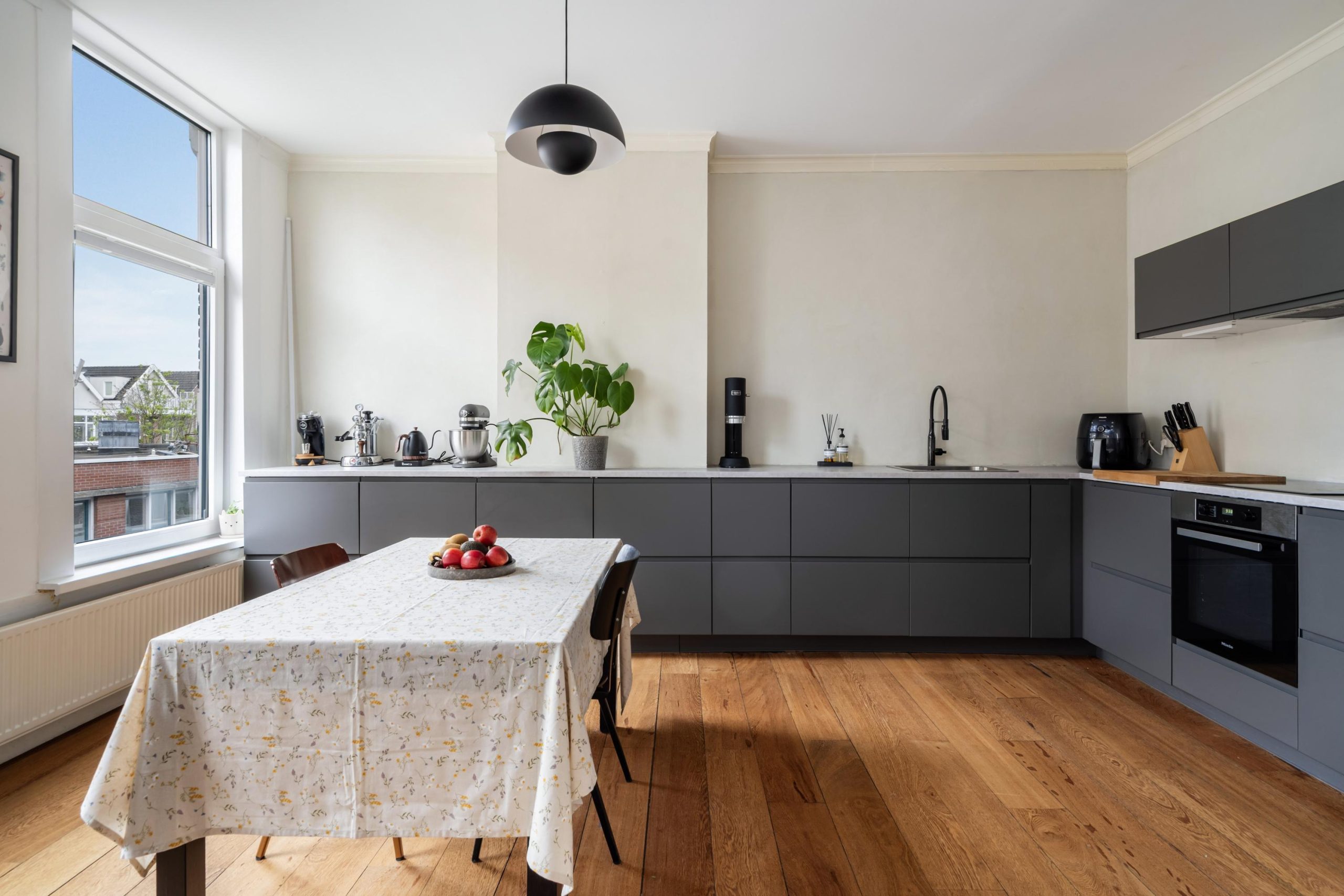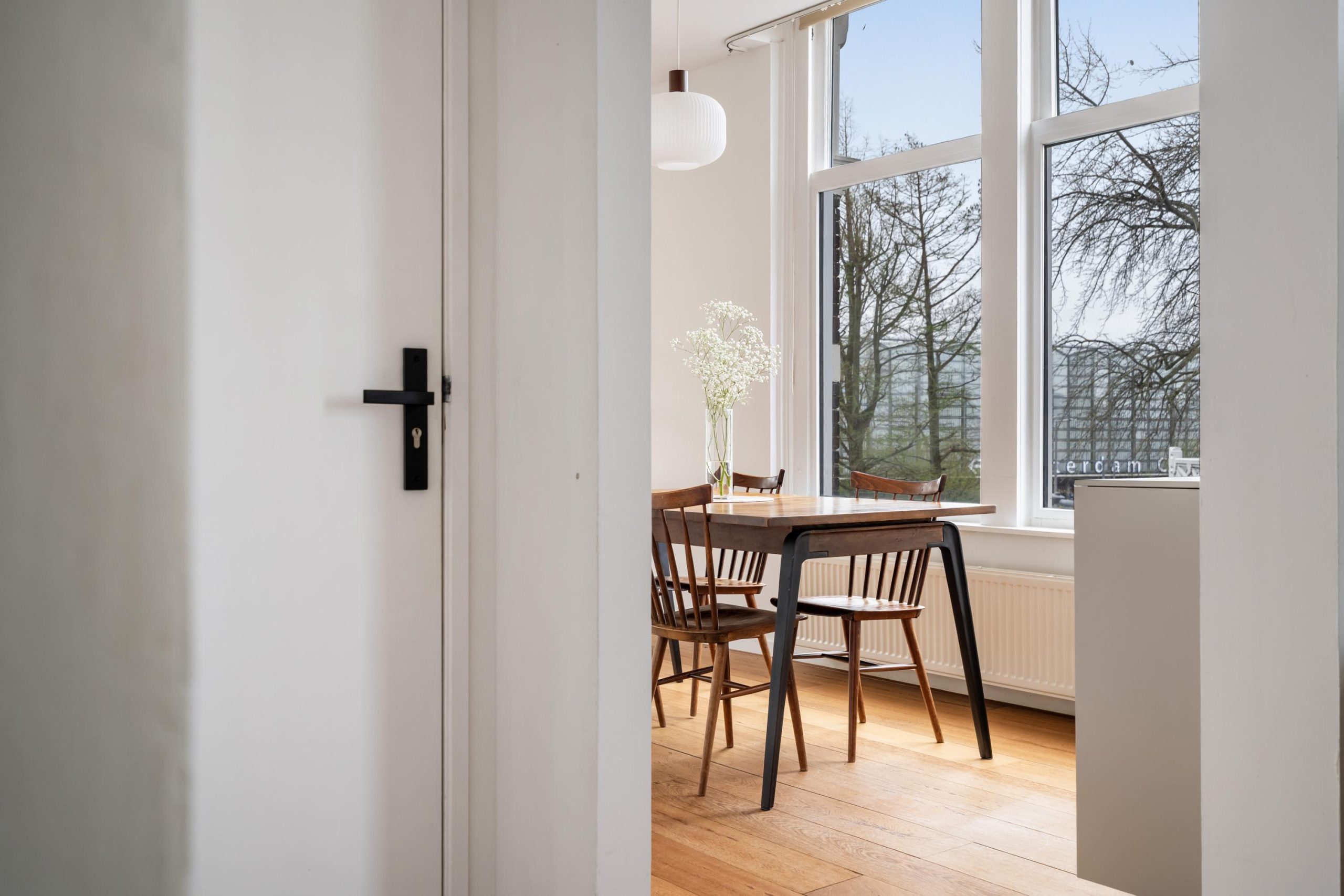 Overloop met toegang tot het woongedeelte. Je komt binnen in de ruime eetkamer met open keuken. Deze fijne ruimte beschikt over grote raampartijen, waardoor er veel licht de woning binnentreedt. Er is ook voldoende ruimte voor een grote eettafel, waar met een groot gezelschap gedineerd kan worden. De moderne keuken beschikt over diverse soorten inbouwapparatuur zoals een 4-pits elektrische kookplaat met afzuigkap, oven, vaatwasser en voldoende opbergruimte. Het zitgedeelte is gelegen aan de voorzijde. Door de hoekligging, in combinatie met de grote raampartijen en de speelse indeling, ontstaat een heerlijk licht en sfeervol woongedeelte. De karakteristieke erker aan de voorzijde is een echte eyecatcher. Dit is een prachtige plek met uitzicht over de singel waar je heerlijk kunt zitten, werken of ontspannen.