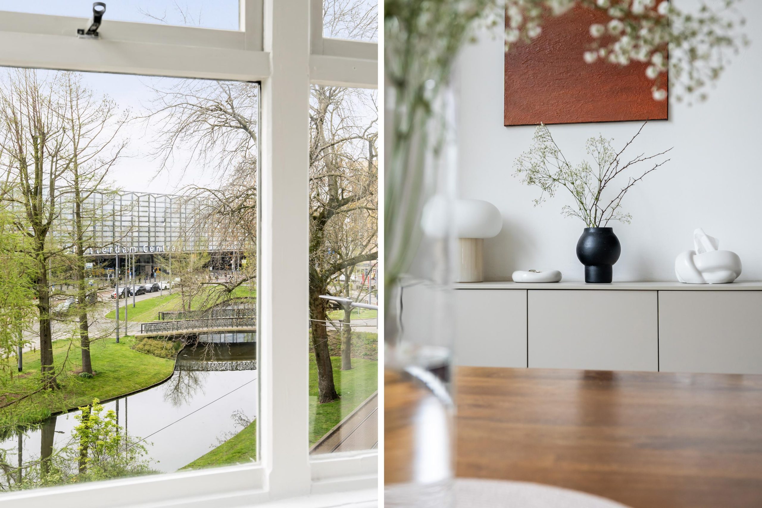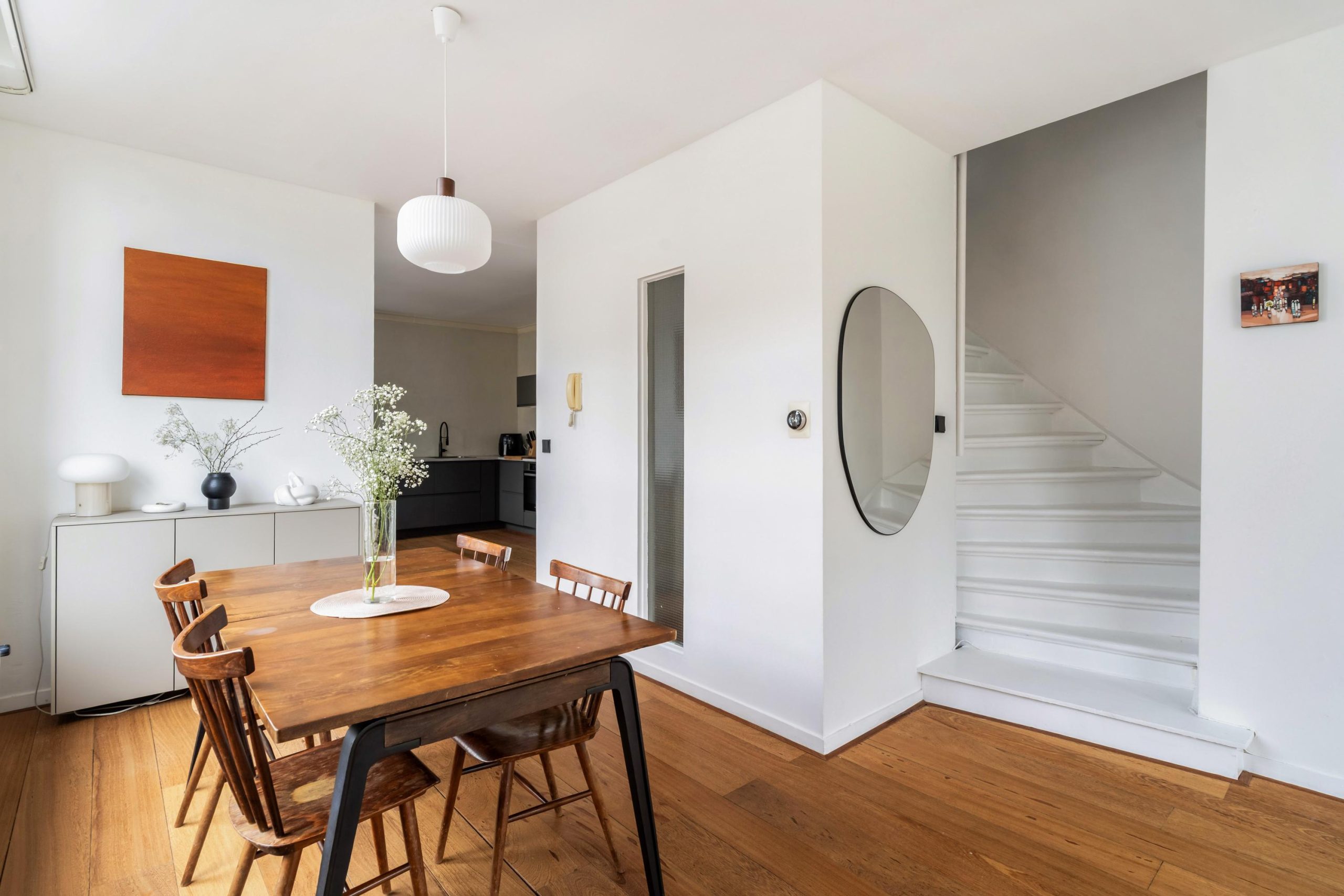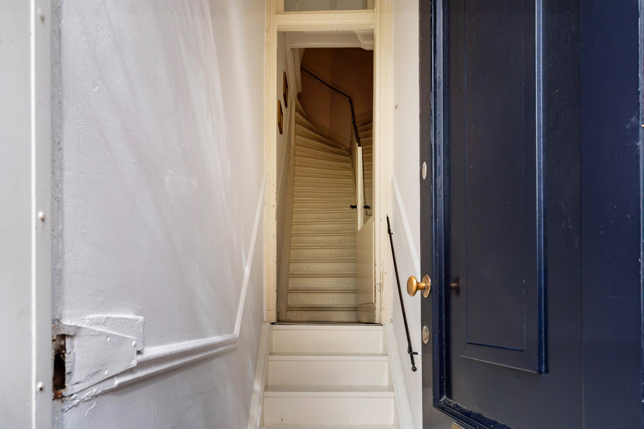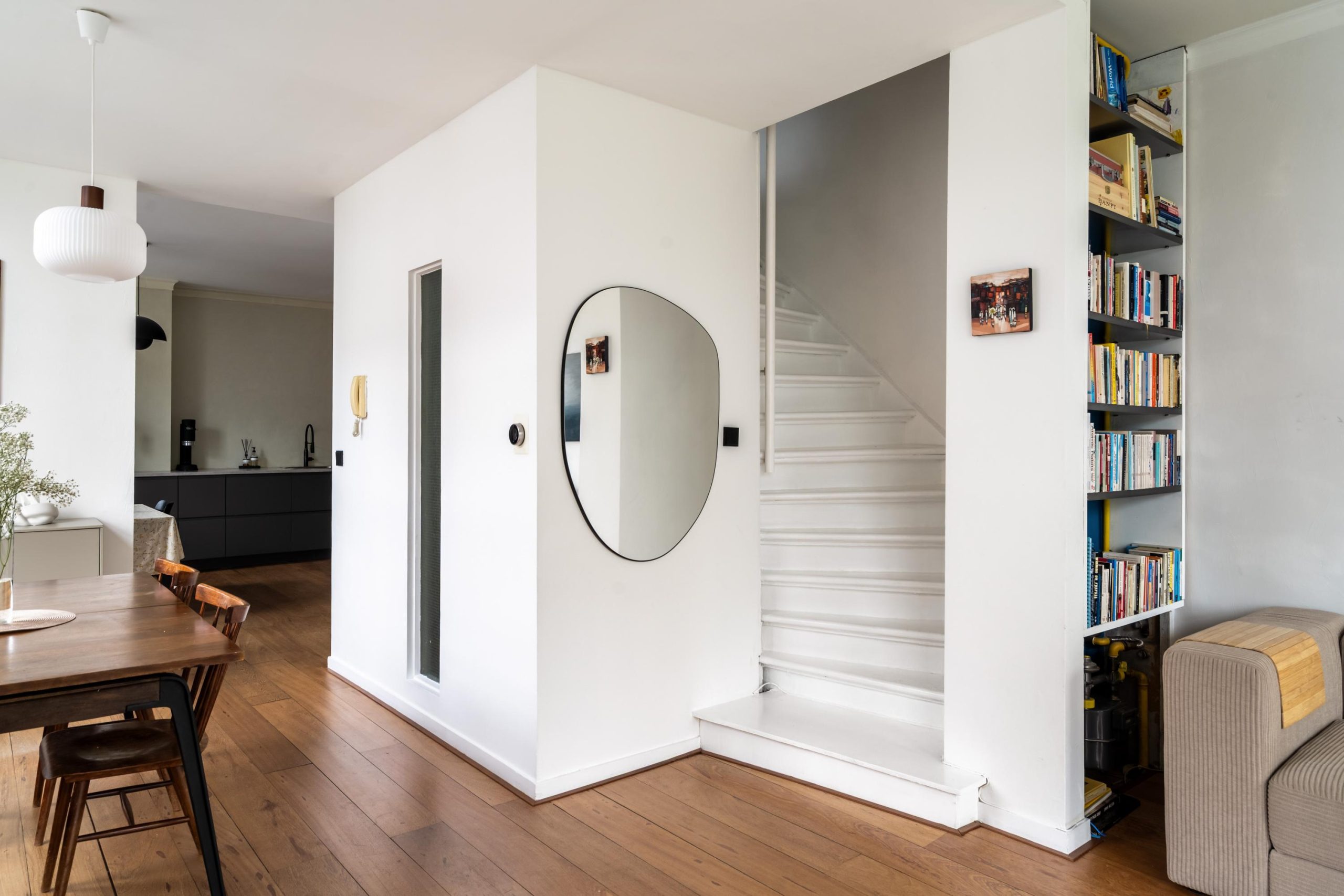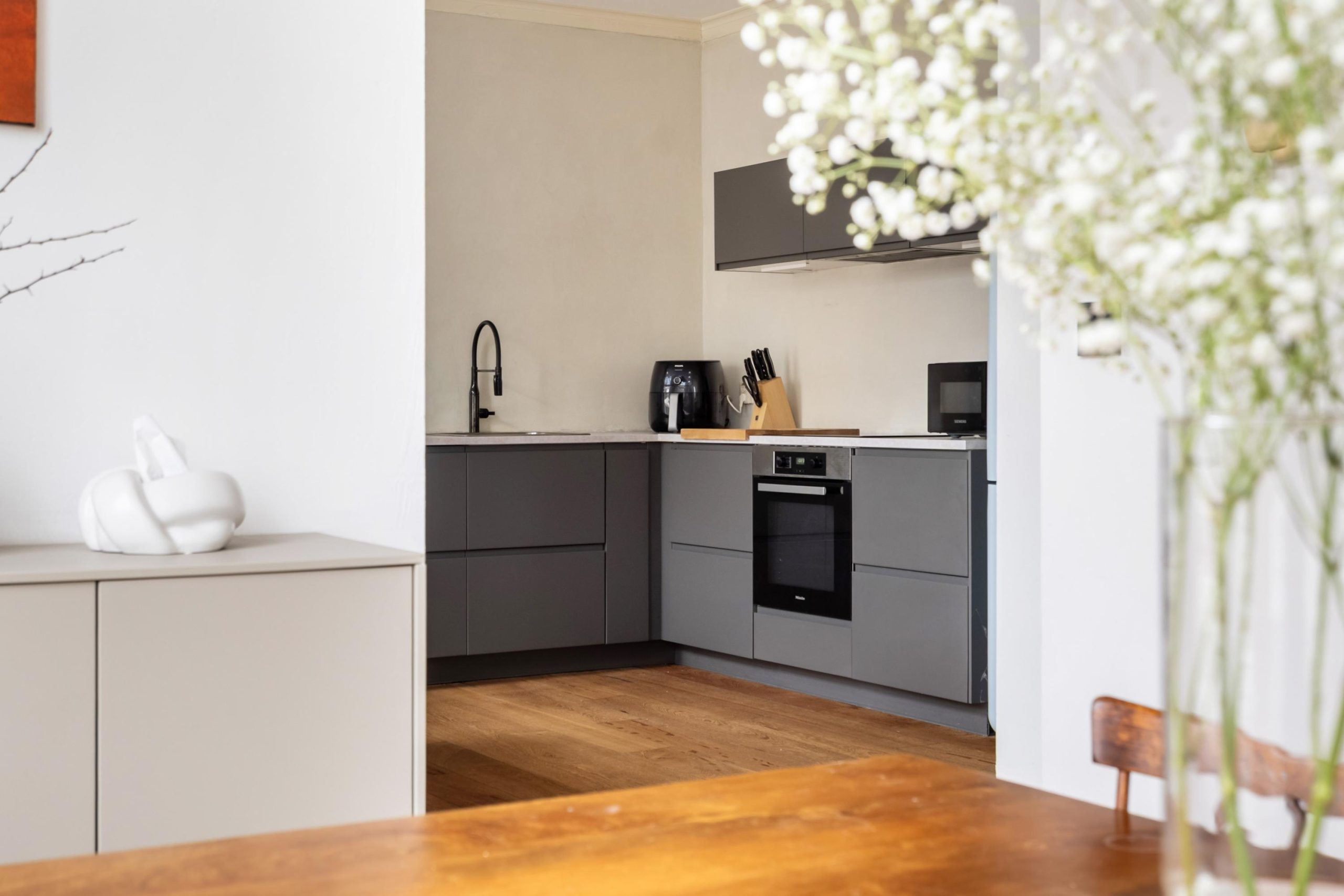 Overloop met toegang tot het woongedeelte. Je komt binnen in de ruime eetkamer met open keuken. Deze fijne ruimte beschikt over grote raampartijen, waardoor er veel licht de woning binnentreedt. Er is ook voldoende ruimte voor een grote eettafel, waar met een groot gezelschap gedineerd kan worden. De moderne keuken beschikt over diverse soorten inbouwapparatuur zoals een 4-pits elektrische kookplaat met afzuigkap, oven, vaatwasser en voldoende opbergruimte. Het zitgedeelte is gelegen aan de voorzijde. Door de hoekligging, in combinatie met de grote raampartijen en de speelse indeling, ontstaat een heerlijk licht en sfeervol woongedeelte. De karakteristieke erker aan de voorzijde is een echte eyecatcher. Dit is een prachtige plek met uitzicht over de singel waar je heerlijk kunt zitten, werken of ontspannen.