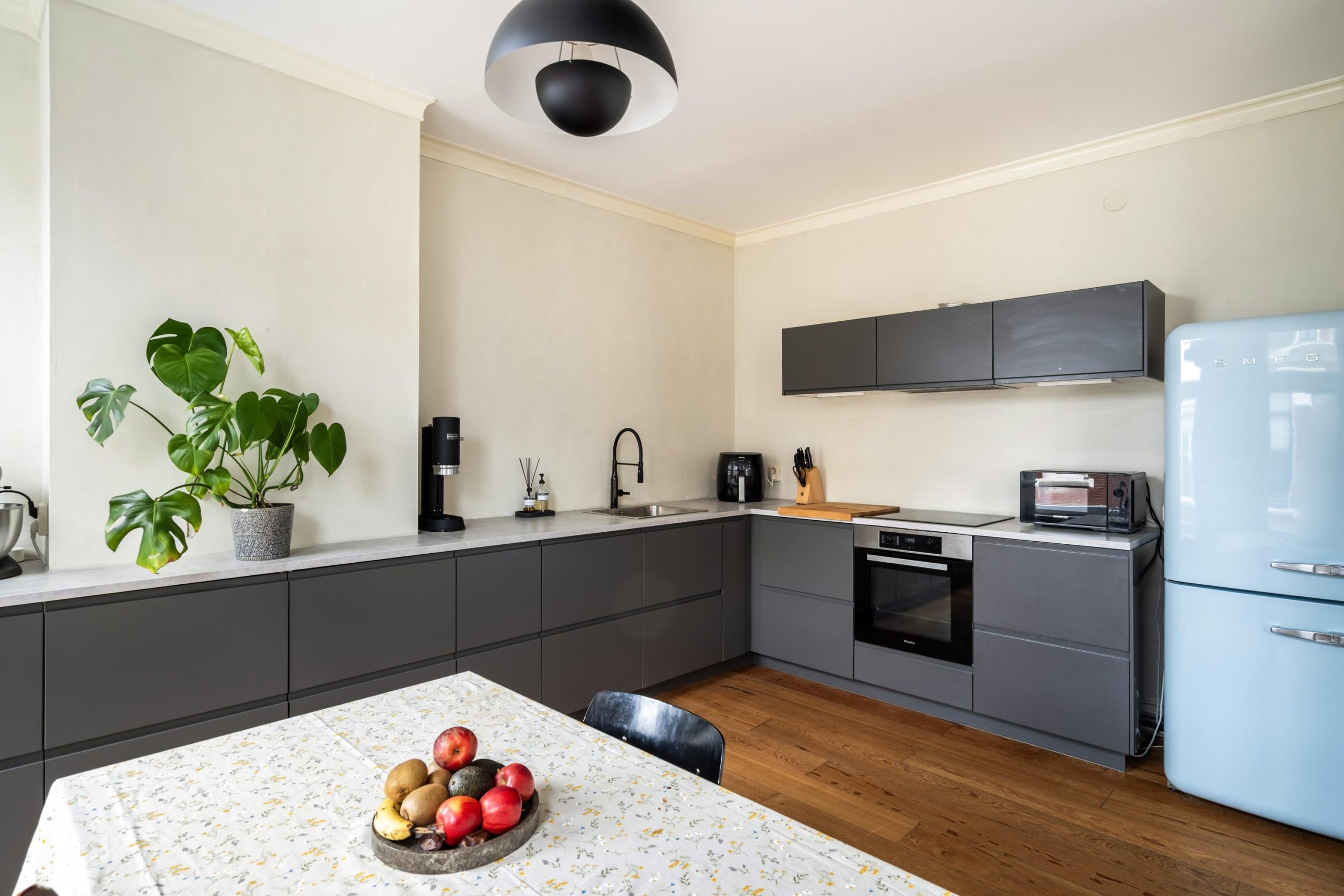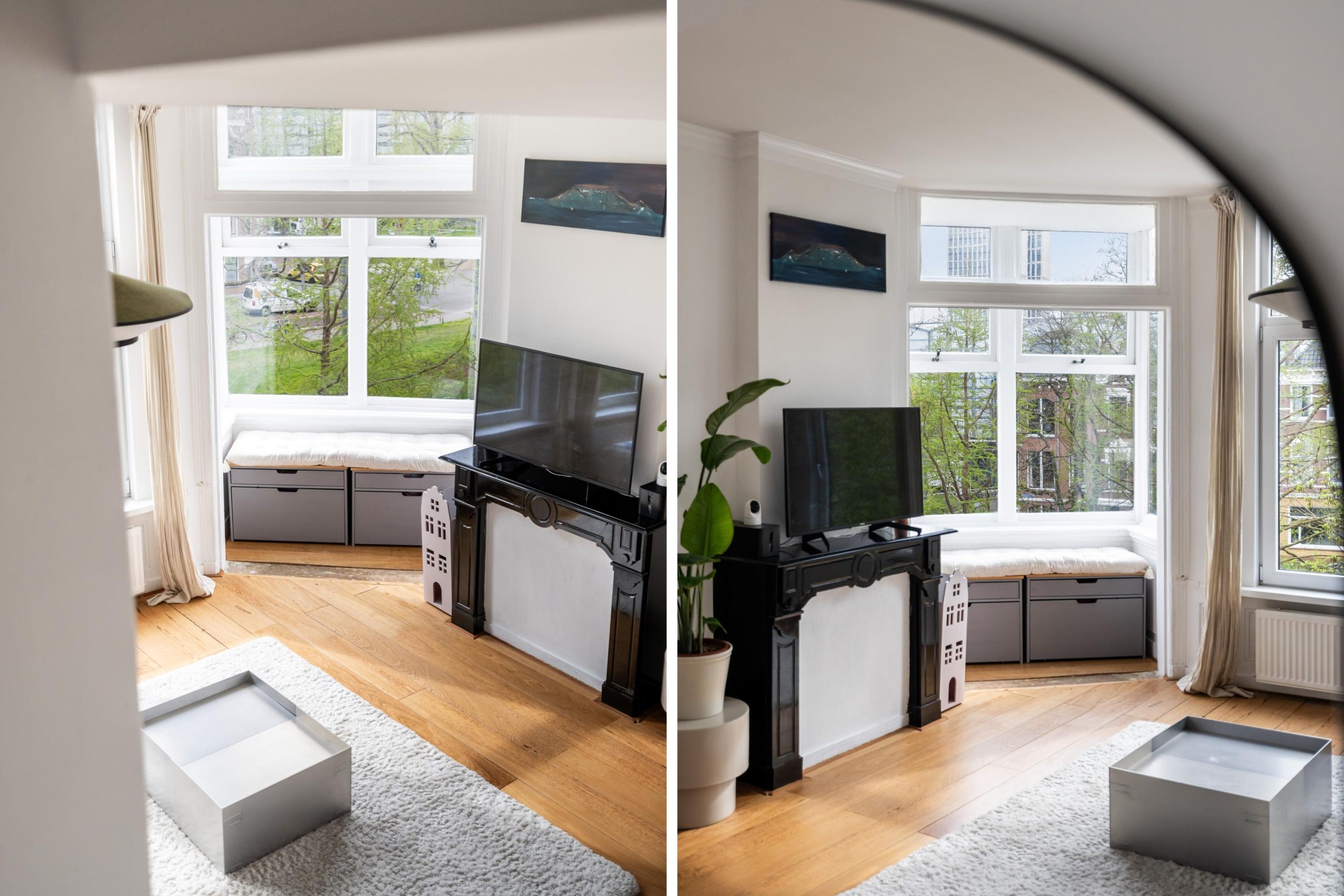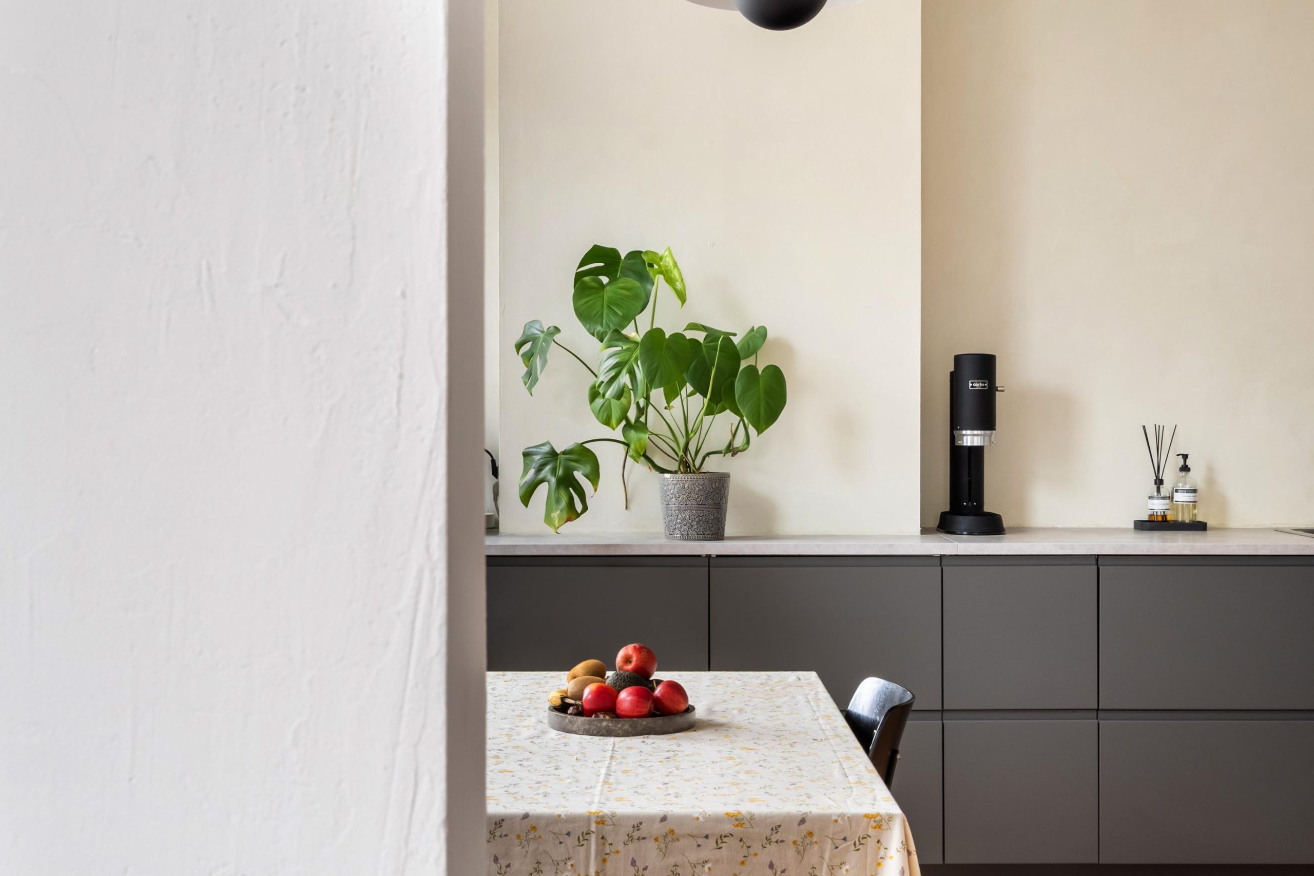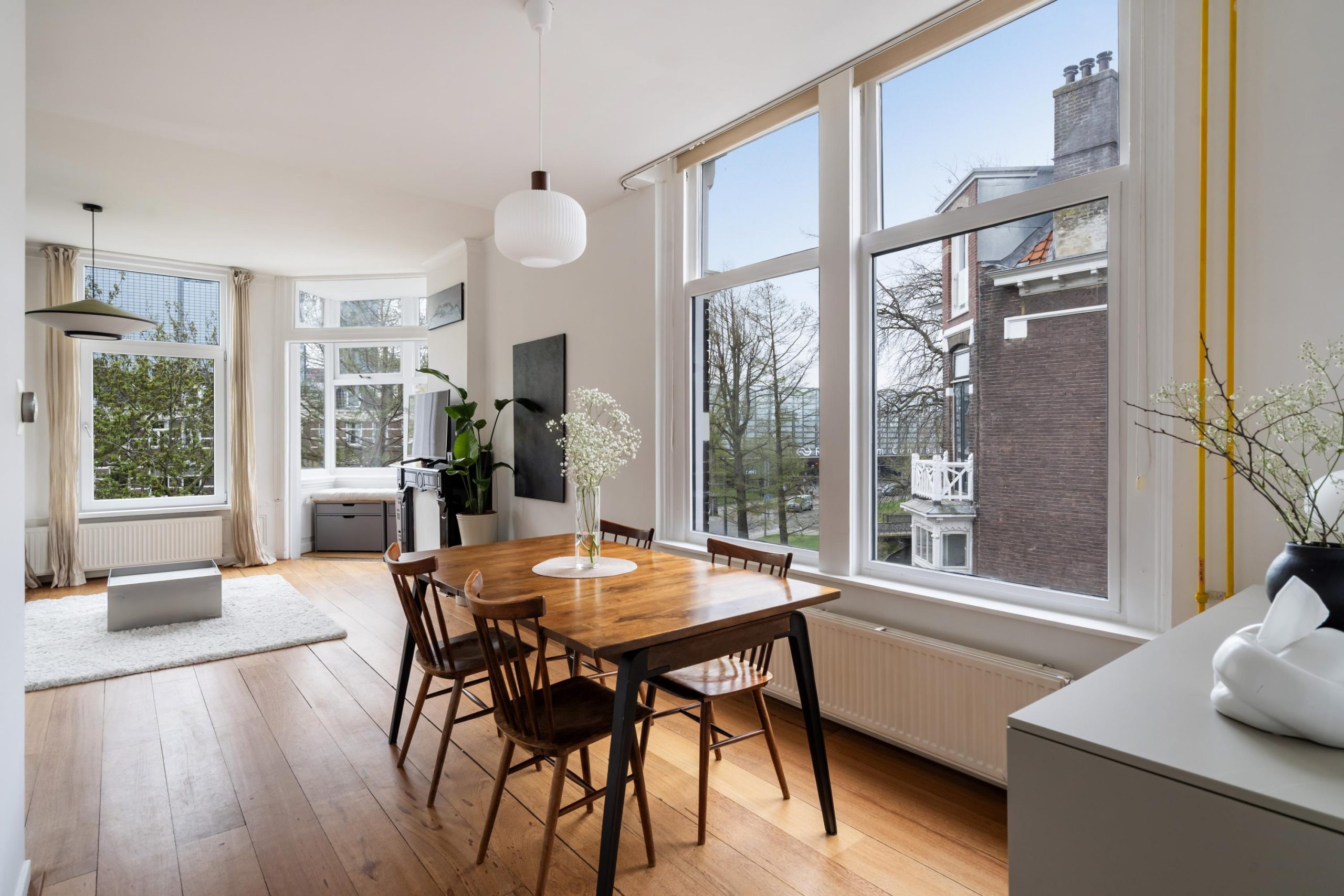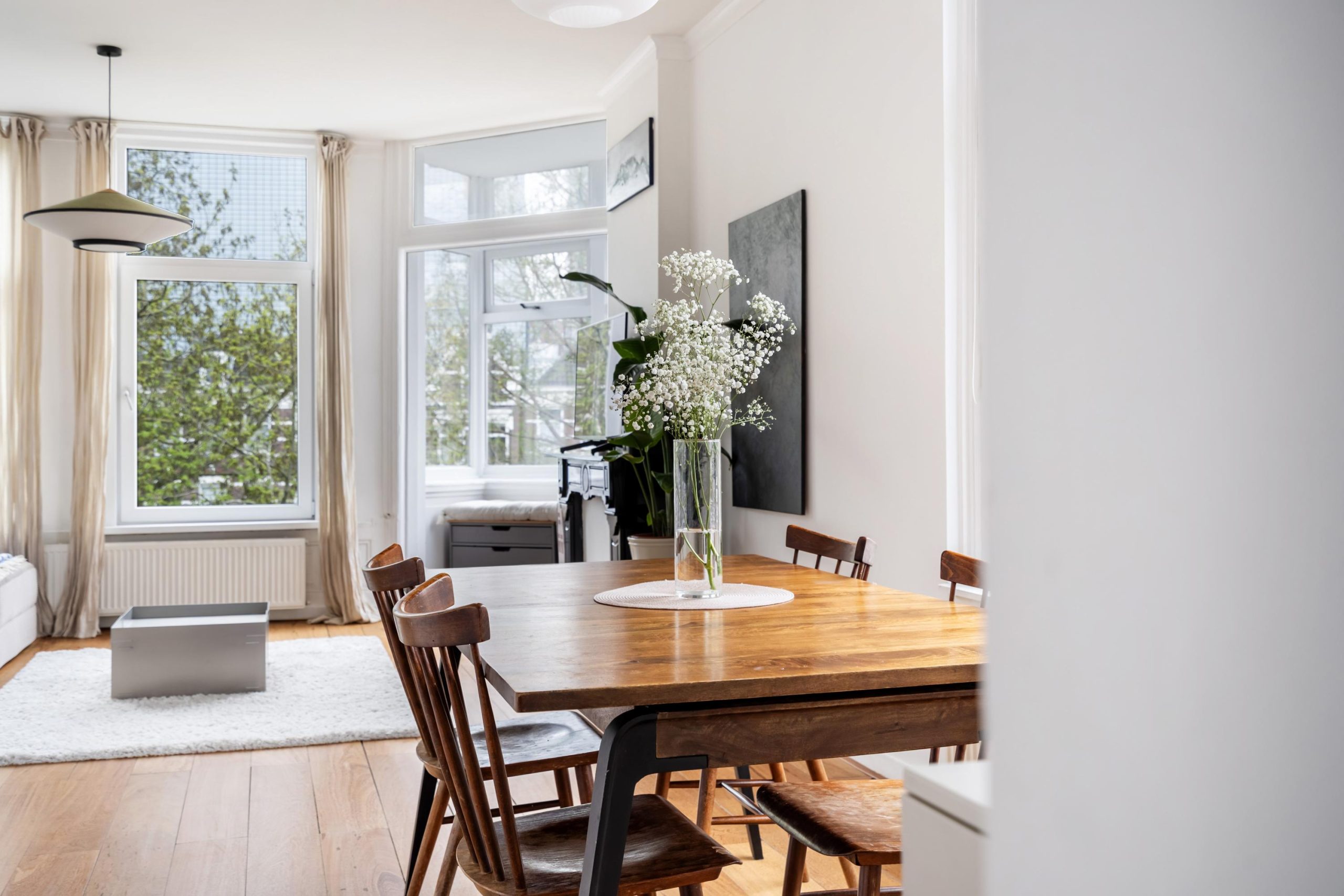 Overloop met toegang tot het woongedeelte. Je komt binnen in de ruime eetkamer met open keuken. Deze fijne ruimte beschikt over grote raampartijen, waardoor er veel licht de woning binnentreedt. Er is ook voldoende ruimte voor een grote eettafel, waar met een groot gezelschap gedineerd kan worden. De moderne keuken beschikt over diverse soorten inbouwapparatuur zoals een 4-pits elektrische kookplaat met afzuigkap, oven, vaatwasser en voldoende opbergruimte. Het zitgedeelte is gelegen aan de voorzijde. Door de hoekligging, in combinatie met de grote raampartijen en de speelse indeling, ontstaat een heerlijk licht en sfeervol woongedeelte. De karakteristieke erker aan de voorzijde is een echte eyecatcher. Dit is een prachtige plek met uitzicht over de singel waar je heerlijk kunt zitten, werken of ontspannen.
