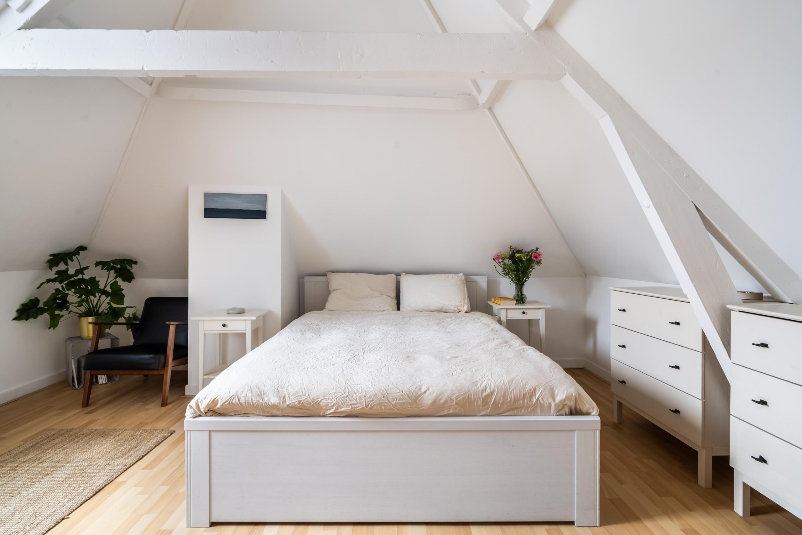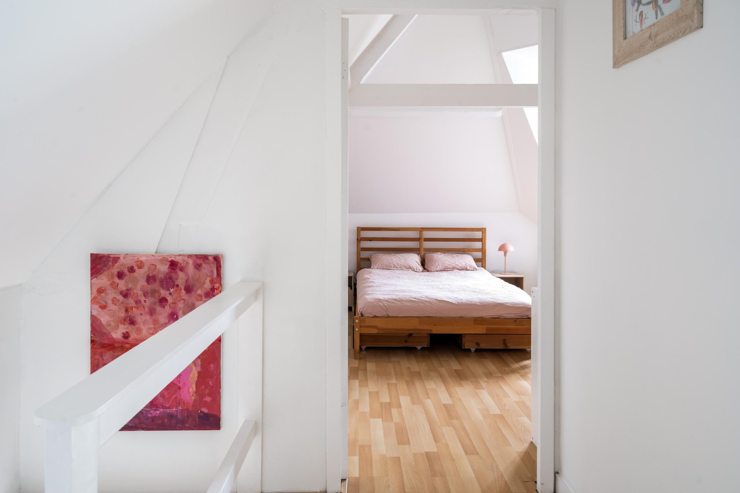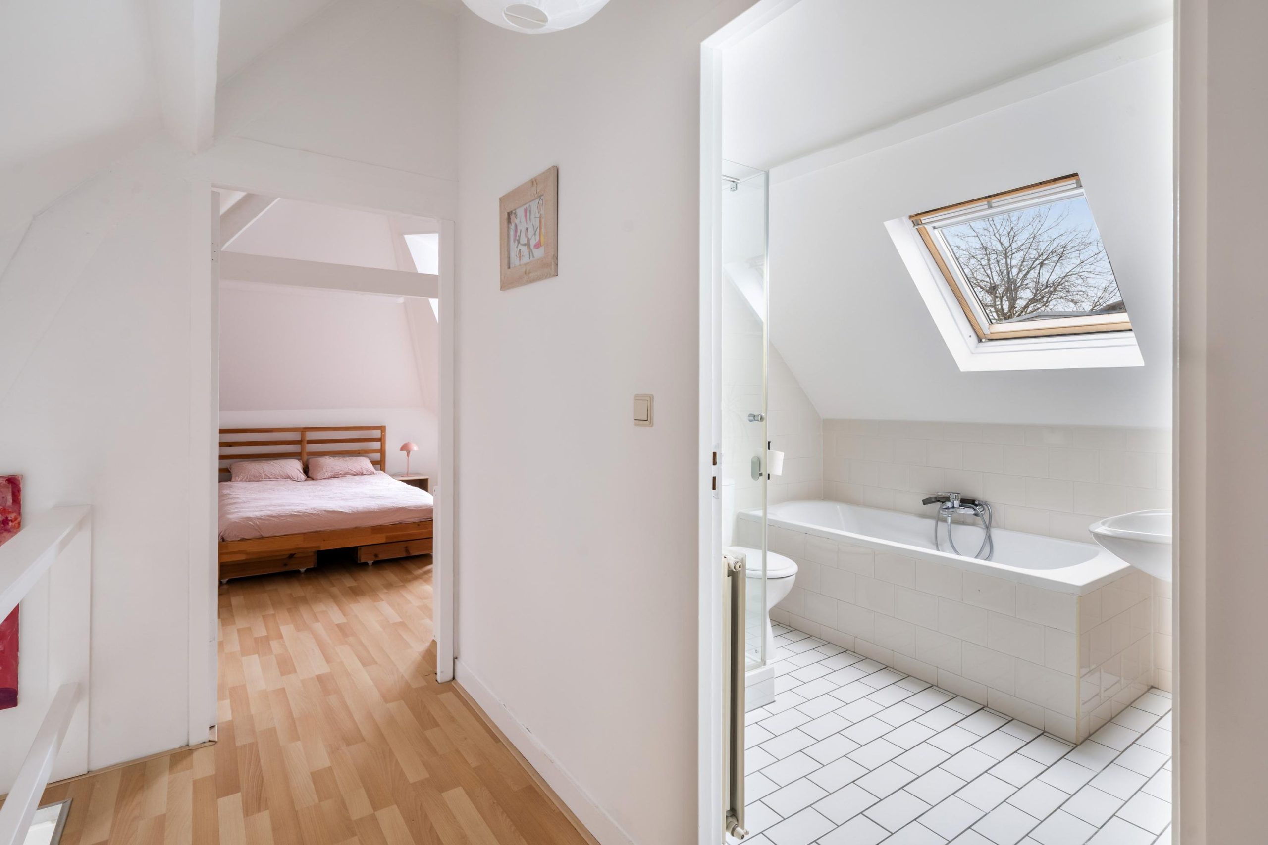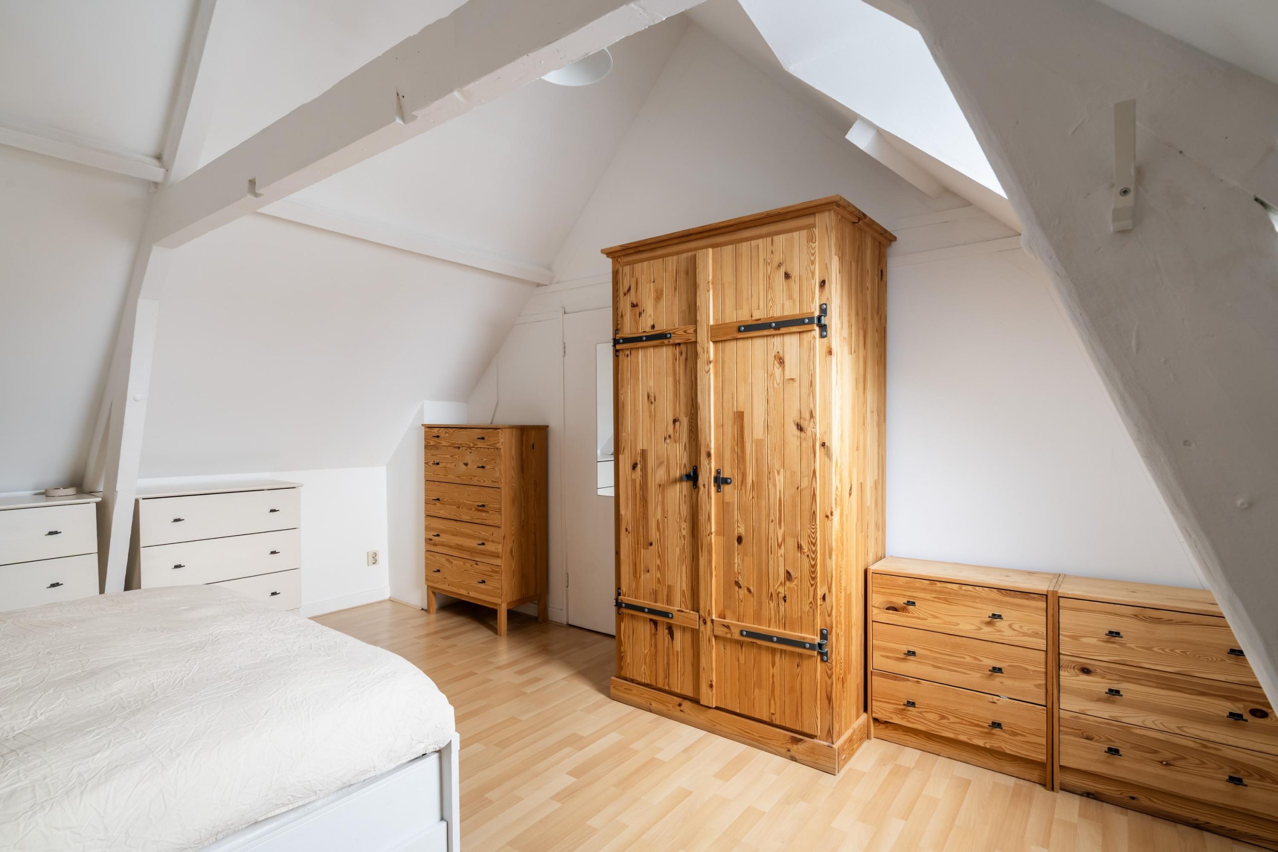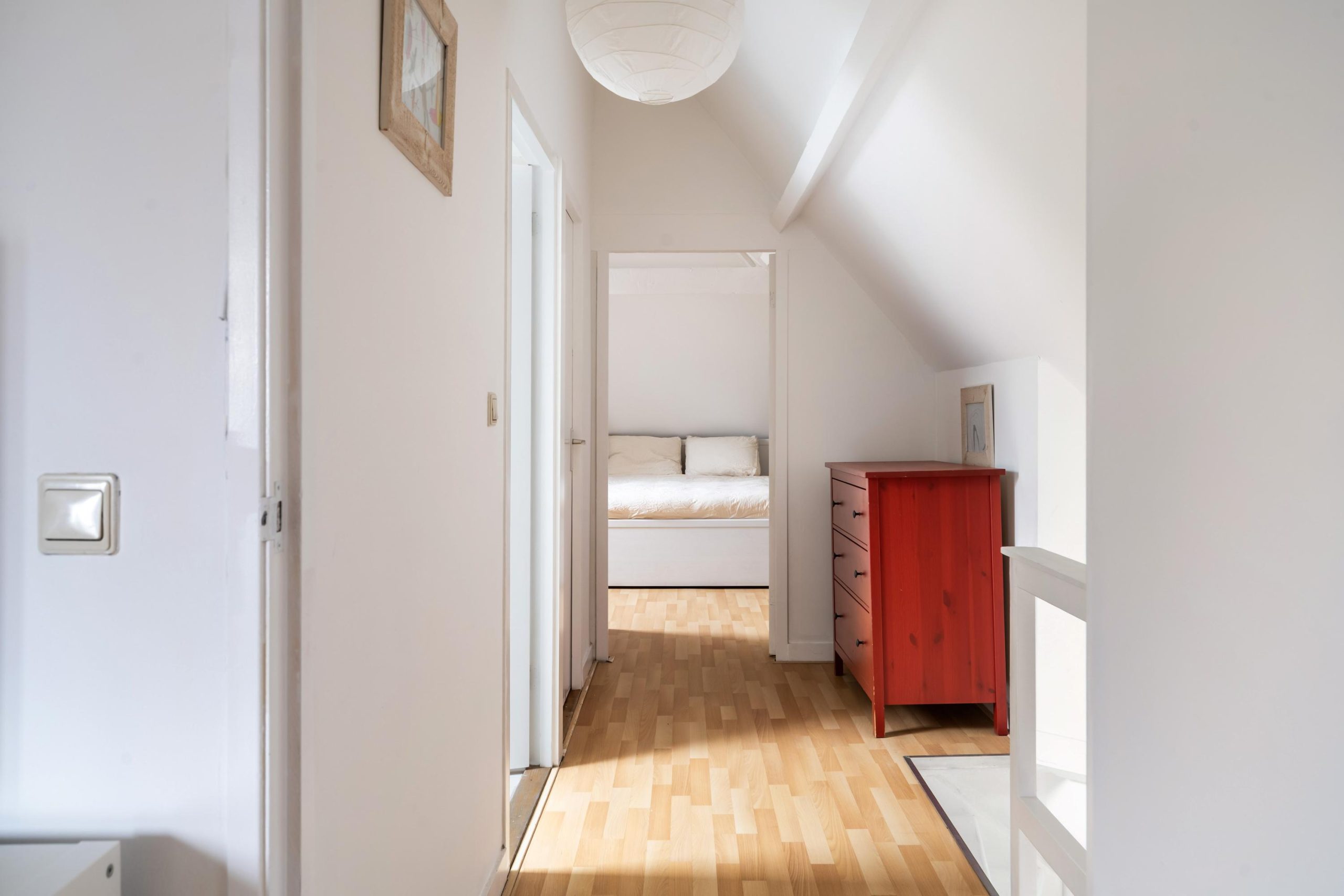 Overloop met berging en toegang tot alle vertrekken op deze verdieping. De 1e slaapkamer aan de achterzijde is erg ruim en beschikt over voldoende ruimte voor een tweepersoonsbed en een kledingkast. Bovendien zorgt de balkenstructuur voor een karakteristieke uitstraling en een warme, sfeervolle sfeer. De 2e slaapkamer is eveneens erg ruim. De volledig betegelde badkamer is voorzien van een toilet, douche, wasmachine-aansluiting, ligbad en wastafel.