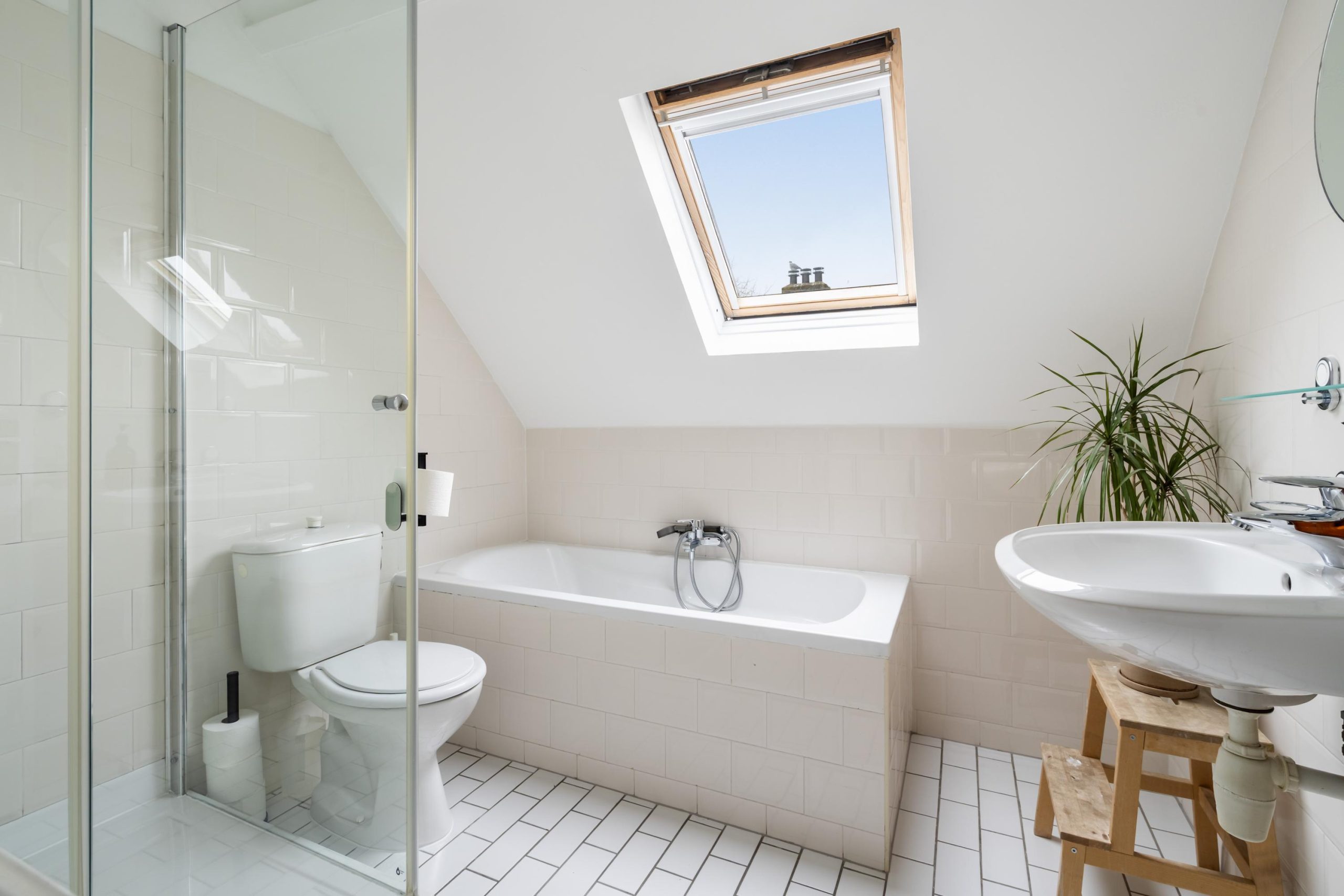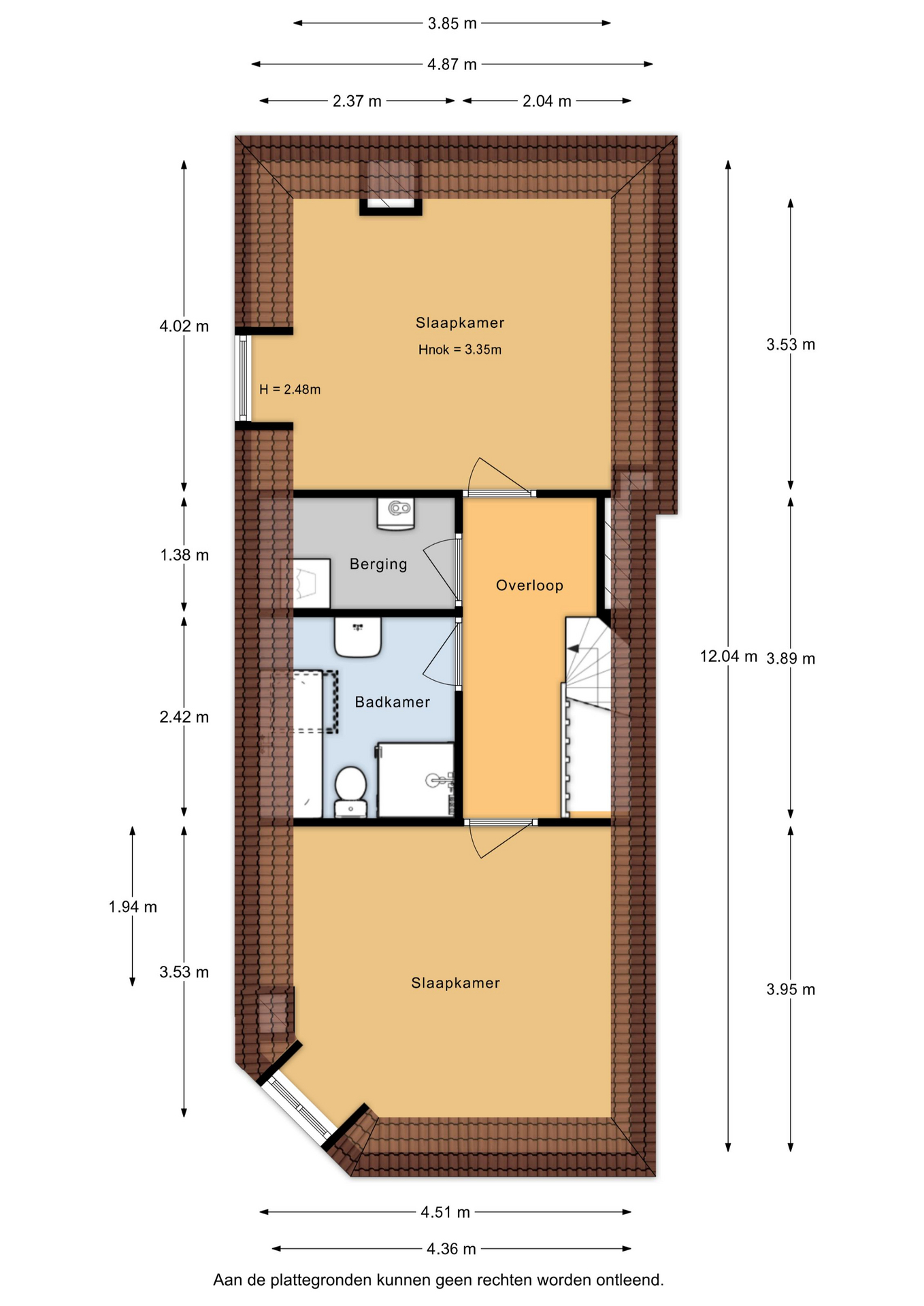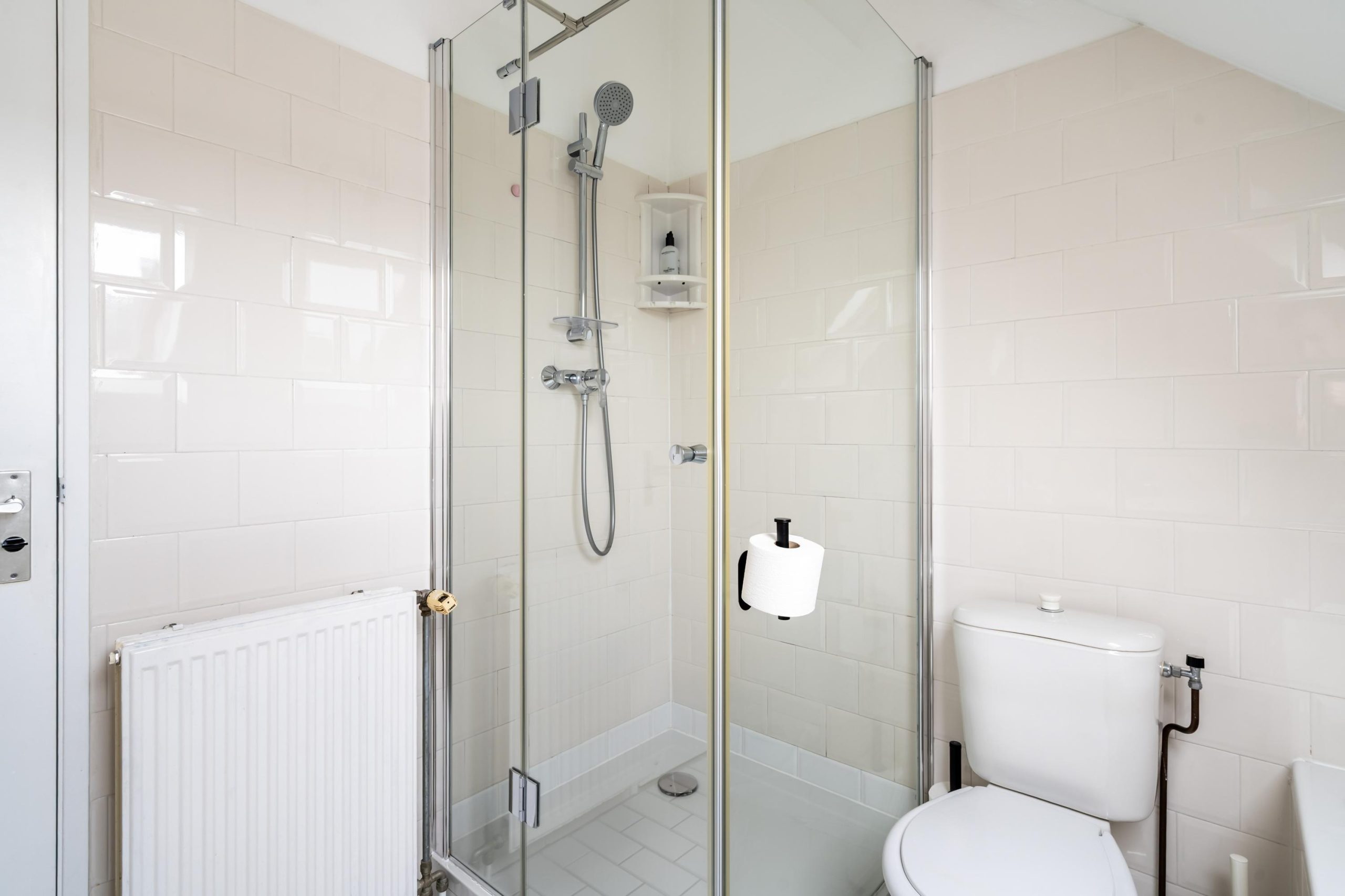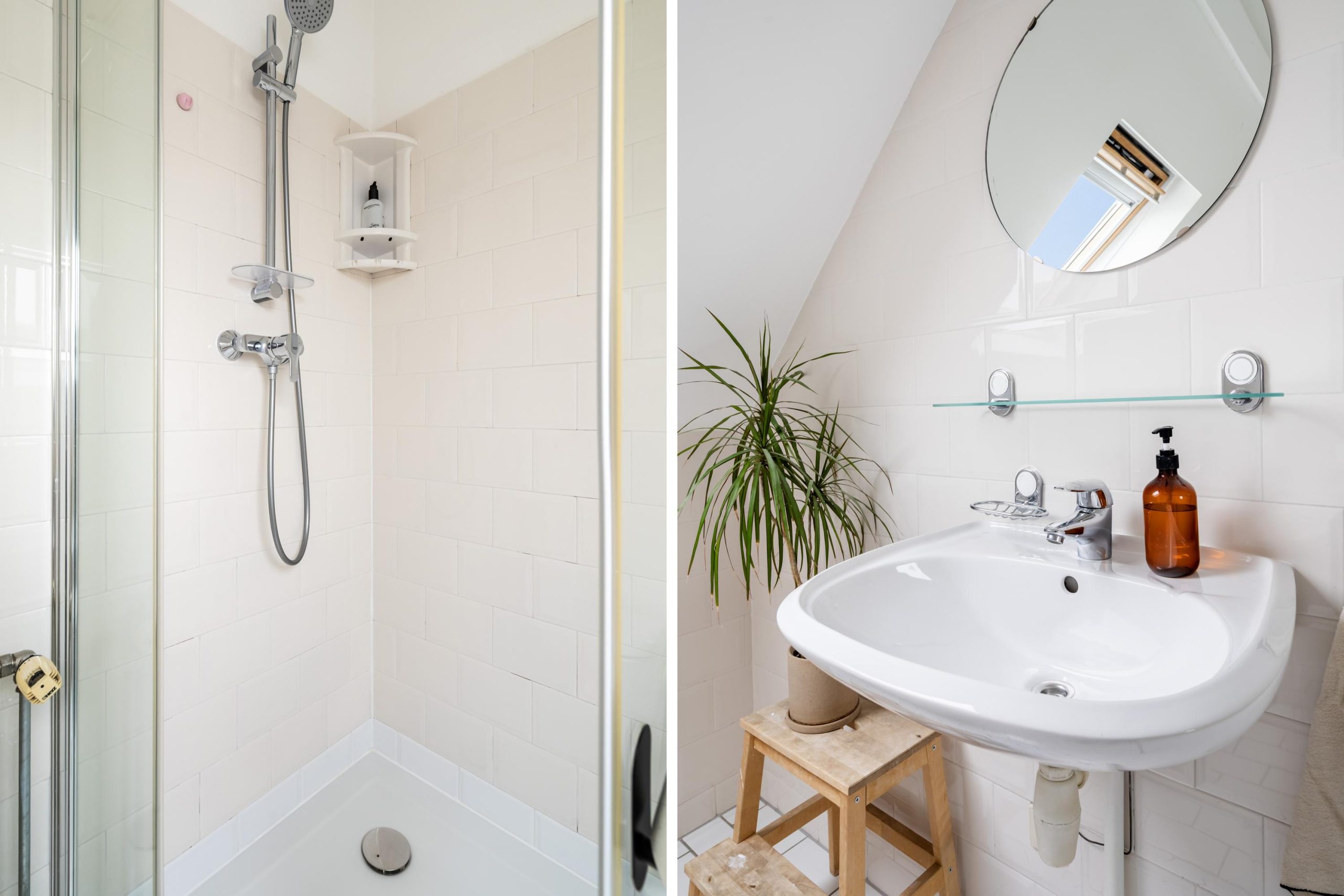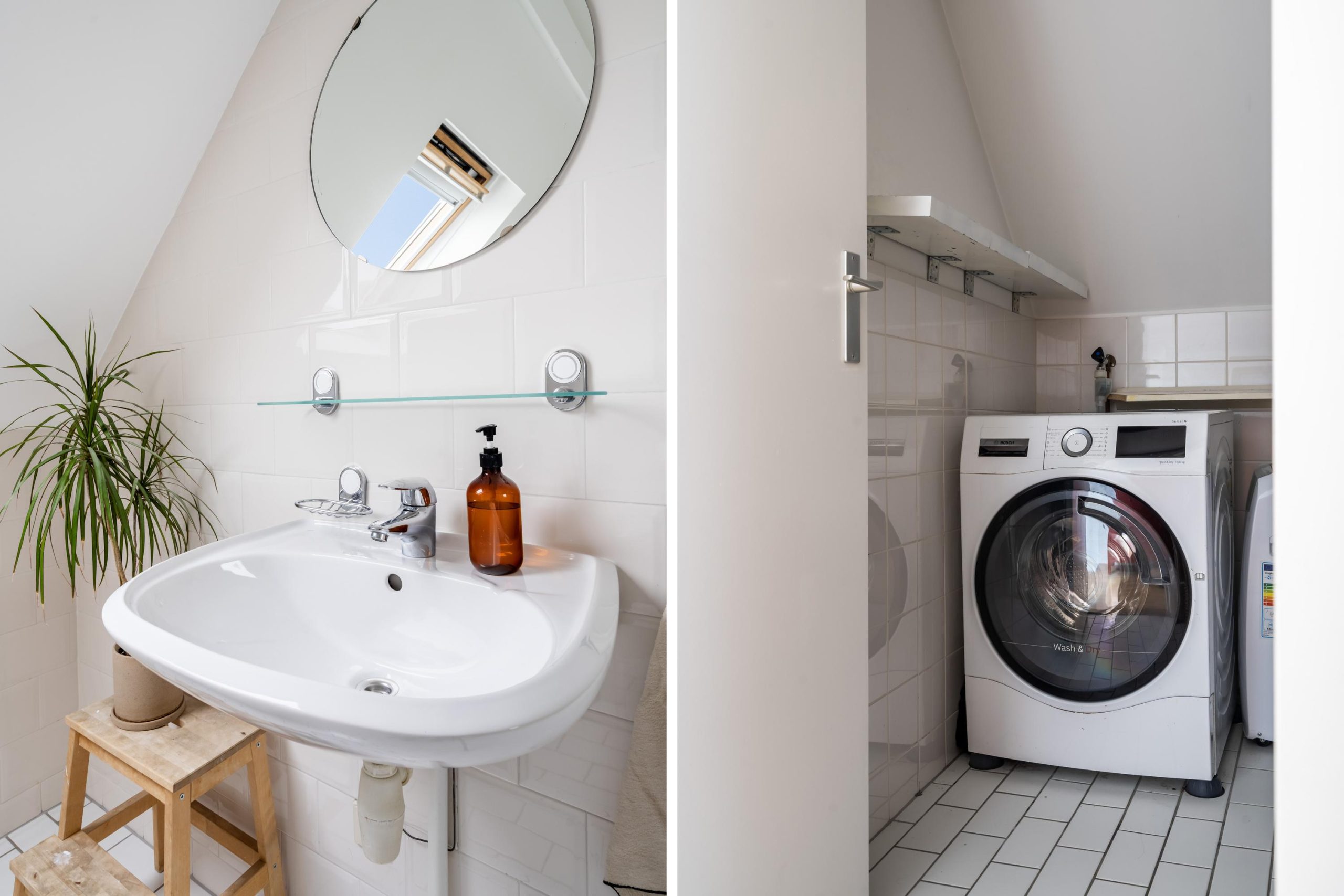 Overloop met berging en toegang tot alle vertrekken op deze verdieping. De 1e slaapkamer aan de achterzijde is erg ruim en beschikt over voldoende ruimte voor een tweepersoonsbed en een kledingkast. Bovendien zorgt de balkenstructuur voor een karakteristieke uitstraling en een warme, sfeervolle sfeer. De 2e slaapkamer is eveneens erg ruim. De volledig betegelde badkamer is voorzien van een toilet, douche, wasmachine-aansluiting, ligbad en wastafel.