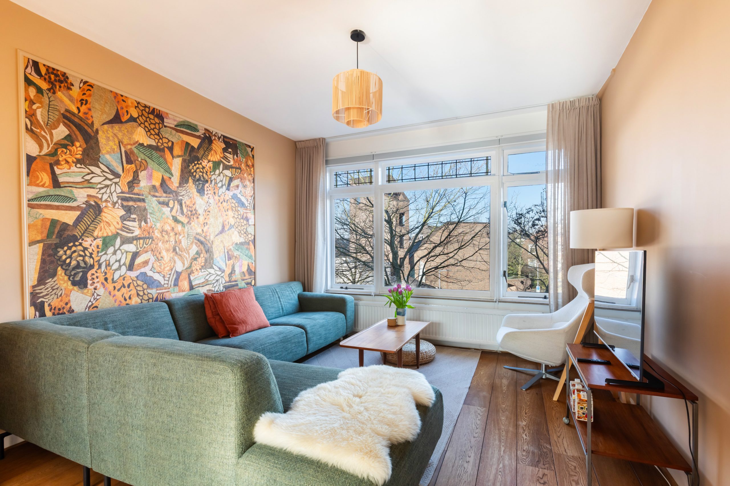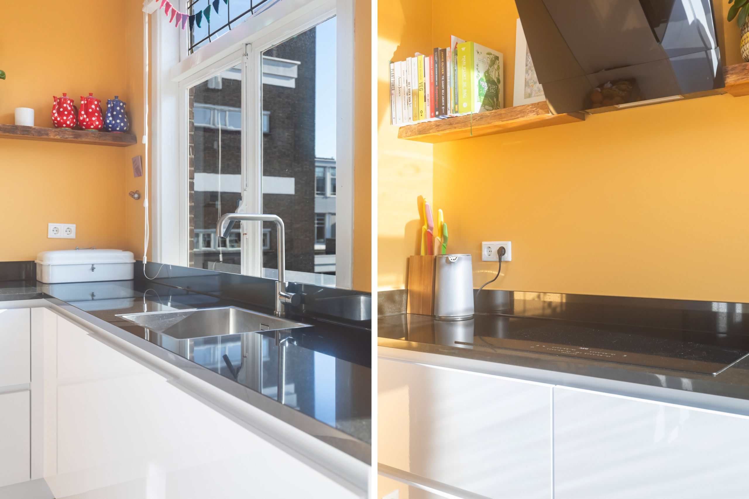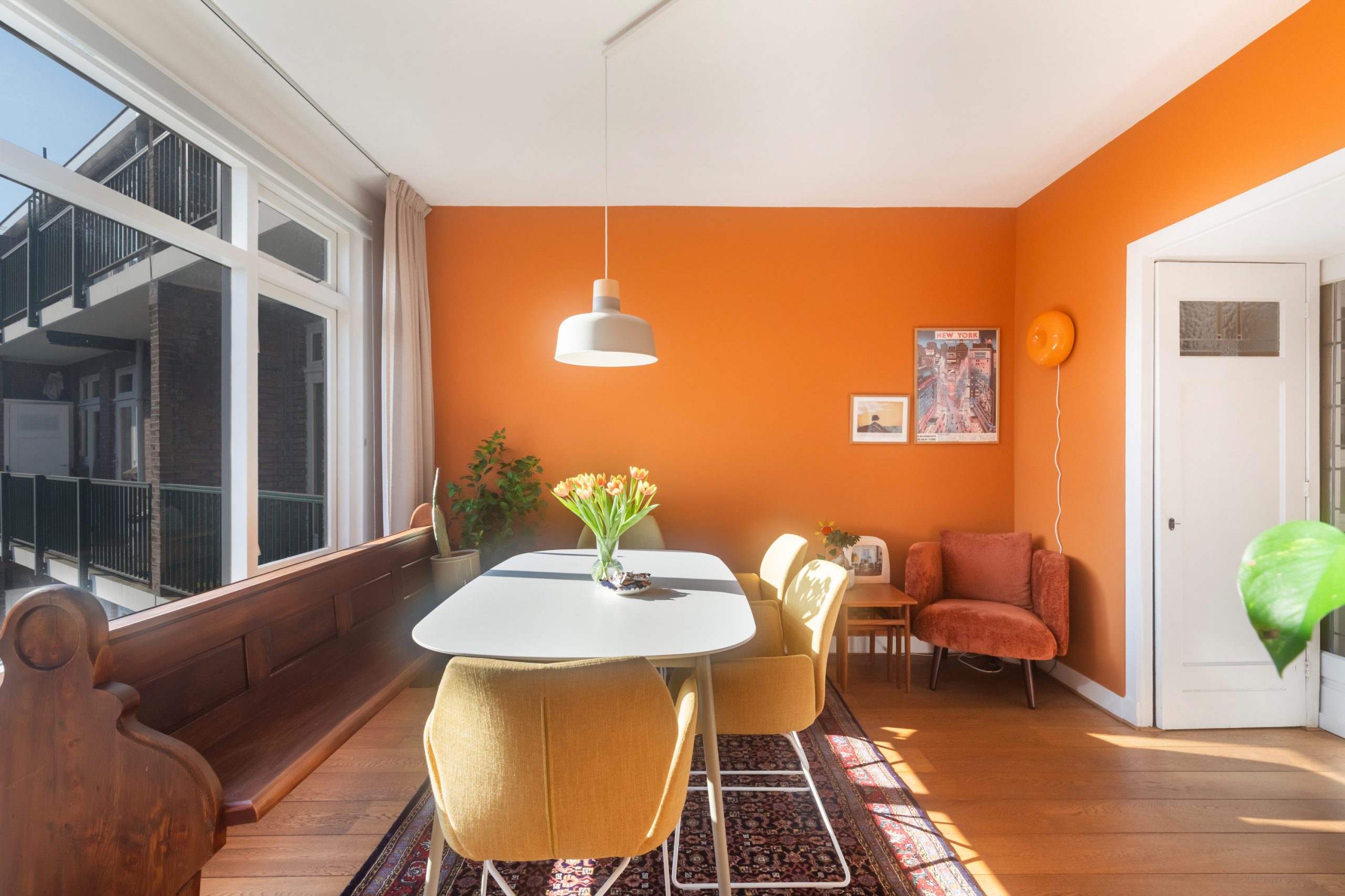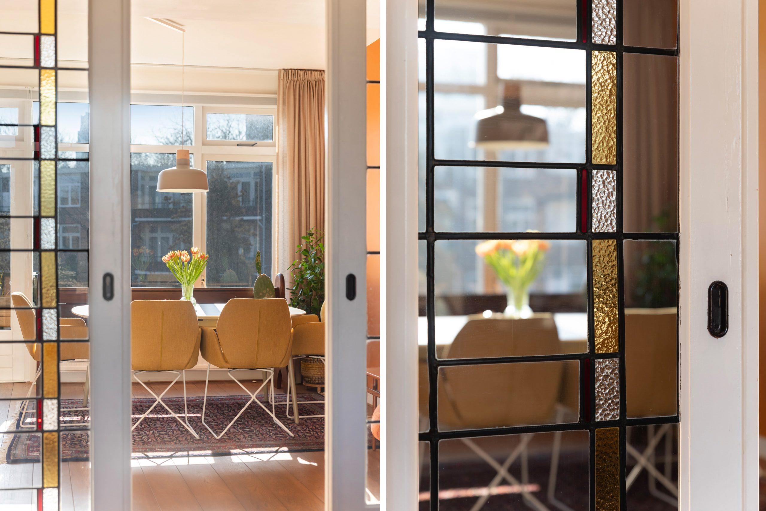 Ruime hal/overloop met toilet, meterkast en toegang tot alle vertrekken op deze verdieping. De en suite woonkamer is een ruime kamer met in totaal een lengte van bijna 10 meter. Het woongedeelte is gelegen aan de voorzijde en is heerlijk licht door de grote raampartijen. Middels de en suite (met 4 inbouwkasten) bereik je de eetkamer. De 2 ruimtes kunnen van elkaar gescheiden worden door de authentieke jaren ’30 glas-in-lood deuren, wat het zeer sfeervol maakt. Het eetgedeelte staat in directe verbinding met de half open keuken welke beschikt over diverse soorten inbouwapparatuur, zoals een elektrische kookplaat, afzuiging, vaatwasser, oven en koel-/vriescombinatie. Vanuit zowel de keuken als de eetkamer is er toegang tot het balkon, gelegen op zuidoosten. De 1e slaapkamer ligt aan de voorzijde, vanwaar je het 2e balkon bereikt (noordwesten).