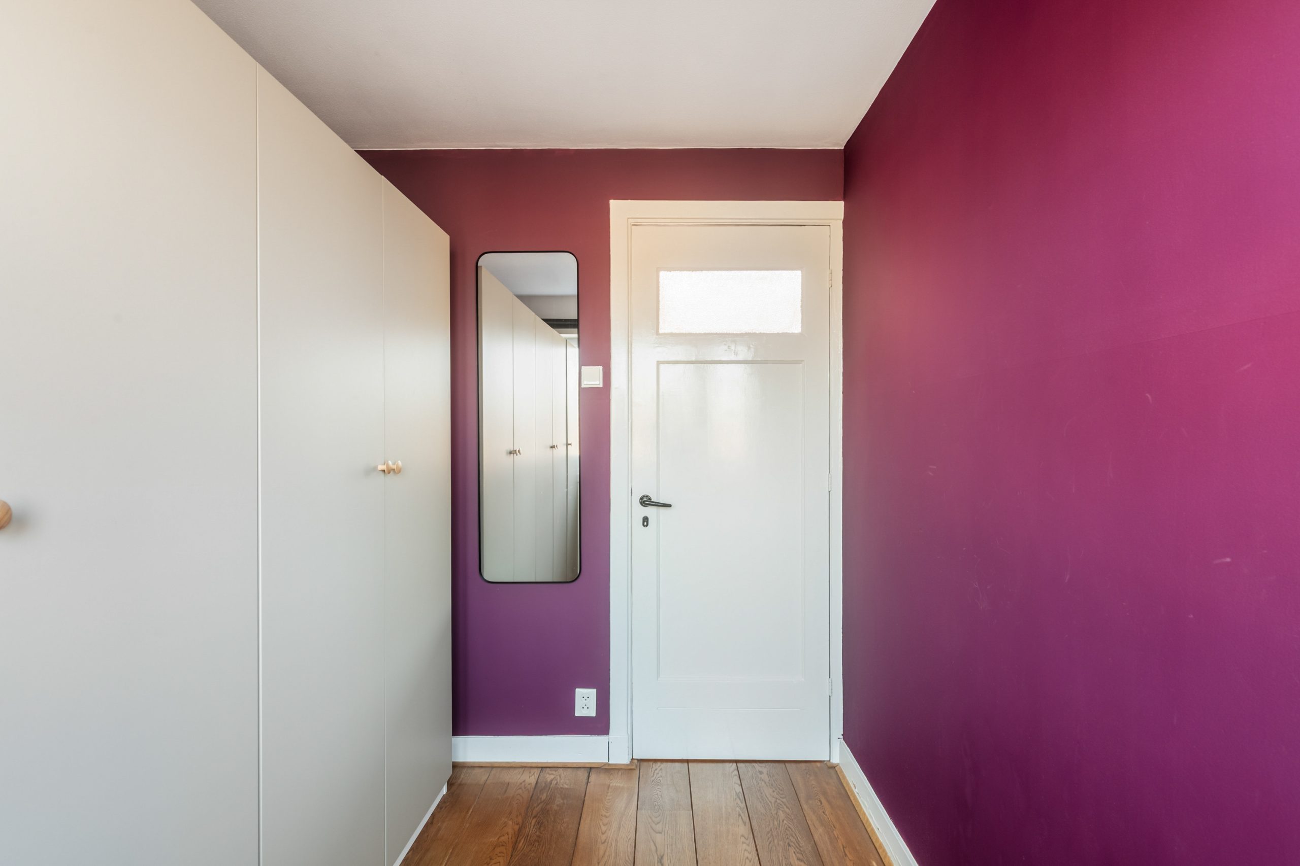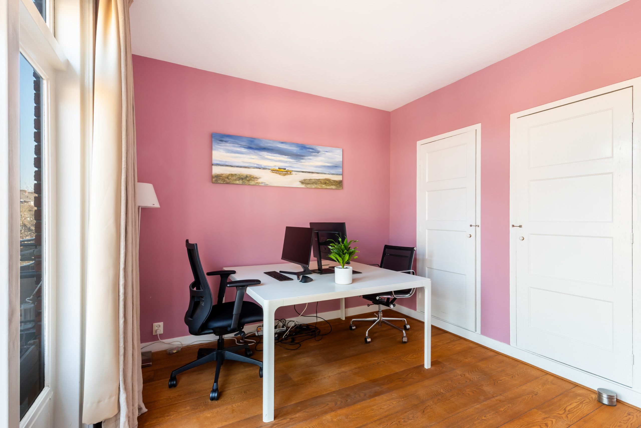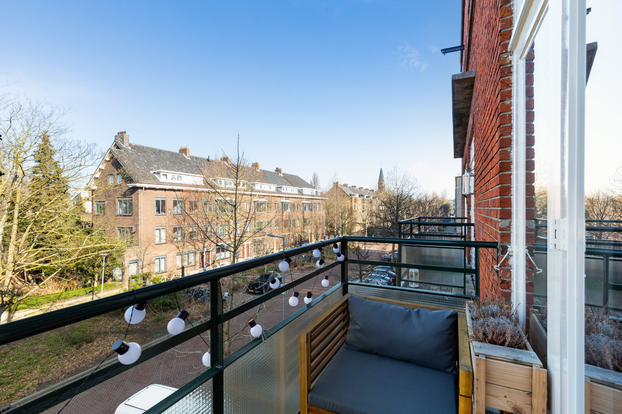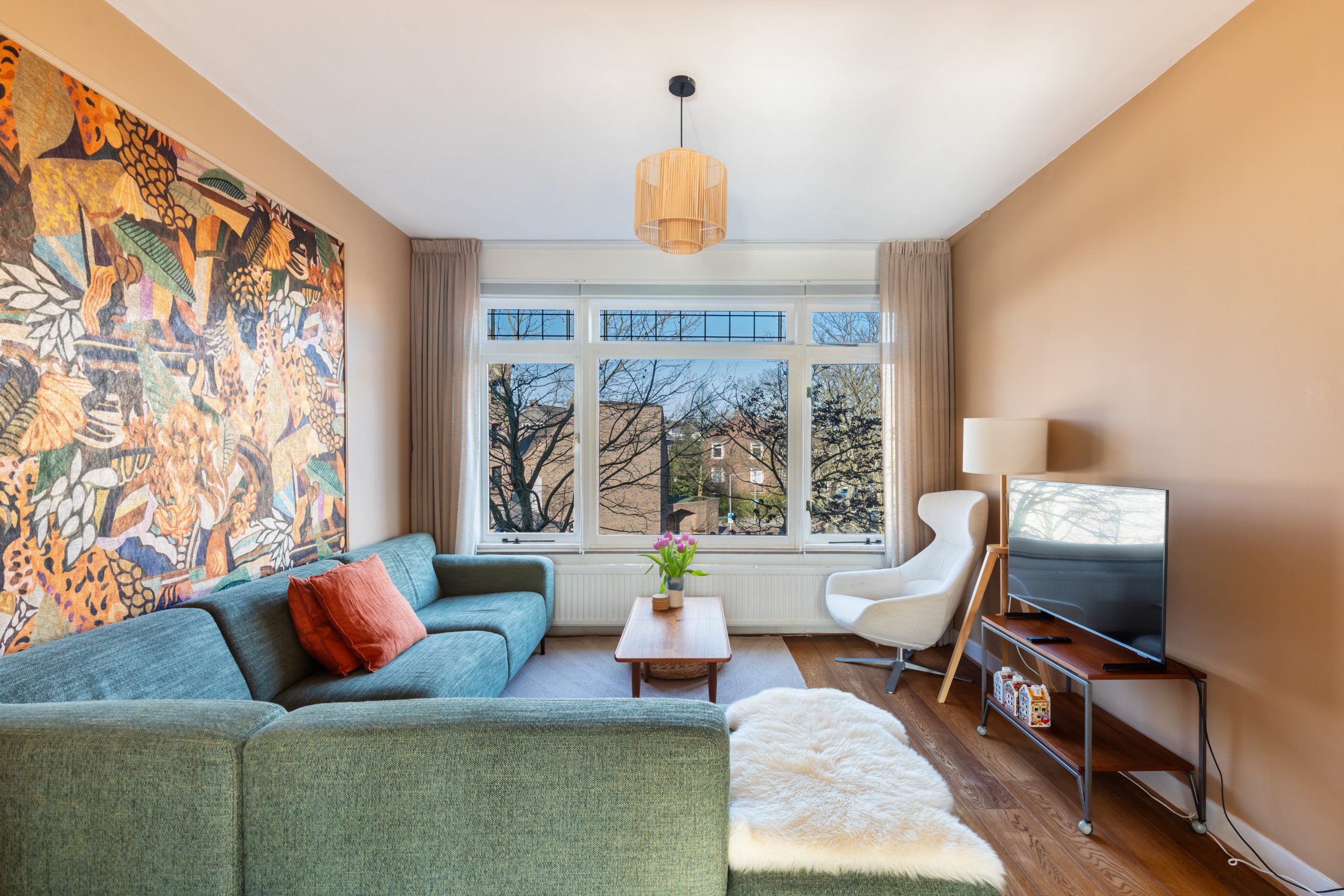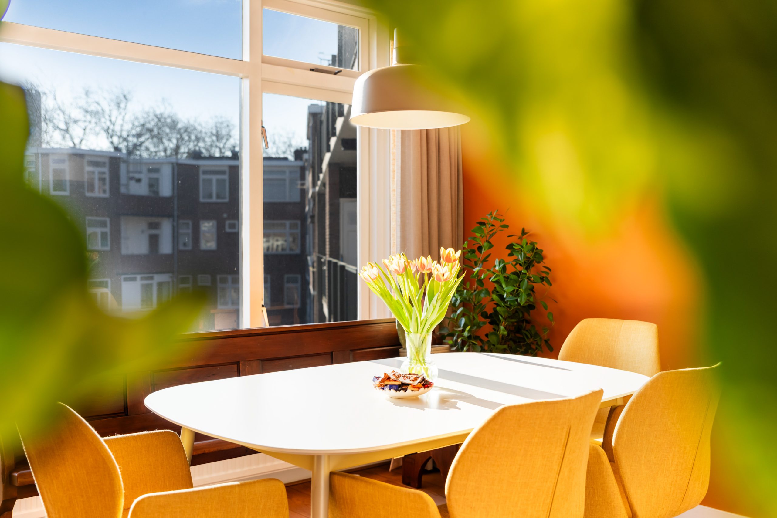 Ruime hal/overloop met toilet, meterkast en toegang tot alle vertrekken op deze verdieping. De en suite woonkamer is een ruime kamer met in totaal een lengte van bijna 10 meter. Het woongedeelte is gelegen aan de voorzijde en is heerlijk licht door de grote raampartijen. Middels de en suite (met 4 inbouwkasten) bereik je de eetkamer. De 2 ruimtes kunnen van elkaar gescheiden worden door de authentieke jaren ’30 glas-in-lood deuren, wat het zeer sfeervol maakt. Het eetgedeelte staat in directe verbinding met de half open keuken welke beschikt over diverse soorten inbouwapparatuur, zoals een elektrische kookplaat, afzuiging, vaatwasser, oven en koel-/vriescombinatie. Vanuit zowel de keuken als de eetkamer is er toegang tot het balkon, gelegen op zuidoosten. De 1e slaapkamer ligt aan de voorzijde, vanwaar je het 2e balkon bereikt (noordwesten).