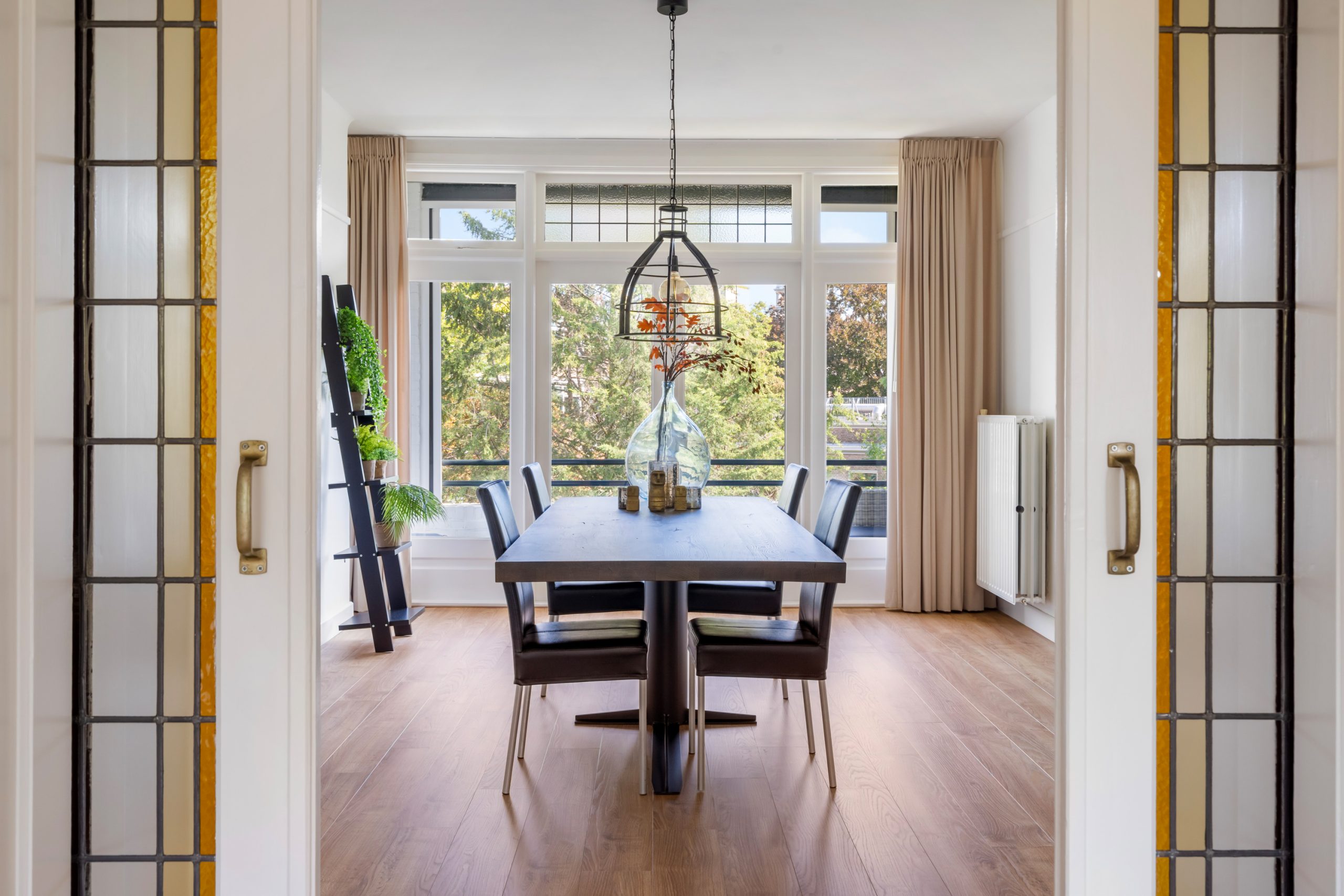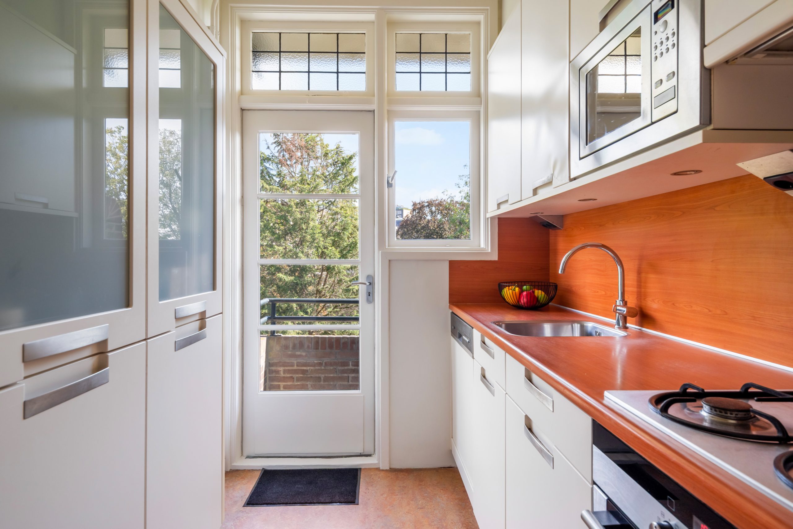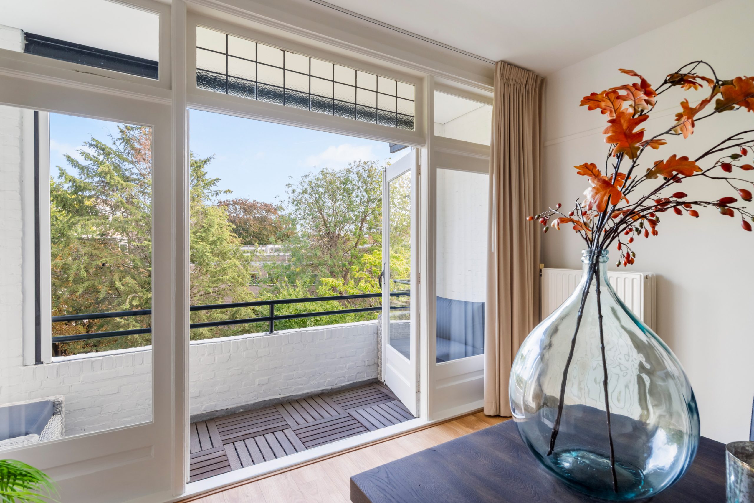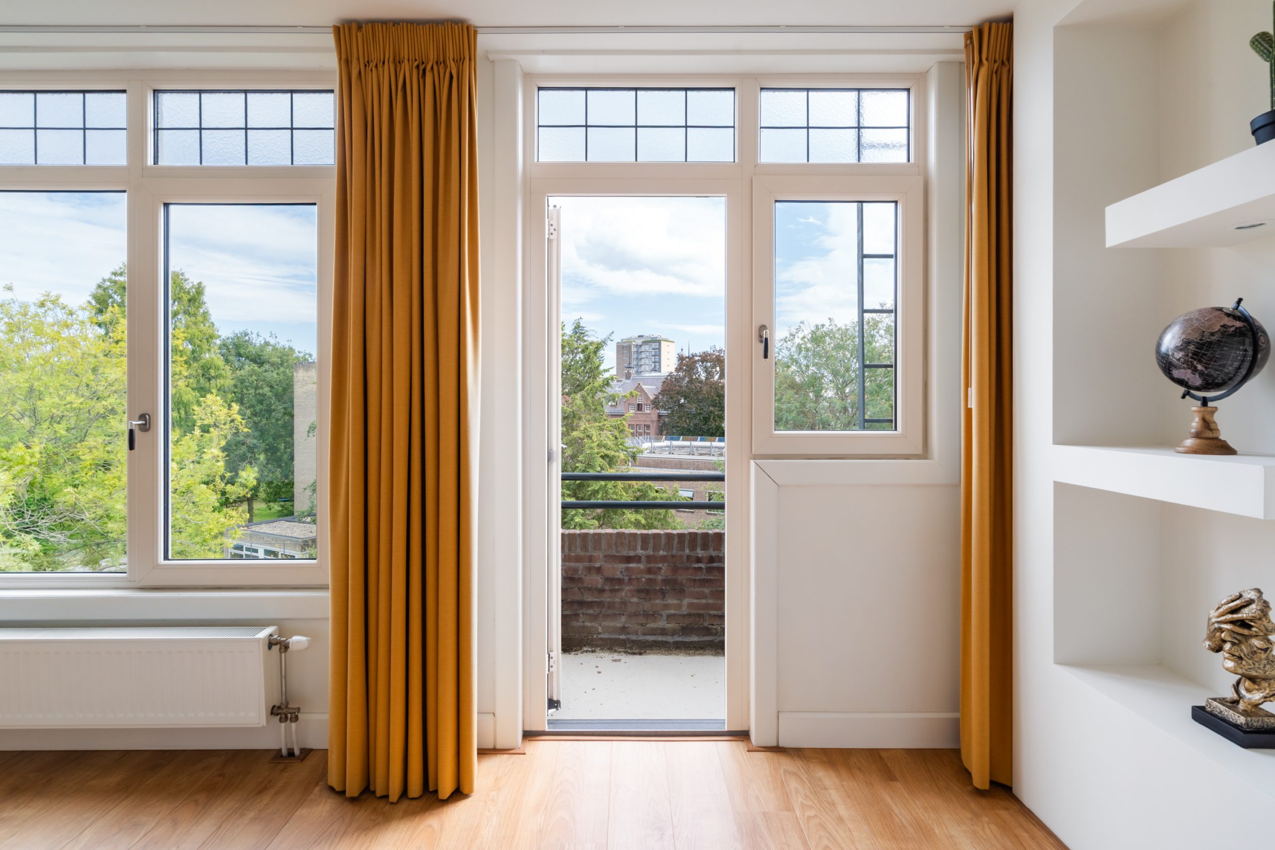 Ruime hal met separaat toilet en toegang tot alle vertrekken op deze verdieping. De originele jaren ’30-details, zoals glas-in-lood ramen, paneeldeuren en de en suite schuifdeuren, geven de woning een sfeervol karakter. De authentieke en brede woon-/eetkamer met vaste kasten heeft een lengte van maar liefst 12 meter en een hoogte van bijna 3 meter! De royale woonkamer is gelegen aan de voorzijde van de woning met een raampartij van maar liefst 6 meter. Het woongedeelte beschikt over een sfeervolle open haard, die zorgt voor een warme en uitnodigende ambiance. Dankzij de en suite schuifdeuren is de ruimte flexibel in te delen, met een mooie scheiding tussen het woon- en eetgedeelte. Dit is ideaal als je de openheid van de leefruimten wilt behouden, maar toch een visuele scheiding tussen de ruimtes wenst. Het eetgedeelte is gelegen aan de achterzijde. Via het eetgedeelte bereik je het balkon met openslaande deuren, gelegen op het zonnige oosten. Vanaf de lente vergroot je de woonruimte met een buitenruimte. De keuken beschikt over diverse inbouwapparatuur zoals een 4-pits gasfornuis, oven, magnetron, vaatwasser en een koelkast. Middels een deur in de keuken bereik je het tweede balkon, gelegen op het oosten. Hier kun je in de ochtendzon heerlijk genieten van een kop koffie. Via een trap in het woongedeelte bereik je de derde verdieping.