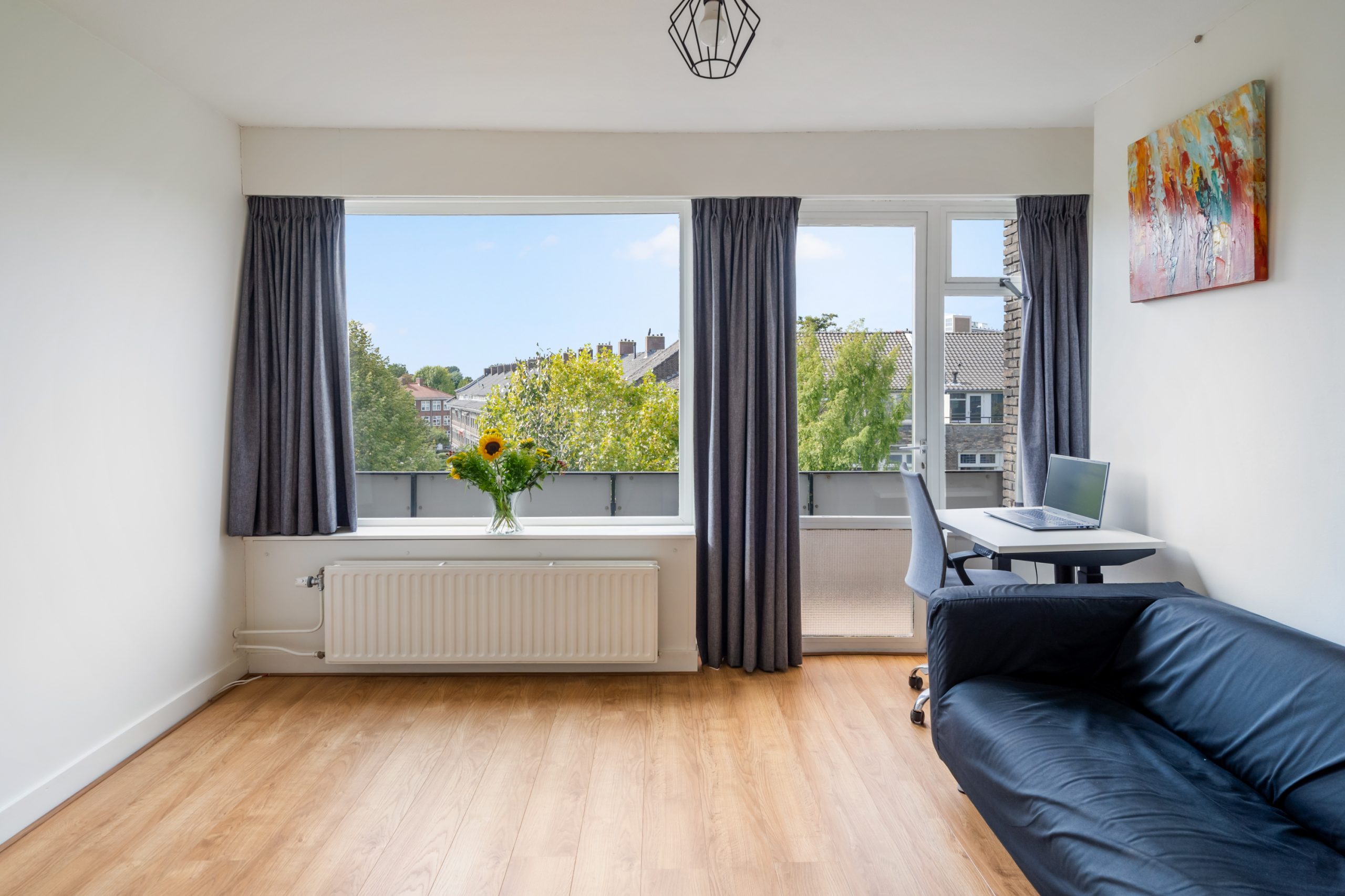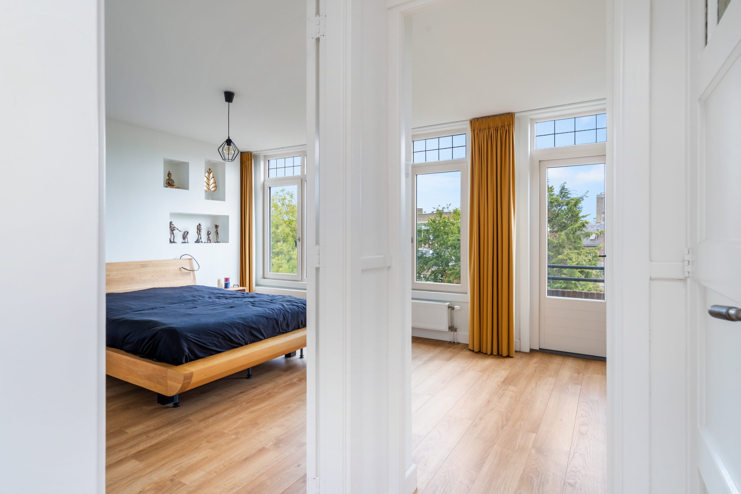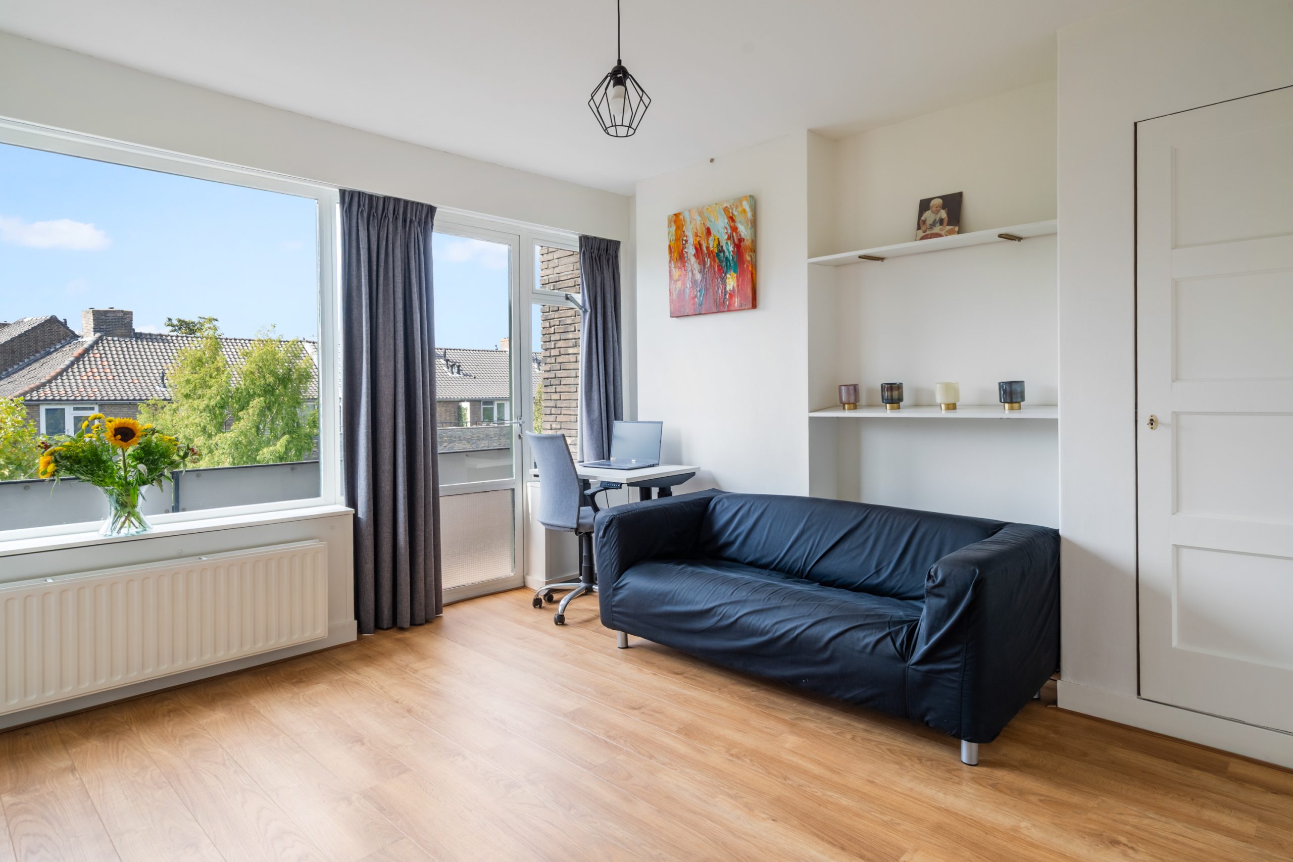 Ruime overloop met separaat toilet en toegang tot alle slaapkamers. De master bedroom is gelegen aan de achterzijde van de woning. Dit is een erg ruime en lichte kamer. De woning beschikt momenteel over drie slaapkamers, met de mogelijkheid tot het eenvoudig creëren van een vierde slaapkamer. Via de master bedroom heb je toegang tot het derde balkon, gelegen op het oosten. De unieke badkamer beschikt over een ligbad, douche, handdoekradiator en een wastafel met meubel. De tweede slaapkamer met vaste kast is gelegen aan de voorzijde en is erg ruim. De derde slaapkamer is multifunctioneel in te richten als werk-, kinder- of slaapkamer. Via deze slaapkamer bereik je het laatste balkon, gelegen op het westen. Hier kun je in de namiddag en avond heerlijk genieten van de zon. Ook is er nog een wasruimte en berging, waar ook de CV-opstelling zich bevindt.