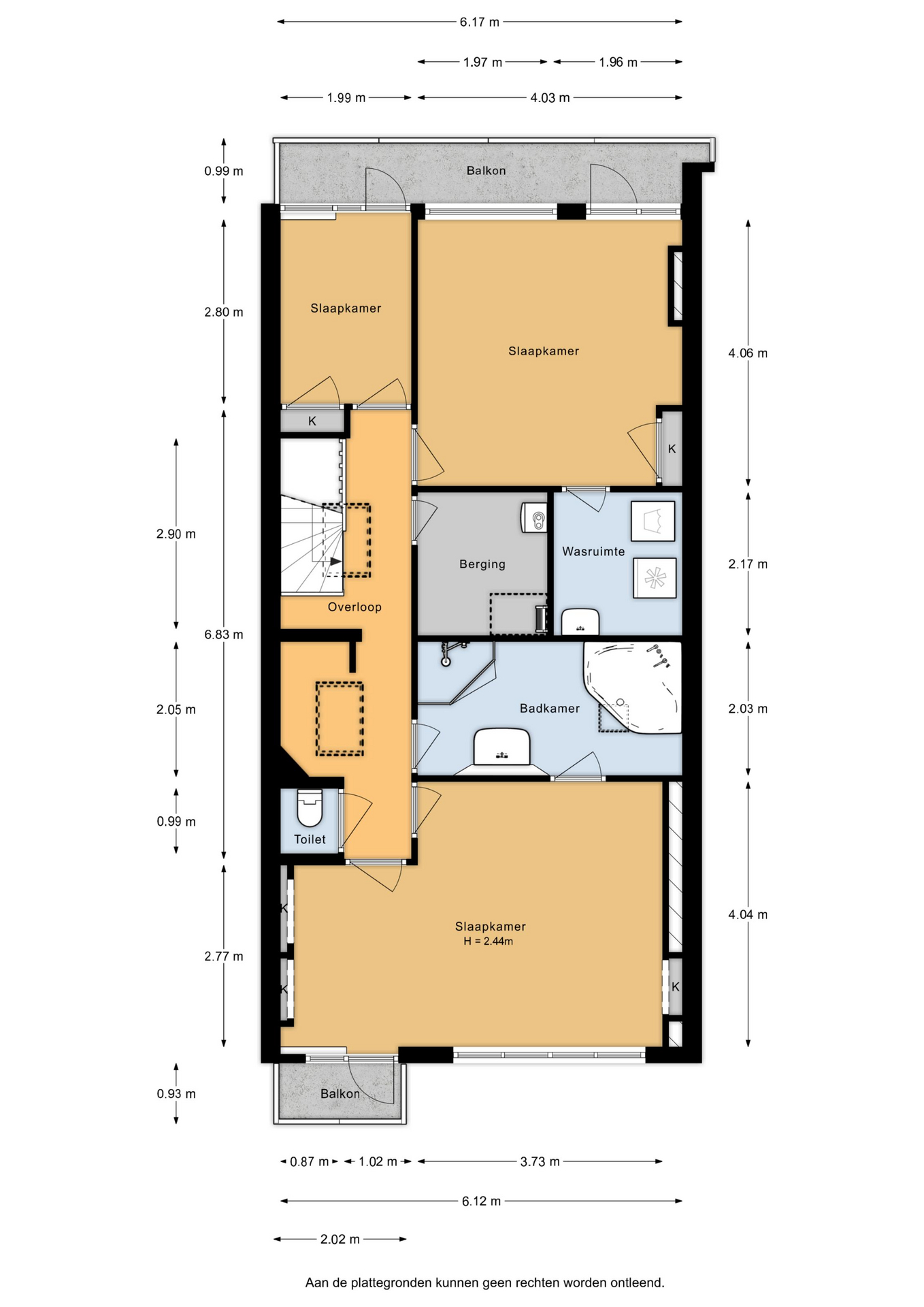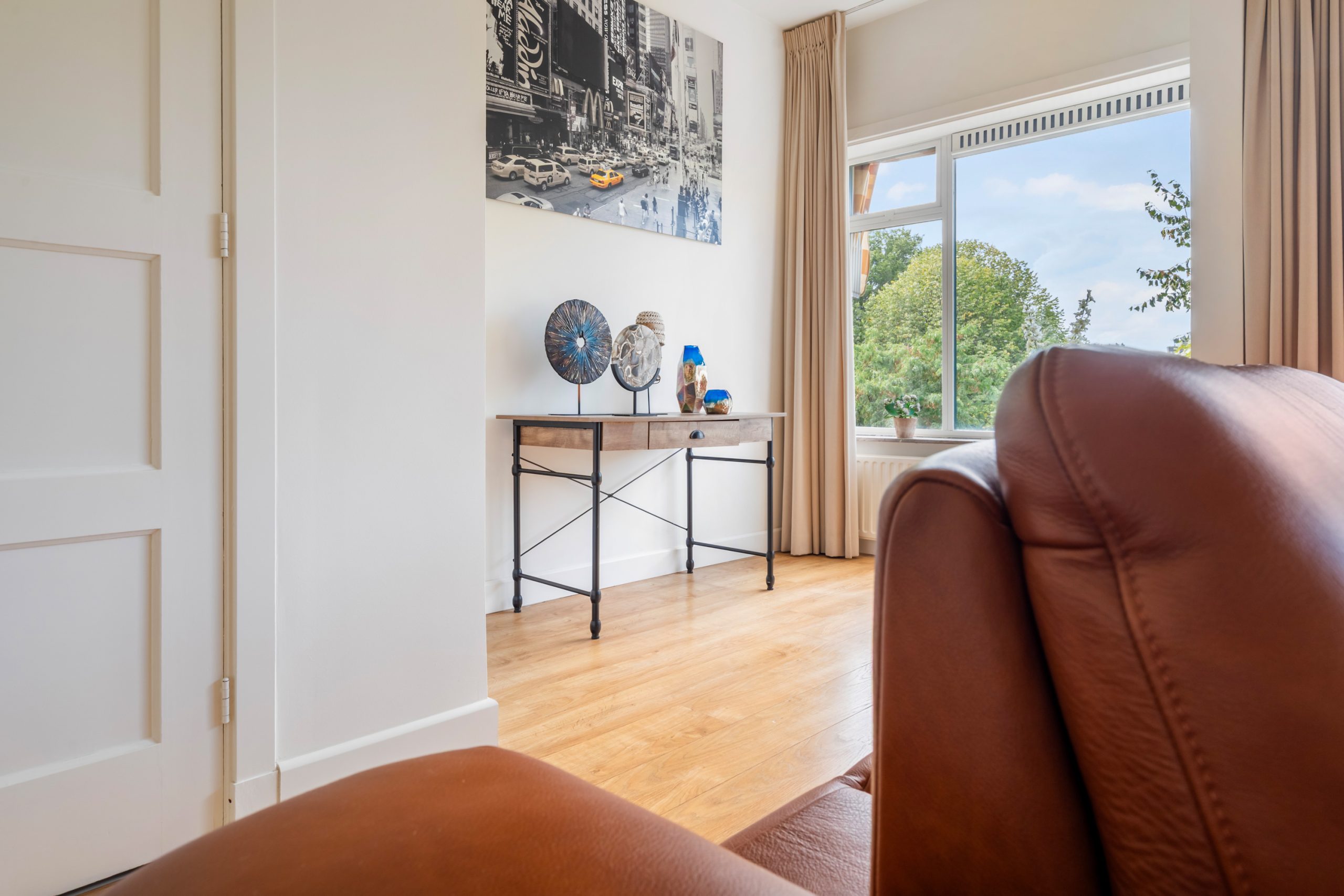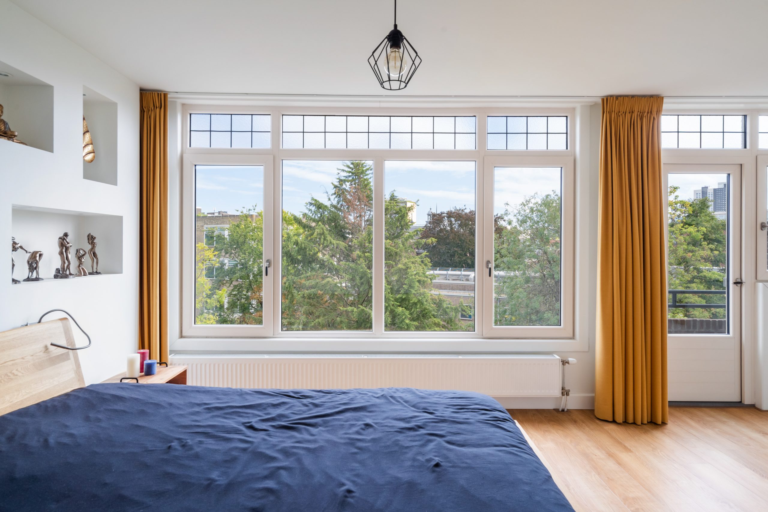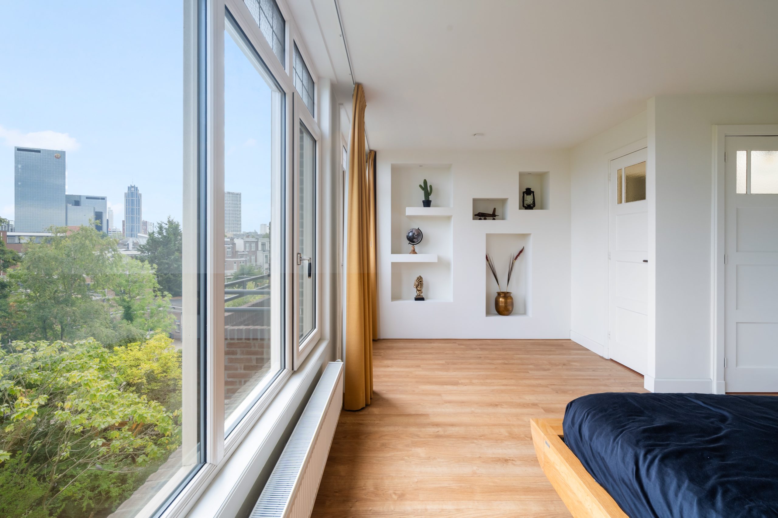 Ruime overloop met separaat toilet en toegang tot alle slaapkamers. De master bedroom is gelegen aan de achterzijde van de woning. Dit is een erg ruime en lichte kamer. De woning beschikt momenteel over drie slaapkamers, met de mogelijkheid tot het eenvoudig creëren van een vierde slaapkamer. Via de master bedroom heb je toegang tot het derde balkon, gelegen op het oosten. De unieke badkamer beschikt over een ligbad, douche, handdoekradiator en een wastafel met meubel. De tweede slaapkamer met vaste kast is gelegen aan de voorzijde en is erg ruim. De derde slaapkamer is multifunctioneel in te richten als werk-, kinder- of slaapkamer. Via deze slaapkamer bereik je het laatste balkon, gelegen op het westen. Hier kun je in de namiddag en avond heerlijk genieten van de zon. Ook is er nog een wasruimte en berging, waar ook de CV-opstelling zich bevindt.
