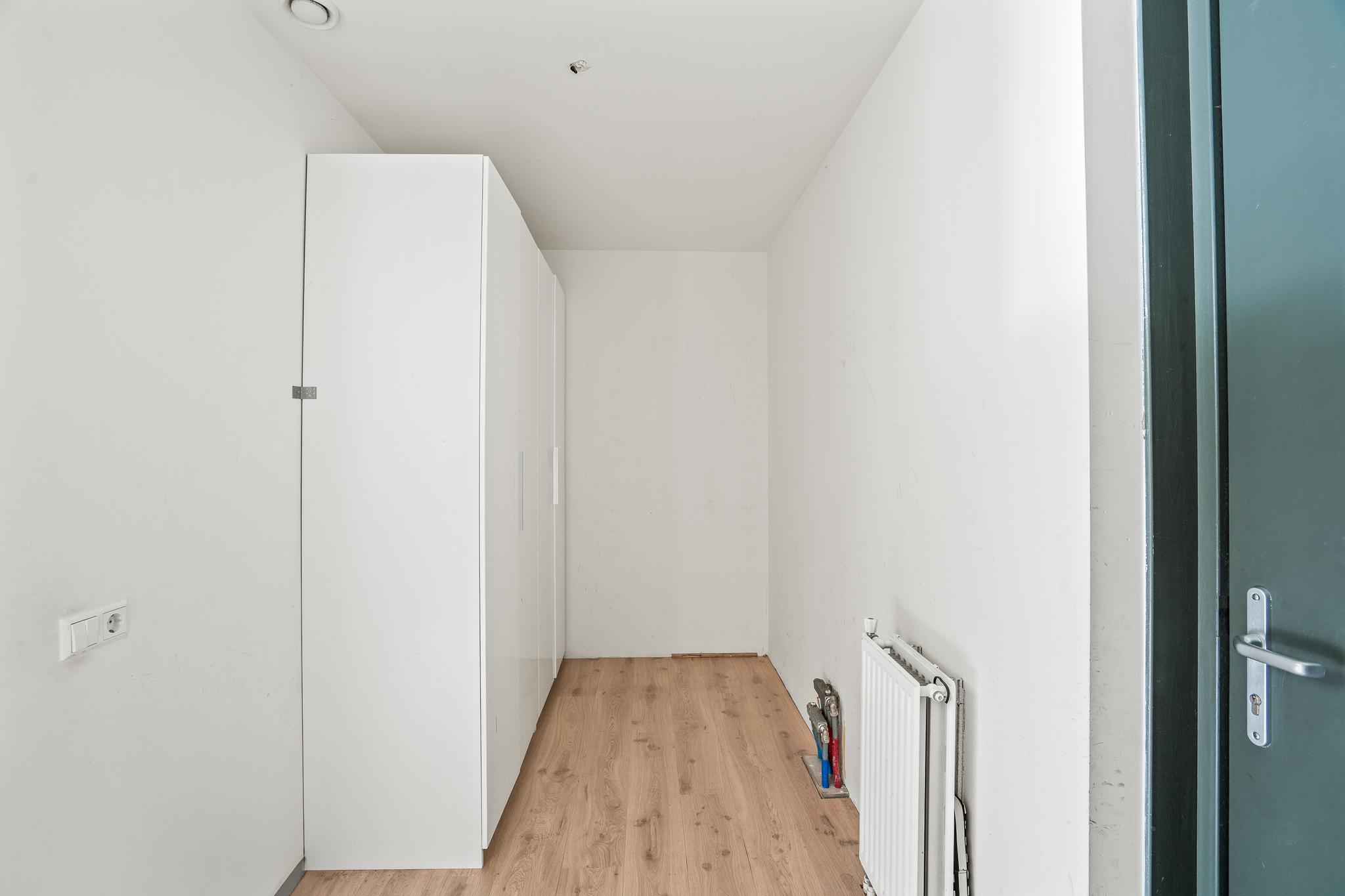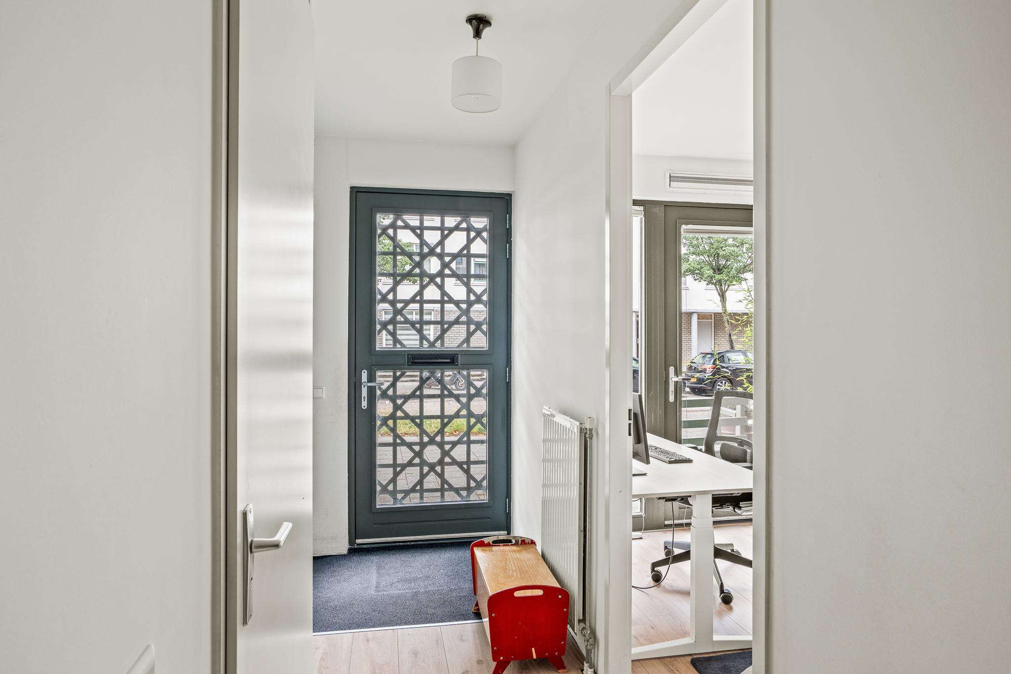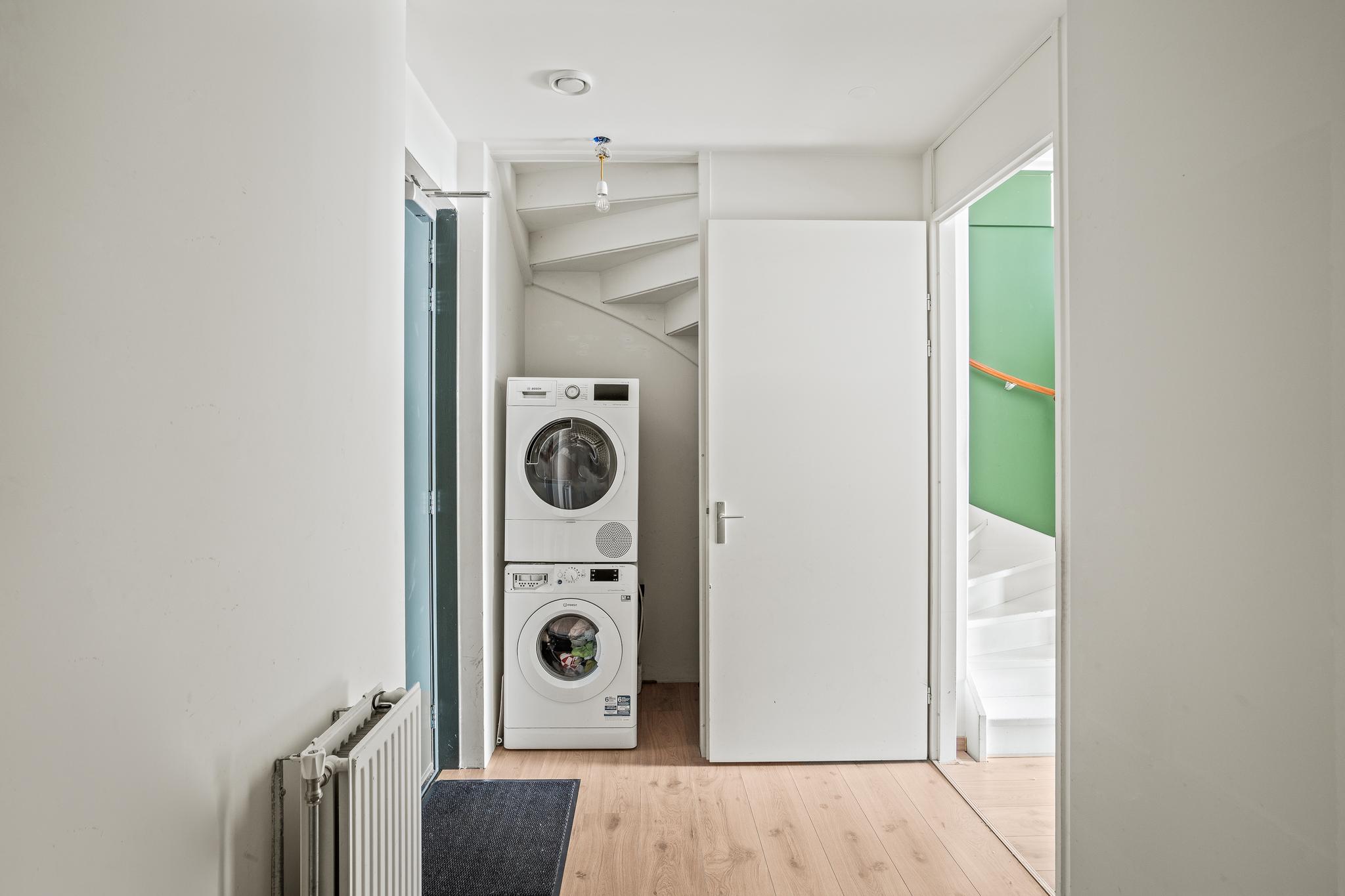 Ruime entree/hal met vaste kast, meterkast, toilet en toegang tot de vertrekken op deze verdieping. De 1e slaapkamer is momenteel in gebruik als werkkamer, maar is dankzij de praktische indeling ook ideaal als logeer- of extra slaapkamer. Aan de achterzijde van de woning is er een handige berging, voorzien van een wasmachineaansluiting.