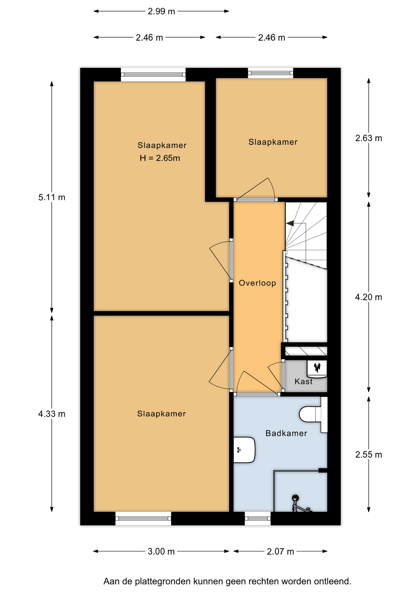 Ruime overloop met vaste kast (CV-opstelling) en toegang tot alle vertrekken op deze verdieping. De royale master bedroom is gelegen aan de voorzijde van de woning. Er is meer dan voldoende ruimte voor een tweepersoonsbed en een royale kledingkast. De 2 andere slaapkamers zijn gelegen aan de voorzijde en zijn ideaal in te richten als home-office, kinderkamer of als eventuele inloopkast. De betegelde badkamer beschikt over een douche, toilet, radiator en een wastafel met meubel.