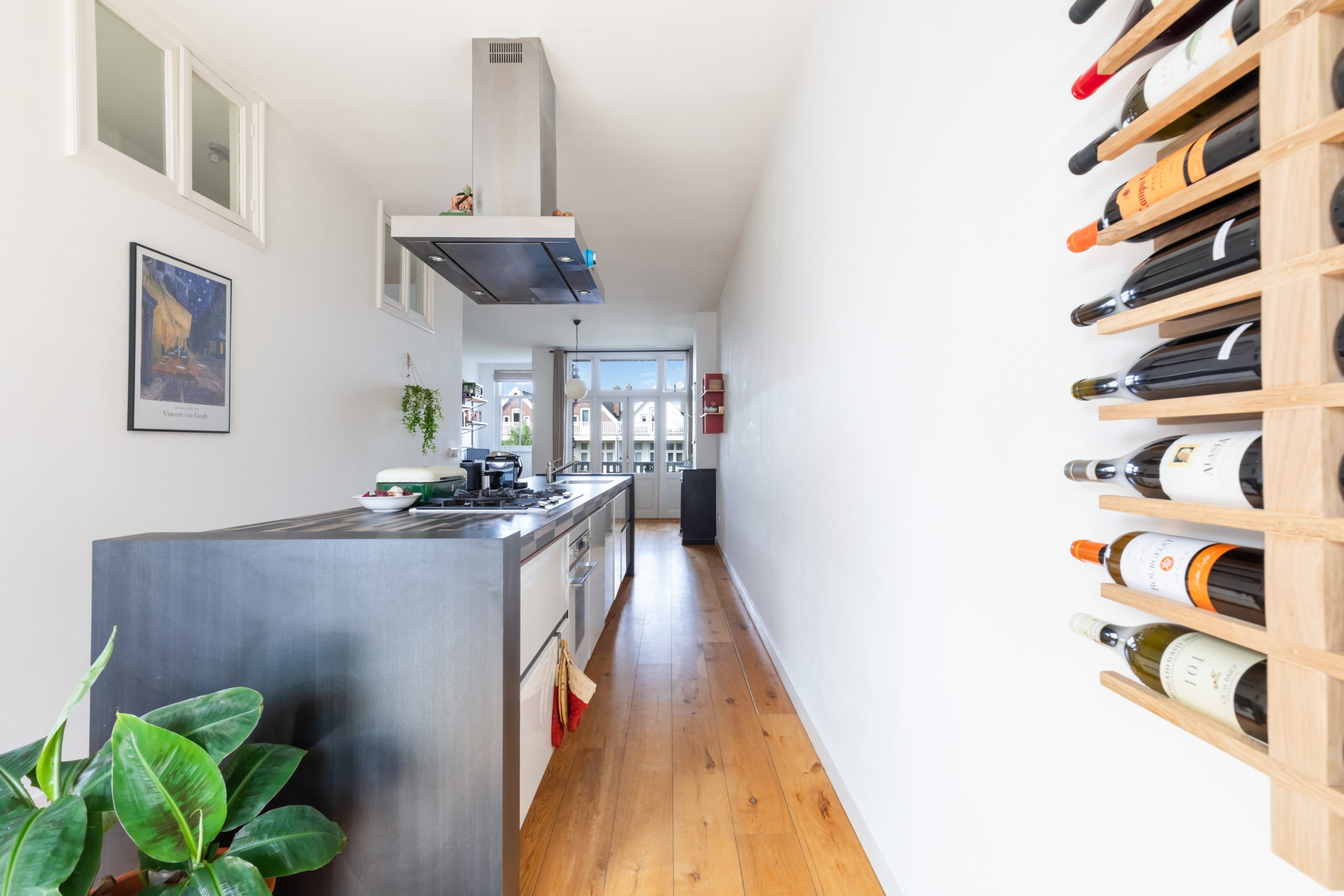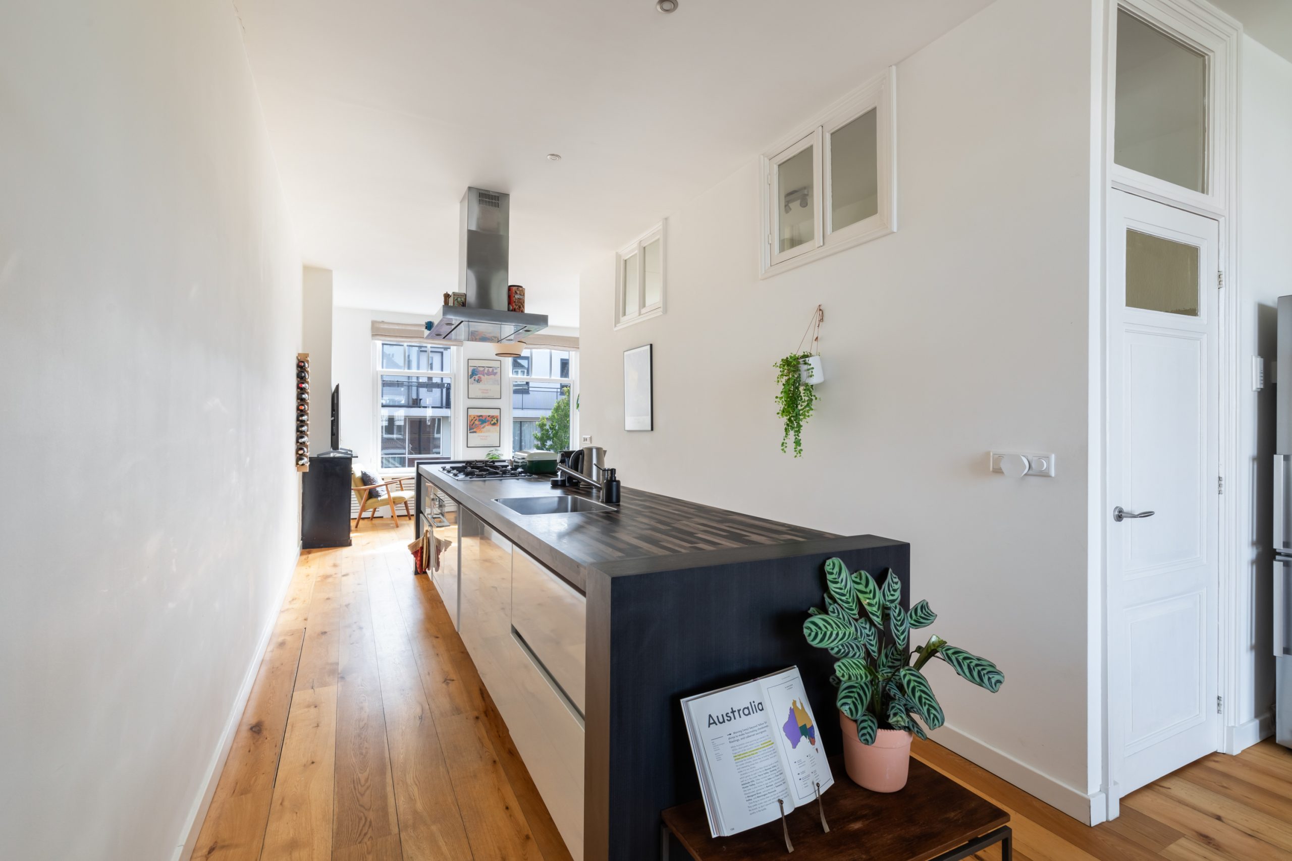 Entree/hal met berging, toilet en toegang tot alle vertrekken op deze verdieping. Door de grote raampartijen aan beide zijden treedt er veel natuurlijk licht de woning binnen wat zorgt voor een fijne en lichte sfeer. De woon-/eetkamer heeft maar liefst een lengte van ca. 13 meter en een hoogte van bijna 3 meter! Het woongedeelte met vaste kast en meterkast is gelegen aan de voorzijde van de woning. Het stijlvolle kookeiland met bar is het hart van deze open woonkeuken, waar koken en gezelligheid perfect samenkomen. Het is de ideale plek om lekker in contact te blijven met je gezelschap, terwijl je geniet van de open, gezellige sfeer. De keuken beschikt over diverse inbouwapparatuur zoals een 5-pits gasfornuis met afzuigkap, oven en een vaatwasser. Het eetgedeelte staat in directe verbinding met de open keuken en is gelegen aan de achterzijde van de woning. Het 1e balkon bevindt zich hier en is gelegen op het noordwesten. Hier kan je heerlijk genieten van de middag-/avondzon!