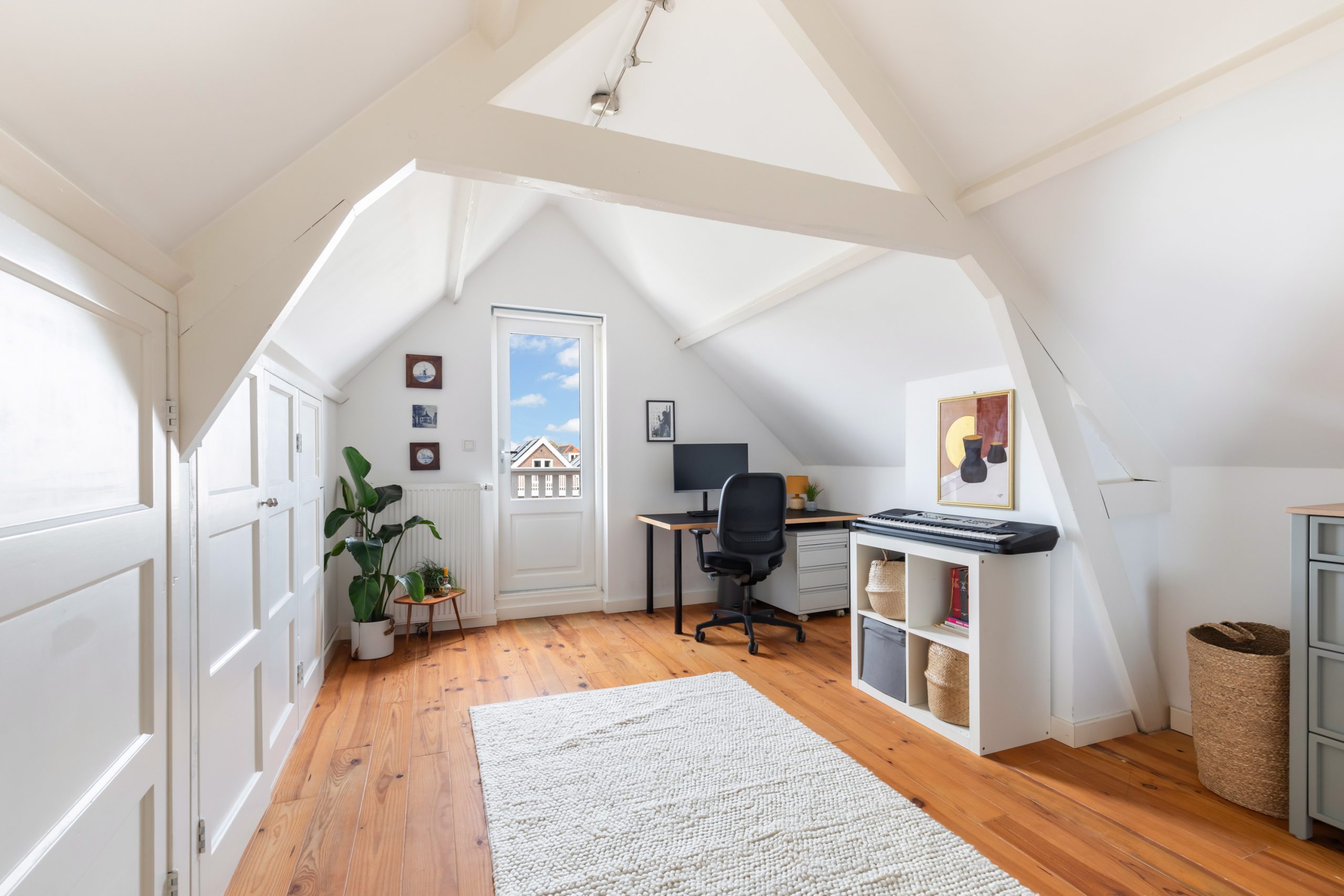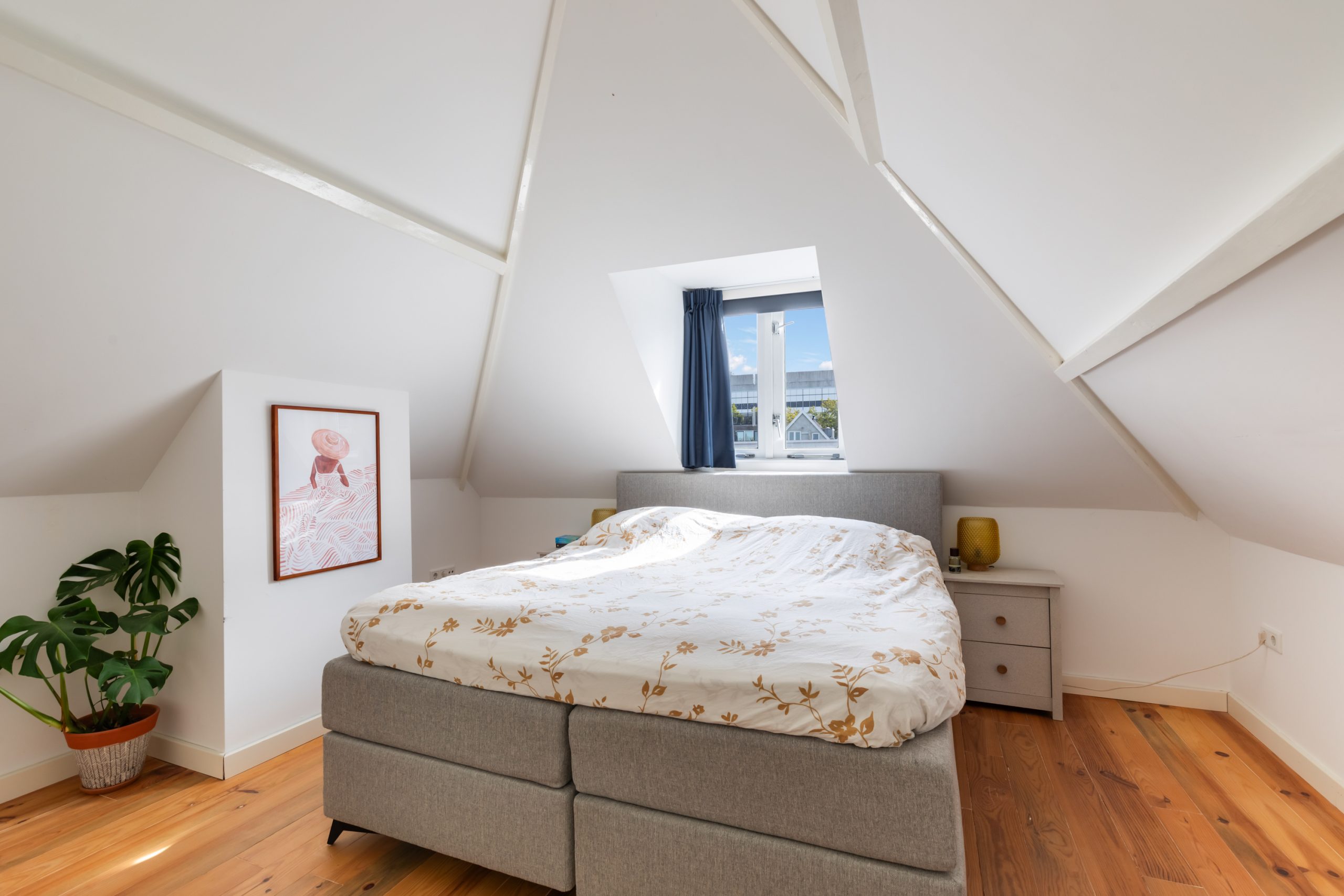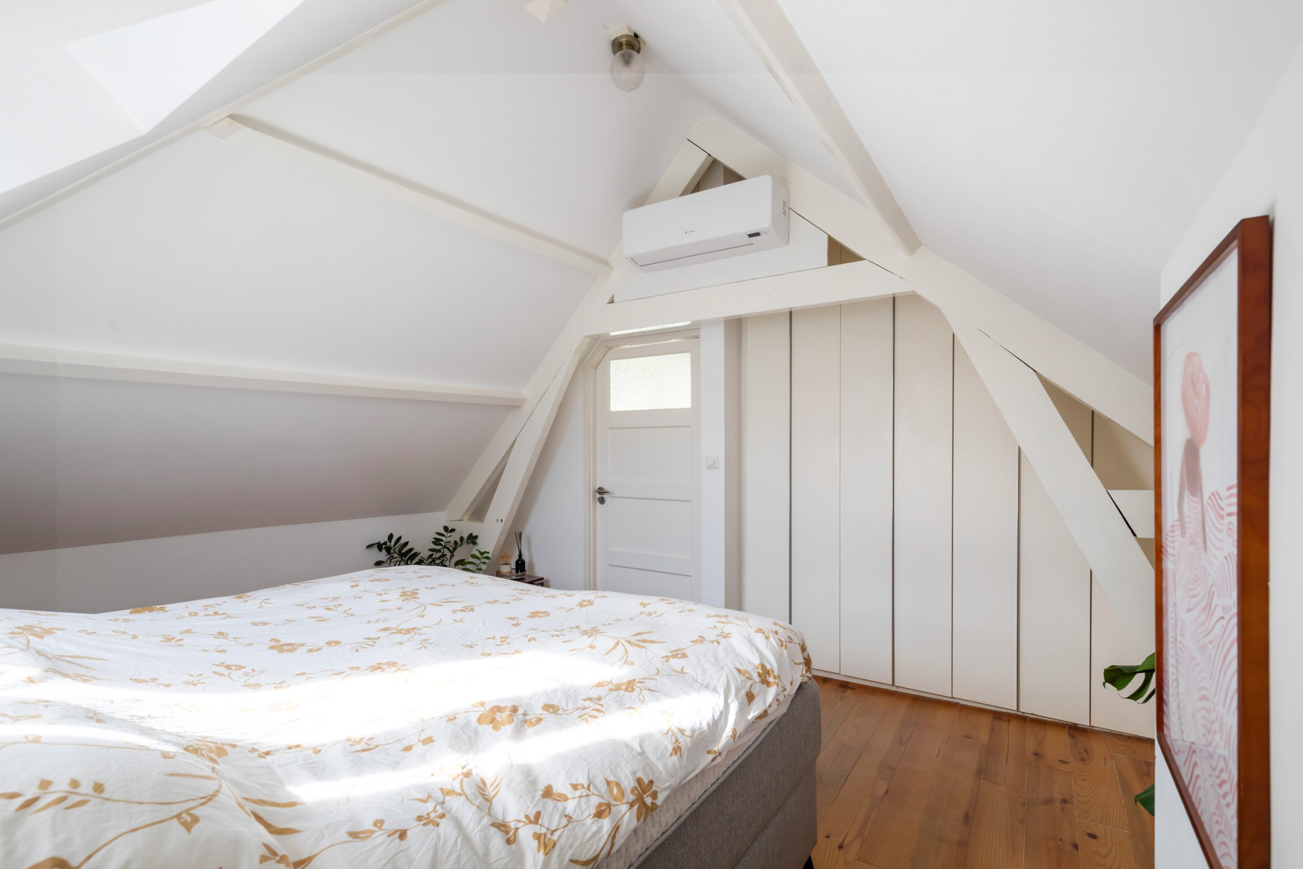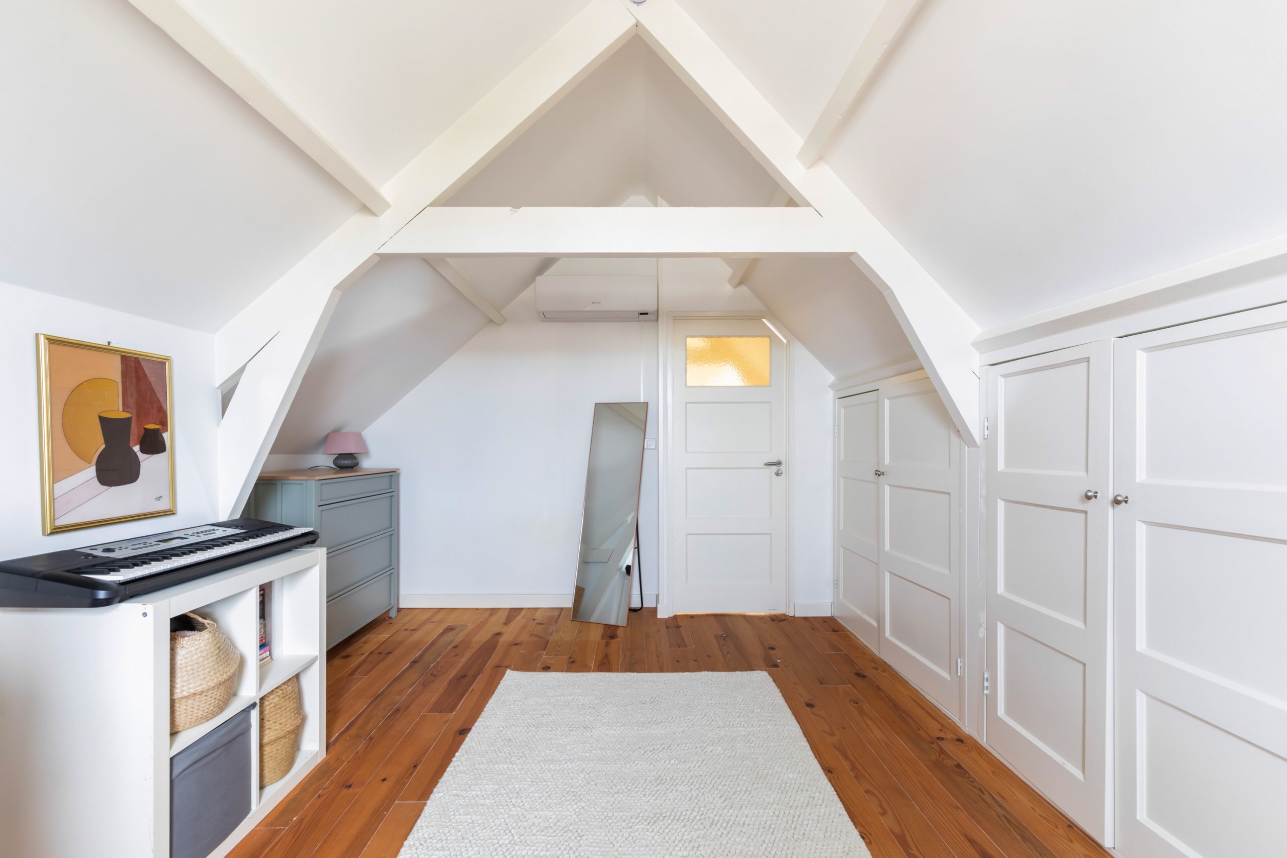 Overloop met berging en toegang tot alle vertrekken op deze verdieping. De master bedroom is gelegen aan de achterzijde van de woning. Deze heerlijk ruime kamer is multifunctioneel in te richten als werk-, kinder- of slaapkamer. Ook beschikt de kamer over een grote inbouwkast, erg handig voor extra opbergruimte. Via een deur is er toegang tot het balkon gelegen op het zonnige noordwesten waarbij je zomers van de heerlijke avondzon kan geniet. De 2e slaapkamer, die tevens is voorzien van een op maat gemaakte inbouwkast, bevindt zich aan de voorzijde. De moderne badkamer is tussen beide kamers in gelegen en is beschikt over een inloopdouche, ligbad, dubbele wastafel met meubel en een toilet. Op de bovenverdieping zijn beide slaapkamers voorzien van airco.