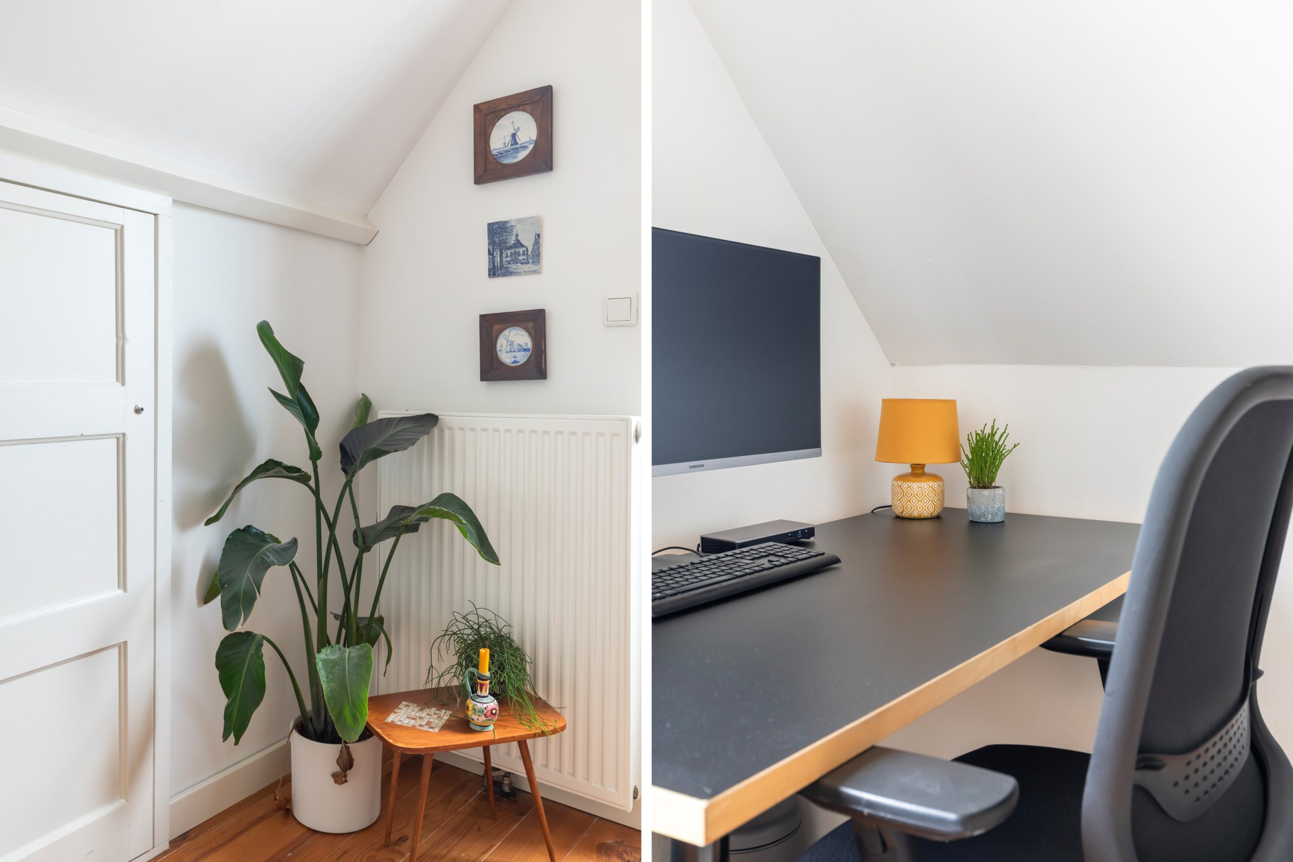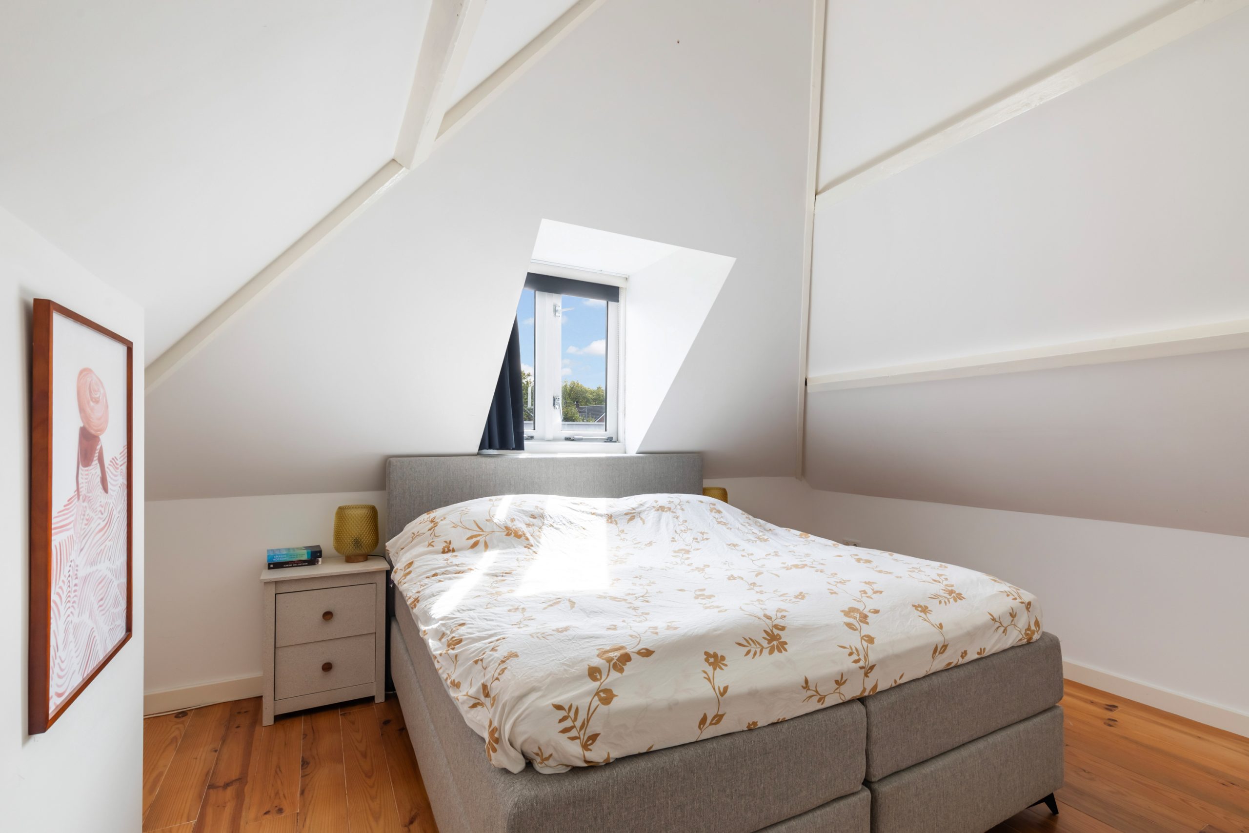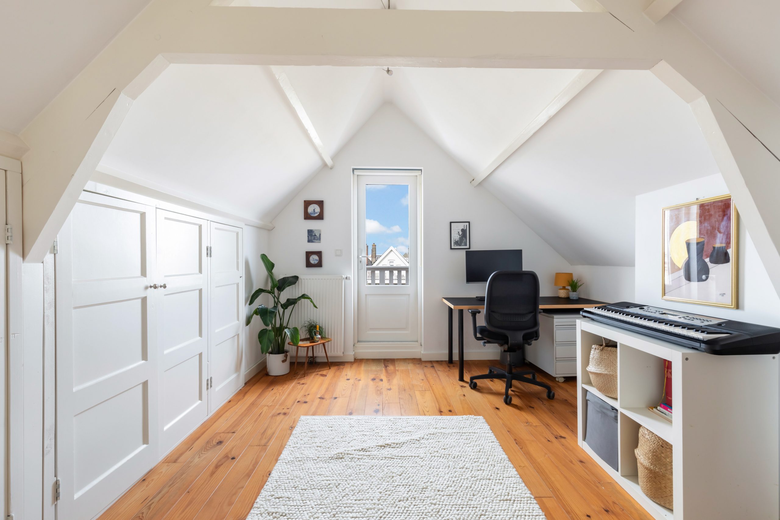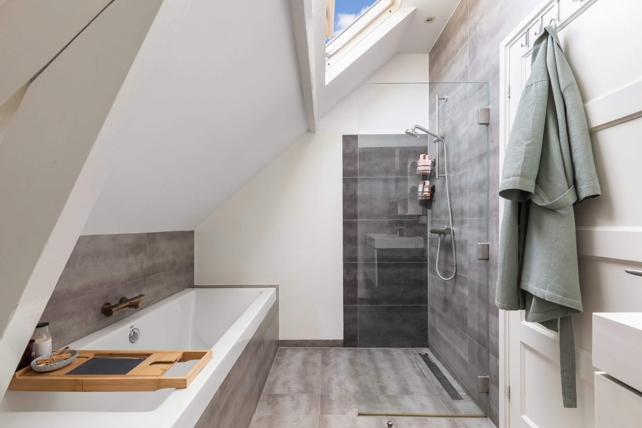 Overloop met berging en toegang tot alle vertrekken op deze verdieping. De master bedroom is gelegen aan de achterzijde van de woning. Deze heerlijk ruime kamer is multifunctioneel in te richten als werk-, kinder- of slaapkamer. Ook beschikt de kamer over een grote inbouwkast, erg handig voor extra opbergruimte. Via een deur is er toegang tot het balkon gelegen op het zonnige noordwesten waarbij je zomers van de heerlijke avondzon kan geniet. De 2e slaapkamer, die tevens is voorzien van een op maat gemaakte inbouwkast, bevindt zich aan de voorzijde. De moderne badkamer is tussen beide kamers in gelegen en is beschikt over een inloopdouche, ligbad, dubbele wastafel met meubel en een toilet. Op de bovenverdieping zijn beide slaapkamers voorzien van airco.
