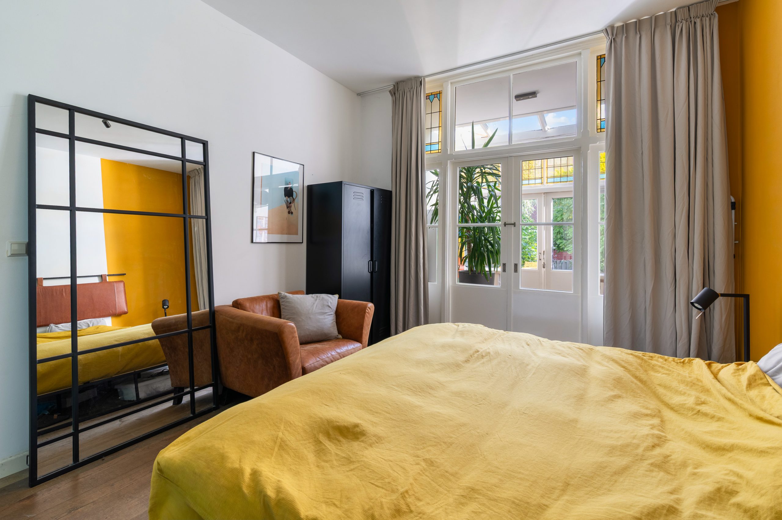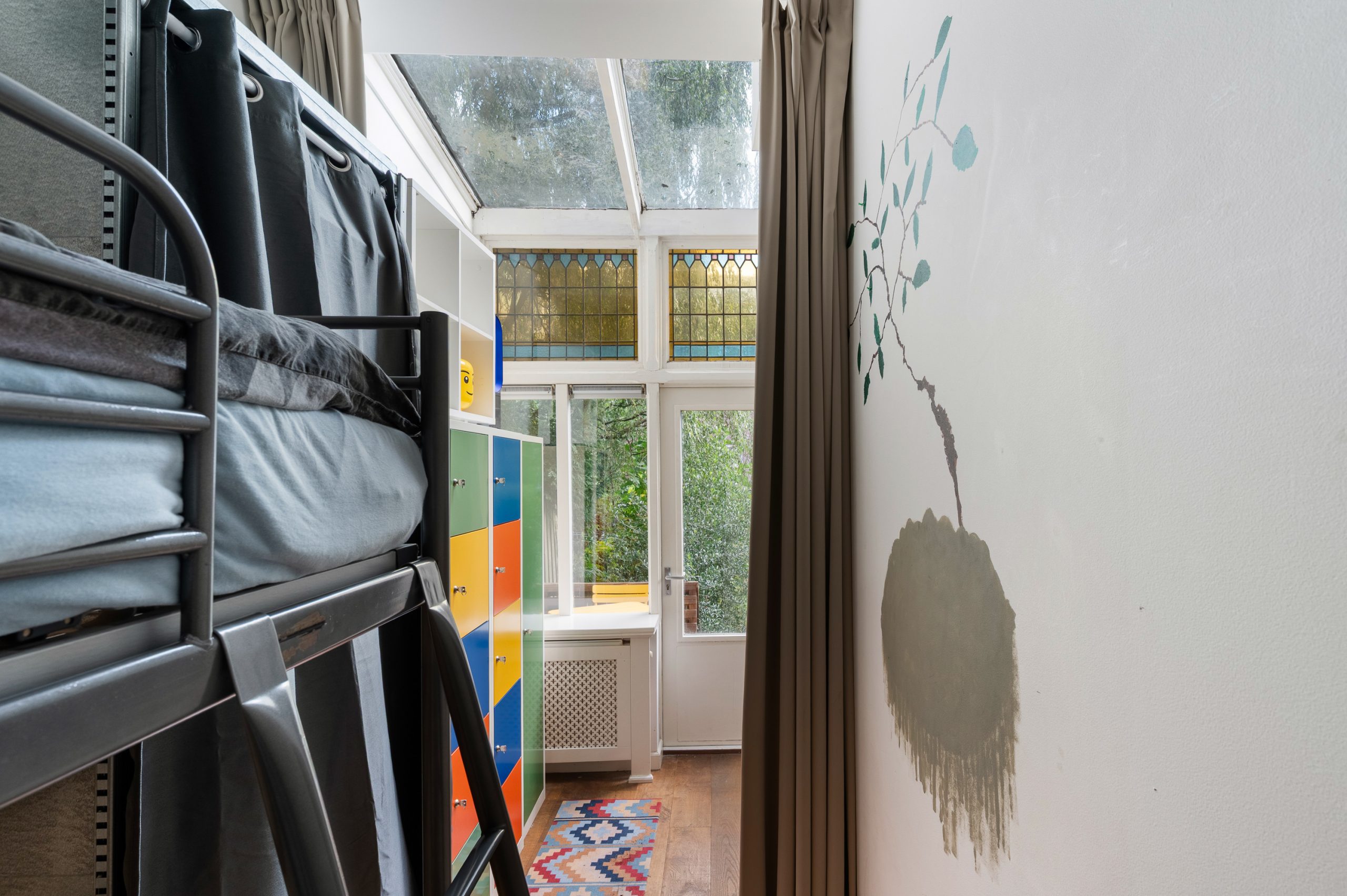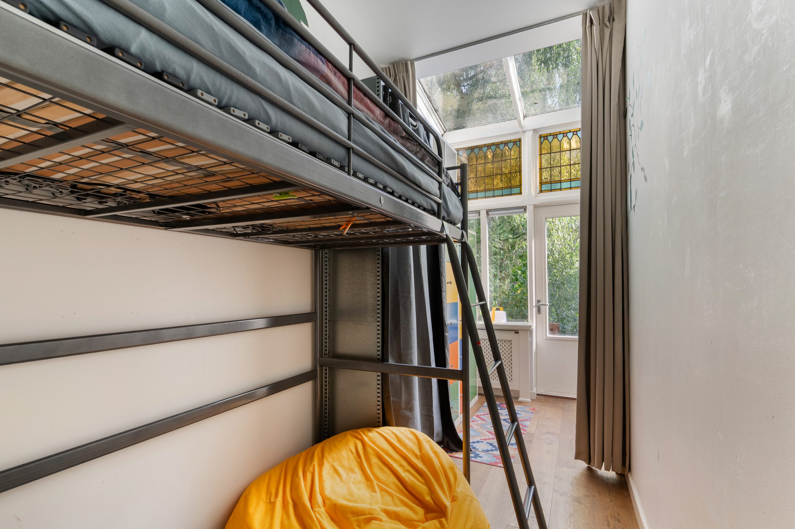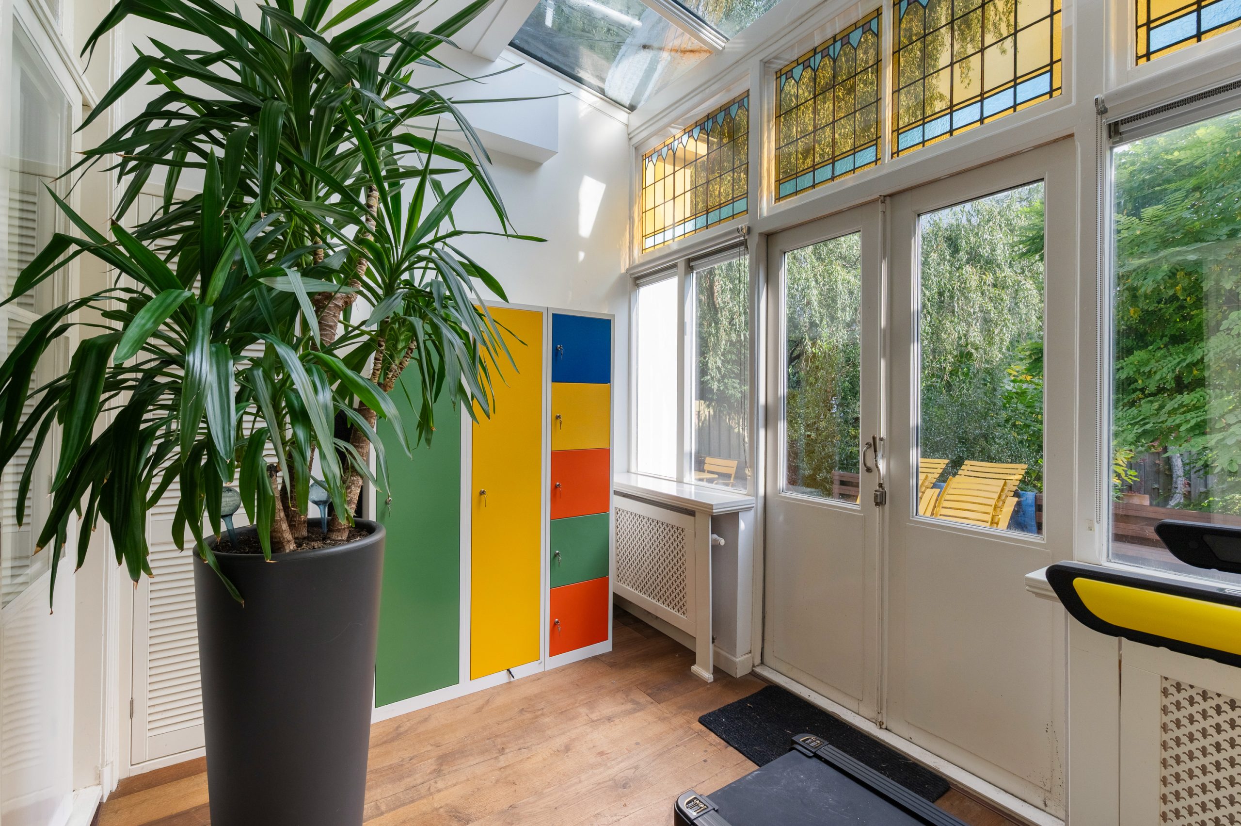 Entree met tochtportaal, vaste kast en toegang tot de woonkamer. Aan de voorzijde van de woning bevindt zich de sfeervolle woonkamer, die met een plafondhoogte van maar liefst 3,16 meter een bijzonder ruimtelijk gevoel geeft. Dankzij de grote raampartijen met karakteristiek glas-in-lood treedt er veel natuurlijk licht naar binnen wat zorgt voor een ruime, lichte sfeer. Het stijlvolle kookeiland met bar is het hart van deze open woonkeuken, waar koken en gezelligheid perfect samenkomen. Het is de ideale plek om lekker in contact te blijven met je gezelschap, terwijl je geniet van de open, gezellige sfeer. De keuken beschikt over diverse soorten inbouwapparatuur zoals een 4-pits inductie kookplaat met geïntrigeerde afzuiging, vaatwasser, oven en een koel-/vriescombinatie. Via de hal, waar zich een vaste kast (met wasmachineaansluiting) en een separaat toilet bevinden, bereik je de gerenoveerde badkamer. De moderne, volledig betegelde badkamer beschikt over een inloop(regen)douche, handdoekradiator en een wastafel met meubel. De master bedroom is gelegen aan de achterzijde van de woning. Dit is een ruime en lichte kamer met mooie karakteristieke jaren ’30 details. Door middel van antieke schuifdeuren bereik je de serre met dakraam en glas-in-lood wat het een zeer luxueuze sfeer geeft en welke multifunctioneel is in te richten, bijvoorbeeld als extra slaapkamer of hobbyruimte. Via deze kamers bereik je het terras, gelegen op het oosten. Een perfecte plek om op zomerse avonden te genieten van het buitenleven en uitgebreid te dineren. Middels een trap bereik je de lager gelegen achtertuin van maar liefst 88 m2! De tuin biedt alle mogelijkheden om geheel naar eigen smaak en wens in te richten, zodat je er jouw ideale buitenruimte van kunt maken.