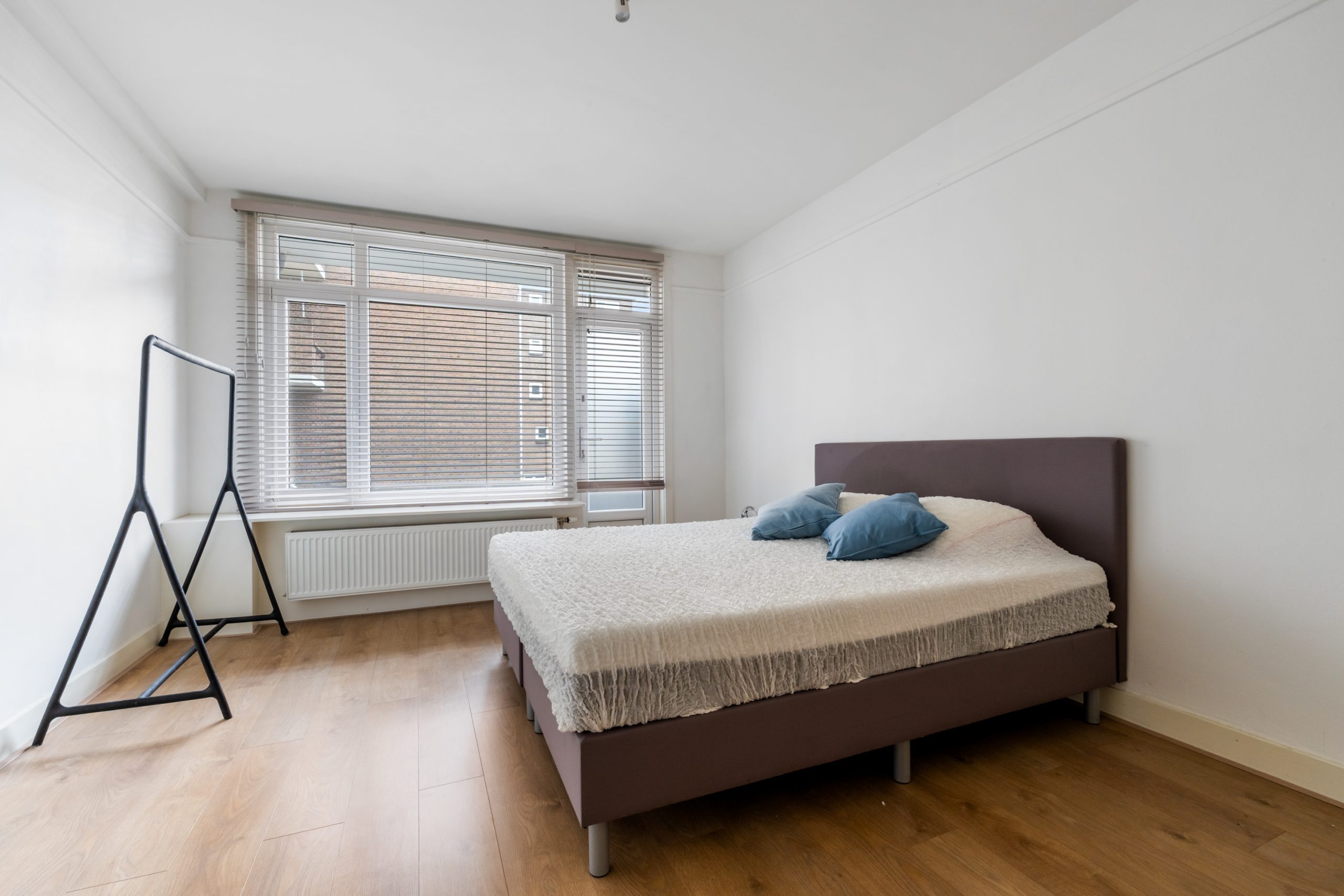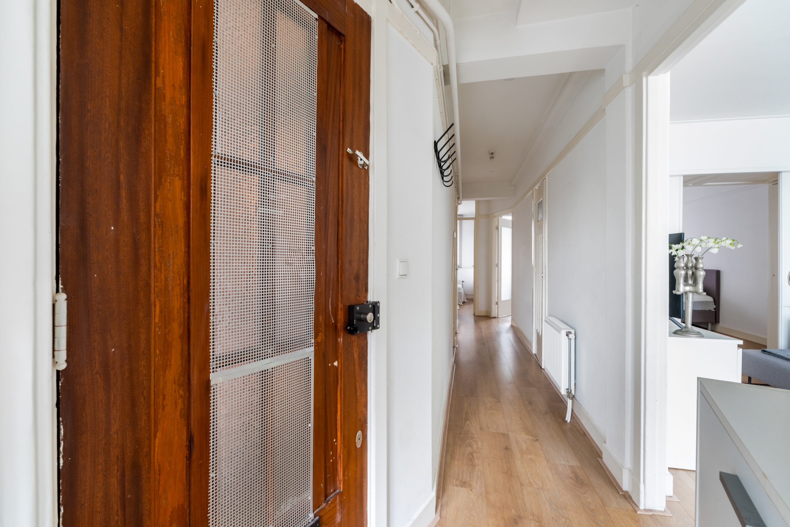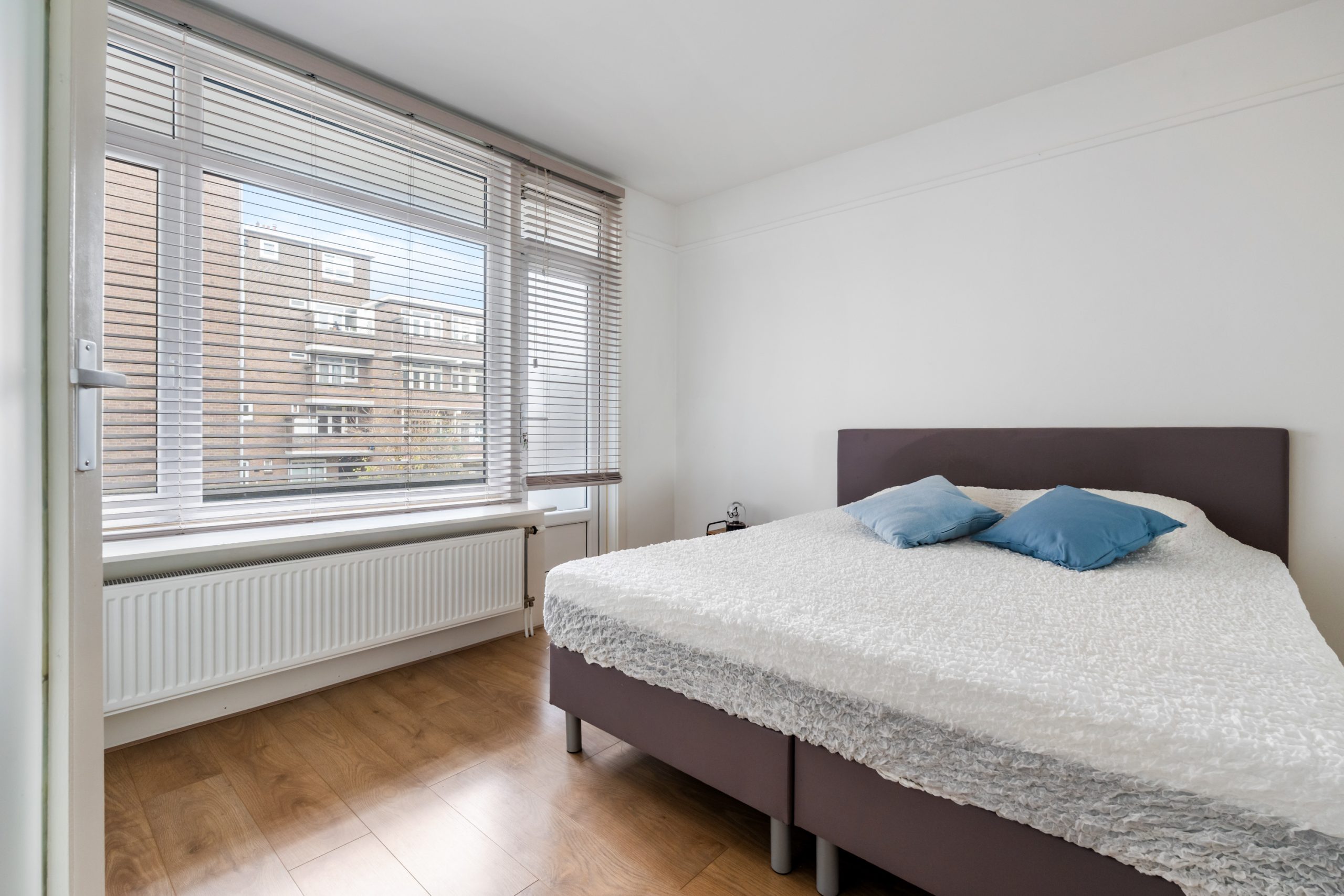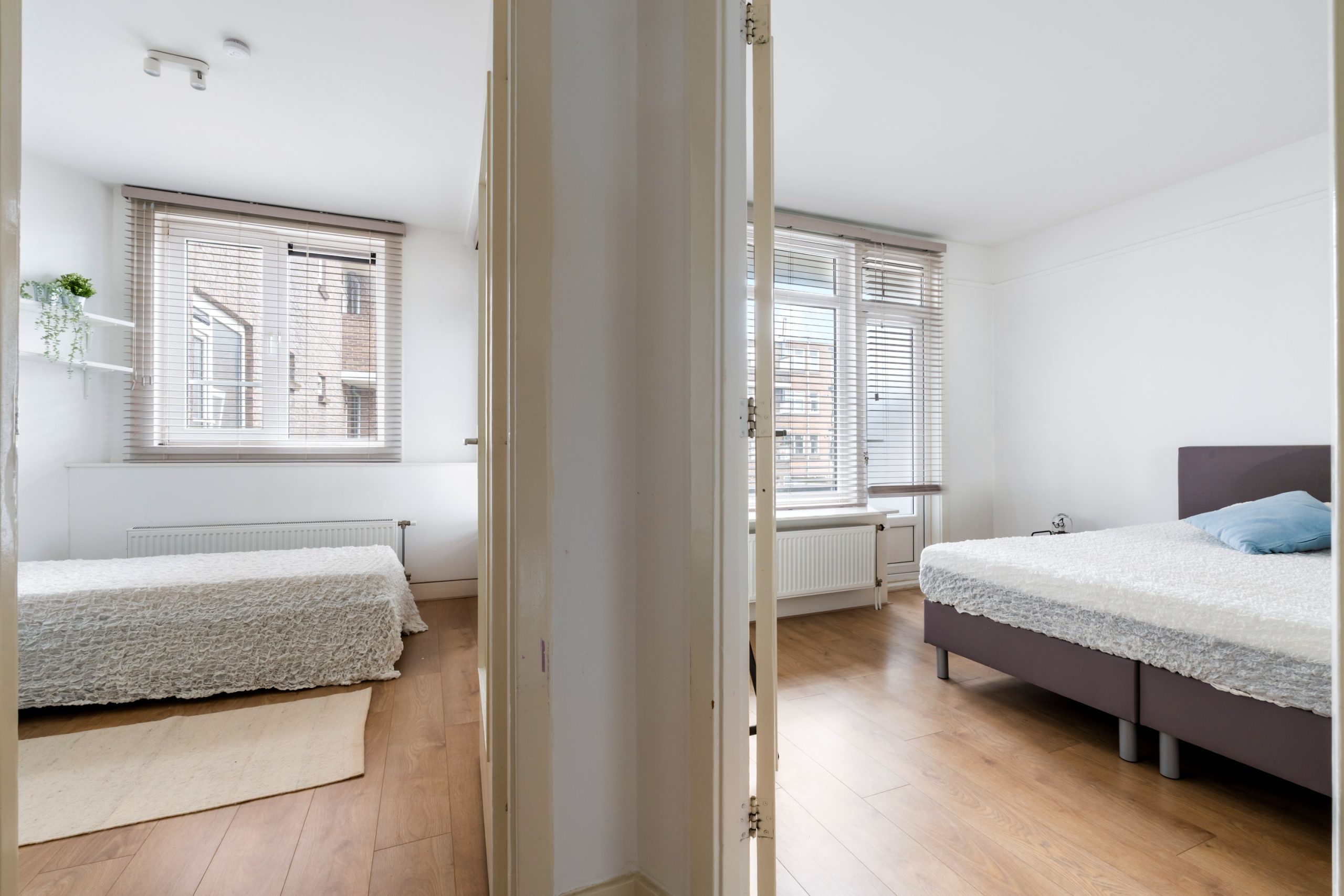 Ruime hal met toegang tot alle vertrekken. Aan de voorzijde bevindt zich de zonnige en lichte woonkamer. De grote raampartijen zorgen voor een lichte, prettige sfeer. Aan de achterzijde is de ruime master bedroom gelegen, gescheiden door de originele en suite-deuren met glas-in-loodramen en 2 vaste kasten. Deze indeling maakt het mogelijk om de achterkamer ook te gebruiken als extra living of werkkamer. De 2e slaapkamer is bereikbaar via de hal en biedt, net als de hoofdslaapkamer, toegang tot het balkon. Hier heb je een mooi uitzicht over de groene binnentuinen. De L-vormige, representatieve, keuken (voorzijde) is voorzien van een 4-pits gasfornuis, afzuigkap, vaatwasser, oven, koelkast en voldoende opbergruimte. De moderne badkamer is voorzien van een zwevend toilet, inloopdouche, designradiator en een wastafelmeubel. In de hal vind je een aparte kast met de wasmachine.