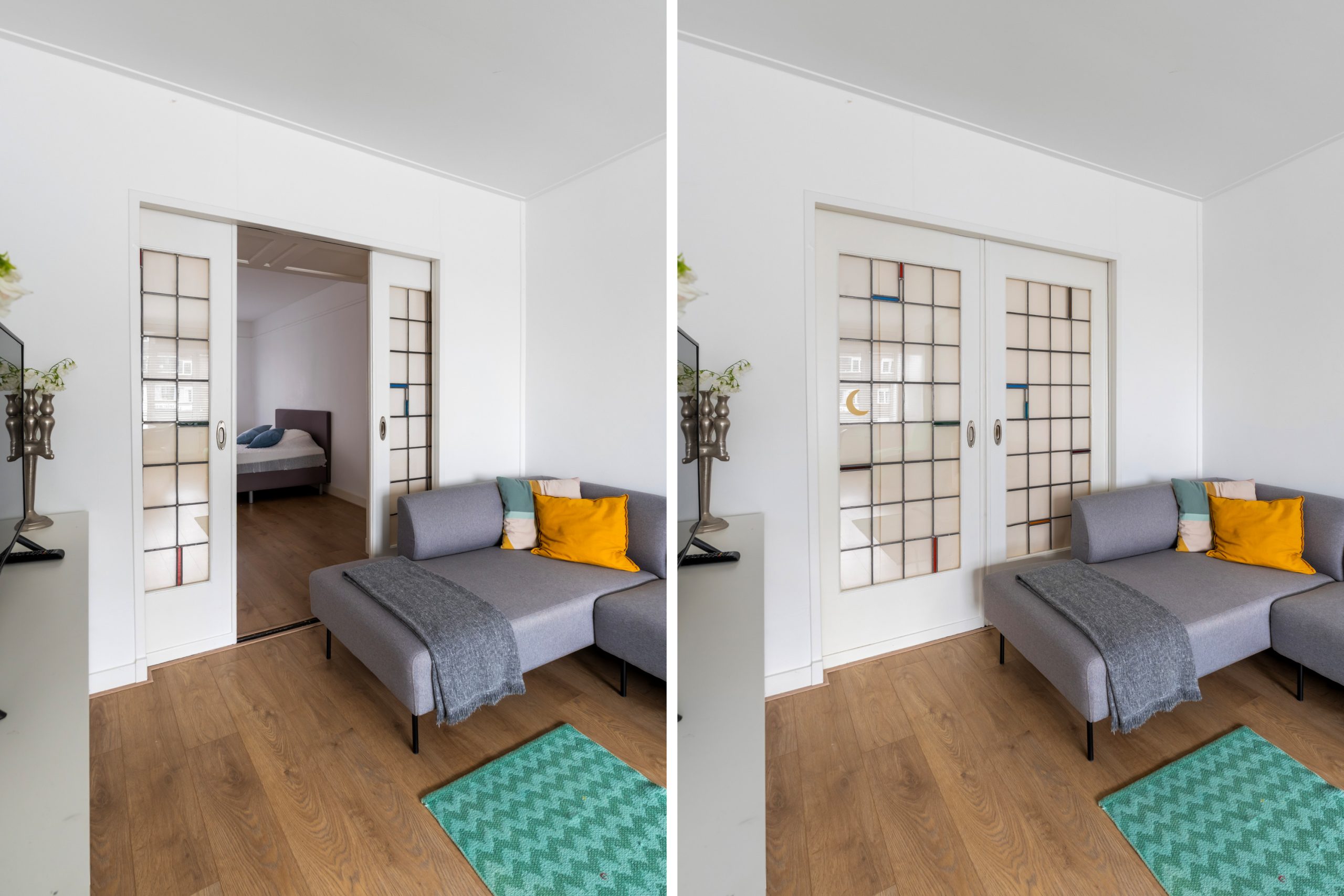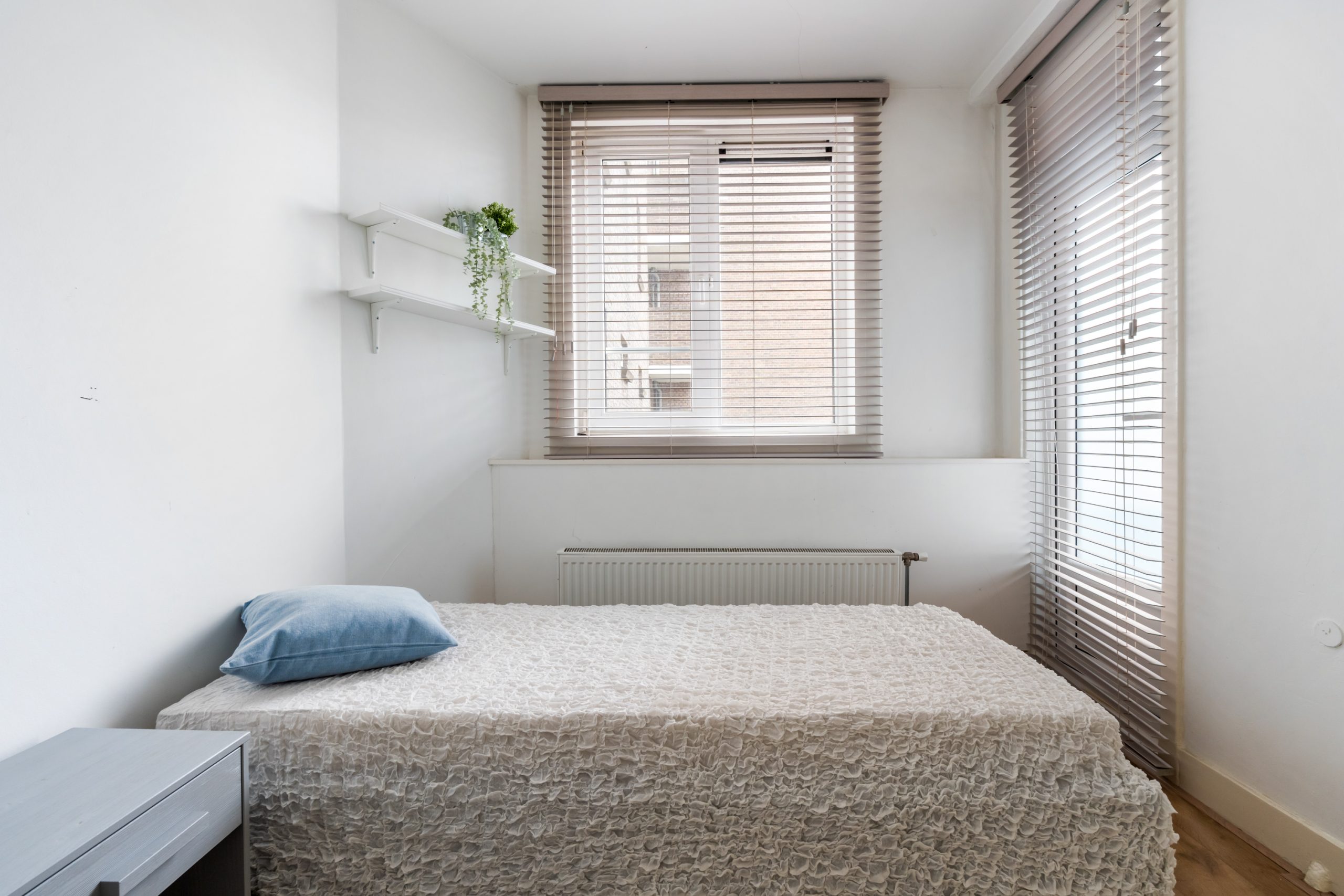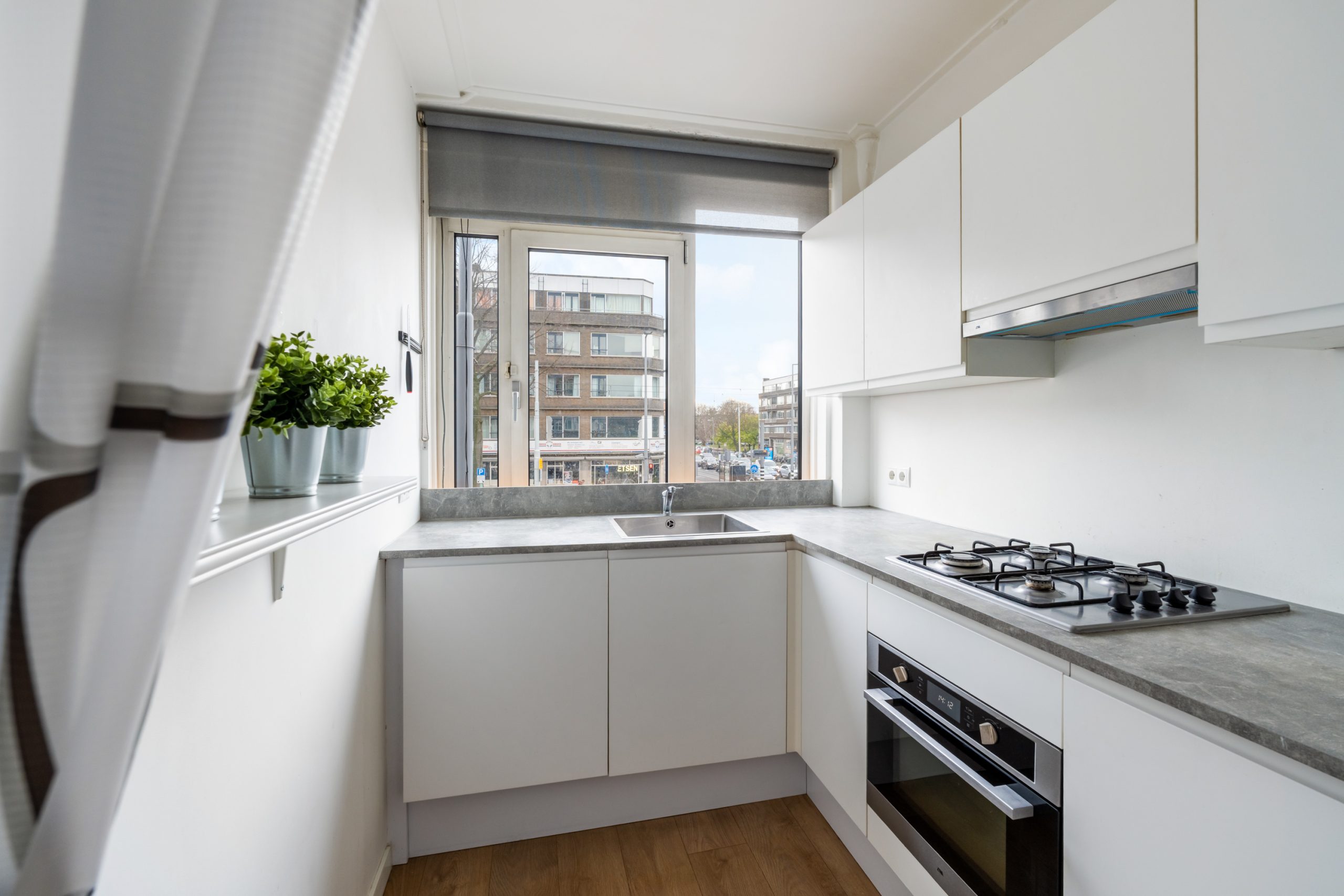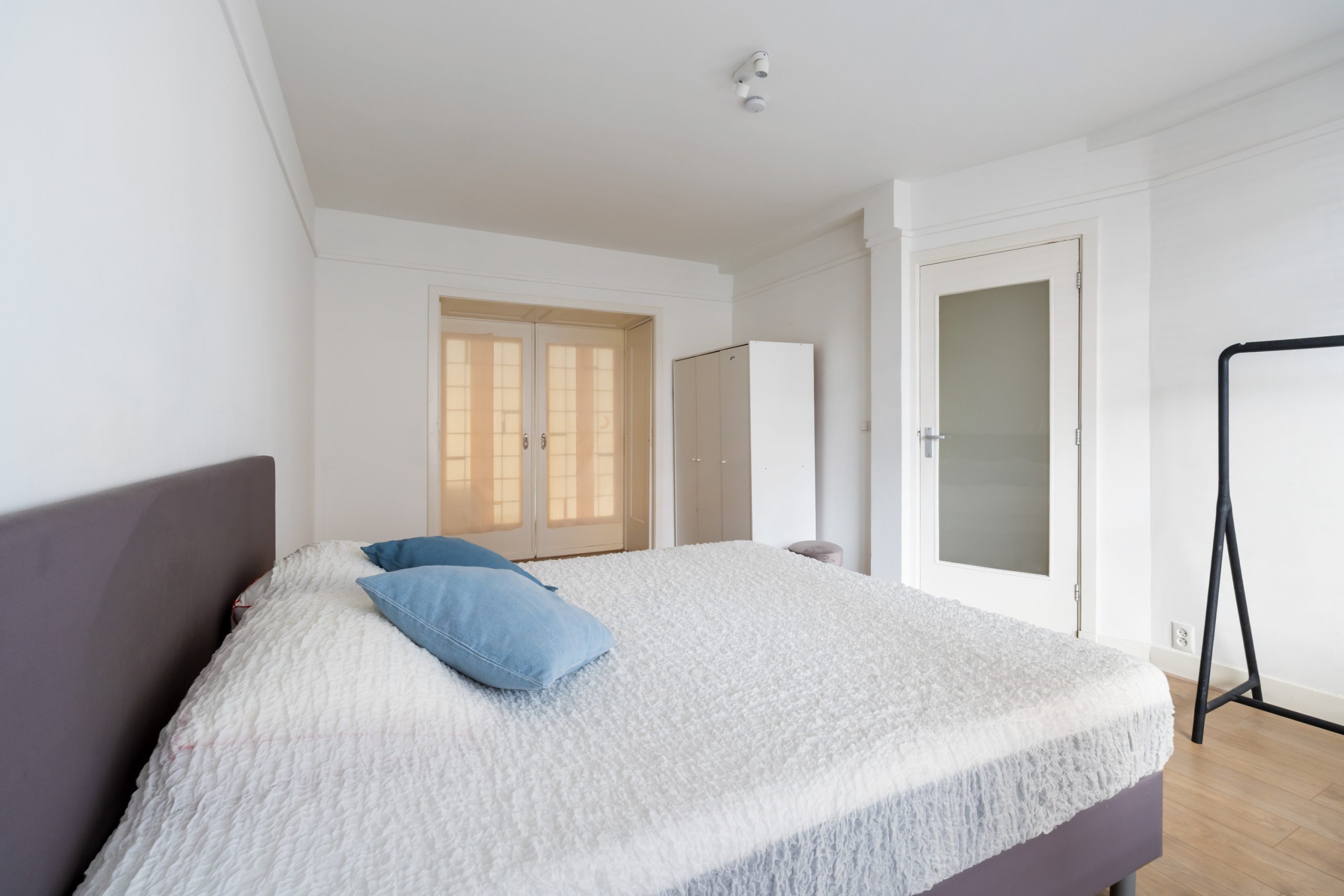 Ruime hal met toegang tot alle vertrekken. Aan de voorzijde bevindt zich de zonnige en lichte woonkamer. De grote raampartijen zorgen voor een lichte, prettige sfeer. Aan de achterzijde is de ruime master bedroom gelegen, gescheiden door de originele en suite-deuren met glas-in-loodramen en 2 vaste kasten. Deze indeling maakt het mogelijk om de achterkamer ook te gebruiken als extra living of werkkamer. De 2e slaapkamer is bereikbaar via de hal en biedt, net als de hoofdslaapkamer, toegang tot het balkon. Hier heb je een mooi uitzicht over de groene binnentuinen. De L-vormige, representatieve, keuken (voorzijde) is voorzien van een 4-pits gasfornuis, afzuigkap, vaatwasser, oven, koelkast en voldoende opbergruimte. De moderne badkamer is voorzien van een zwevend toilet, inloopdouche, designradiator en een wastafelmeubel. In de hal vind je een aparte kast met de wasmachine.