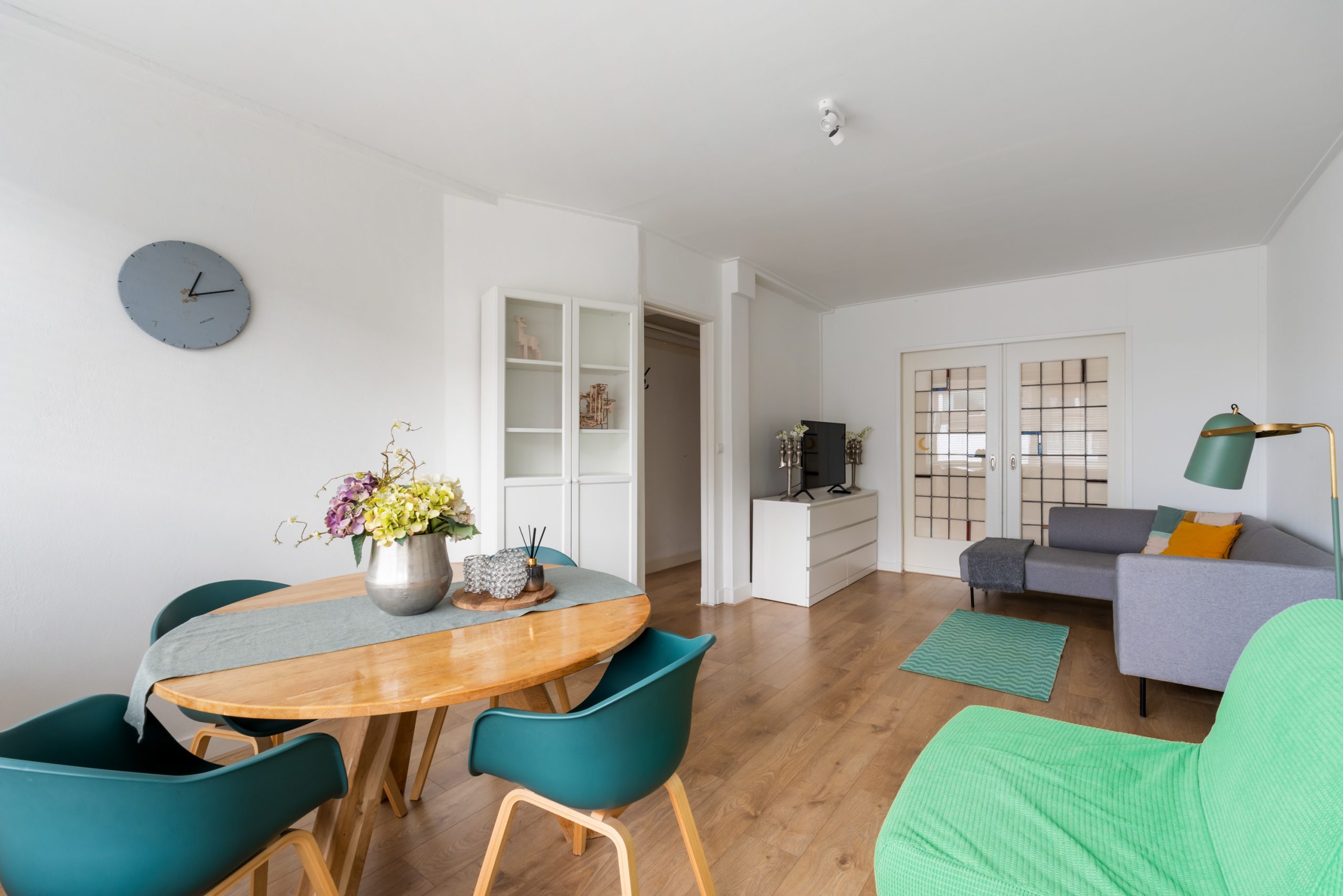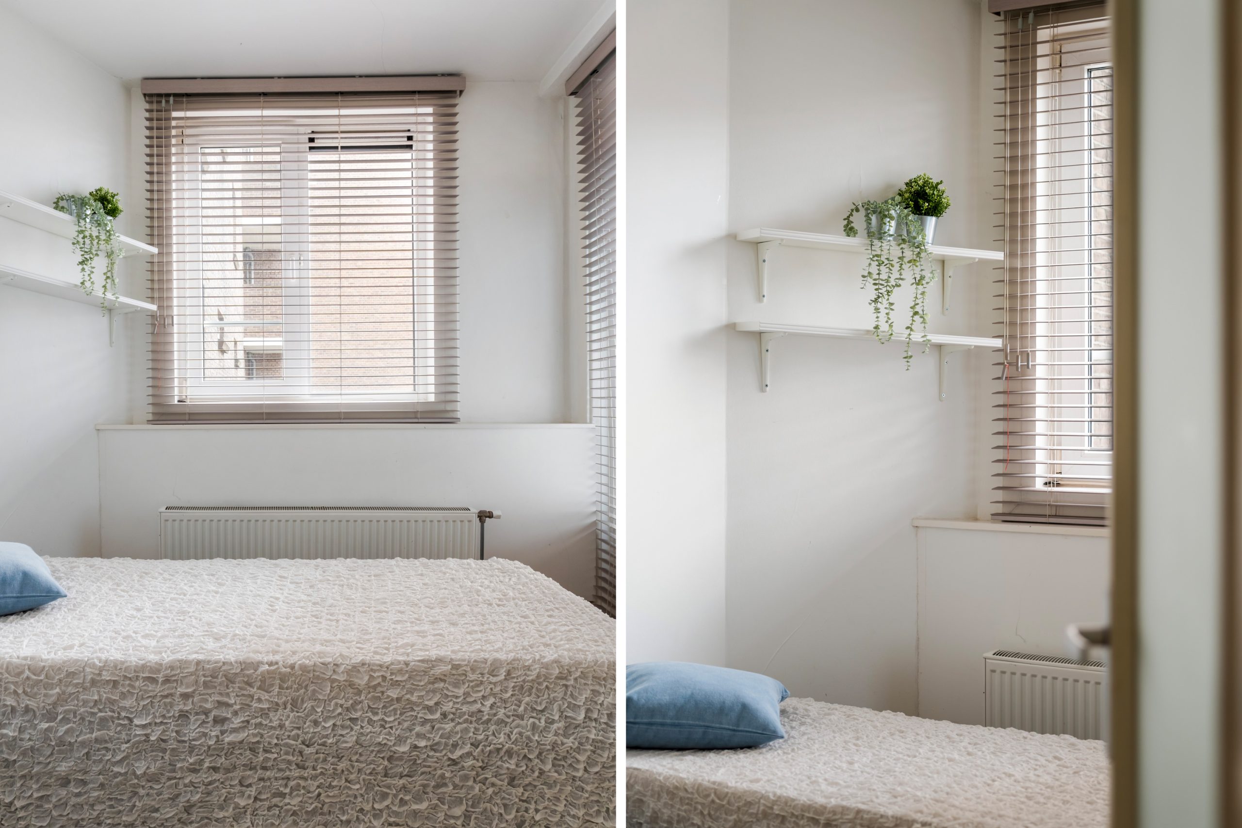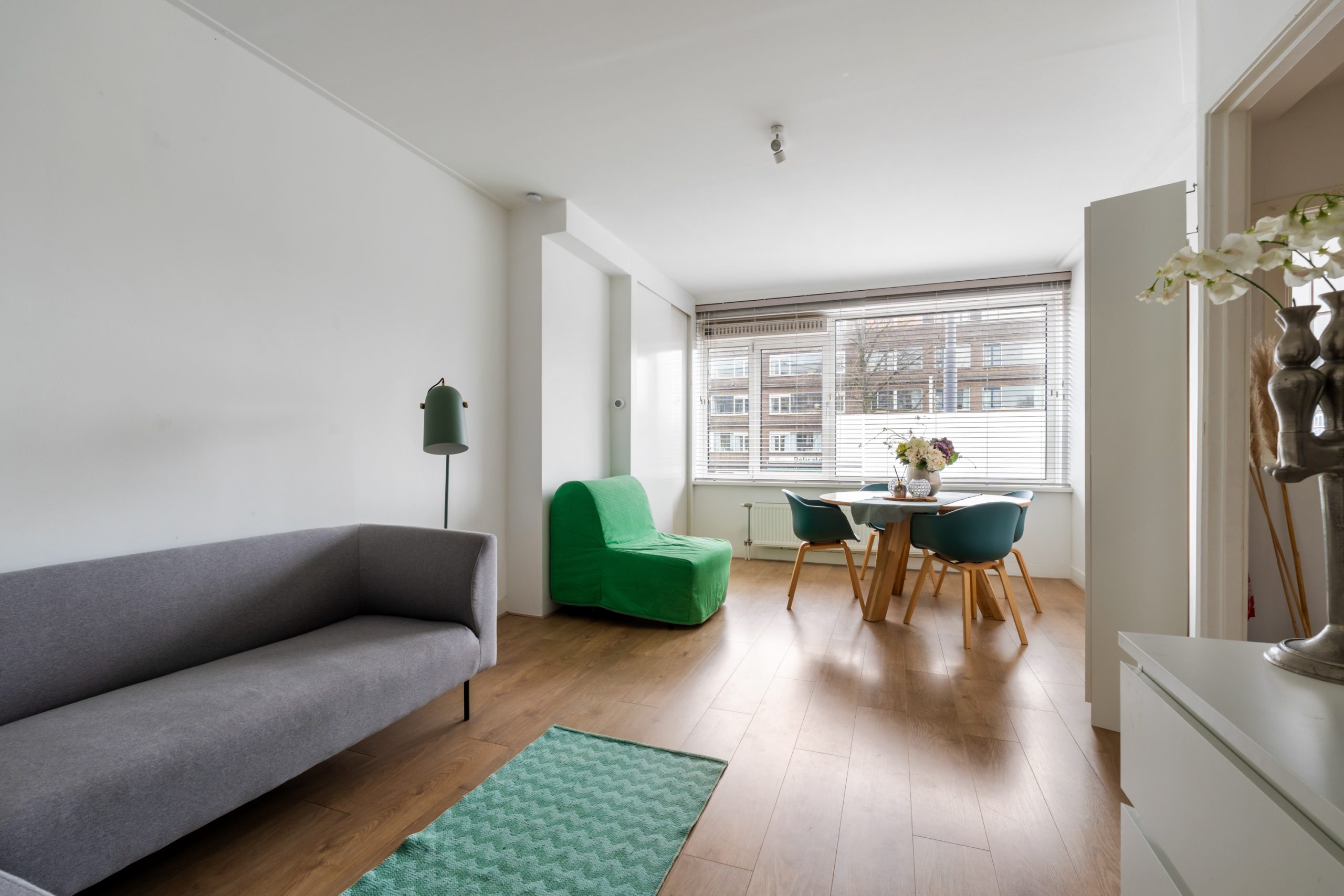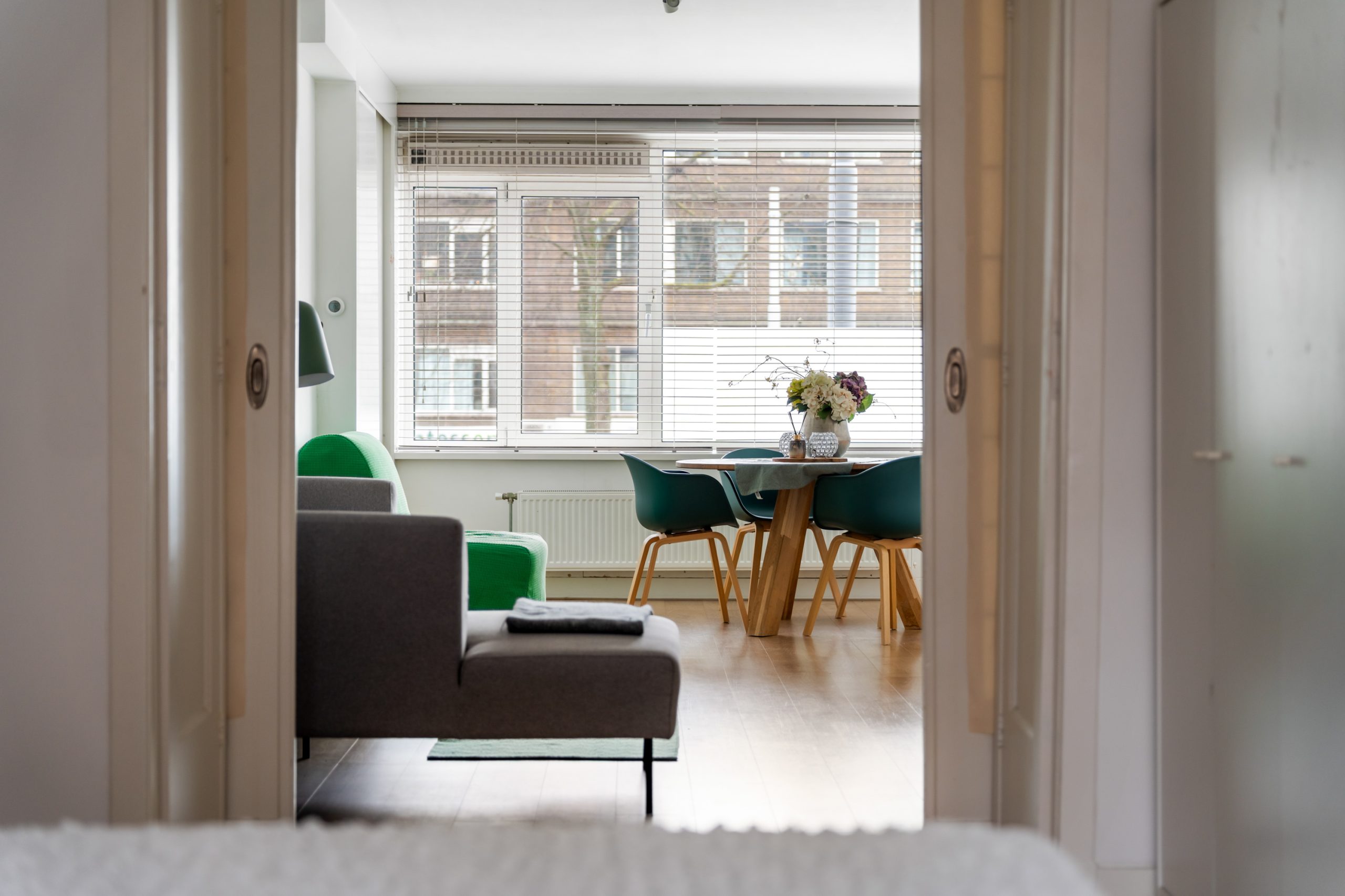Ruime hal met toegang tot alle vertrekken. Aan de voorzijde bevindt zich de zonnige en lichte woonkamer. De grote raampartijen zorgen voor een lichte, prettige sfeer. Aan de achterzijde is de ruime master bedroom gelegen, gescheiden door de originele en suite-deuren met glas-in-loodramen en 2 vaste kasten. Deze indeling maakt het mogelijk om de achterkamer ook te gebruiken als extra living of werkkamer. De 2e slaapkamer is bereikbaar via de hal en biedt, net als de hoofdslaapkamer, toegang tot het balkon. Hier heb je een mooi uitzicht over de groene binnentuinen. De L-vormige, representatieve, keuken (voorzijde) is voorzien van een 4-pits gasfornuis, afzuigkap, vaatwasser, oven, koelkast en voldoende opbergruimte. De moderne badkamer is voorzien van een zwevend toilet, inloopdouche, designradiator en een wastafelmeubel. In de hal vind je een aparte kast met de wasmachine.