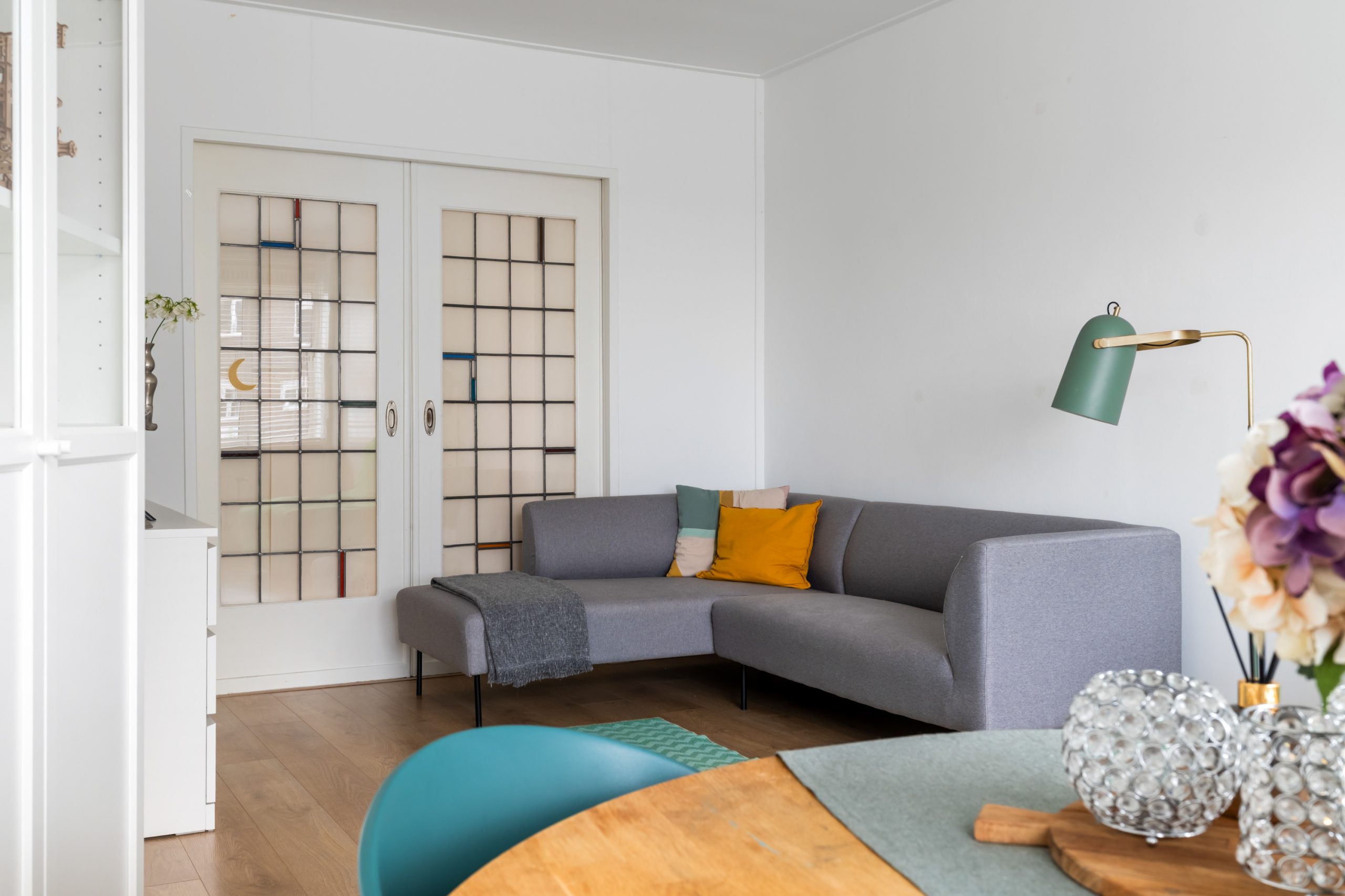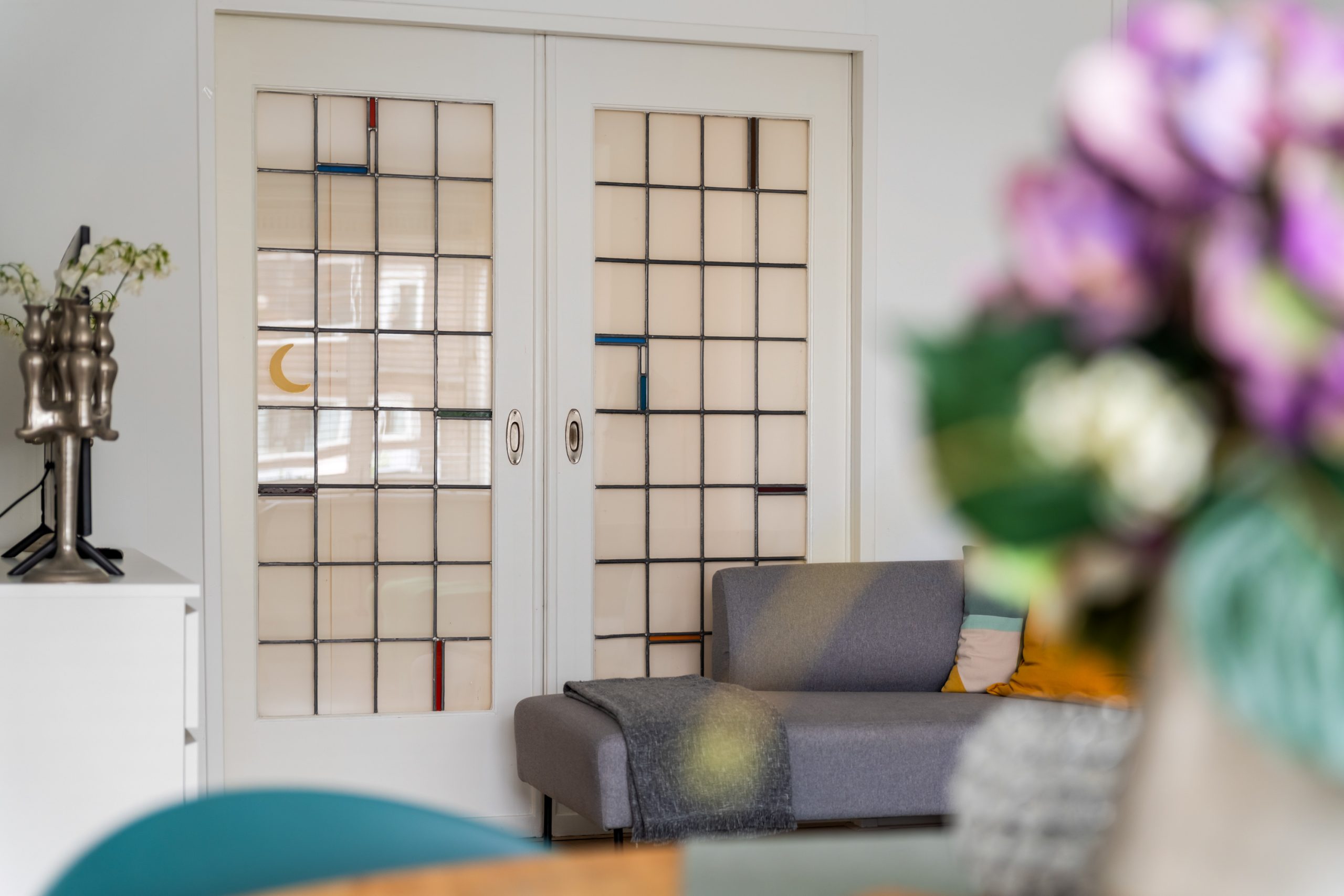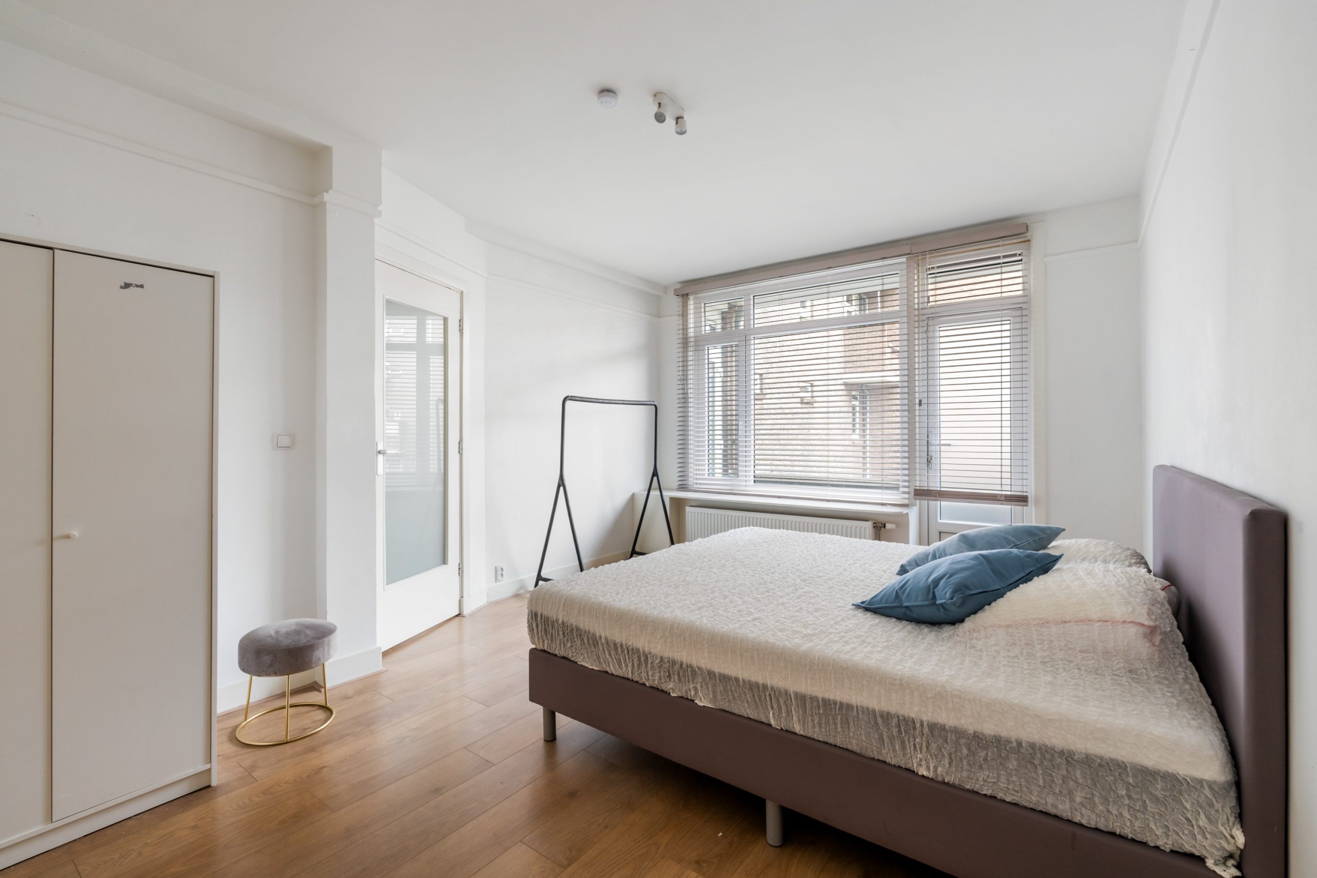 Ruime hal met toegang tot alle vertrekken. Aan de voorzijde bevindt zich de zonnige en lichte woonkamer. De grote raampartijen zorgen voor een lichte, prettige sfeer. Aan de achterzijde is de ruime master bedroom gelegen, gescheiden door de originele en suite-deuren met glas-in-loodramen en 2 vaste kasten. Deze indeling maakt het mogelijk om de achterkamer ook te gebruiken als extra living of werkkamer. De 2e slaapkamer is bereikbaar via de hal en biedt, net als de hoofdslaapkamer, toegang tot het balkon. Hier heb je een mooi uitzicht over de groene binnentuinen. De prachtige, L-vormige keuken (voorzijde) is voorzien van een 4-pits gasfornuis, afzuigkap, vaatwasser, oven, koelkast en voldoende opbergruimte. De moderne badkamer is voorzien van een zwevend toilet, inloopdouche, designradiator en een wastafelmeubel. In de hal vind je een aparte kast met de wasmachine.