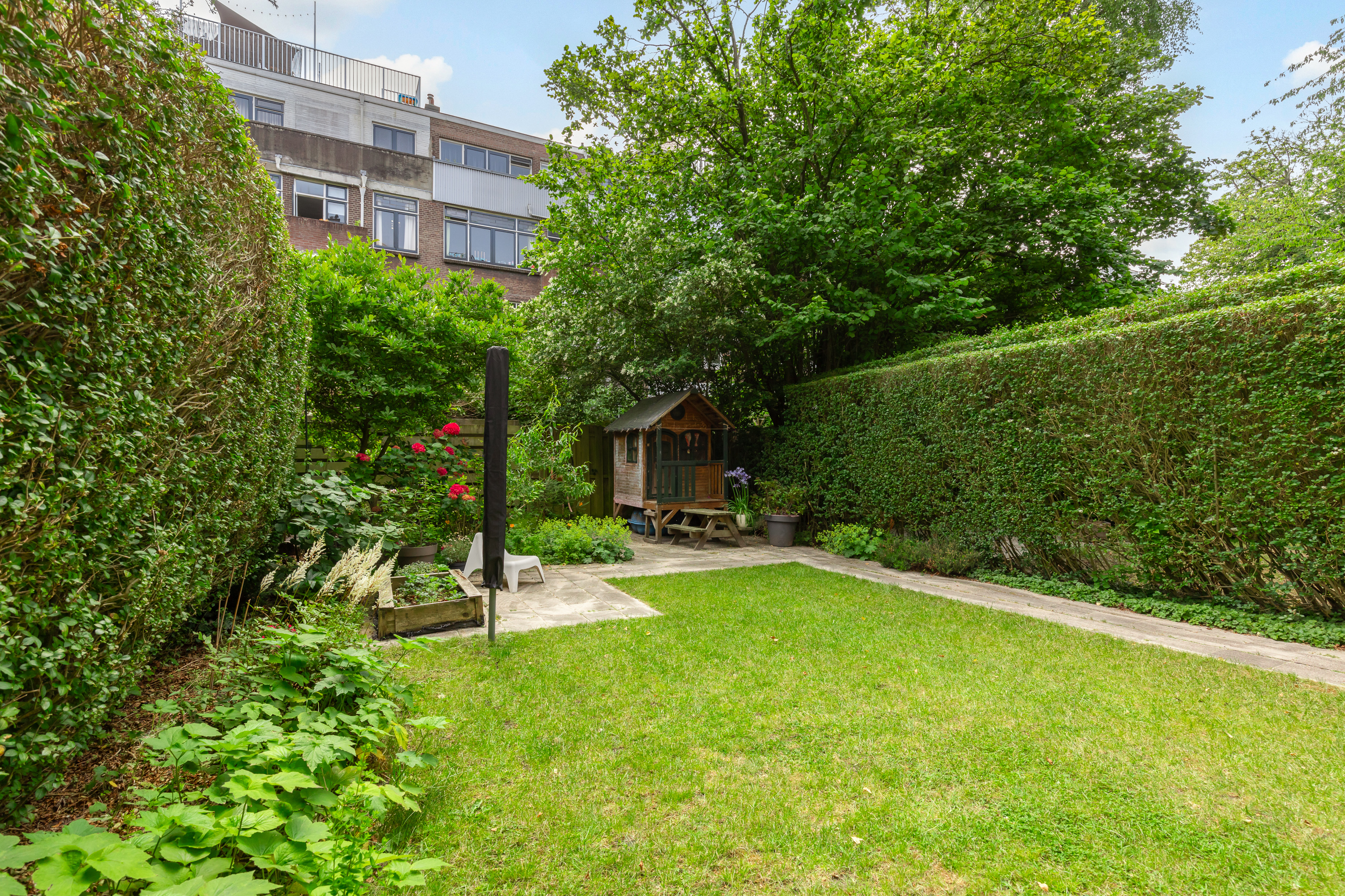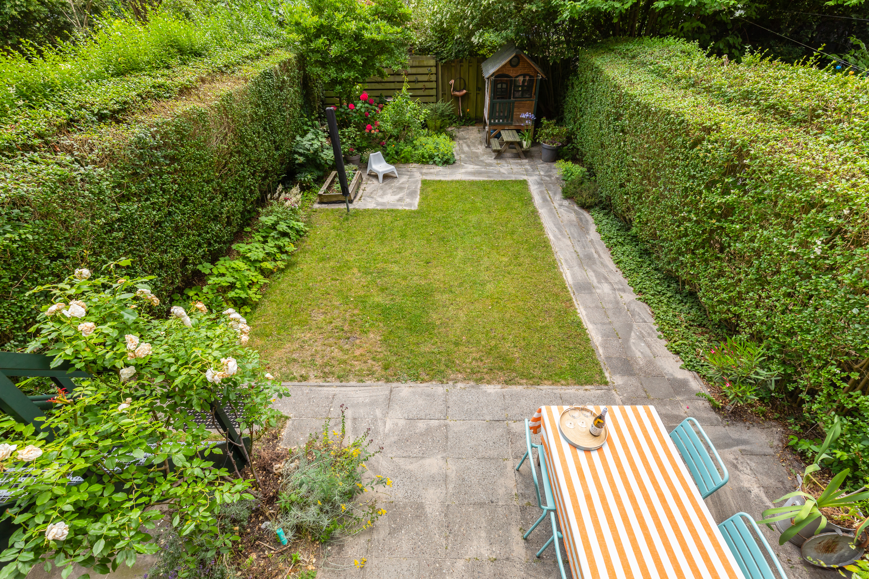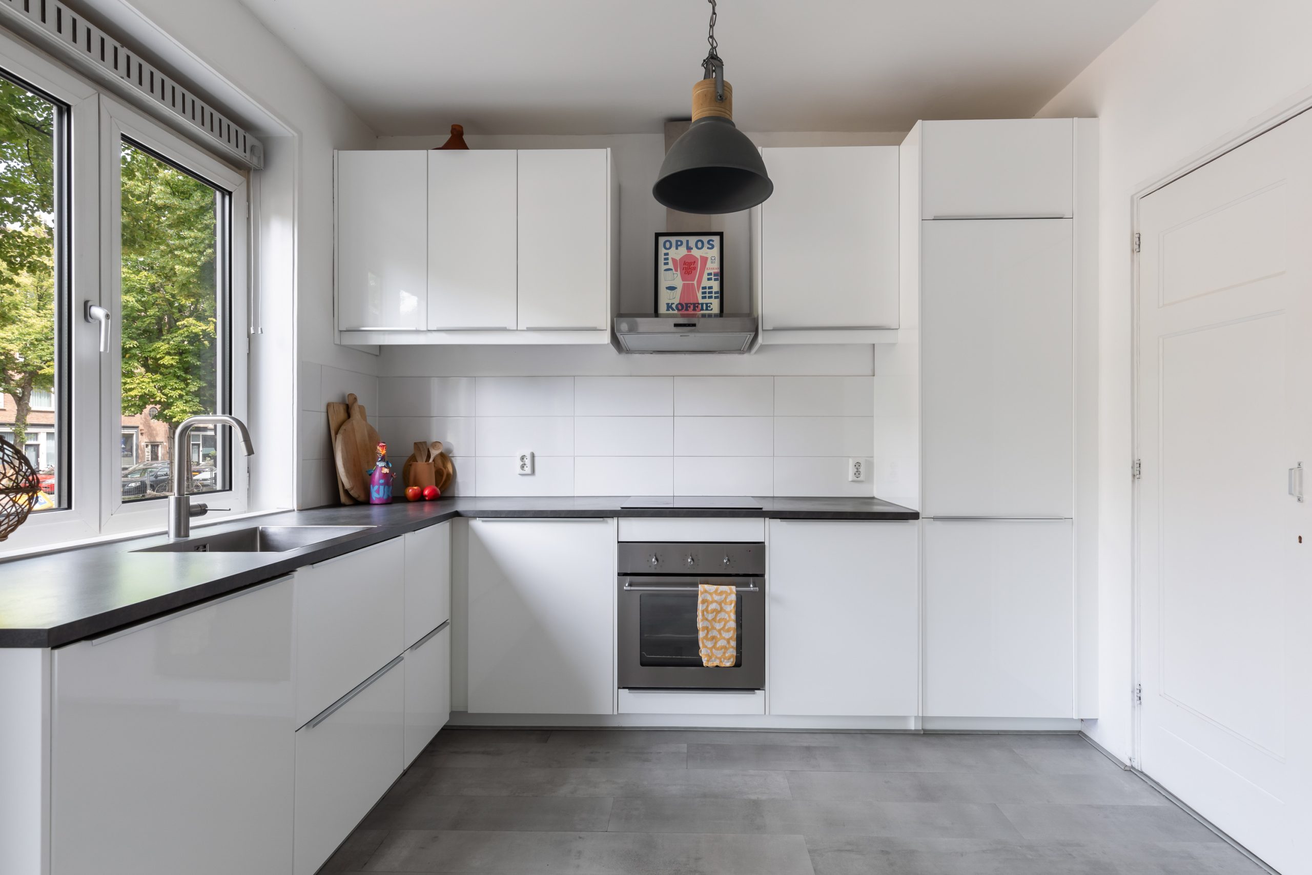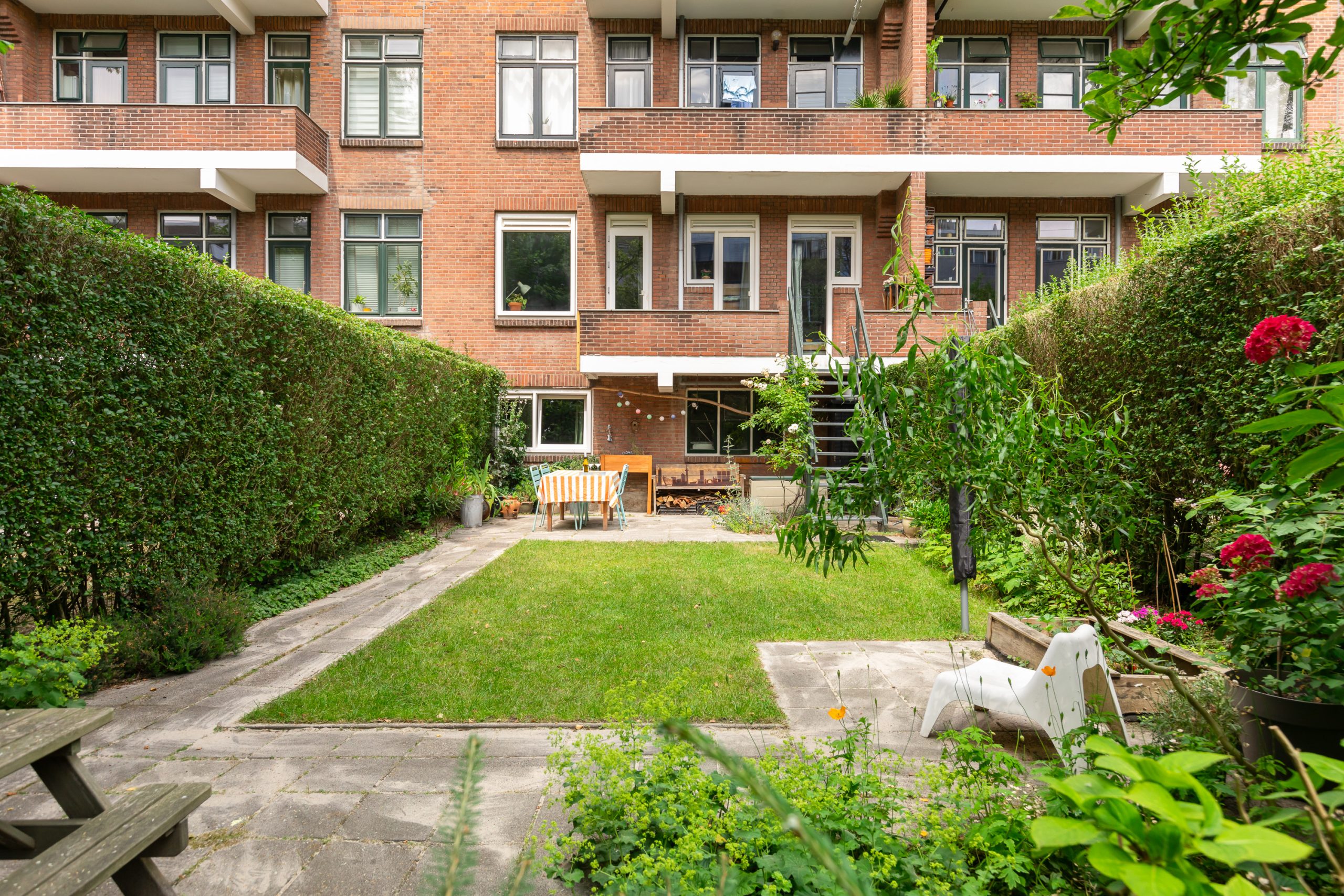 Hal/entree met meterkast en toegang tot alle vertrekken. De woonkamer is opgedeeld in een woon- en eetgedeelte en heeft een lengte van maar liefst ruim 10 meter. Door de grote raampartijen aan beide zijden treedt er veel licht de woning binnen, wat zorgt voor een fijne, lichte sfeer. Het zitgedeelte is gelegen aan de achterzijde en biedt toegang tot het balkon en de ruime tuin (zuid). Deze heerlijke tuin is zeer verzorgd te noemen en biedt door het oppervlakte van 98 m2 altijd een plek om van de zon te kunnen genieten. De open keuken beschikt over diverse inbouwapparatuur zoals een 4-pits inductie kookplaat, afzuigkap, oven, vaatwasser en koel-/vriescombinatie. Aan de achterzijde van de woning liggen twee slaapkamers, waarvan er één toegang heeft tot het balkon. Beide slaapkamers zijn goed geschikt als inloop-, werk- of slaapkamer. De badkamer is voorzien van een toilet, wastafel met wastafelmeubel en een douche.