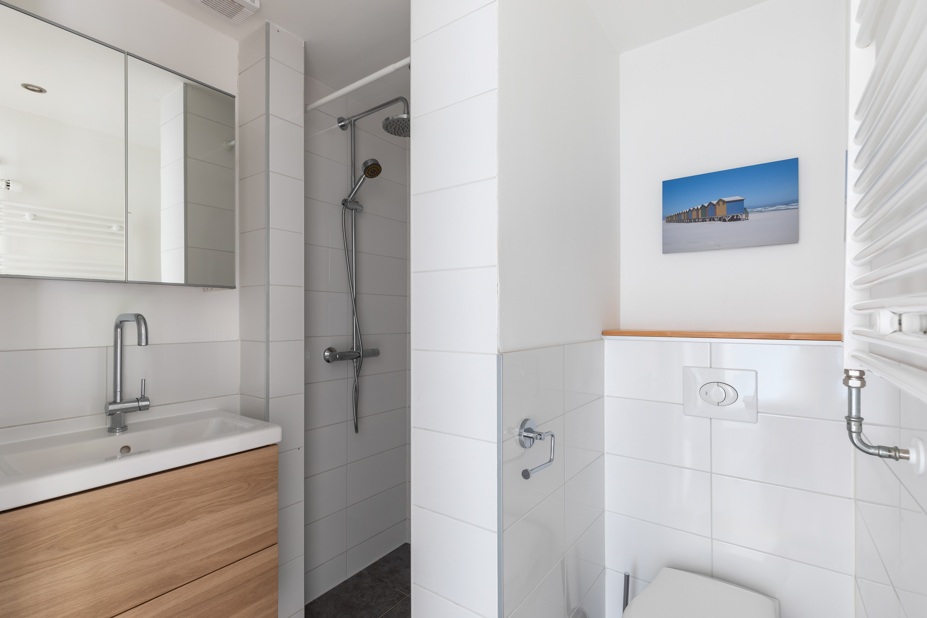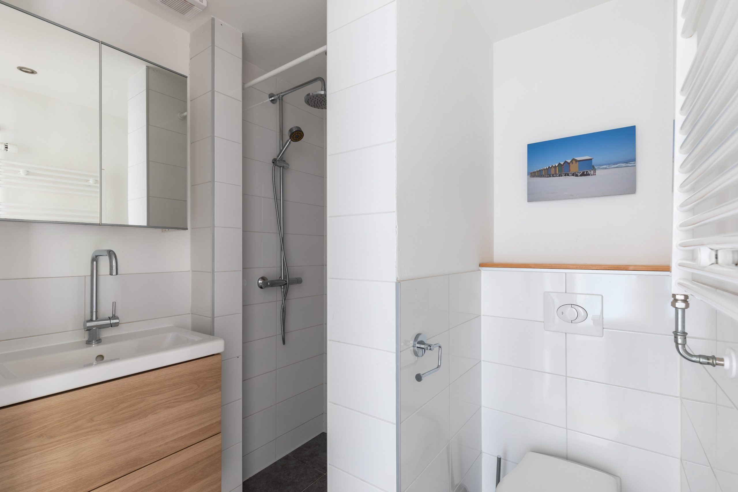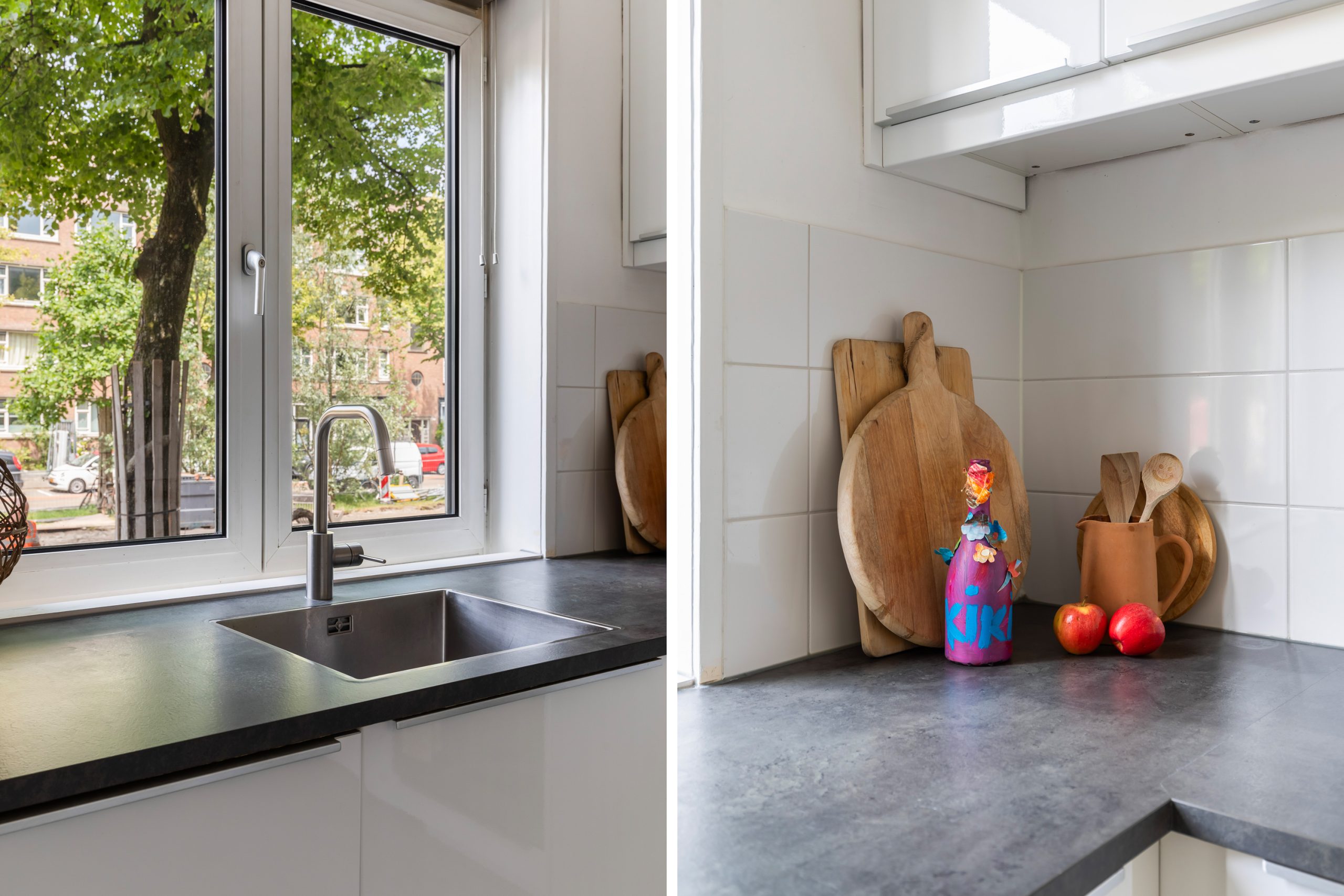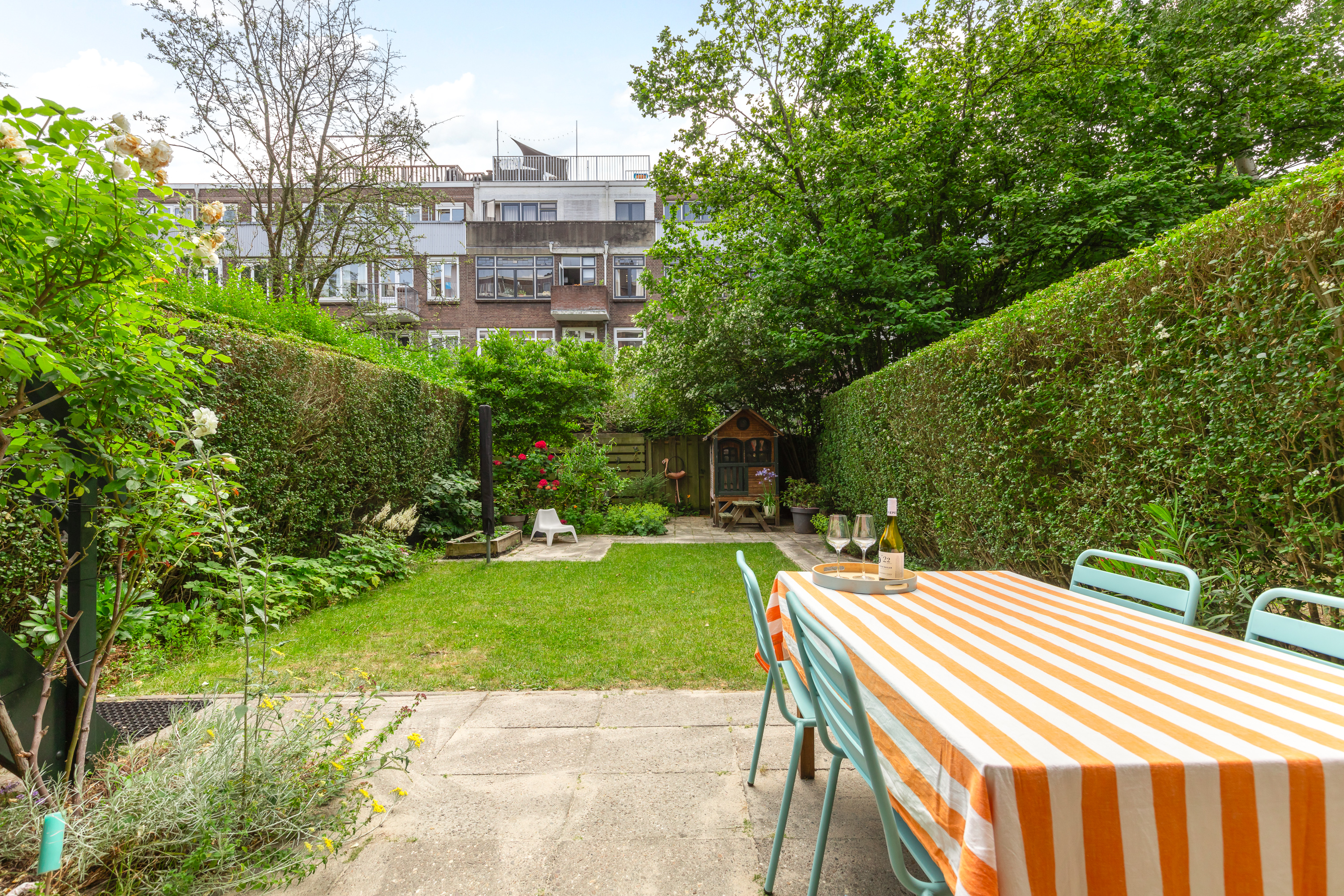 Hal/entree met meterkast en toegang tot alle vertrekken. De woonkamer is opgedeeld in een woon- en eetgedeelte en heeft een lengte van maar liefst ruim 10 meter. Door de grote raampartijen aan beide zijden treedt er veel licht de woning binnen, wat zorgt voor een fijne, lichte sfeer. Het zitgedeelte is gelegen aan de achterzijde en biedt toegang tot het balkon en de ruime tuin (zuid). Deze heerlijke tuin is zeer verzorgd te noemen en biedt door het oppervlakte van 98 m2 altijd een plek om van de zon te kunnen genieten. De open keuken beschikt over diverse inbouwapparatuur zoals een 4-pits inductie kookplaat, afzuigkap, oven, vaatwasser en koel-/vriescombinatie. Aan de achterzijde van de woning liggen twee slaapkamers, waarvan er één toegang heeft tot het balkon. Beide slaapkamers zijn goed geschikt als inloop-, werk- of slaapkamer. De badkamer is voorzien van een toilet, wastafel met wastafelmeubel en een douche.