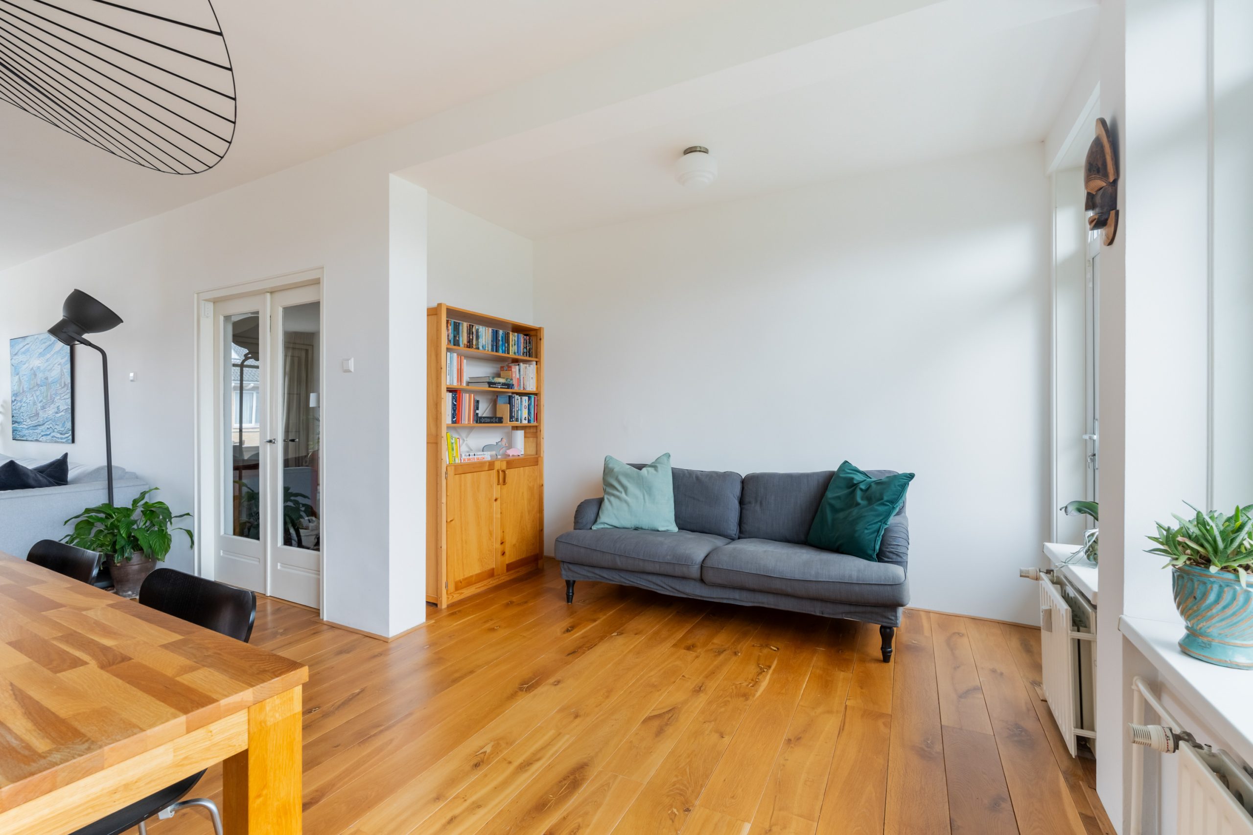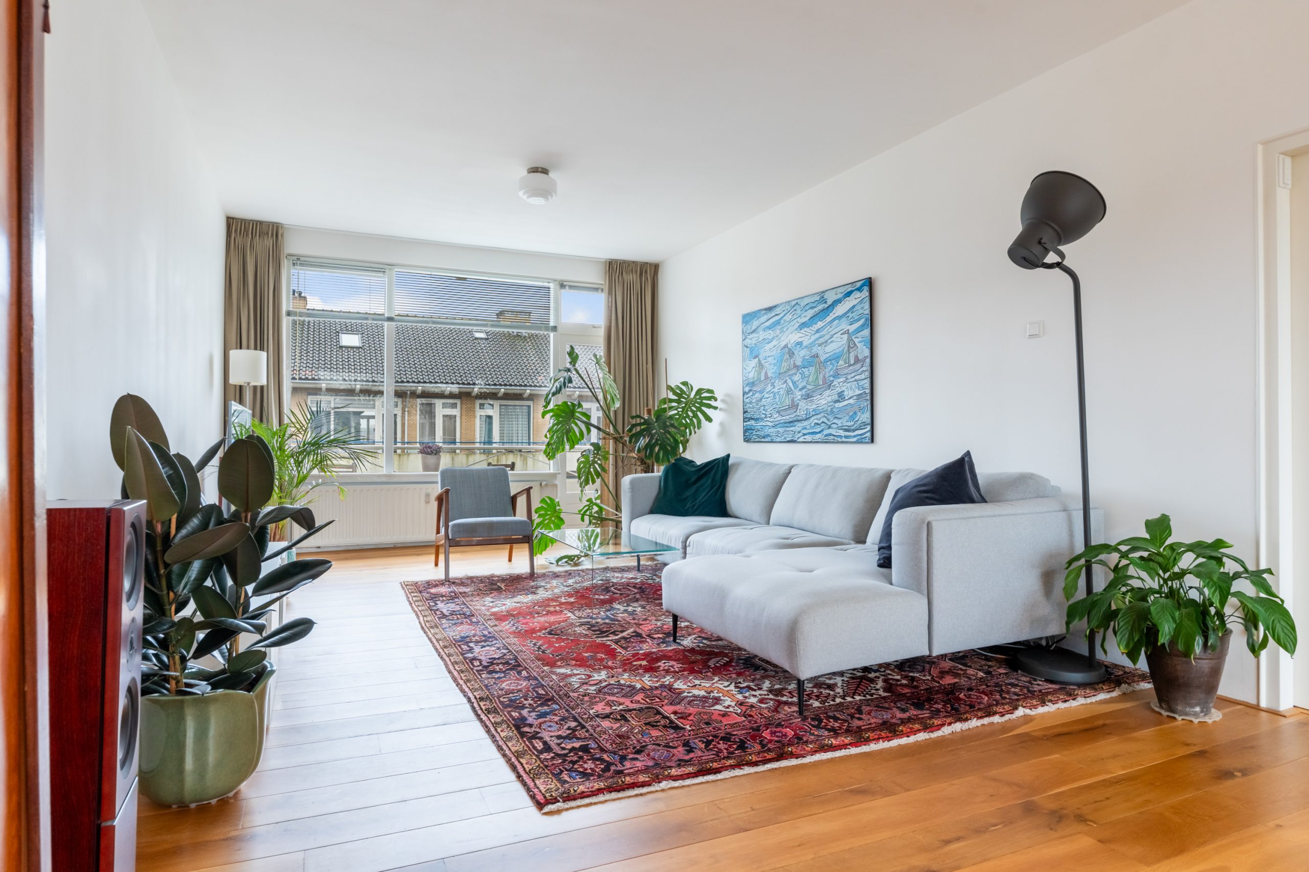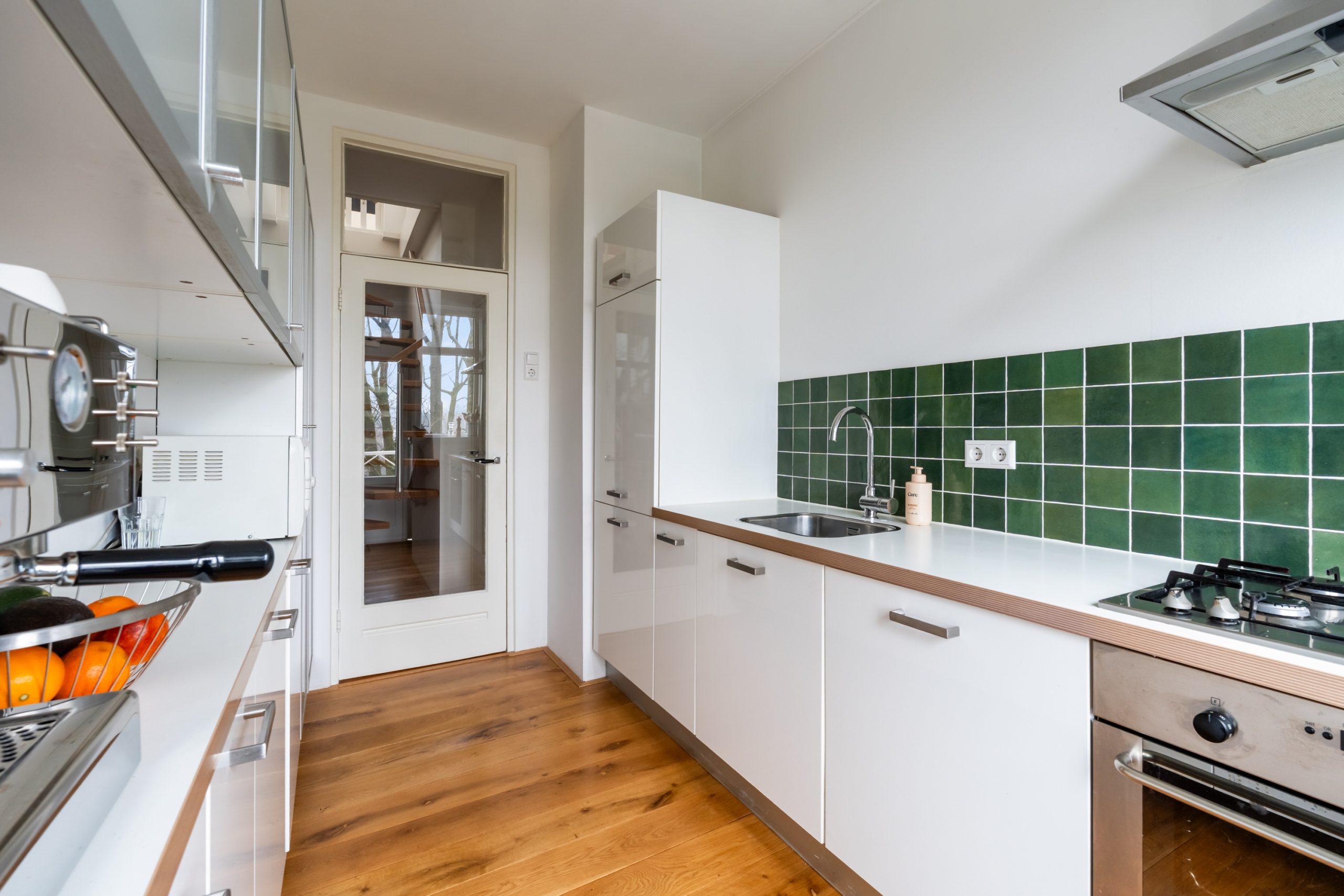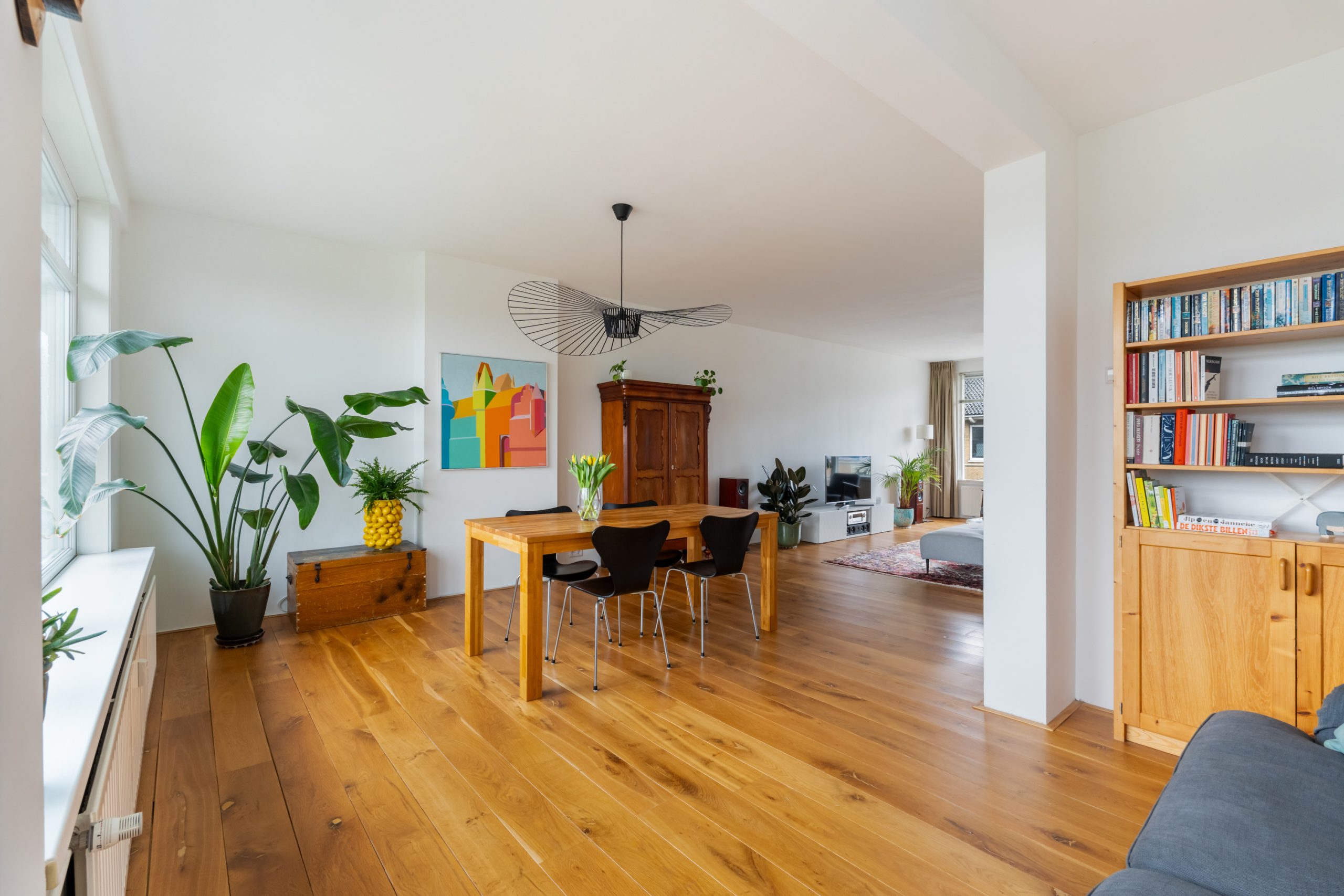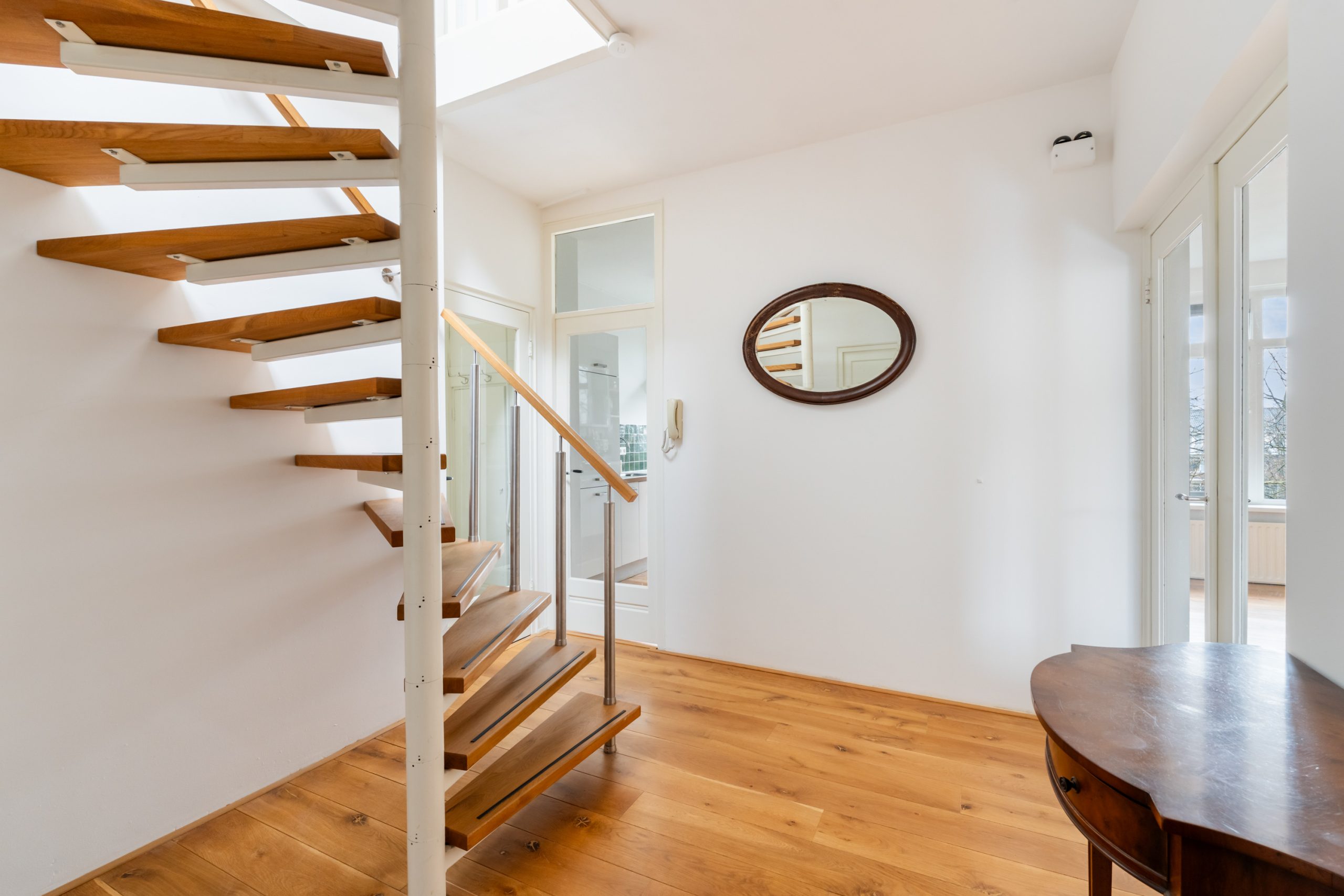 Entree met tochtportaal, meterkast en toegang tot alle vertrekken op deze verdieping. Bij binnenkomst in de ruime hal met berging (wasmachineaansluiting) valt direct de fraaie wenteltrap op, gecombineerd met de warme houten vloer die de ruimte een stijlvolle uitstraling geeft. Via karakteristieke deuren bereik je de L-vormige woonkamer. De woonkamer heeft een mooie lengte van circa 10 meter en beschikt over grote raampartijen aan beide zijden, waardoor er veel natuurlijk licht de woning binnenkomt. Dit zorgt voor een fijne en lichte sfeer. Het zitgedeelte bevindt zich aan de achterzijde van de woning. Hier is voldoende ruimte voor een royale en comfortabele zithoek, een ideale plek om te ontspannen of gasten te ontvangen. Via het zitgedeelte bereik je het 1e balkon, gelegen op het zuiden. Dit is een ruim balkon dat zich over de volledige breedte van de woning uitstrekt. Aan de voorzijde van de woning bevindt zich het eetgedeelte. Dankzij de opvallend ruime opzet is hier plaats voor een royale eettafel, ideaal om gezellig te dineren met familie en vrienden. De moderne keuken beschikt over diverse soorten inbouwapparatuur zoals een 4-pits gasfornuis met afzuigkap, oven, koel-/vriescombinatie en een vaatwasser. Zowel via de keuken als het eetgedeelte bereik je het 2e balkon, gelegen op het noorden. Hier kan je heerlijk genieten van een wijntje in de avondzon! e twee slaapkamers aan de achterzijde van de woning zijn multifunctioneel en kunnen naar wens worden ingericht als kinder-, werk- of slaapkamer.