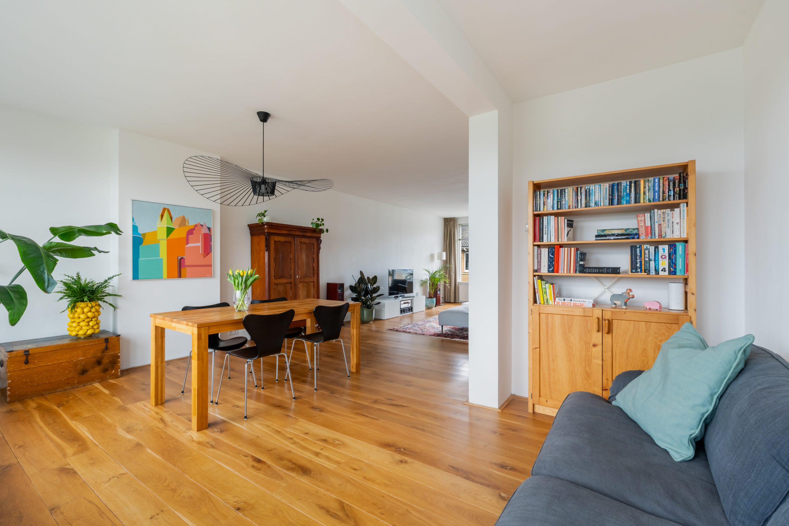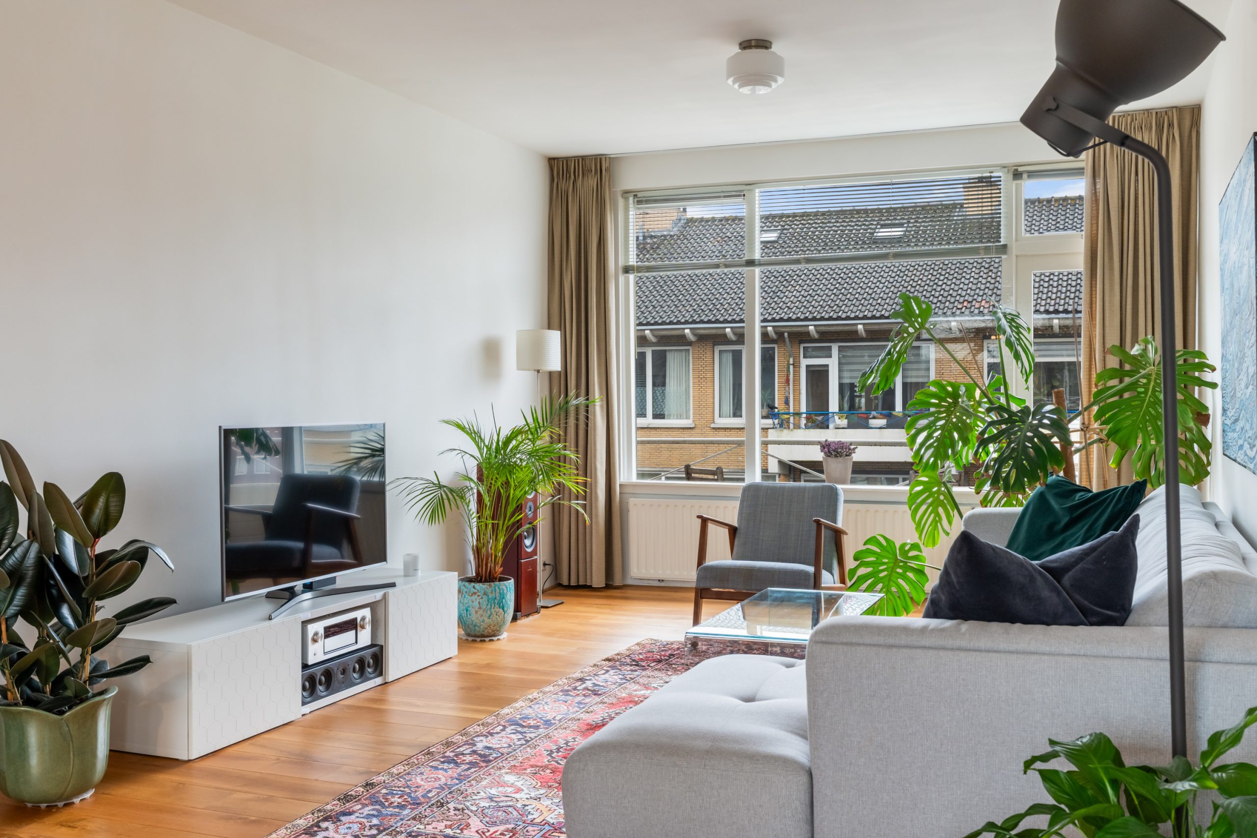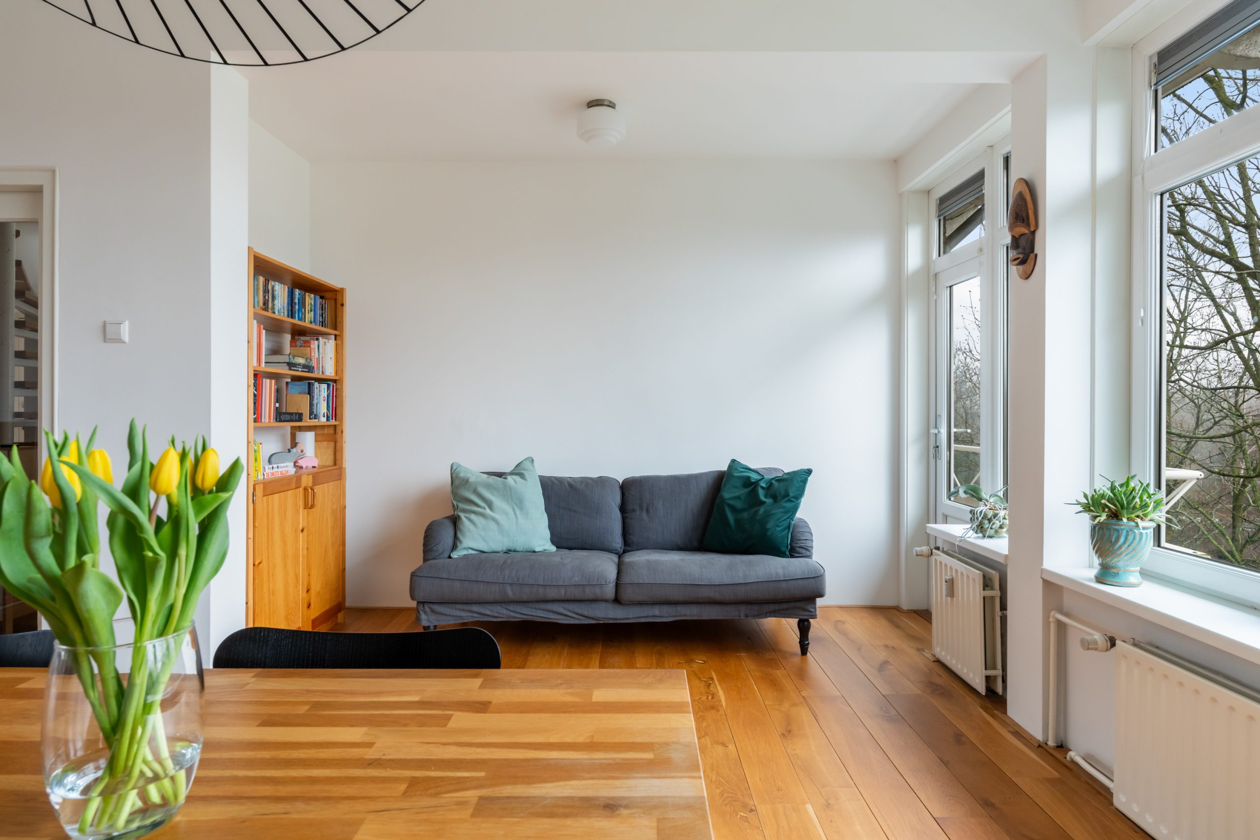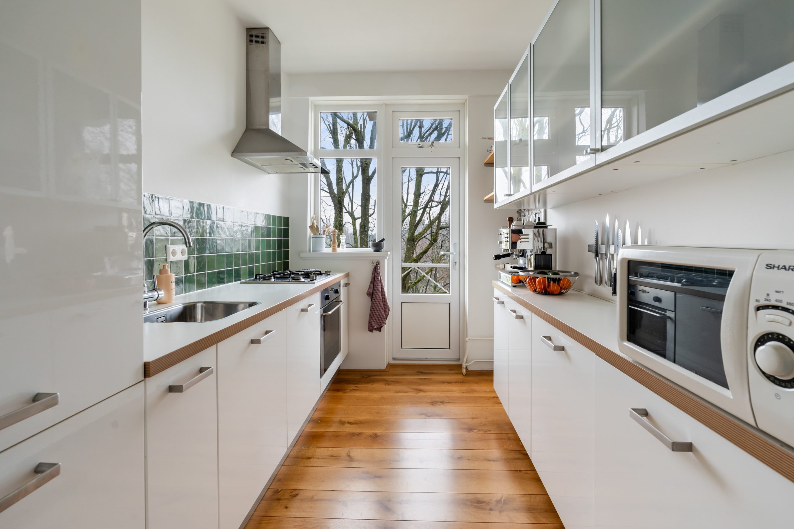 Entree met tochtportaal, meterkast en toegang tot alle vertrekken op deze verdieping. Bij binnenkomst in de ruime hal met berging (wasmachineaansluiting) valt direct de fraaie wenteltrap op, gecombineerd met de warme houten vloer die de ruimte een stijlvolle uitstraling geeft. Via karakteristieke deuren bereik je de L-vormige woonkamer. De woonkamer heeft een mooie lengte van circa 10 meter en beschikt over grote raampartijen aan beide zijden, waardoor er veel natuurlijk licht de woning binnenkomt. Dit zorgt voor een fijne en lichte sfeer. Het zitgedeelte bevindt zich aan de achterzijde van de woning. Hier is voldoende ruimte voor een royale en comfortabele zithoek, een ideale plek om te ontspannen of gasten te ontvangen. Via het zitgedeelte bereik je het 1e balkon, gelegen op het zuiden. Dit is een ruim balkon dat zich over de volledige breedte van de woning uitstrekt. Aan de voorzijde van de woning bevindt zich het eetgedeelte. Dankzij de opvallend ruime opzet is hier plaats voor een royale eettafel, ideaal om gezellig te dineren met familie en vrienden. De moderne keuken beschikt over diverse soorten inbouwapparatuur zoals een 4-pits gasfornuis met afzuigkap, oven, koel-/vriescombinatie en een vaatwasser. Zowel via de keuken als het eetgedeelte bereik je het 2e balkon, gelegen op het noorden. Hier kan je heerlijk genieten van een wijntje in de avondzon! e twee slaapkamers aan de achterzijde van de woning zijn multifunctioneel en kunnen naar wens worden ingericht als kinder-, werk- of slaapkamer.