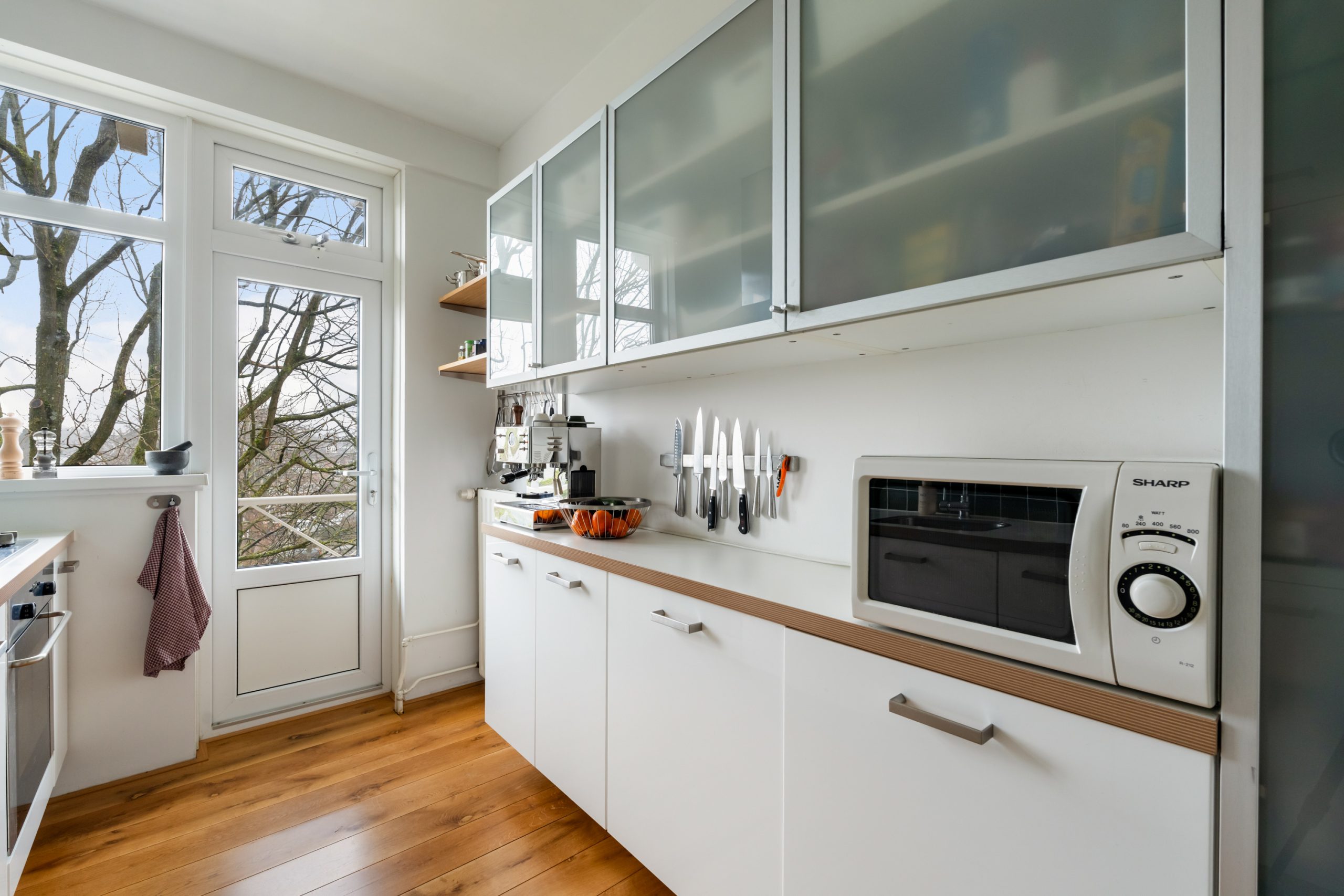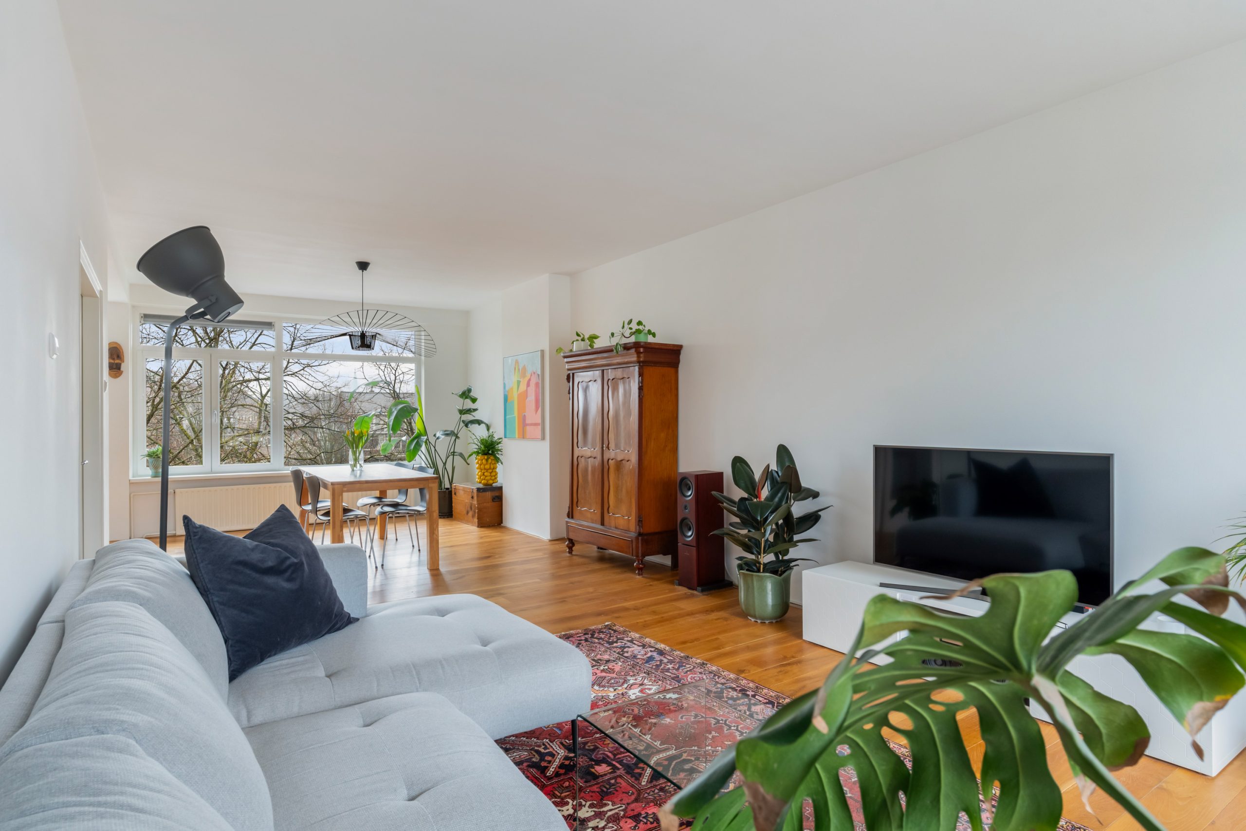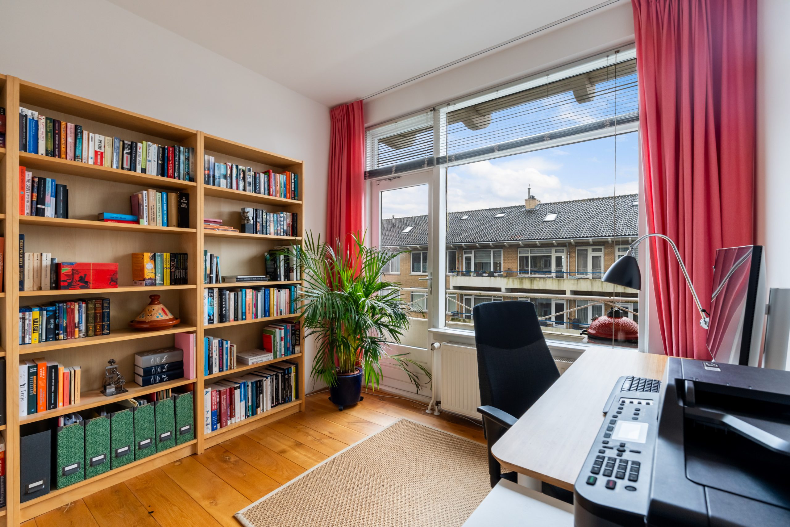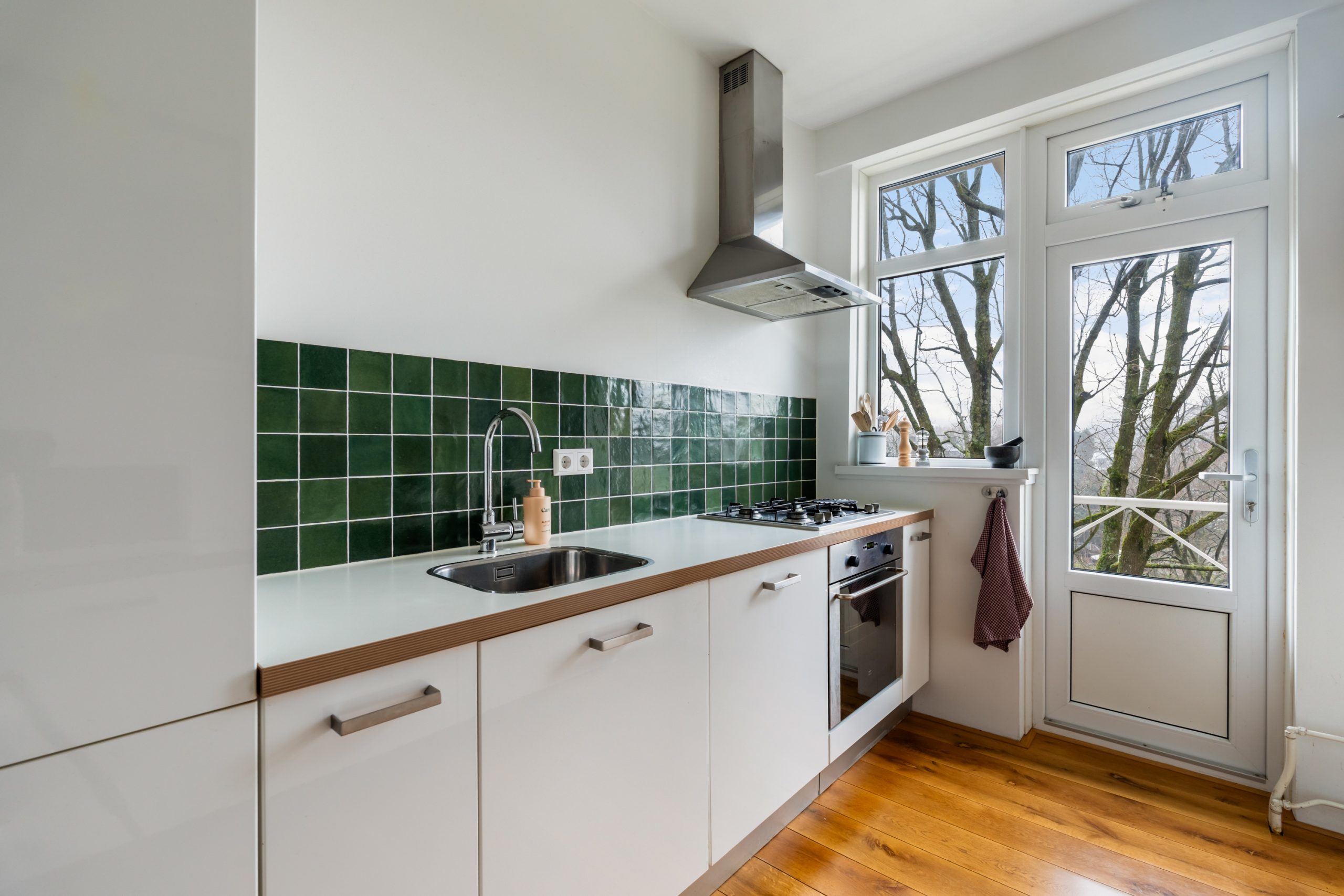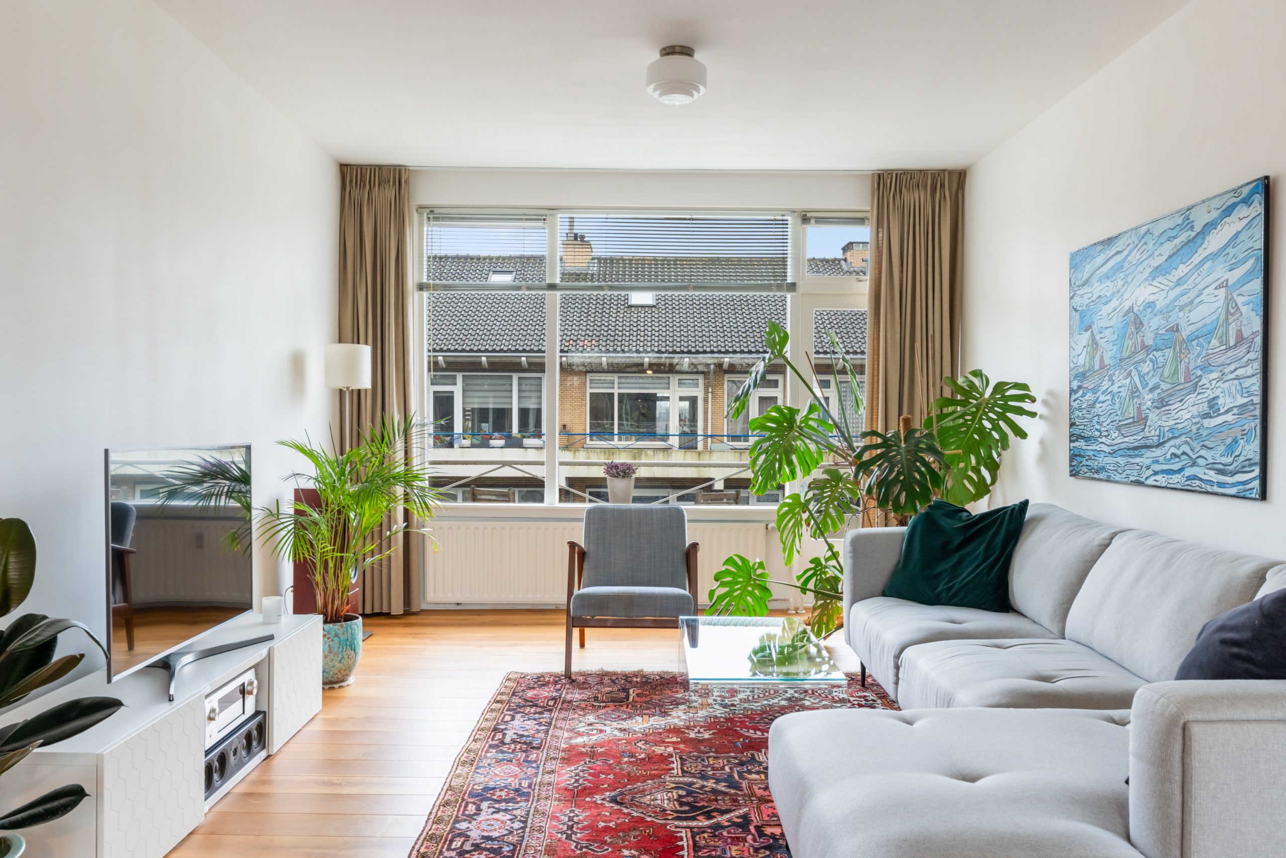 Entree met tochtportaal, meterkast en toegang tot alle vertrekken op deze verdieping. Bij binnenkomst in de ruime hal met berging (wasmachineaansluiting) valt direct de fraaie wenteltrap op, gecombineerd met de warme houten vloer die de ruimte een stijlvolle uitstraling geeft. Via karakteristieke deuren bereik je de L-vormige woonkamer. De woonkamer heeft een mooie lengte van circa 10 meter en beschikt over grote raampartijen aan beide zijden, waardoor er veel natuurlijk licht de woning binnenkomt. Dit zorgt voor een fijne en lichte sfeer. Het zitgedeelte bevindt zich aan de achterzijde van de woning. Hier is voldoende ruimte voor een royale en comfortabele zithoek, een ideale plek om te ontspannen of gasten te ontvangen. Via het zitgedeelte bereik je het 1e balkon, gelegen op het zuiden. Dit is een ruim balkon dat zich over de volledige breedte van de woning uitstrekt. Aan de voorzijde van de woning bevindt zich het eetgedeelte. Dankzij de opvallend ruime opzet is hier plaats voor een royale eettafel, ideaal om gezellig te dineren met familie en vrienden. De moderne keuken beschikt over diverse soorten inbouwapparatuur zoals een 4-pits gasfornuis met afzuigkap, oven, koel-/vriescombinatie en een vaatwasser. Zowel via de keuken als het eetgedeelte bereik je het 2e balkon, gelegen op het noorden. Hier kan je heerlijk genieten van een wijntje in de avondzon! e twee slaapkamers aan de achterzijde van de woning zijn multifunctioneel en kunnen naar wens worden ingericht als kinder-, werk- of slaapkamer.