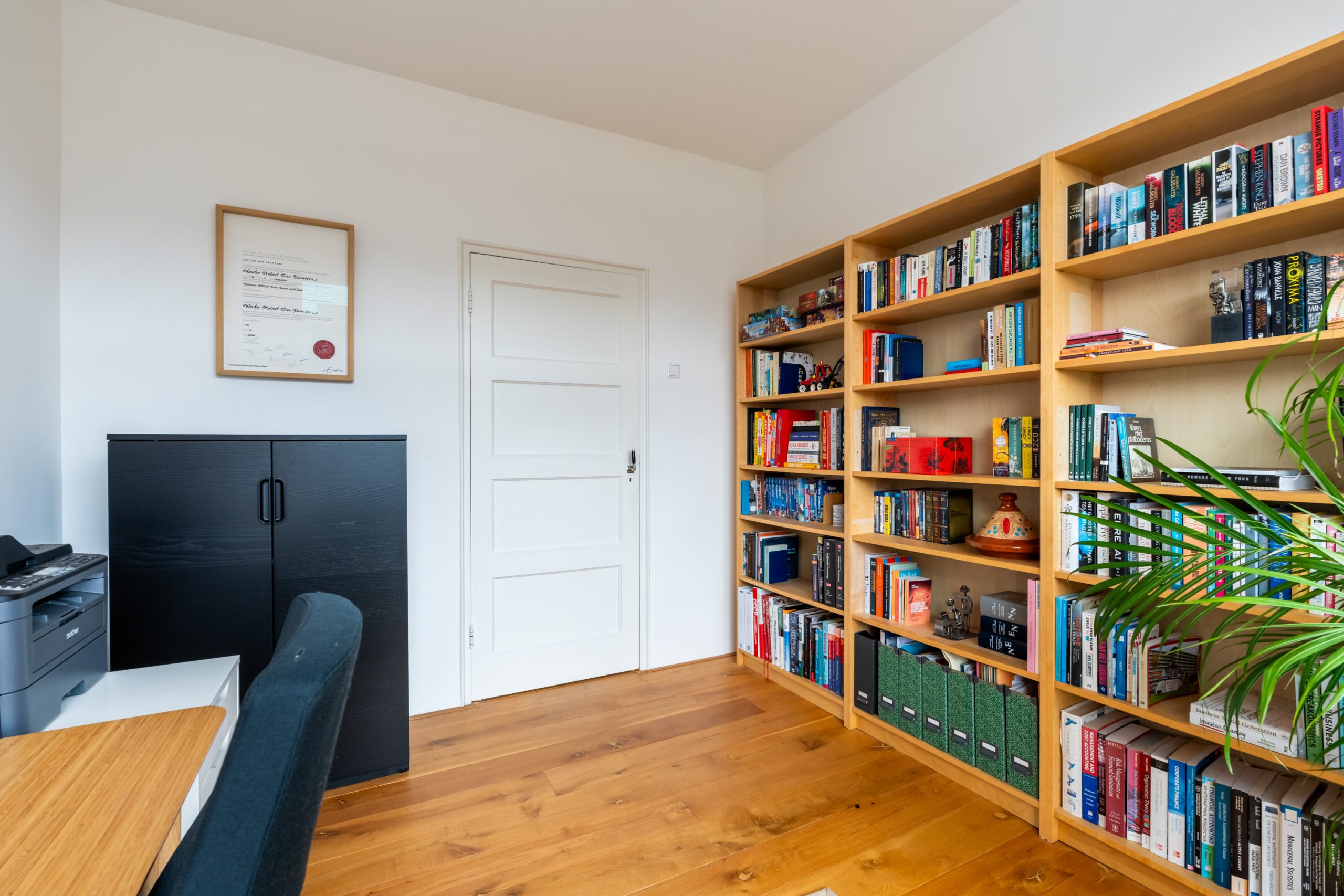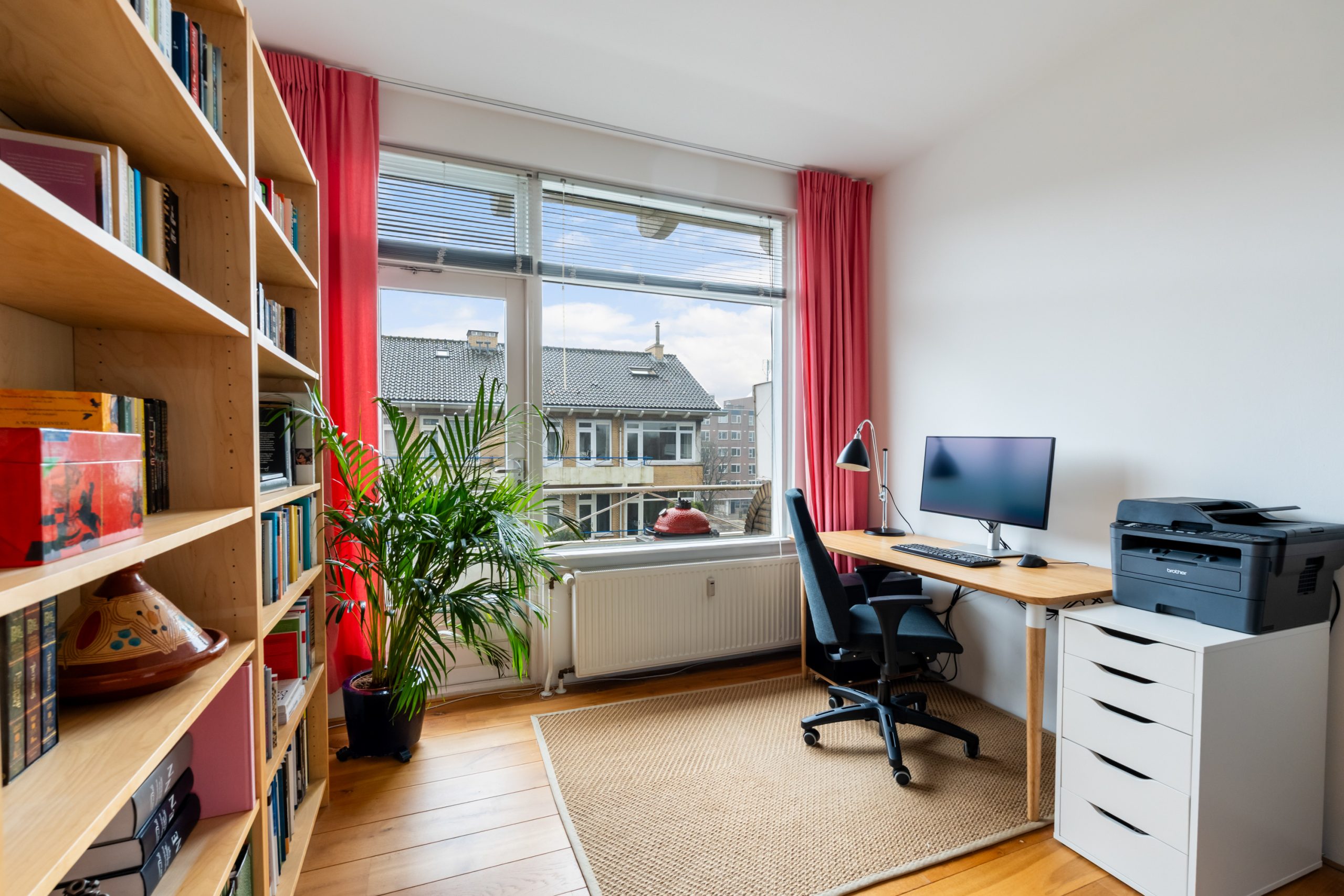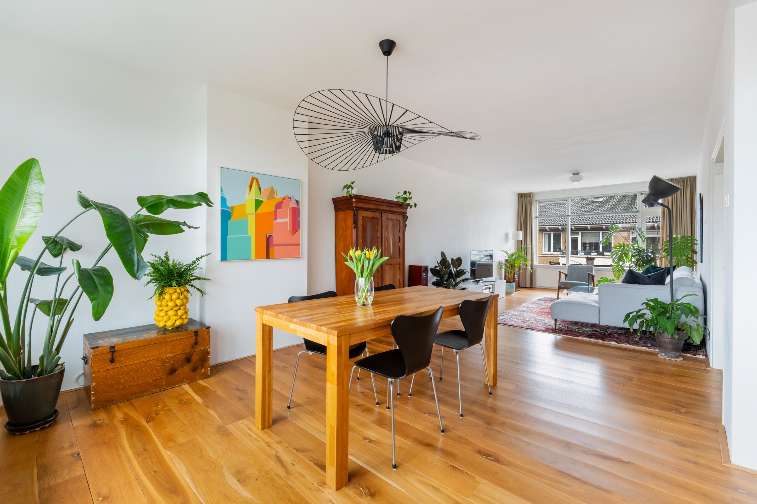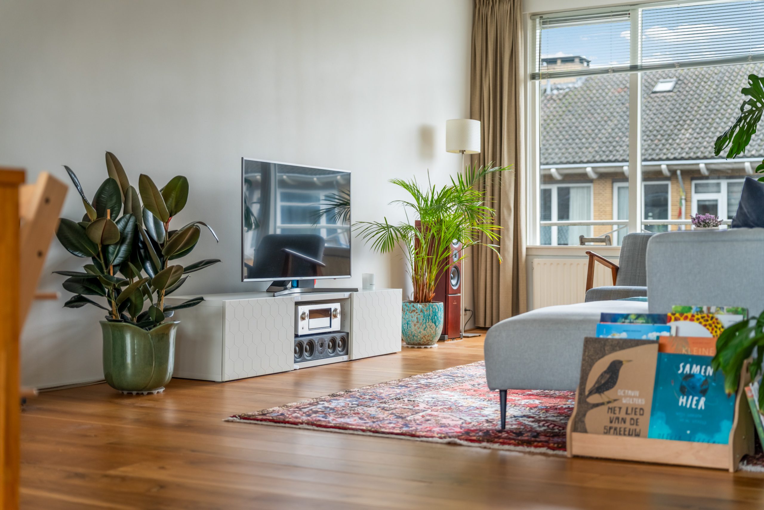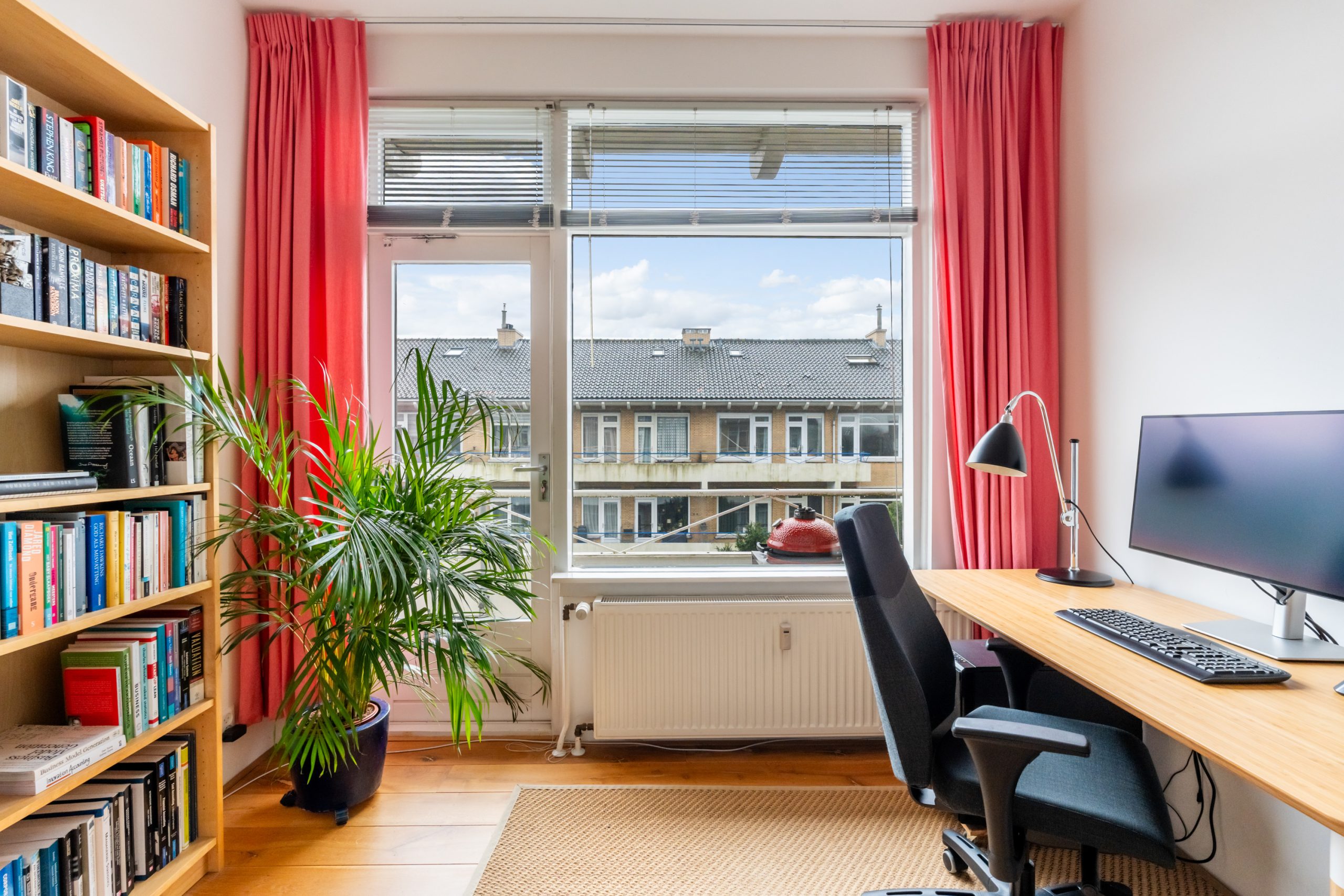 Entree met tochtportaal, meterkast en toegang tot alle vertrekken op deze verdieping. Bij binnenkomst in de ruime hal met berging (wasmachineaansluiting) valt direct de fraaie wenteltrap op, gecombineerd met de warme houten vloer die de ruimte een stijlvolle uitstraling geeft. Via karakteristieke deuren bereik je de L-vormige woonkamer. De woonkamer heeft een mooie lengte van circa 10 meter en beschikt over grote raampartijen aan beide zijden, waardoor er veel natuurlijk licht de woning binnenkomt. Dit zorgt voor een fijne en lichte sfeer. Het zitgedeelte bevindt zich aan de achterzijde van de woning. Hier is voldoende ruimte voor een royale en comfortabele zithoek, een ideale plek om te ontspannen of gasten te ontvangen. Via het zitgedeelte bereik je het 1e balkon, gelegen op het zuiden. Dit is een ruim balkon dat zich over de volledige breedte van de woning uitstrekt. Aan de voorzijde van de woning bevindt zich het eetgedeelte. Dankzij de opvallend ruime opzet is hier plaats voor een royale eettafel, ideaal om gezellig te dineren met familie en vrienden. De moderne keuken beschikt over diverse soorten inbouwapparatuur zoals een 4-pits gasfornuis met afzuigkap, oven, koel-/vriescombinatie en een vaatwasser. Zowel via de keuken als het eetgedeelte bereik je het 2e balkon, gelegen op het noorden. Hier kan je heerlijk genieten van een wijntje in de avondzon! e twee slaapkamers aan de achterzijde van de woning zijn multifunctioneel en kunnen naar wens worden ingericht als kinder-, werk- of slaapkamer.