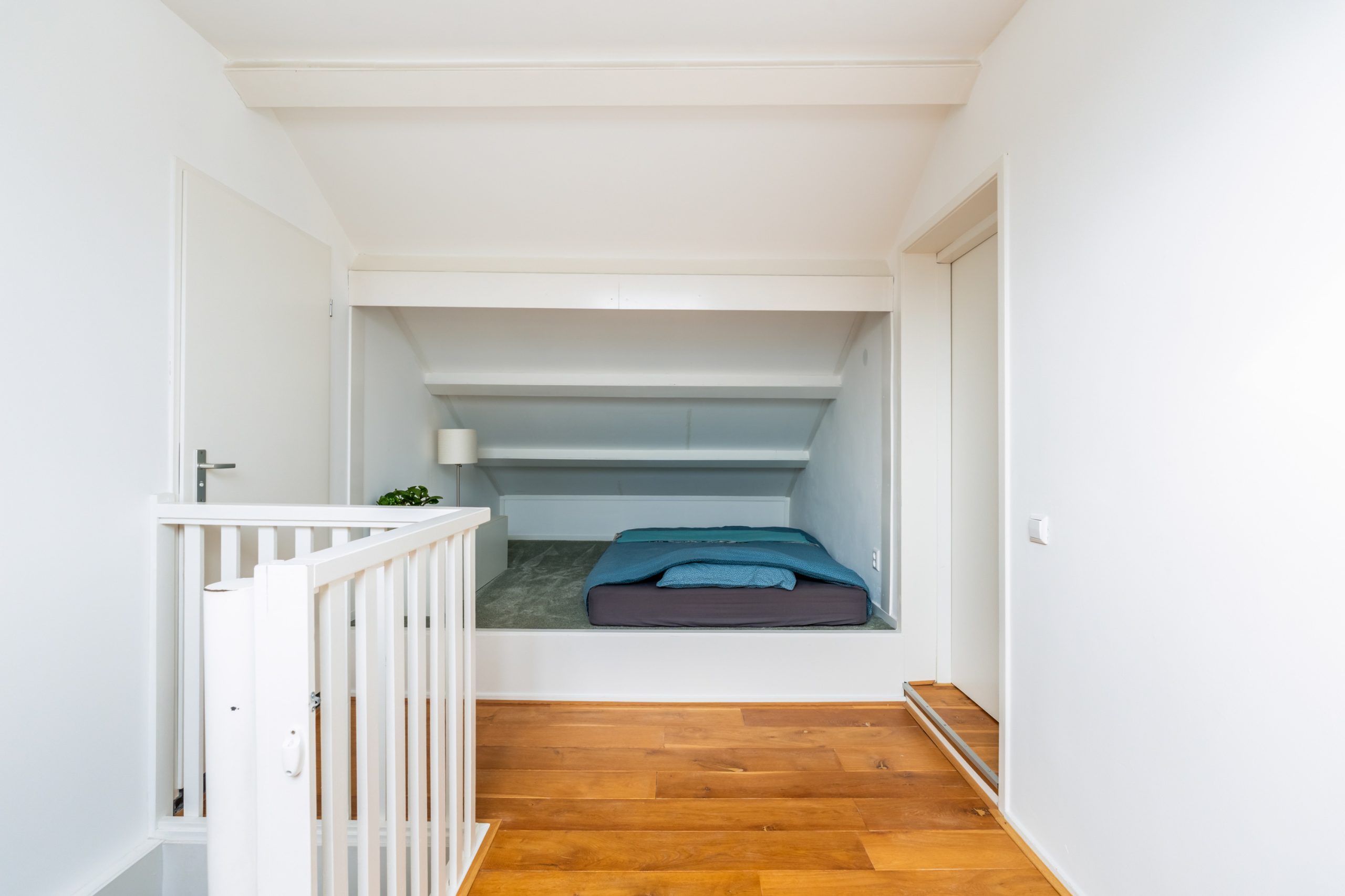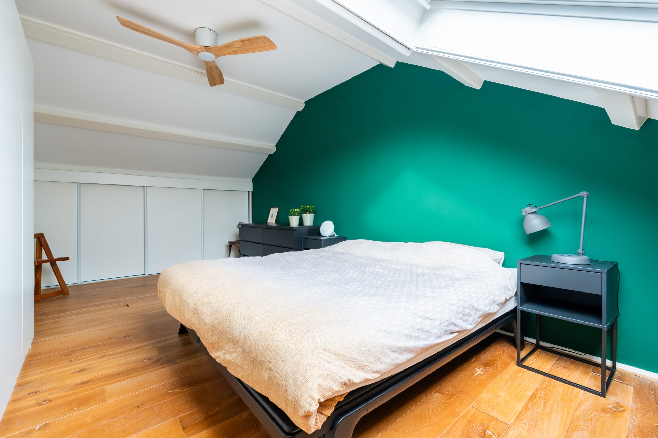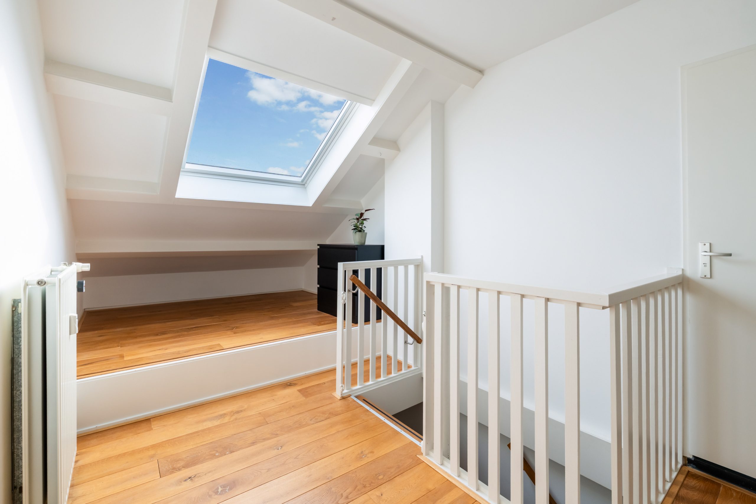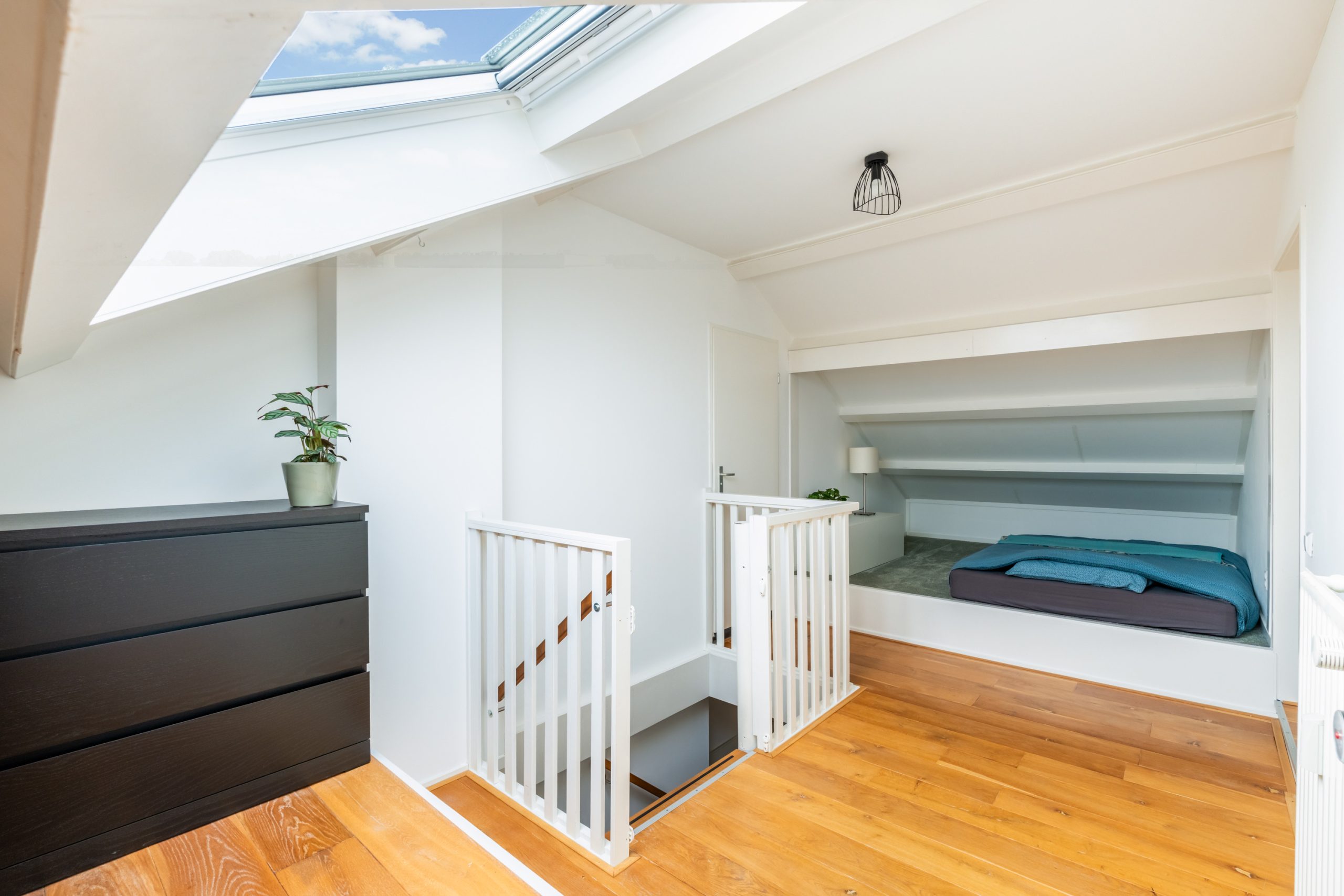 Ruime overloop met toegang tot de master bedroom en de badkamer. De slaapkamer heeft een schuin dak wat de ruimte een speels karakter geeft. Het dakraam zorgt voor prettig daglicht en de vaste kast biedt praktische opbergruimte. De volledig betegelde badkamer beschikt over een ligbad, douche, toilet en twee wastafels.