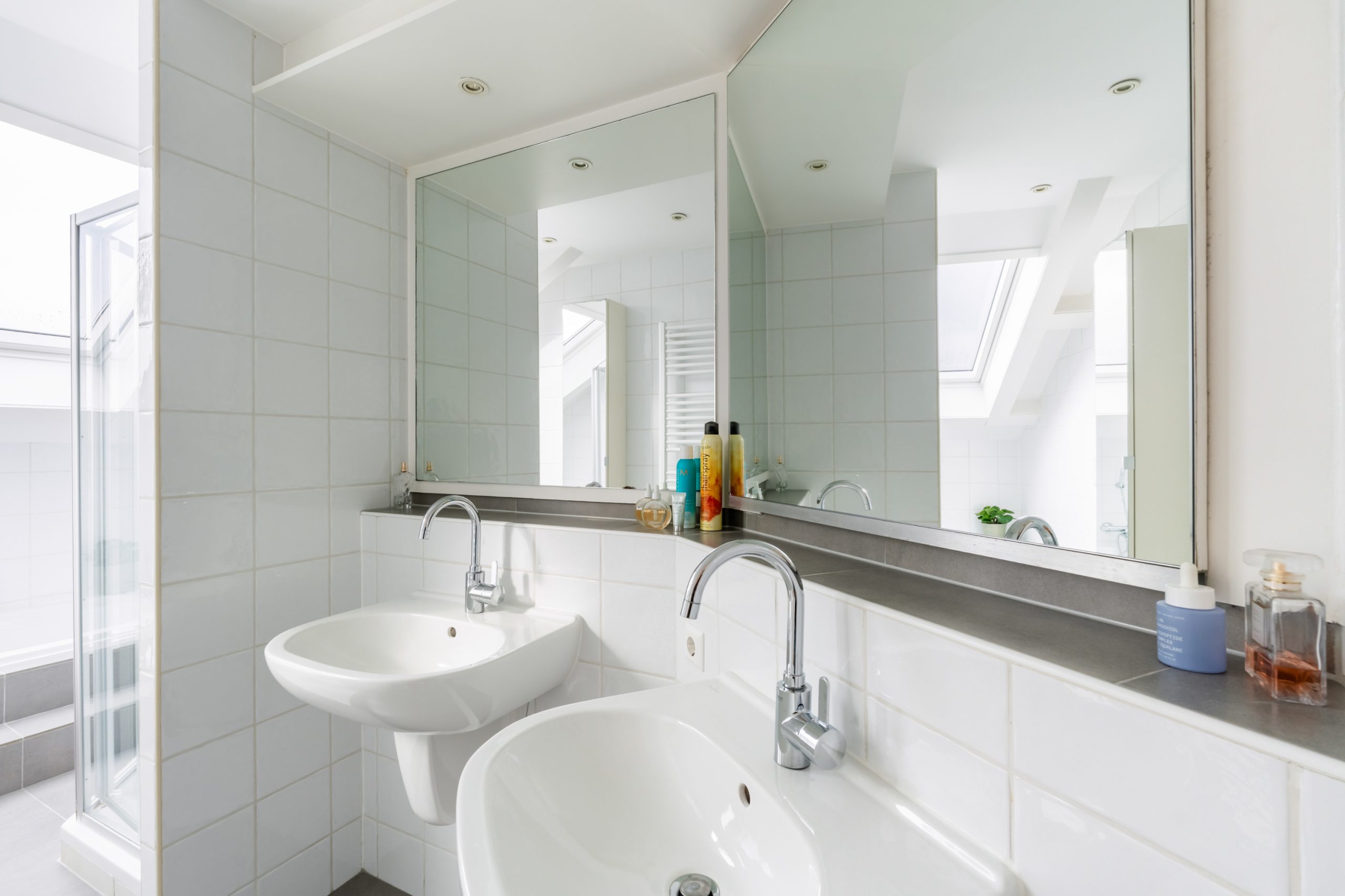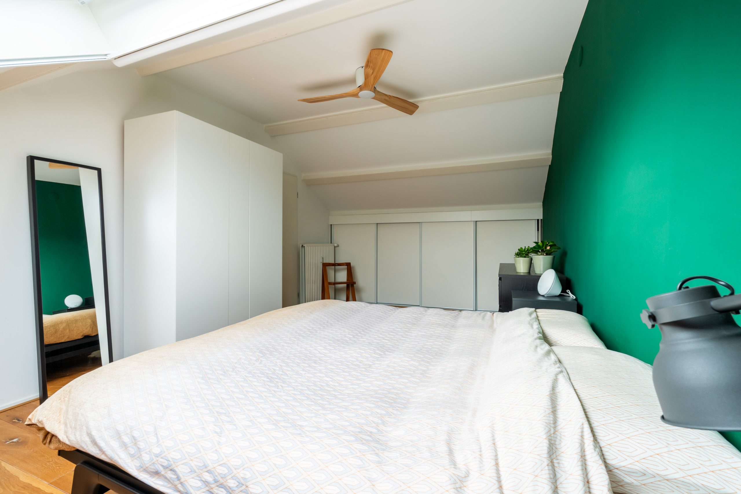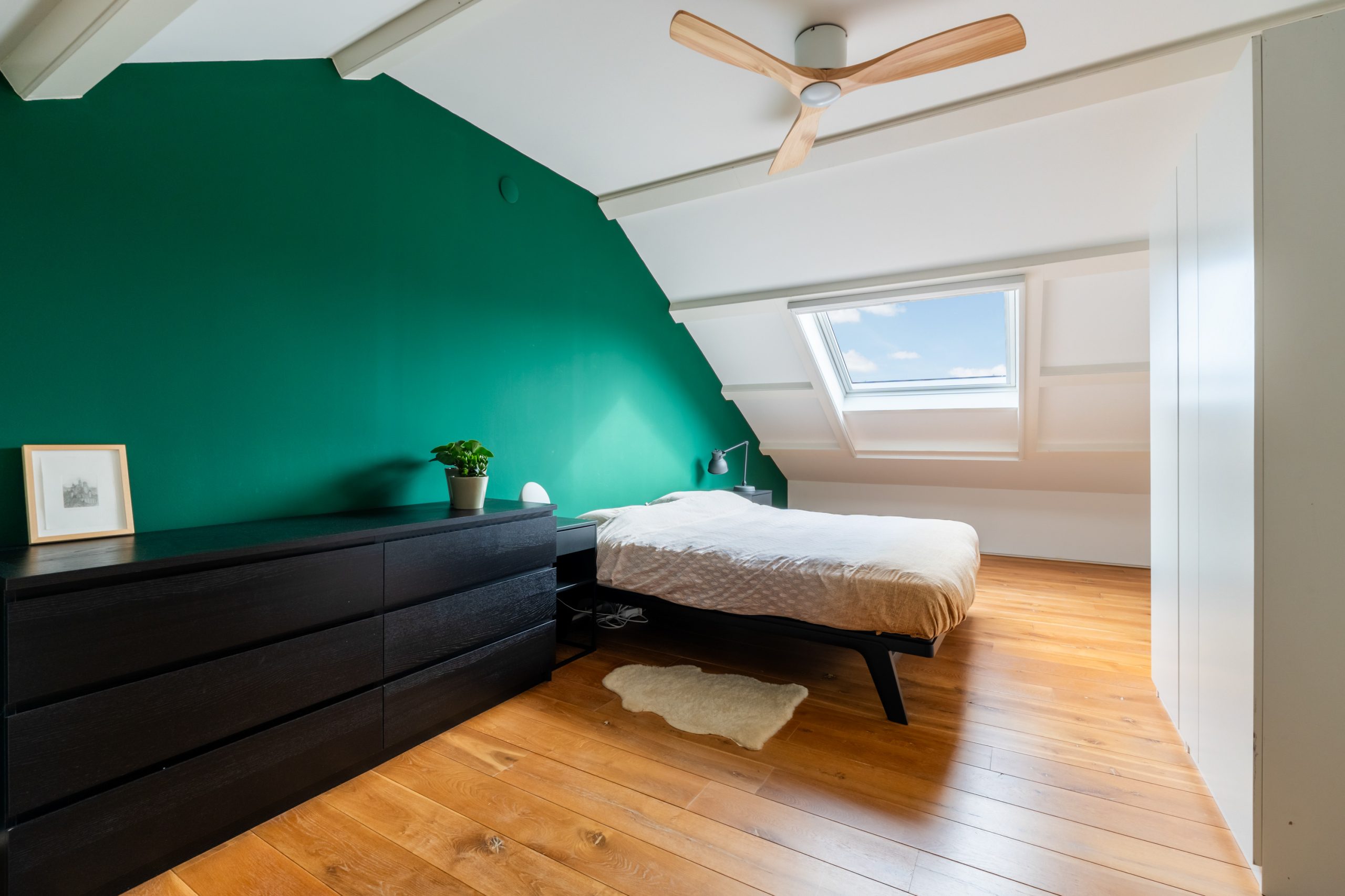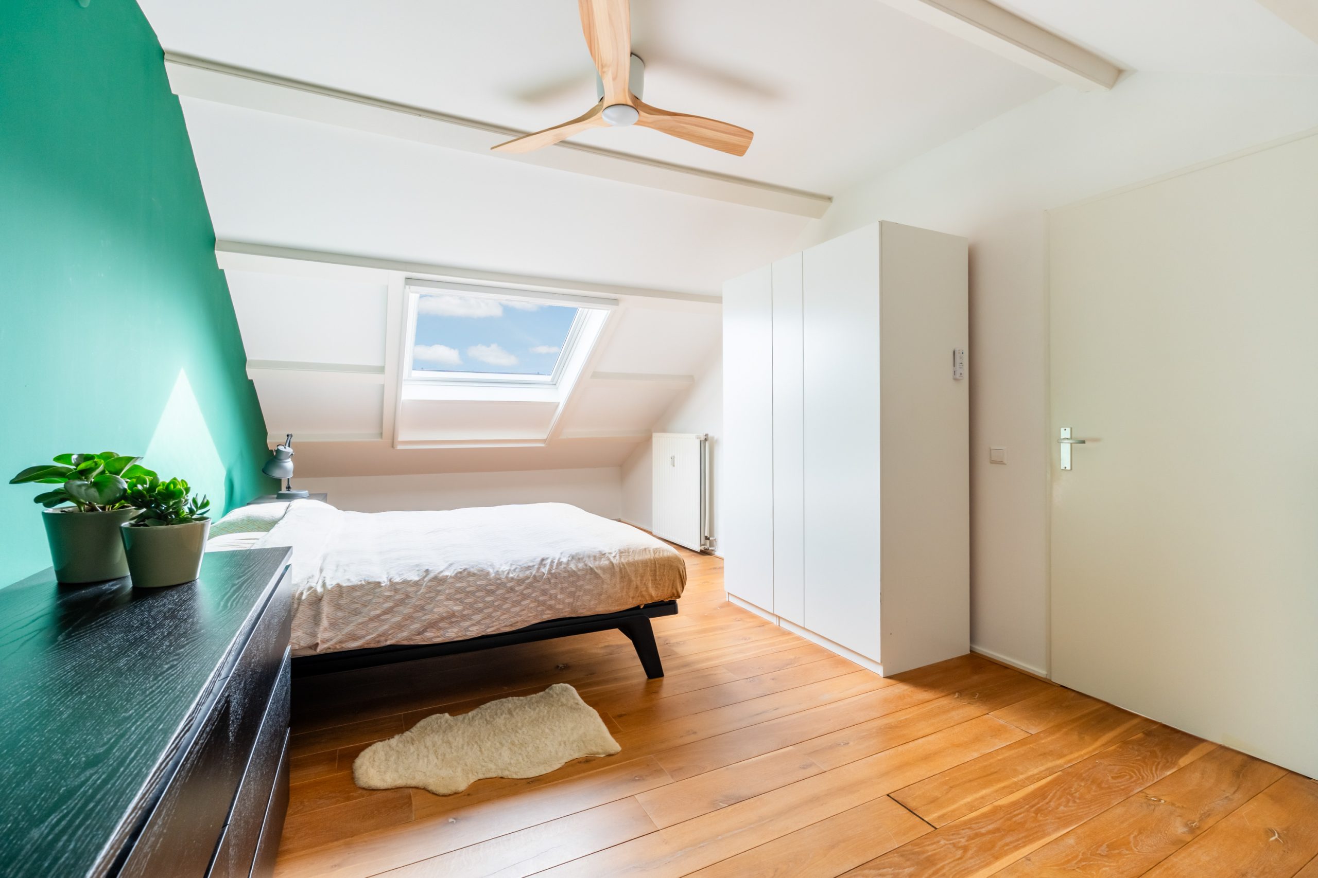Ruime overloop met toegang tot de master bedroom en de badkamer. De slaapkamer heeft een schuin dak wat de ruimte een speels karakter geeft. Het dakraam zorgt voor prettig daglicht en de vaste kast biedt praktische opbergruimte. De volledig betegelde badkamer beschikt over een ligbad, douche, toilet en twee wastafels.