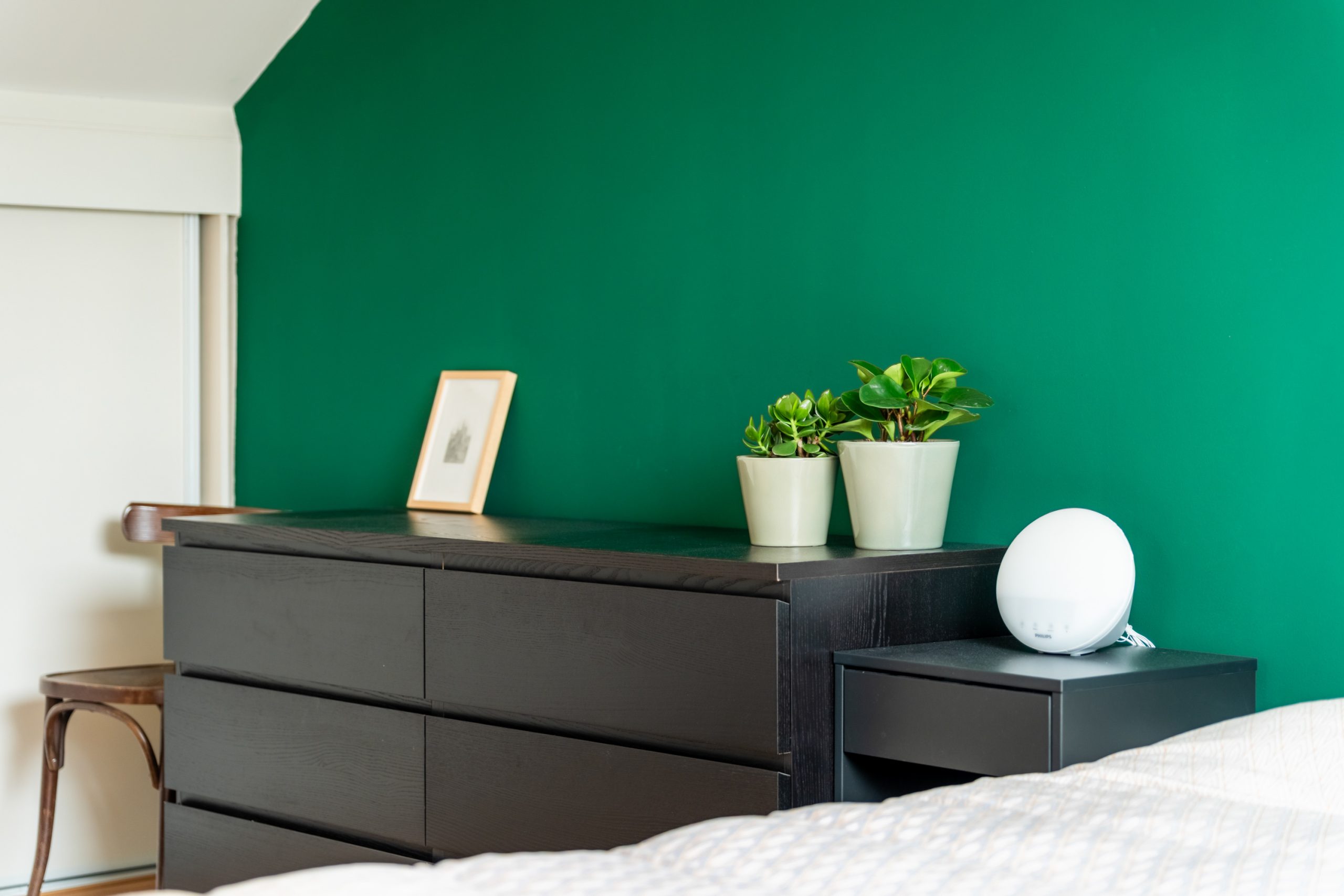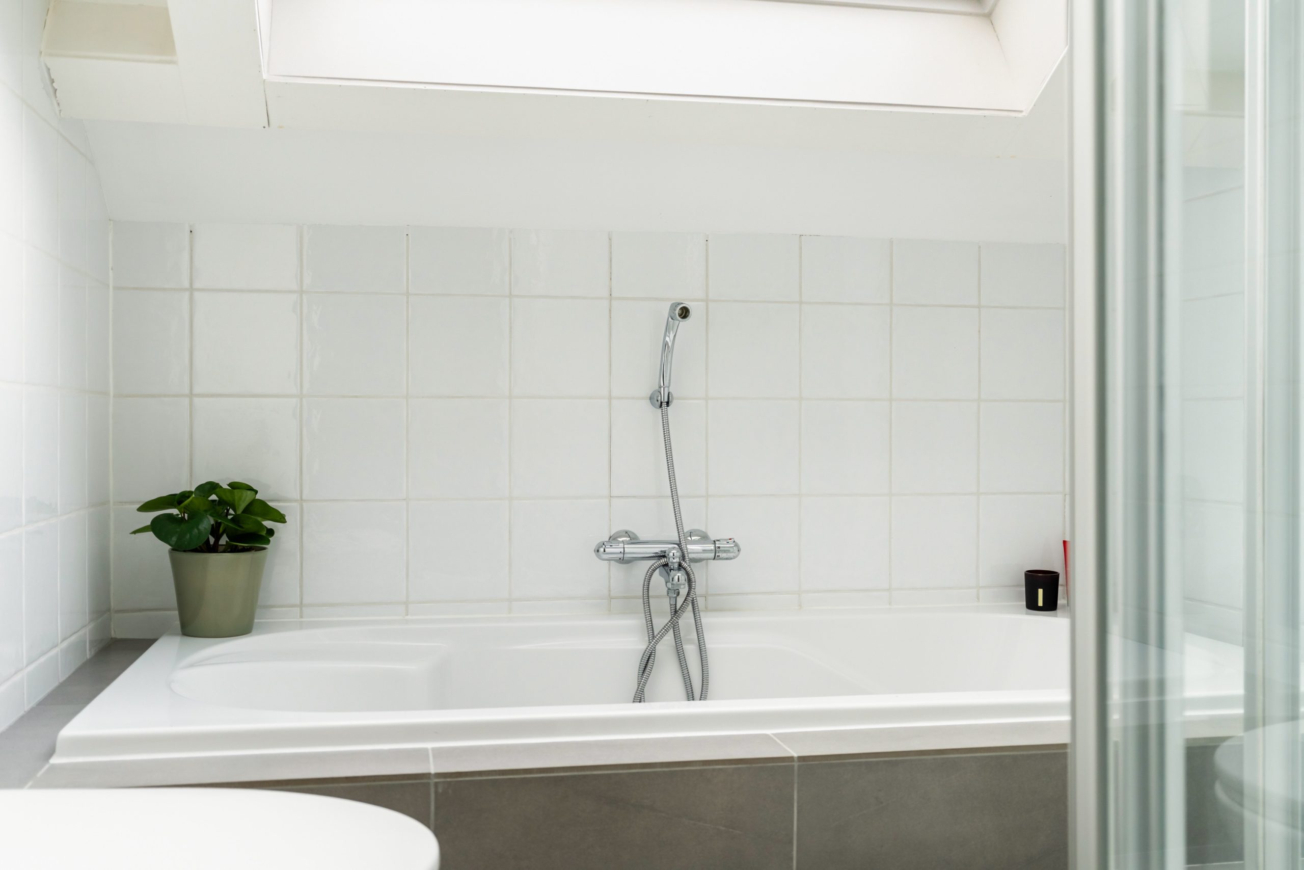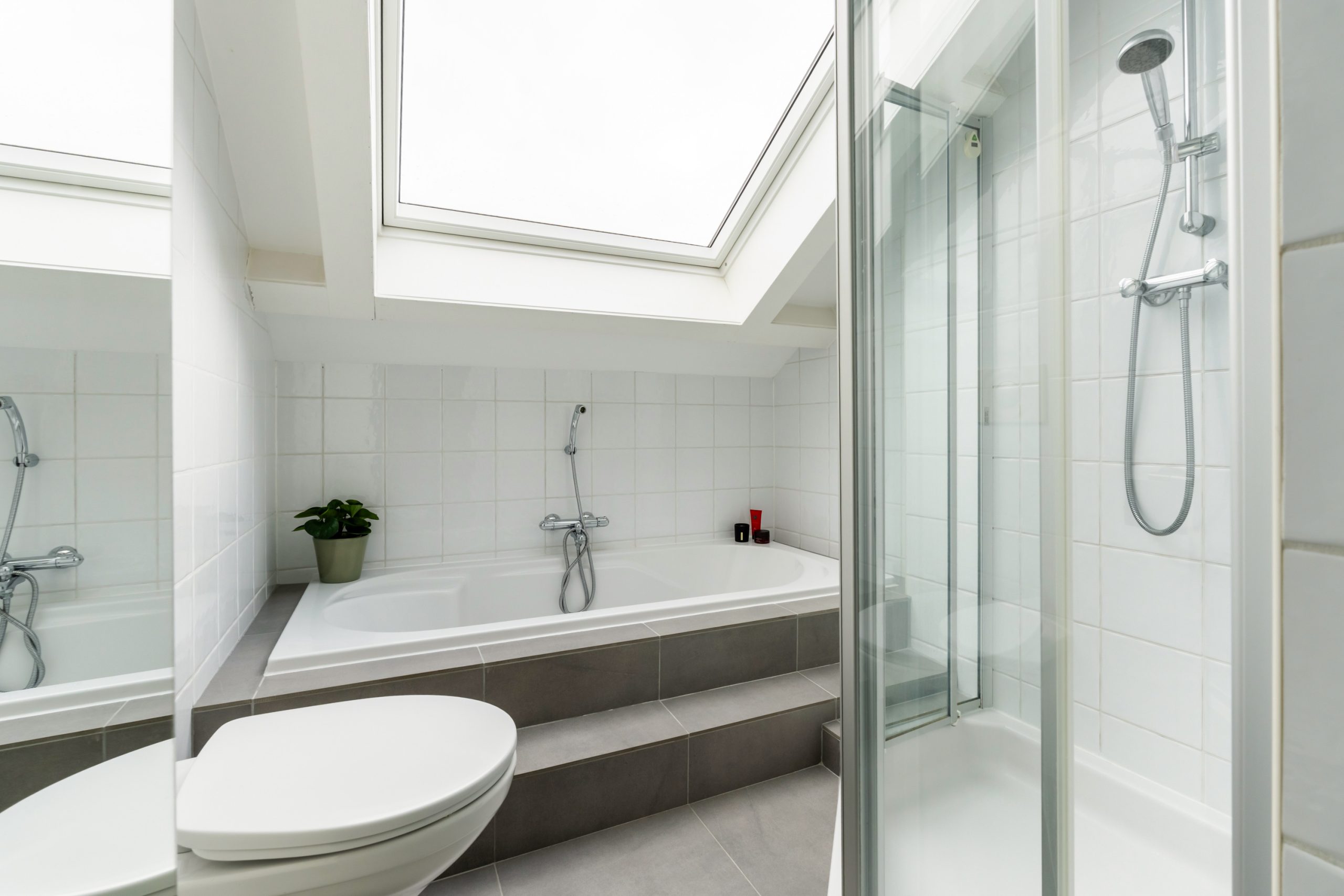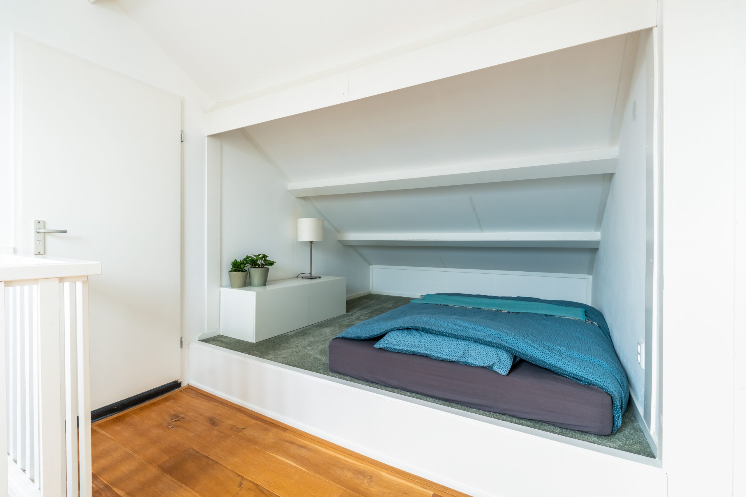Ruime overloop met toegang tot de master bedroom en de badkamer. De slaapkamer heeft een schuin dak wat de ruimte een speels karakter geeft. Het dakraam zorgt voor prettig daglicht en de vaste kast biedt praktische opbergruimte. De volledig betegelde badkamer beschikt over een ligbad, douche, toilet en twee wastafels.