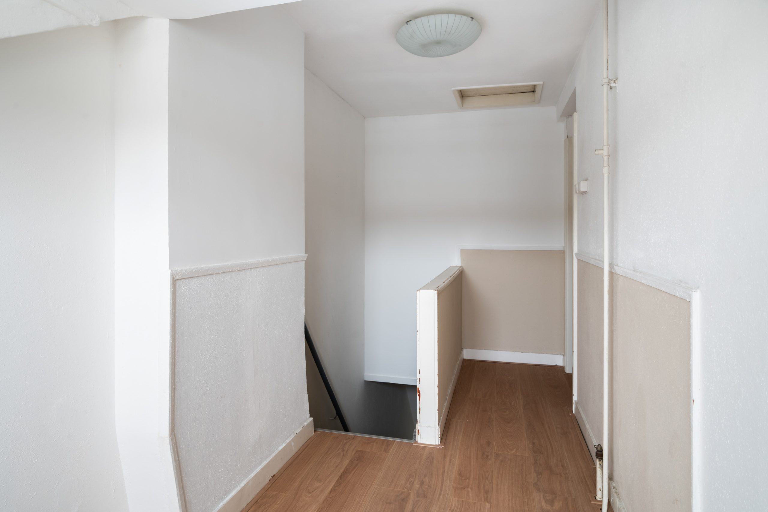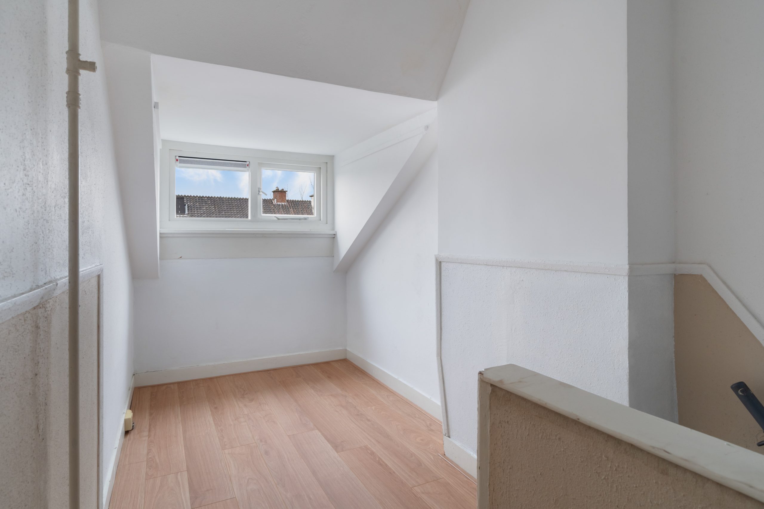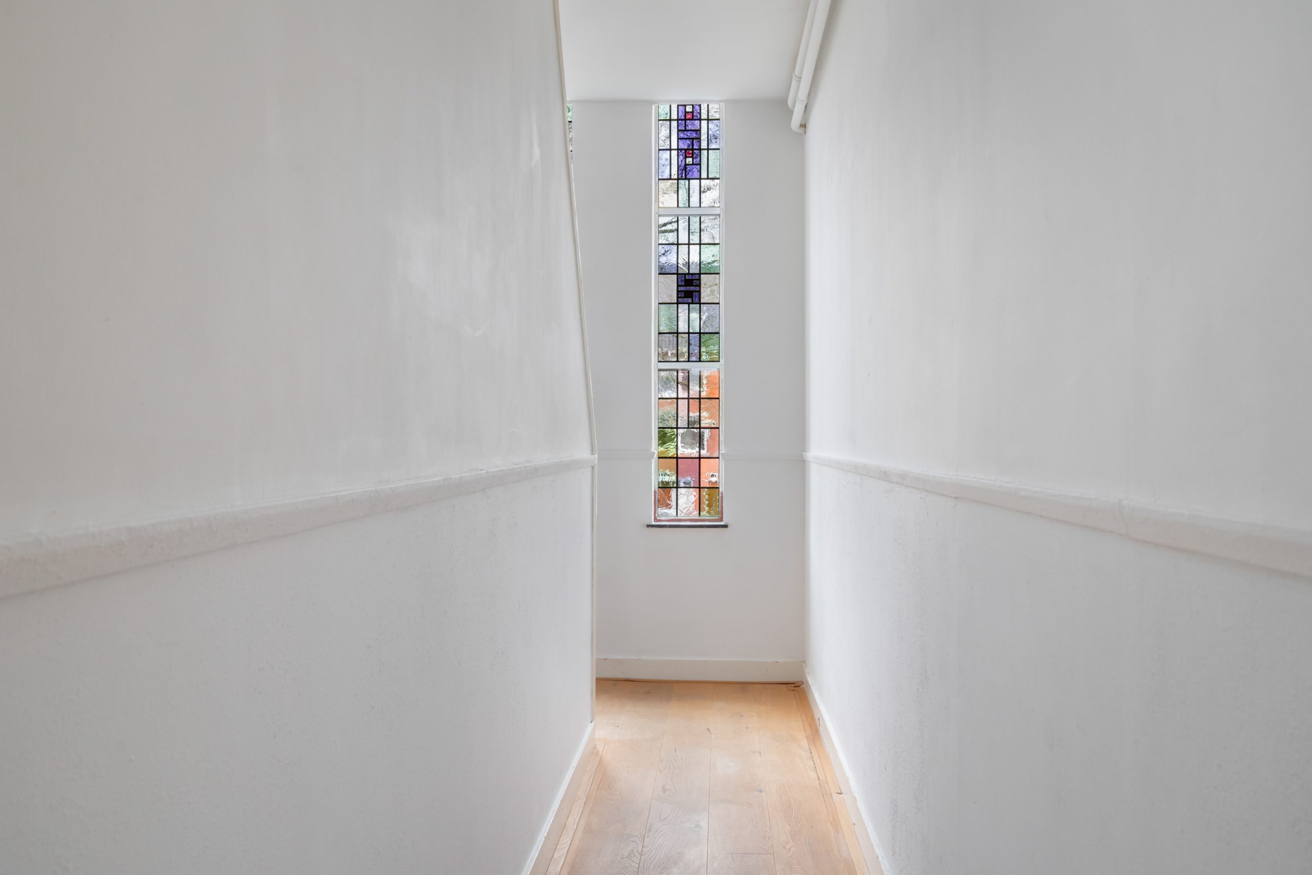 De mooie overloop op de 1e verdieping met de authentieke glas-in-loodramen in de voorgevel biedt middels een trap toegang tot de topverdieping van het complex. Hier bevinden zich nog twee slaapkamers, beide zeer ruim van formaat. Beide kamers beschikken over twee inbouwkasten. De tweede badkamer is voorzien van een inloopdouche, tweede toilet en wastafel.