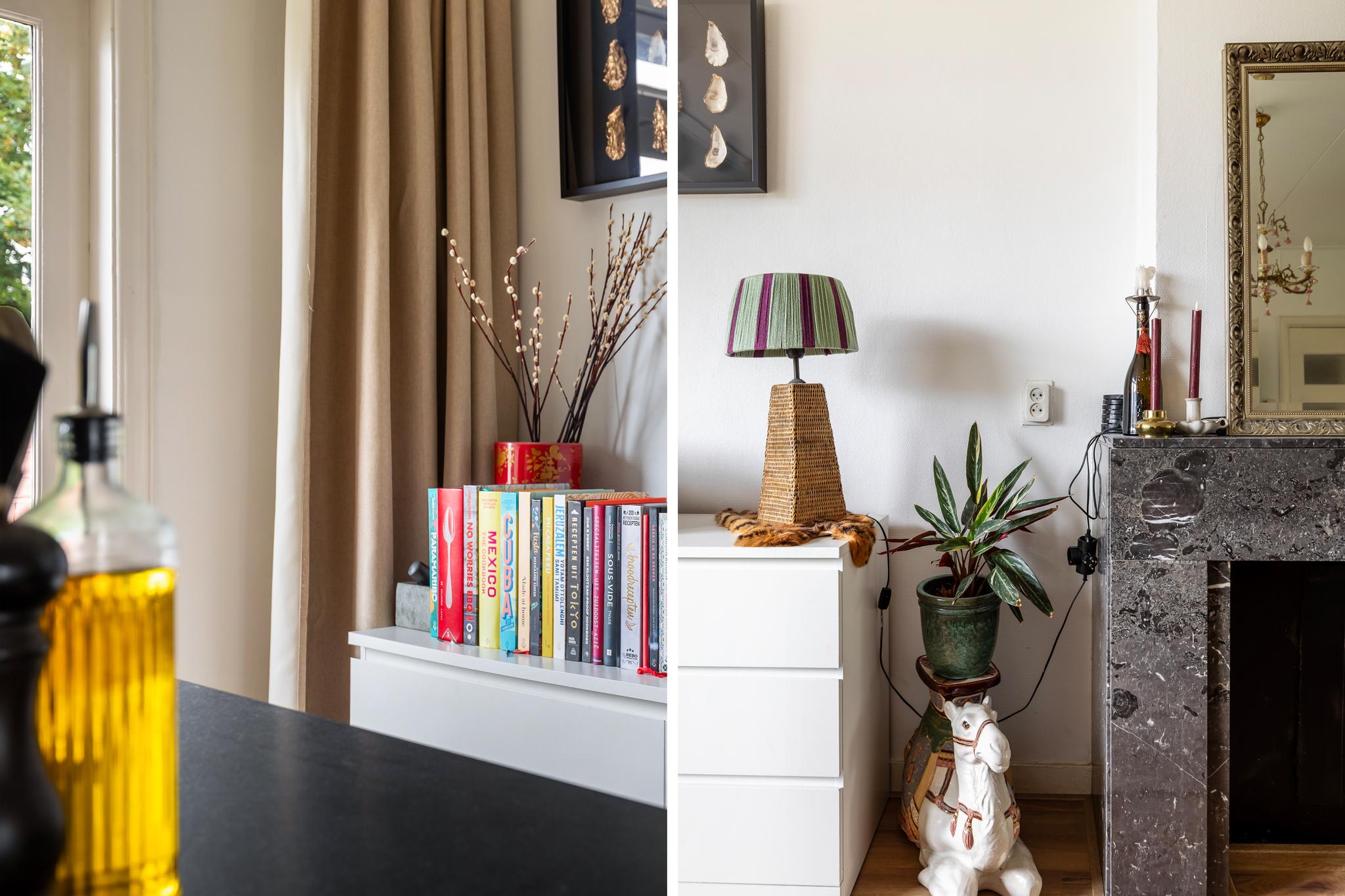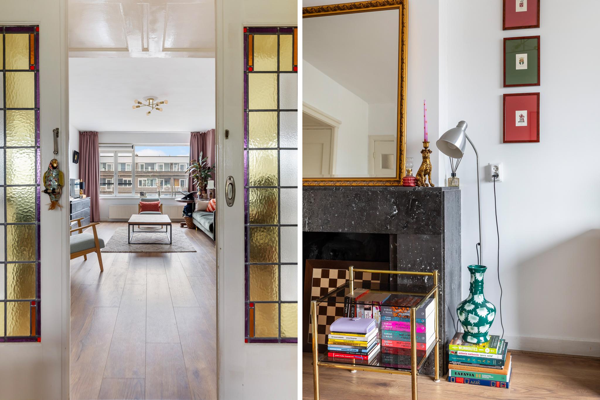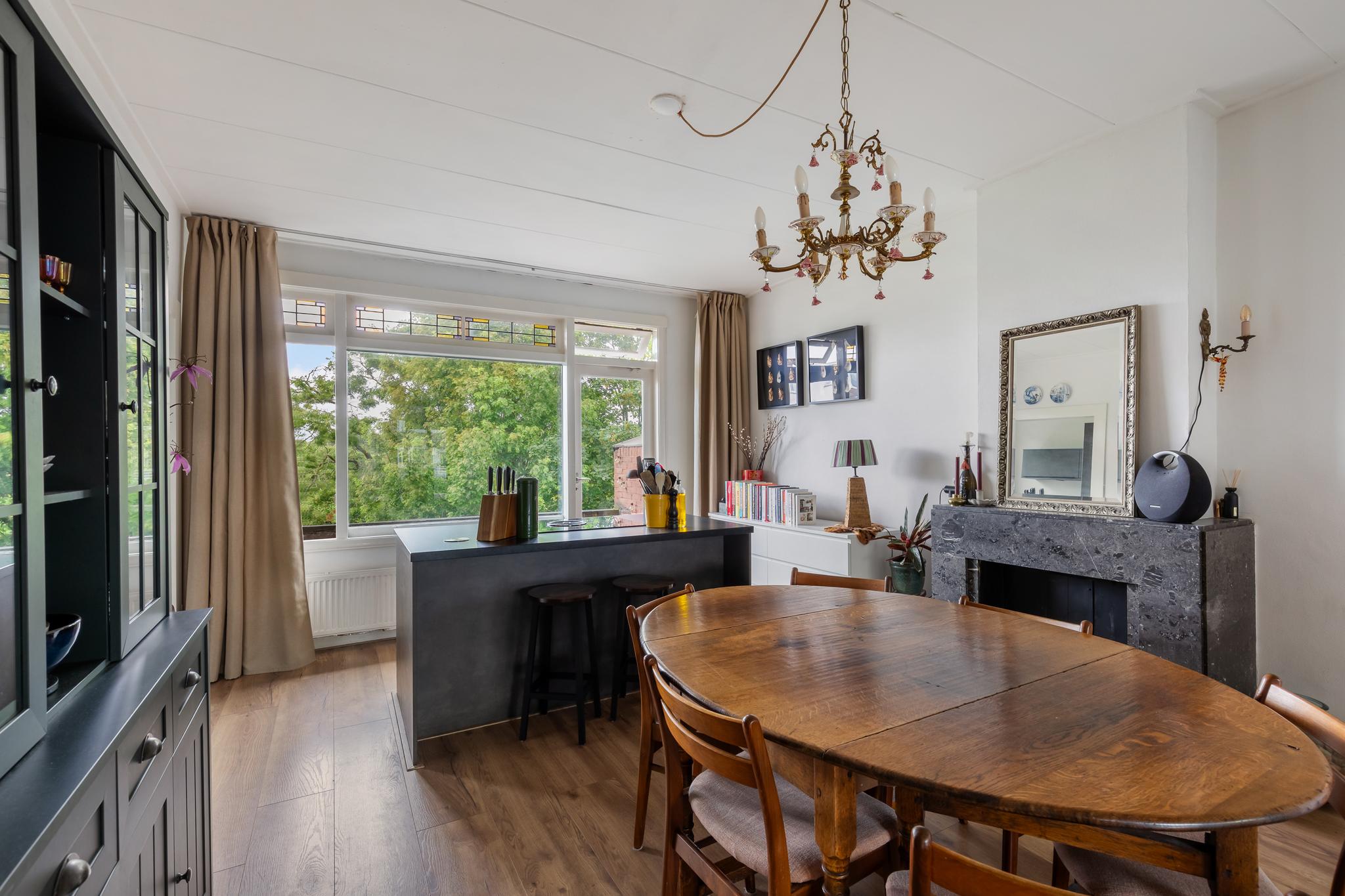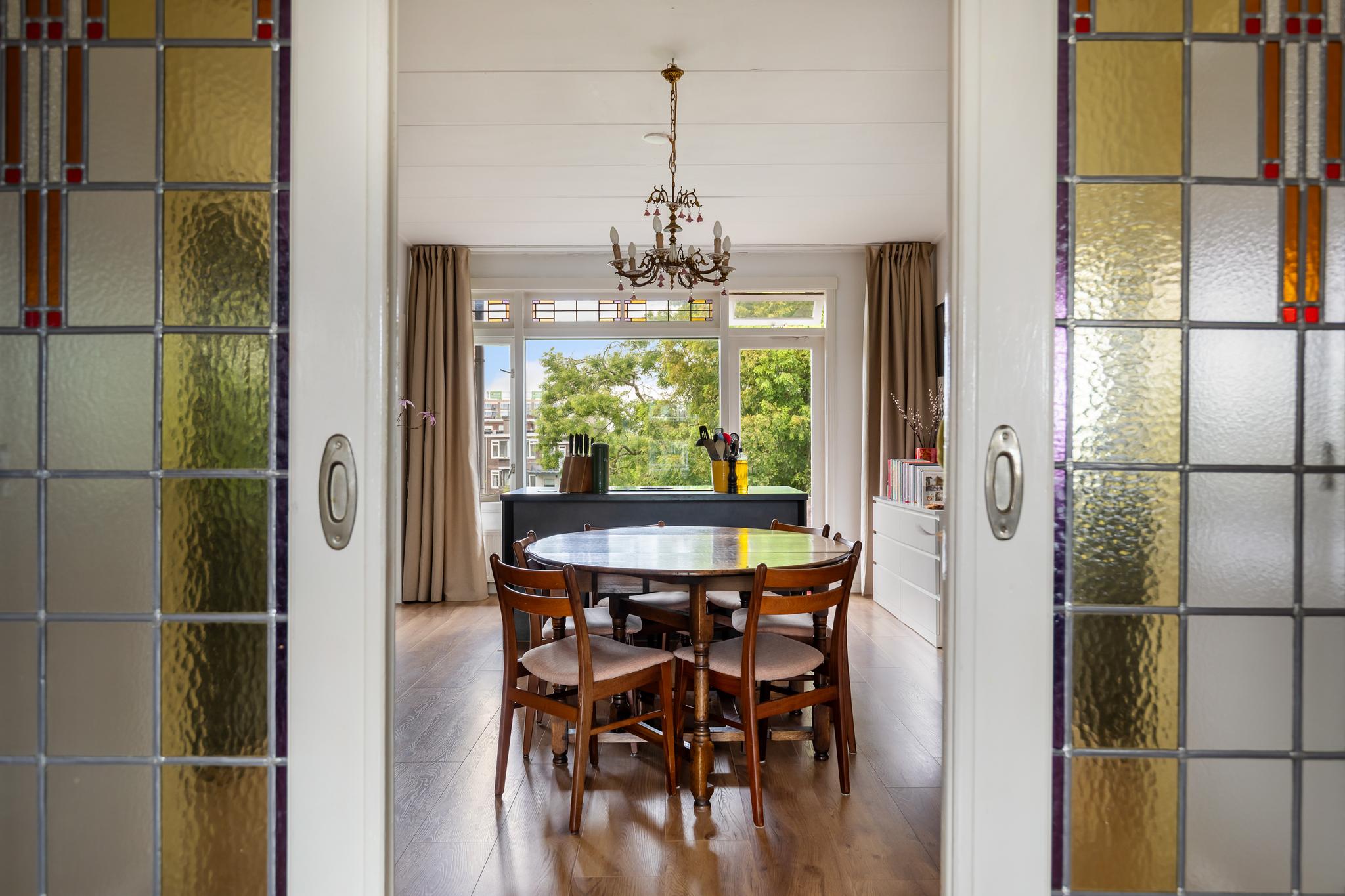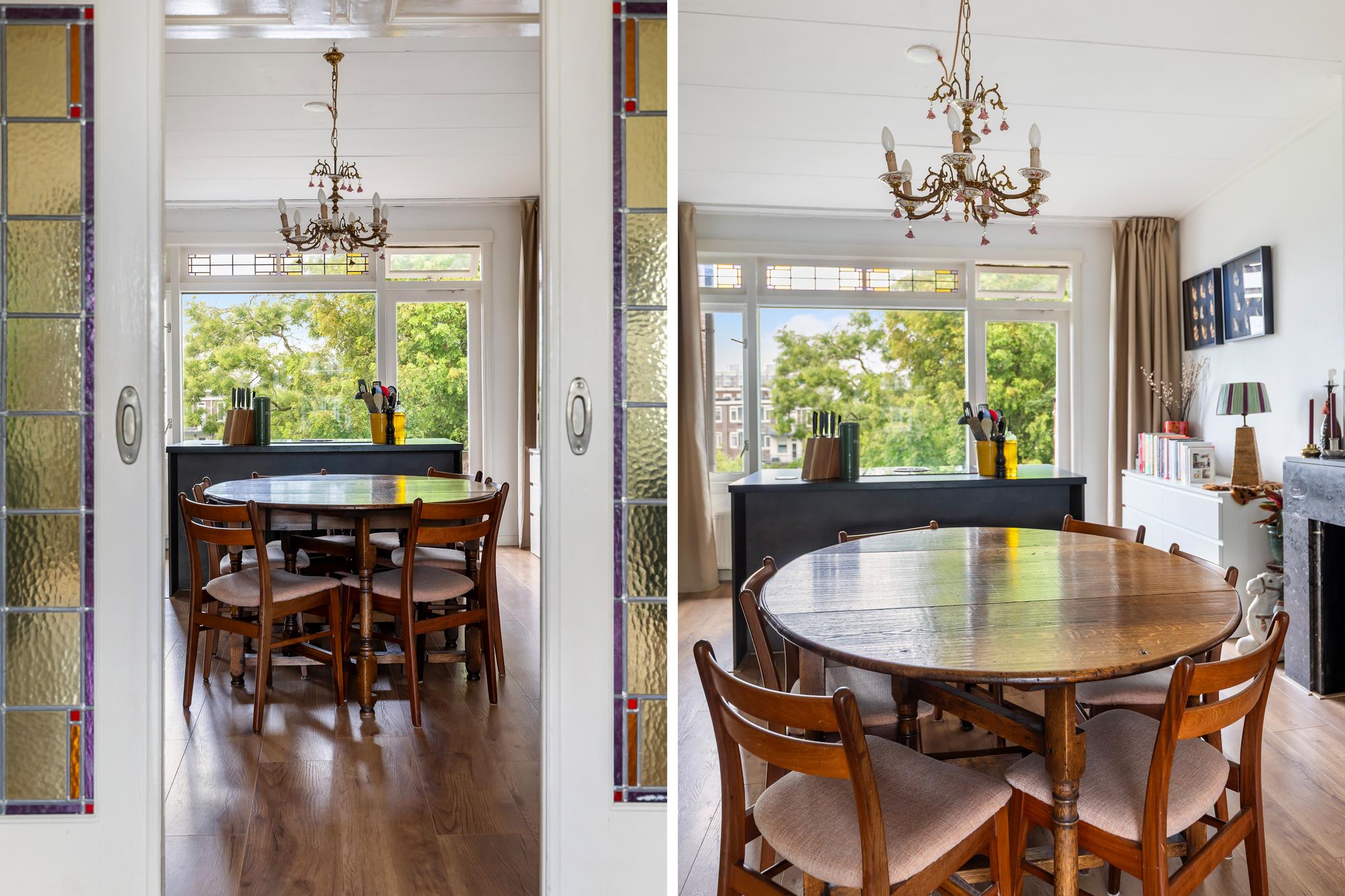 Ruime overloop met separaat toilet, vaste kasten, meterkast en toegang tot alle vertrekken op deze verdieping. De originele jaren ’30-details zoals glas-in-loodramen, paneeldeuren, schouw en karaktervolle en suite schuifdeuren geven de woning een sfeervol karakter. De authentieke en brede woon-/eetkamer heeft een lengte van maar liefst ruim 12 meter! Dankzij de schuifdeuren is de ruimte flexibel in te delen, met een mooie scheiding tussen het woon- en eetgedeelte. Het woongedeelte is gelegen aan de voorzijde van de woning. Door de grote raampartijen aan beide zijden van de woning treedt er veel natuurlijk licht de woning binnen, wat zorgt voor een fijne, lichte sfeer. Aan de achterzijde van de woning is het eetgedeelte gelegen. Centraal gelegen in het eetgedeelte bevindt zich het kookeiland met barretje, een mooie plek waar koken en gezelligheid samenkomen. Aangrenzend bevindt zich het overige deel van de keuken, die stijlvol is afgewerkt en beschikt over diverse inbouwapparatuur zoals een 4-pits inductiekookplaat, combi-oven, vaatwasser en een ingebouwde koelkast en vriezer. Door middel van een deur in zowel de keuken als het eetgedeelte bereik je het 1e balkon, gelegen op het oosten. Hier kun je heerlijk genieten van een kop koffie in de ochtend. De eerste slaapkamer met vaste kast bevindt zich aan de voorzijde van de woning en is multifunctioneel in te richten als een werk-, kinder- of slaapkamer. Tevens heb je hier toegang tot het 2e balkon, gelegen op het westen, waar je van de einde middag-/avondzon kunt genieten.