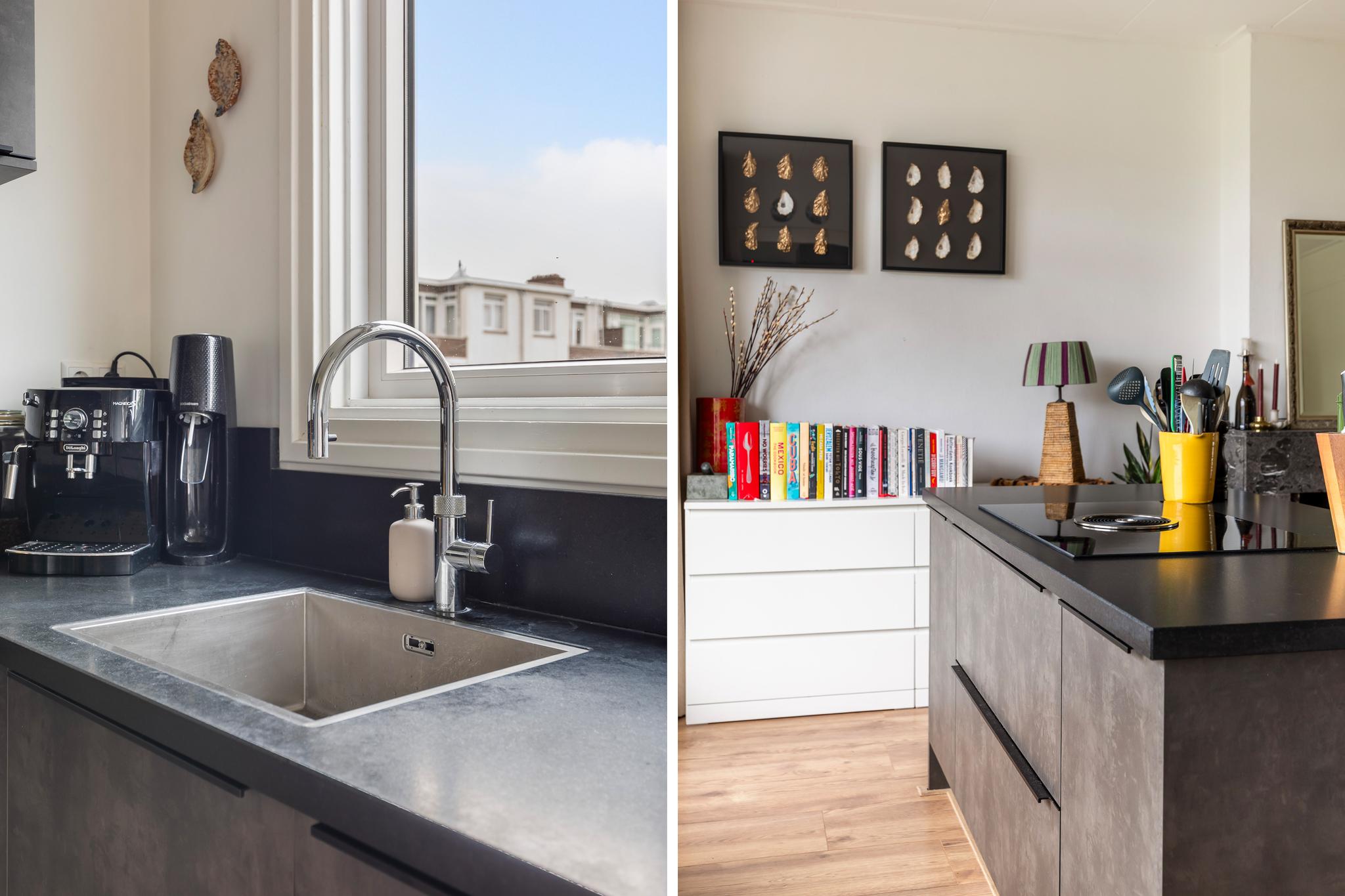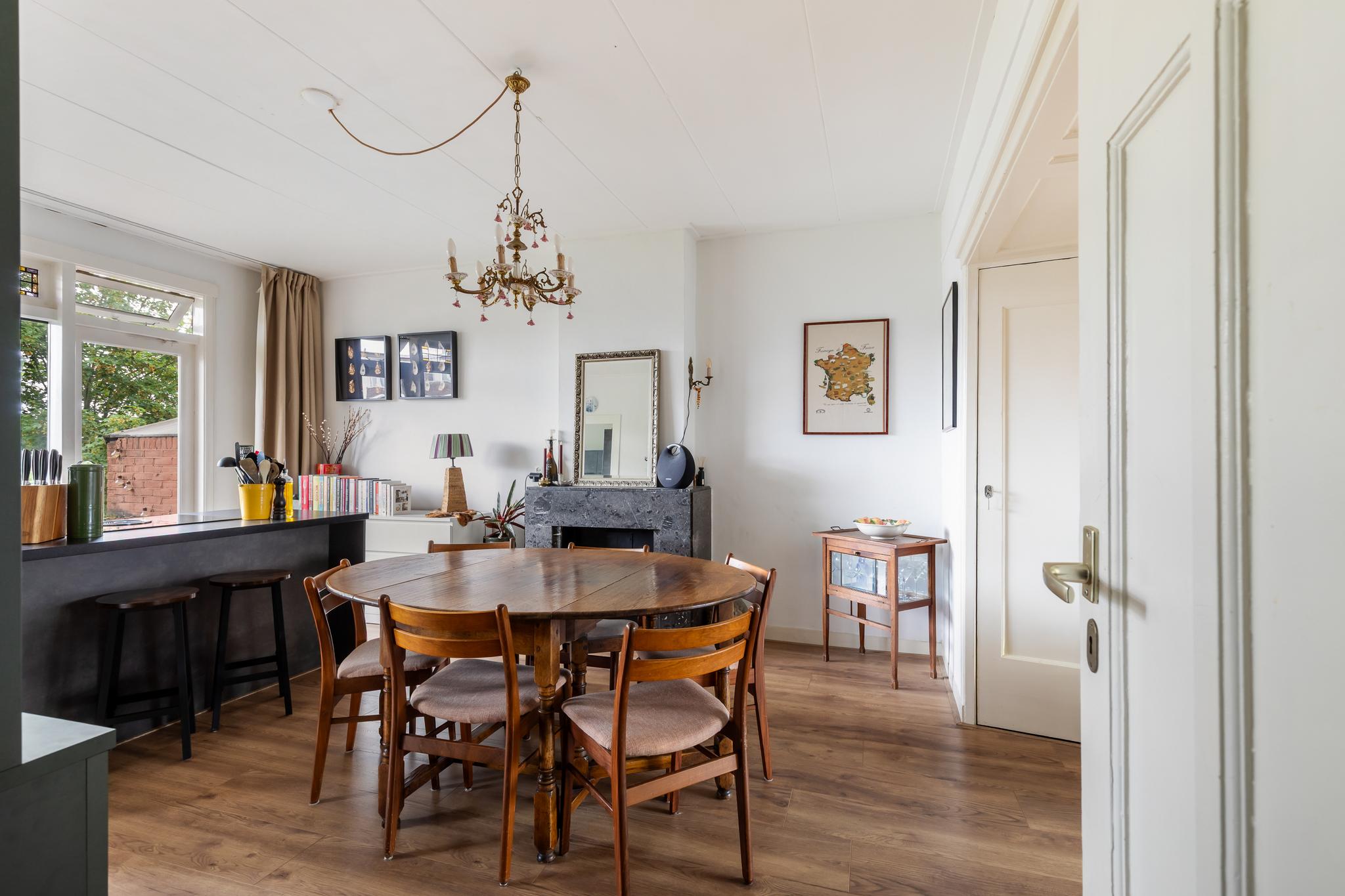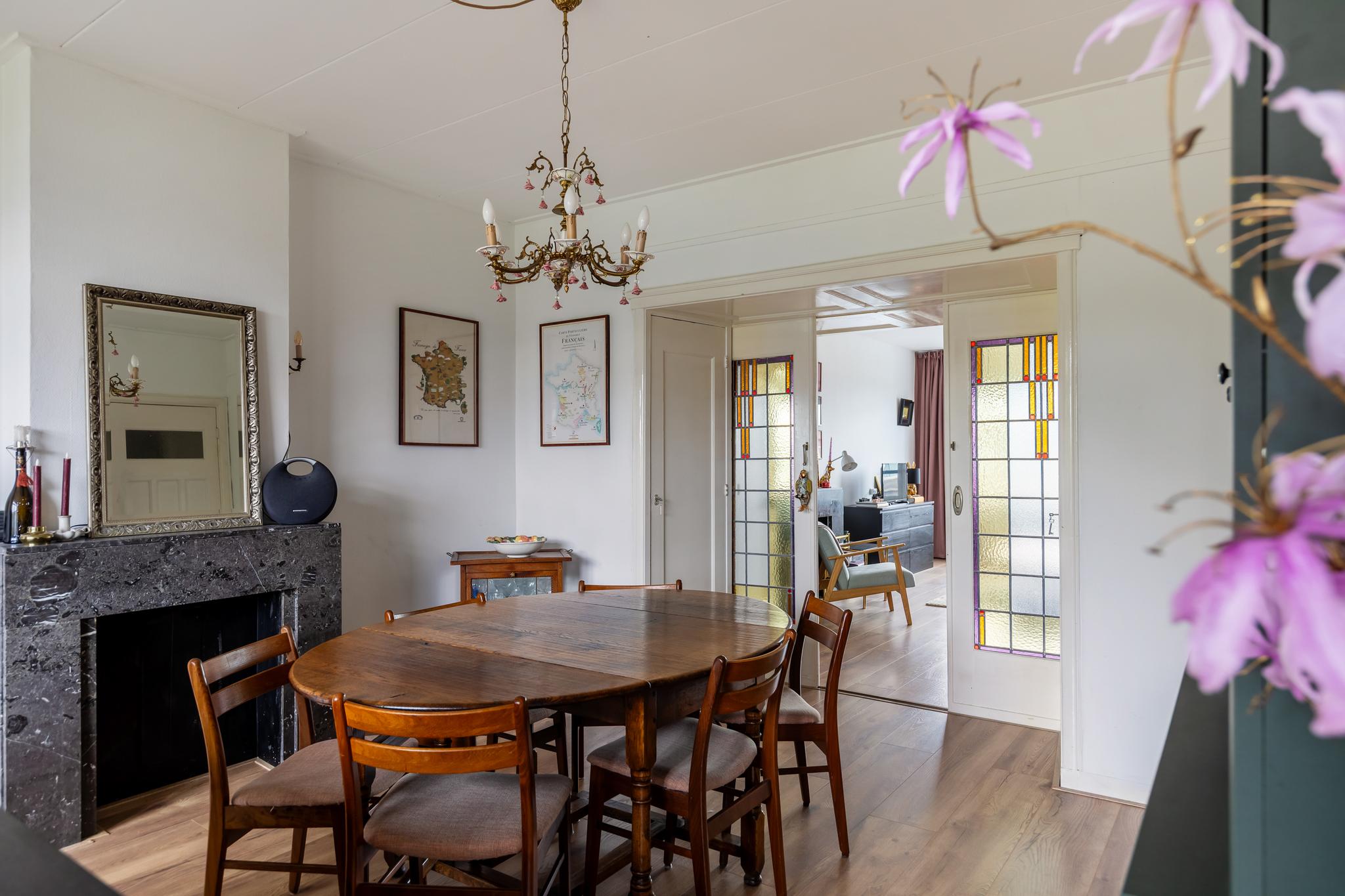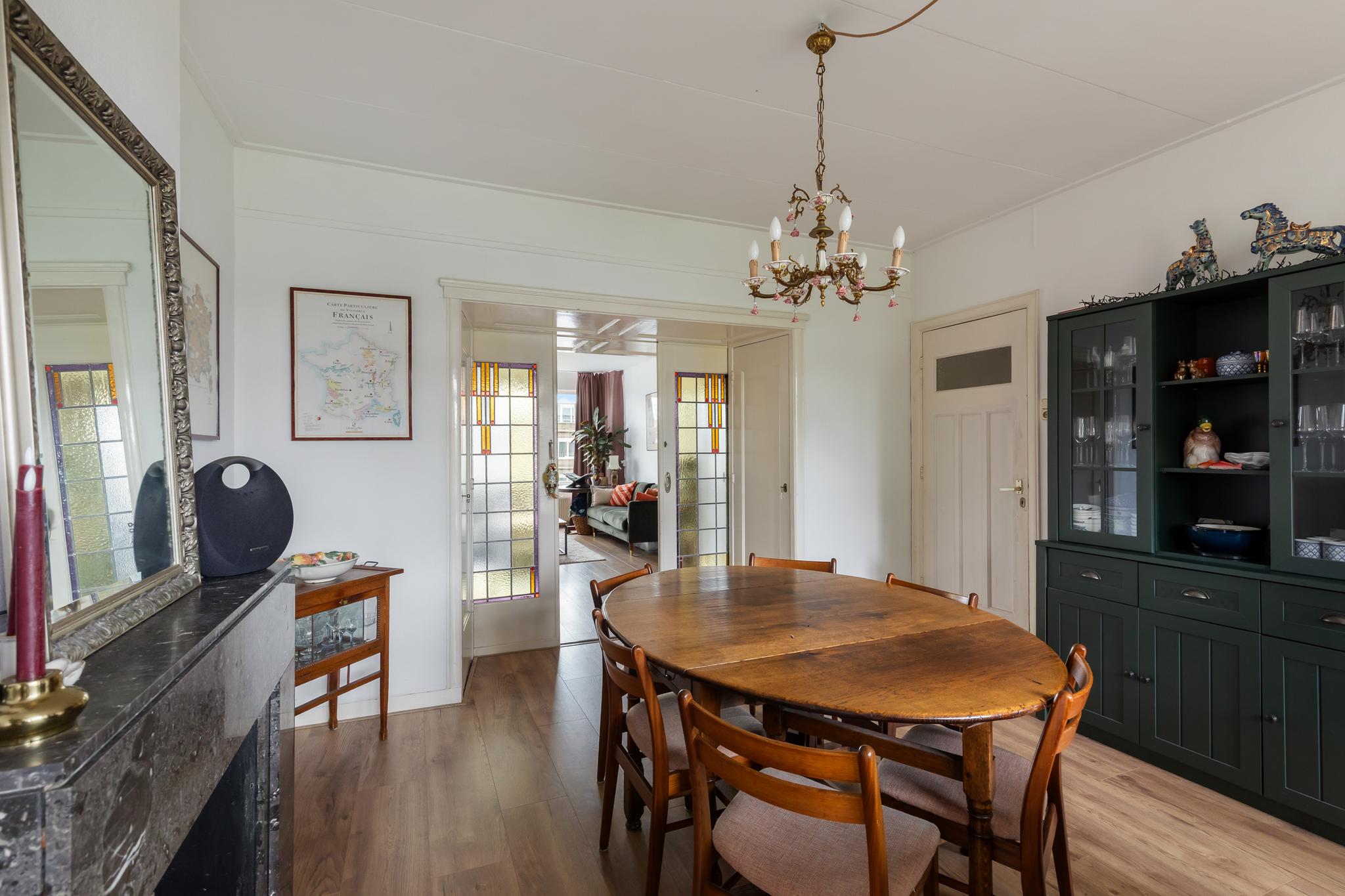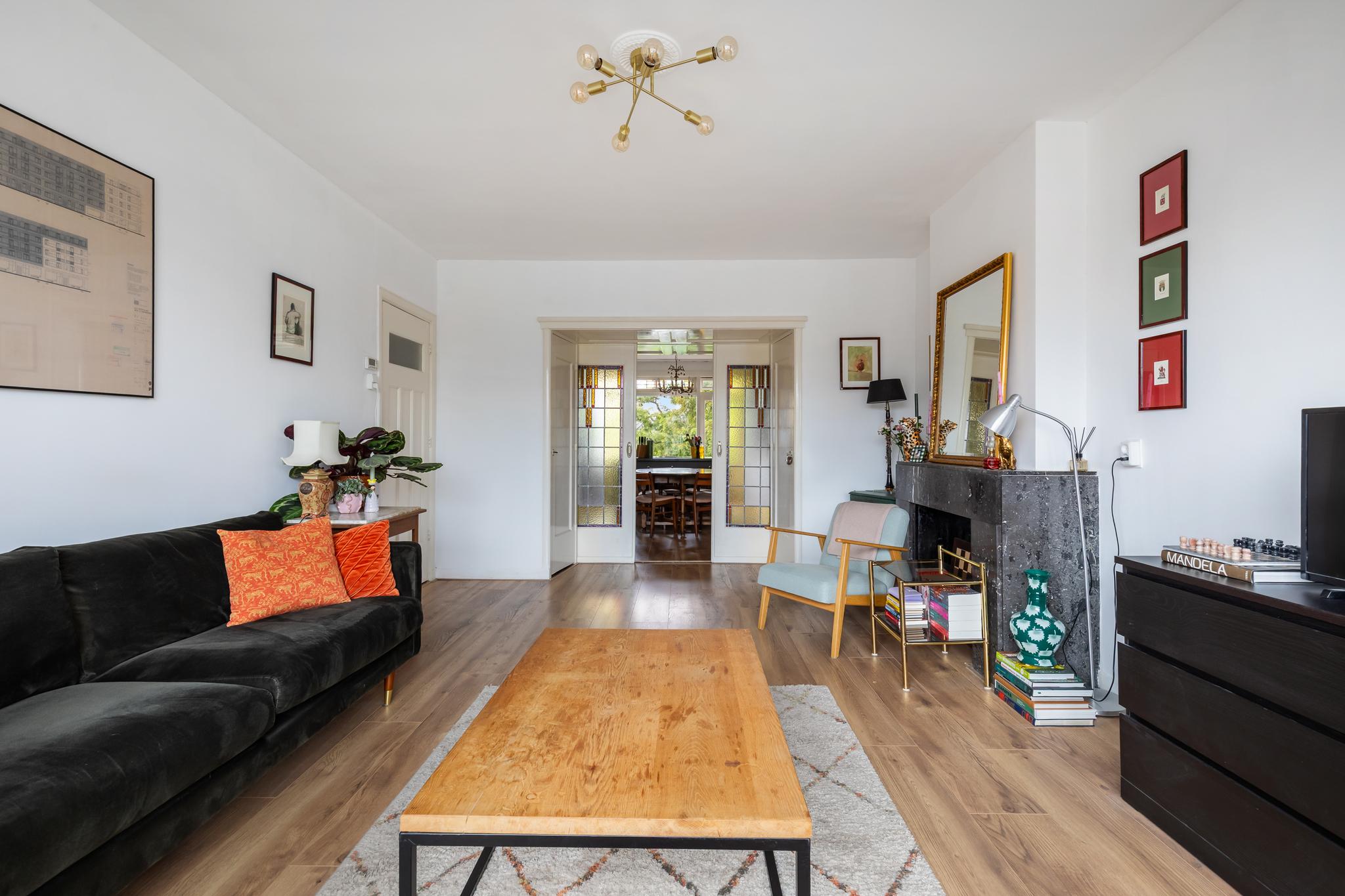Ruime overloop met separaat toilet, vaste kasten, meterkast en toegang tot alle vertrekken op deze verdieping. De originele jaren ’30-details zoals glas-in-loodramen, paneeldeuren, schouw en karaktervolle en suite schuifdeuren geven de woning een sfeervol karakter. De authentieke en brede woon-/eetkamer heeft een lengte van maar liefst ruim 12 meter! Dankzij de schuifdeuren is de ruimte flexibel in te delen, met een mooie scheiding tussen het woon- en eetgedeelte. Het woongedeelte is gelegen aan de voorzijde van de woning. Door de grote raampartijen aan beide zijden van de woning treedt er veel natuurlijk licht de woning binnen, wat zorgt voor een fijne, lichte sfeer. Aan de achterzijde van de woning is het eetgedeelte gelegen. Centraal gelegen in het eetgedeelte bevindt zich het kookeiland met barretje, een mooie plek waar koken en gezelligheid samenkomen. Aangrenzend bevindt zich het overige deel van de keuken, die stijlvol is afgewerkt en beschikt over diverse inbouwapparatuur zoals een 4-pits inductiekookplaat, combi-oven, vaatwasser en een ingebouwde koelkast en vriezer. Door middel van een deur in zowel de keuken als het eetgedeelte bereik je het 1e balkon, gelegen op het oosten. Hier kun je heerlijk genieten van een kop koffie in de ochtend. De eerste slaapkamer met vaste kast bevindt zich aan de voorzijde van de woning en is multifunctioneel in te richten als een werk-, kinder- of slaapkamer. Tevens heb je hier toegang tot het 2e balkon, gelegen op het westen, waar je van de einde middag-/avondzon kunt genieten.