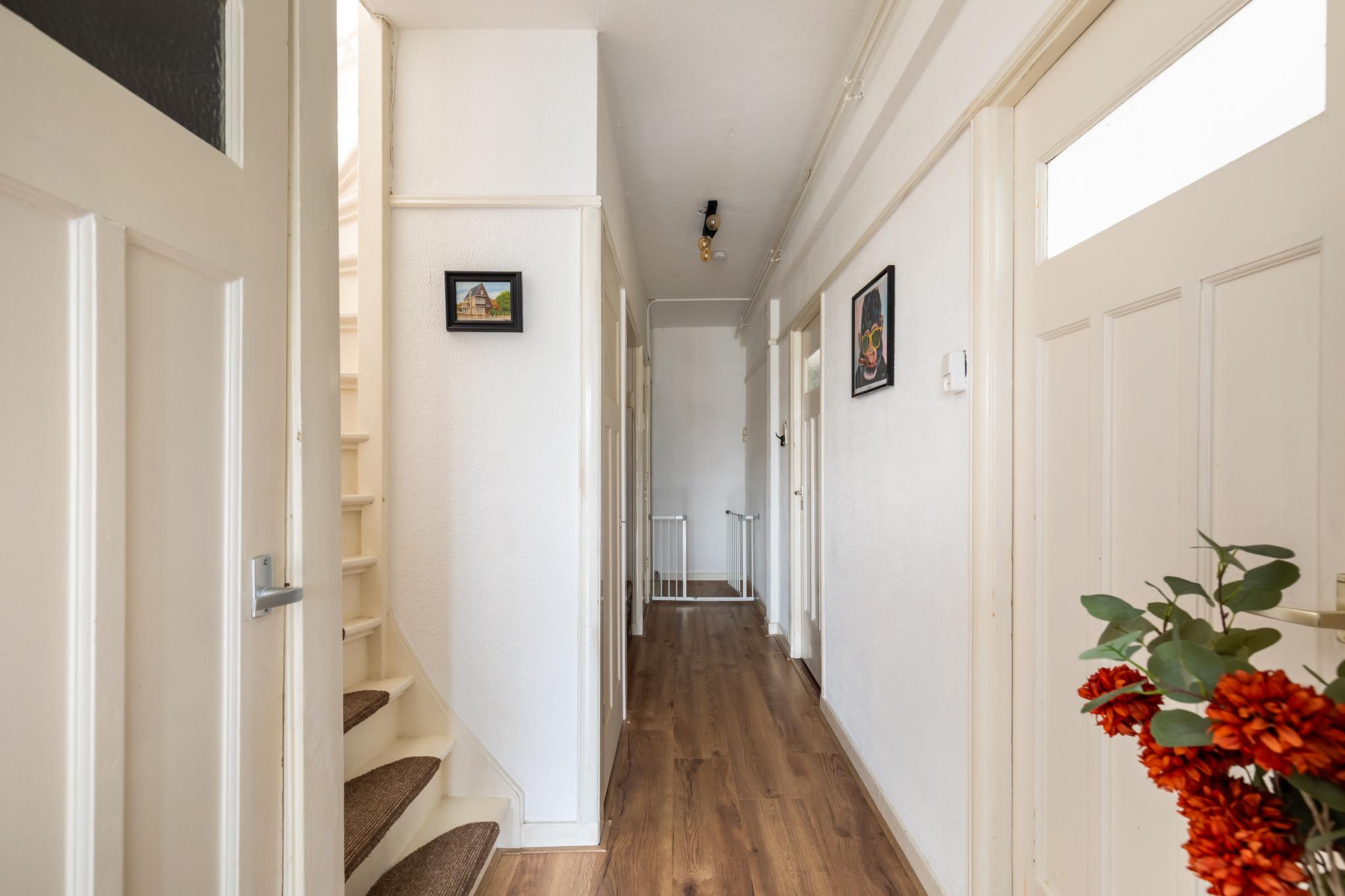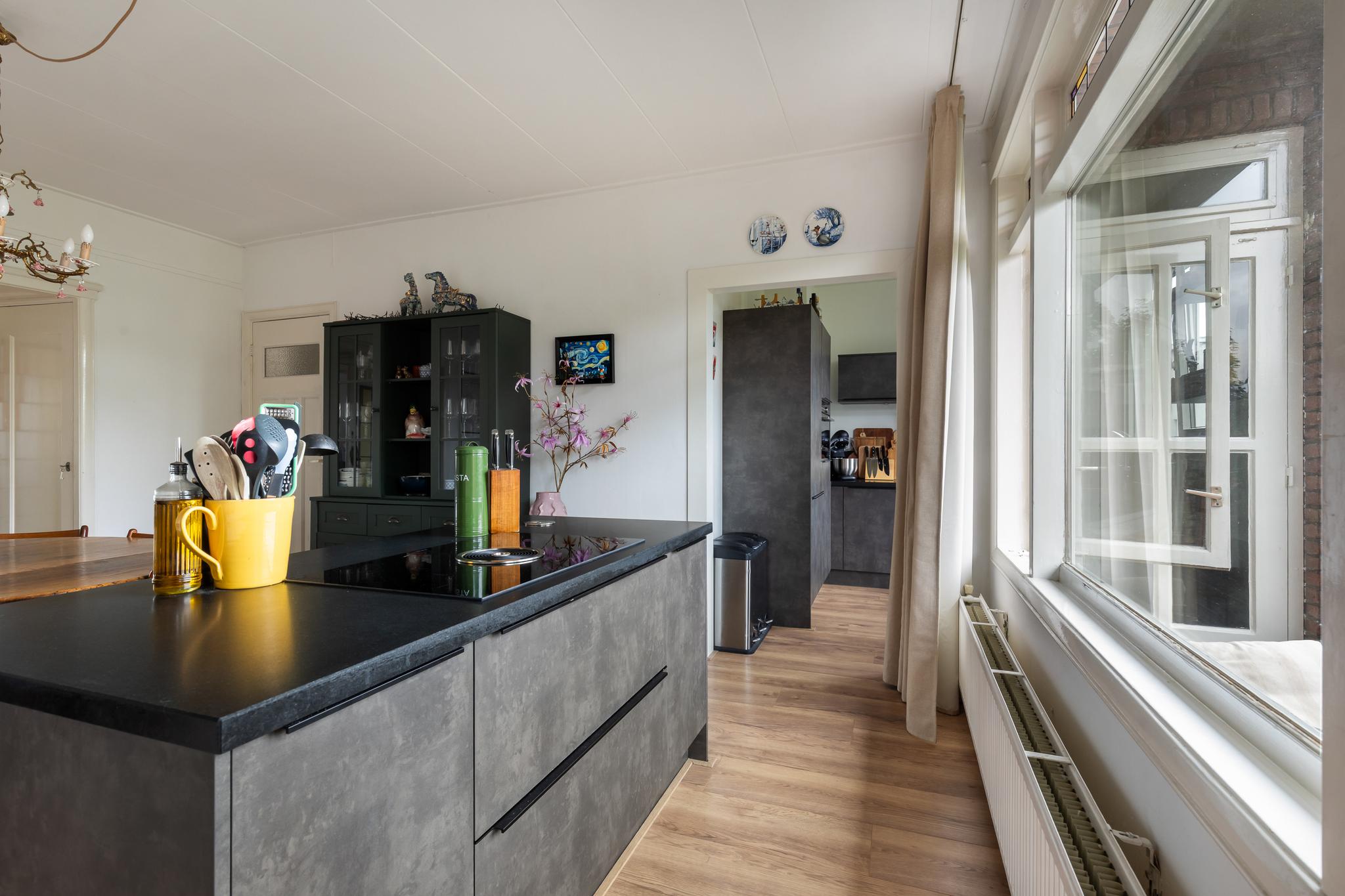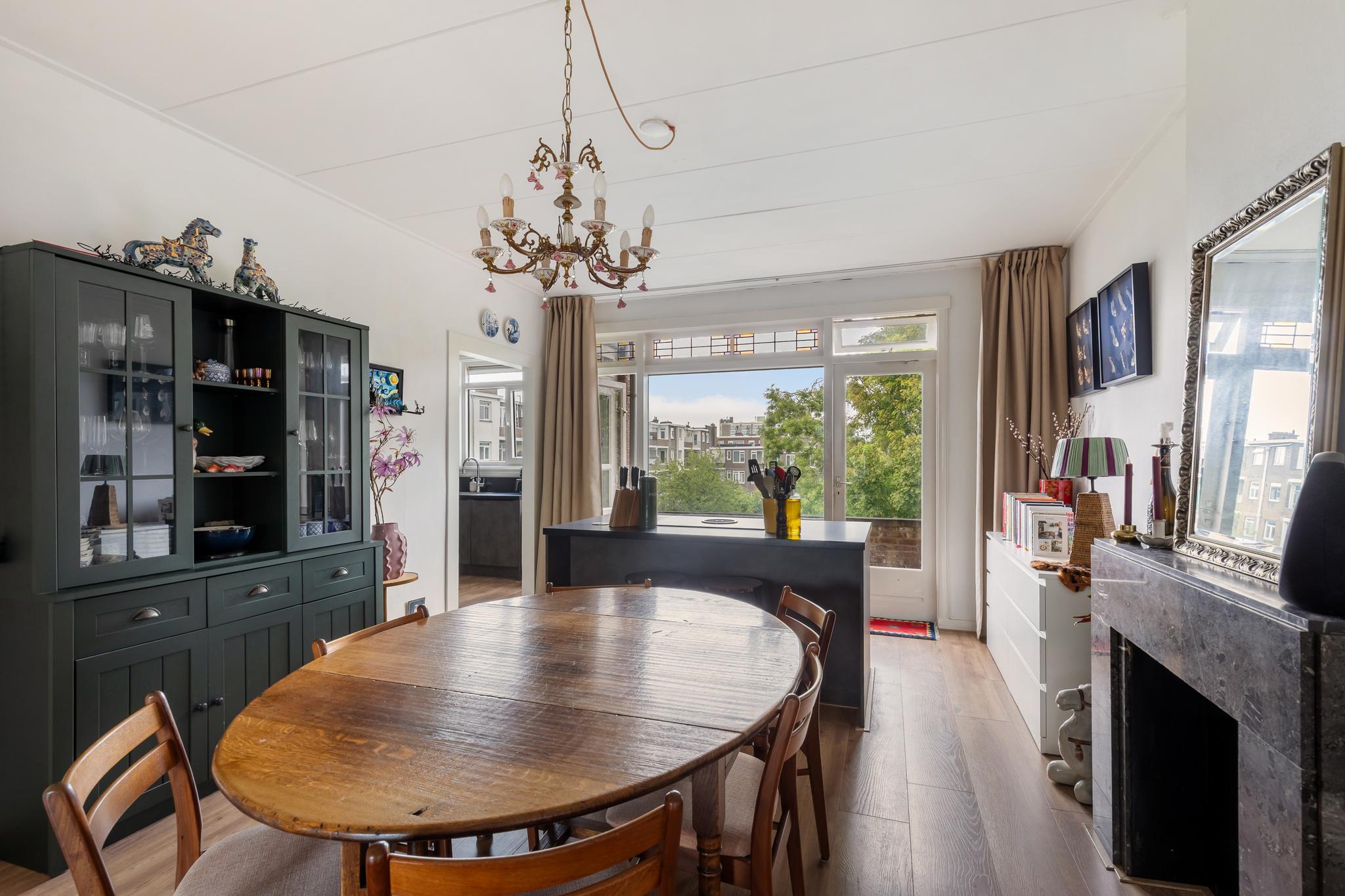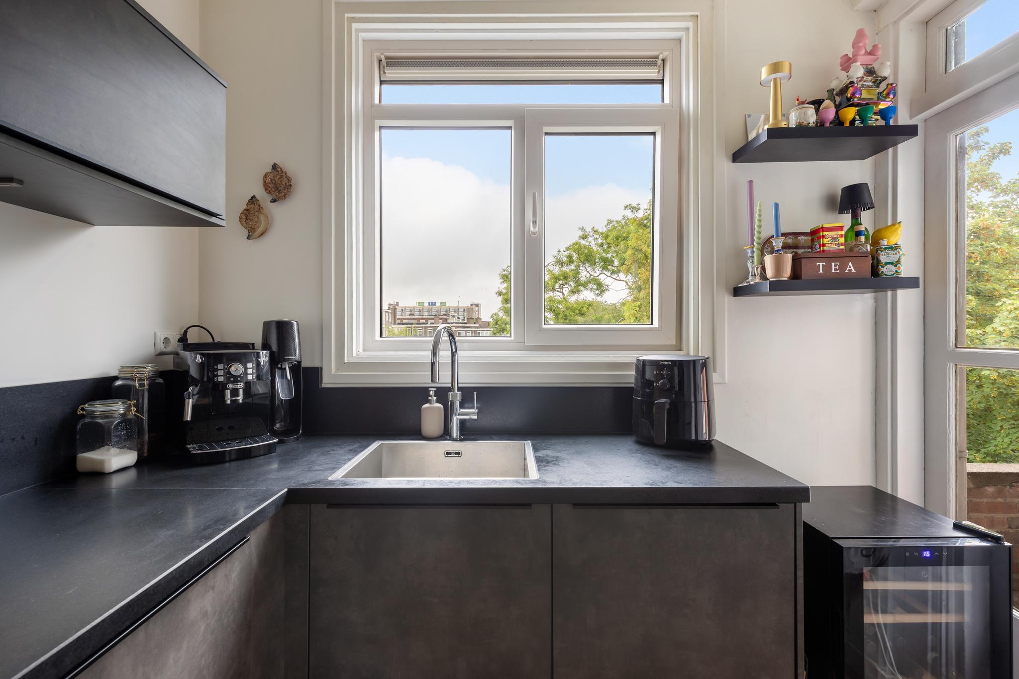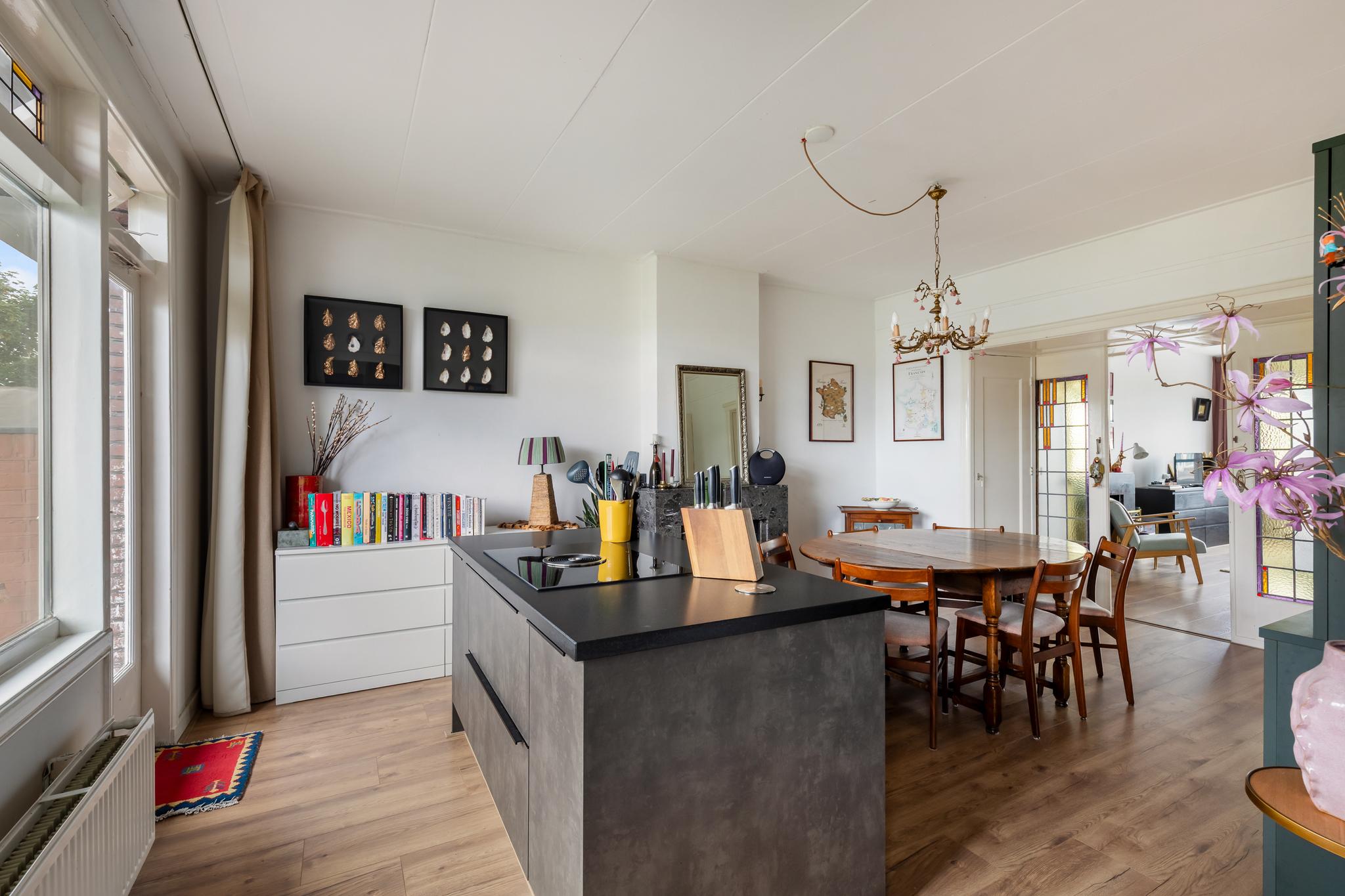 Ruime overloop met separaat toilet, vaste kasten, meterkast en toegang tot alle vertrekken op deze verdieping. De originele jaren ’30-details zoals glas-in-loodramen, paneeldeuren, schouw en karaktervolle en suite schuifdeuren geven de woning een sfeervol karakter. De authentieke en brede woon-/eetkamer heeft een lengte van maar liefst ruim 12 meter! Dankzij de schuifdeuren is de ruimte flexibel in te delen, met een mooie scheiding tussen het woon- en eetgedeelte. Het woongedeelte is gelegen aan de voorzijde van de woning. Door de grote raampartijen aan beide zijden van de woning treedt er veel natuurlijk licht de woning binnen, wat zorgt voor een fijne, lichte sfeer. Aan de achterzijde van de woning is het eetgedeelte gelegen. Centraal gelegen in het eetgedeelte bevindt zich het kookeiland met barretje, een mooie plek waar koken en gezelligheid samenkomen. Aangrenzend bevindt zich het overige deel van de keuken, die stijlvol is afgewerkt en beschikt over diverse inbouwapparatuur zoals een 4-pits inductiekookplaat, combi-oven, vaatwasser en een ingebouwde koelkast en vriezer. Door middel van een deur in zowel de keuken als het eetgedeelte bereik je het 1e balkon, gelegen op het oosten. Hier kun je heerlijk genieten van een kop koffie in de ochtend. De eerste slaapkamer met vaste kast bevindt zich aan de voorzijde van de woning en is multifunctioneel in te richten als een werk-, kinder- of slaapkamer. Tevens heb je hier toegang tot het 2e balkon, gelegen op het westen, waar je van de einde middag-/avondzon kunt genieten.