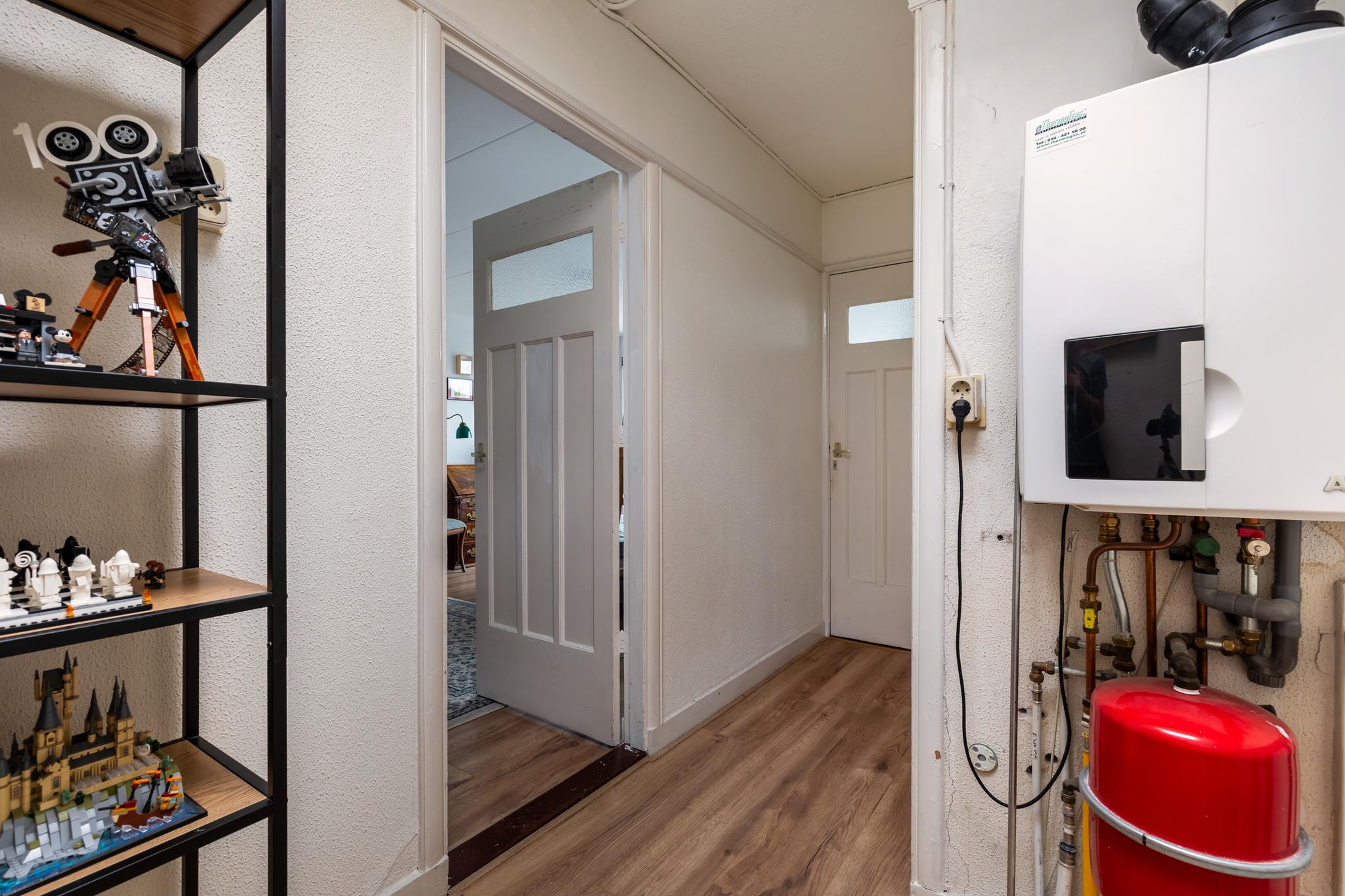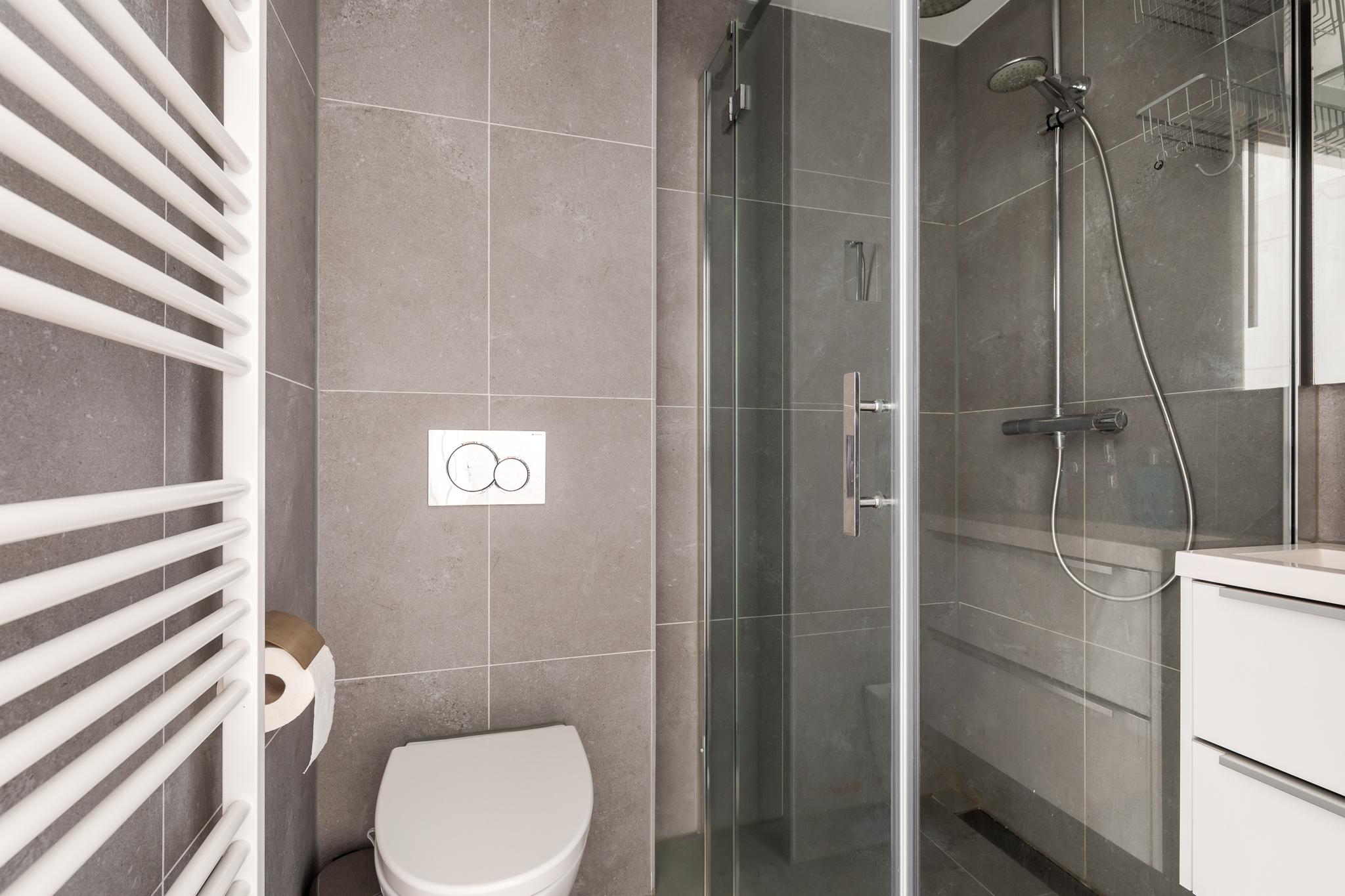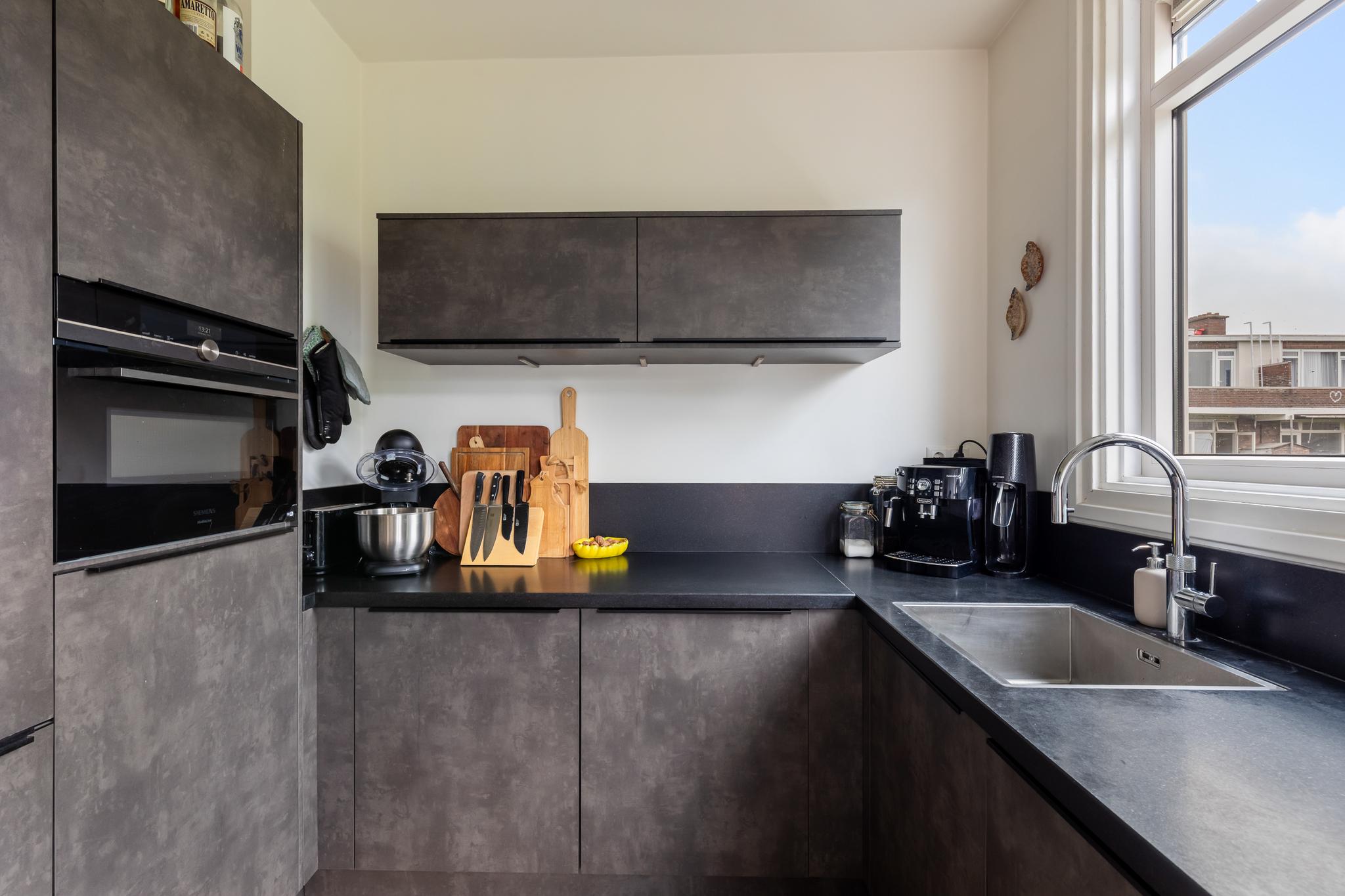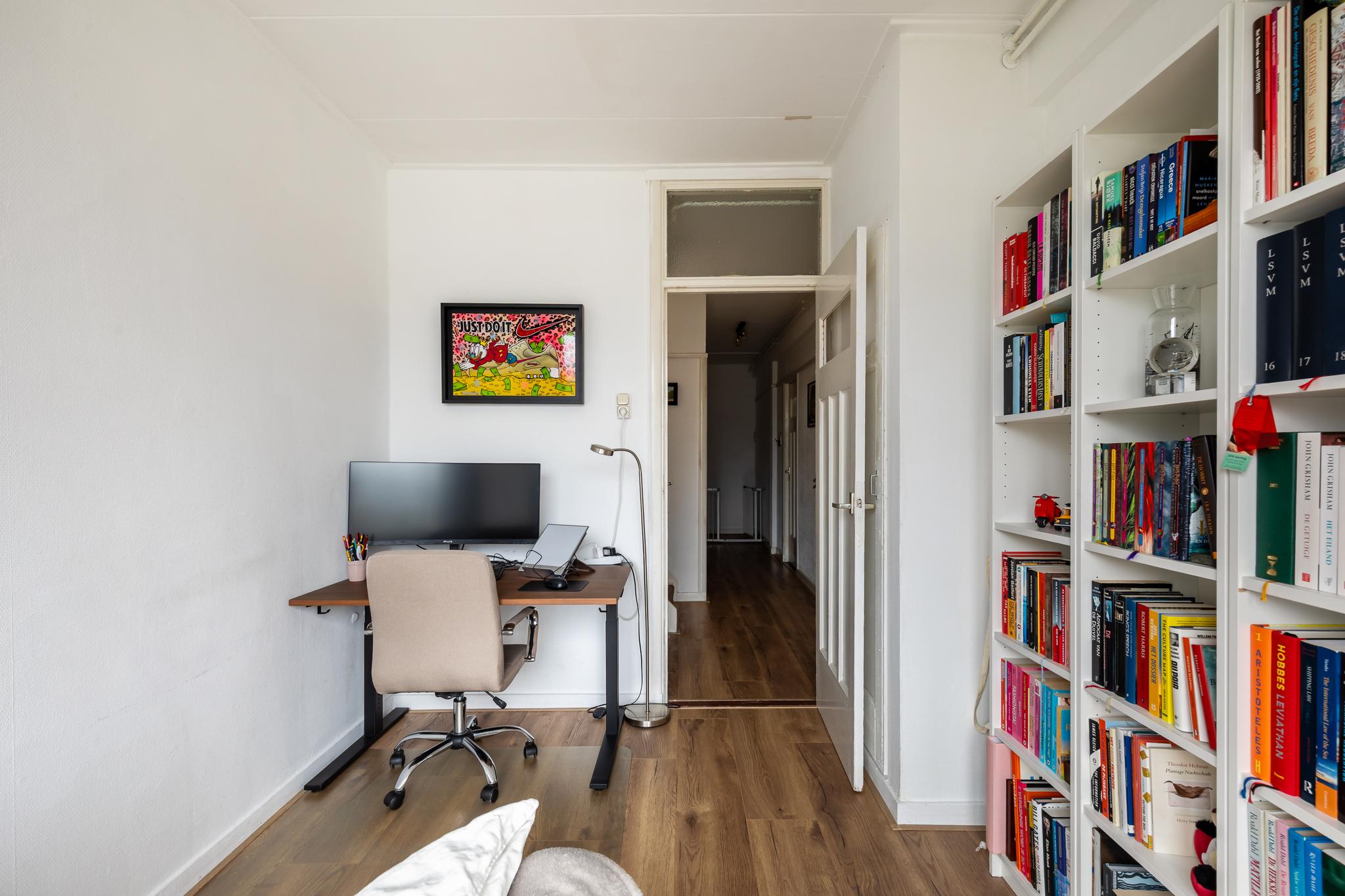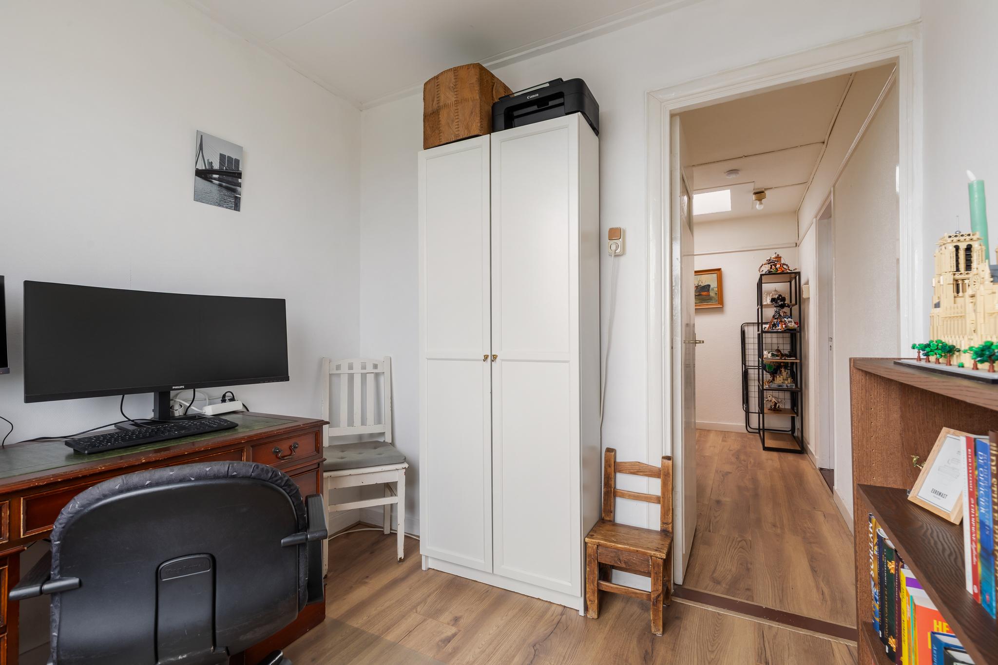 Ruime overloop met separaat toilet, vaste kasten, meterkast en toegang tot alle vertrekken op deze verdieping. De originele jaren ’30-details zoals glas-in-loodramen, paneeldeuren, schouw en karaktervolle en suite schuifdeuren geven de woning een sfeervol karakter. De authentieke en brede woon-/eetkamer heeft een lengte van maar liefst ruim 12 meter! Dankzij de schuifdeuren is de ruimte flexibel in te delen, met een mooie scheiding tussen het woon- en eetgedeelte. Het woongedeelte is gelegen aan de voorzijde van de woning. Door de grote raampartijen aan beide zijden van de woning treedt er veel natuurlijk licht de woning binnen, wat zorgt voor een fijne, lichte sfeer. Aan de achterzijde van de woning is het eetgedeelte gelegen. Centraal gelegen in het eetgedeelte bevindt zich het kookeiland met barretje, een mooie plek waar koken en gezelligheid samenkomen. Aangrenzend bevindt zich het overige deel van de keuken, die stijlvol is afgewerkt en beschikt over diverse inbouwapparatuur zoals een 4-pits inductiekookplaat, combi-oven, vaatwasser en een ingebouwde koelkast en vriezer. Door middel van een deur in zowel de keuken als het eetgedeelte bereik je het 1e balkon, gelegen op het oosten. Hier kun je heerlijk genieten van een kop koffie in de ochtend. De eerste slaapkamer met vaste kast bevindt zich aan de voorzijde van de woning en is multifunctioneel in te richten als een werk-, kinder- of slaapkamer. Tevens heb je hier toegang tot het 2e balkon, gelegen op het westen, waar je van de einde middag-/avondzon kunt genieten.
