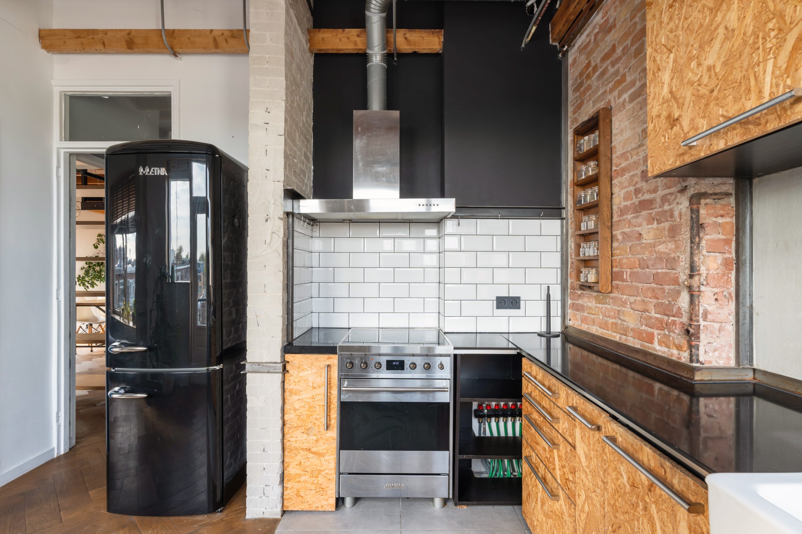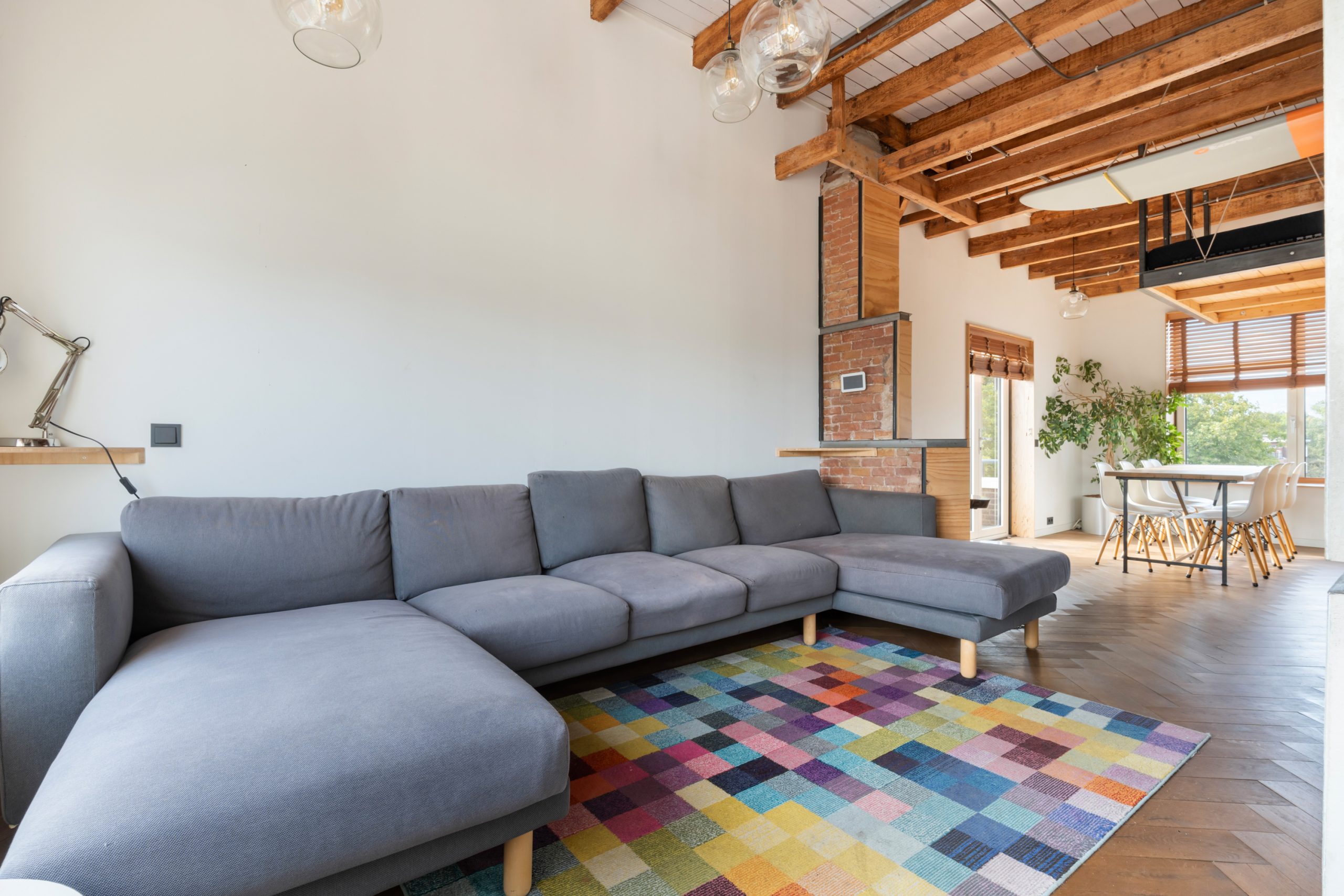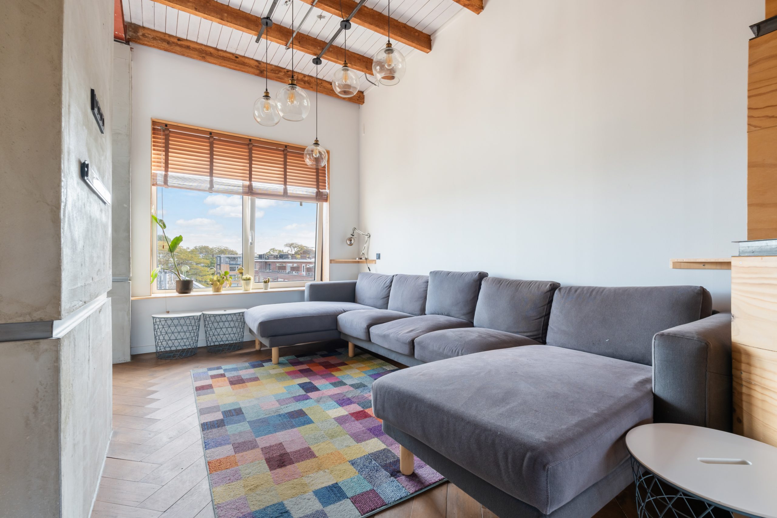 Hal/entree met trapopgang, meterkast en toegang tot alle vertrekken op deze verdieping. De royale L-vormige woonkamer met vaste kasten is gelegen aan de voorzijde van de woning. Met een lengte van ca. 9 meter en een hoogte van 3,3 meter voelt de woonkamer bijzonder ruimtelijk aan. De balkenstructuur benadrukt het speelse karakter van de ruimte en geeft het een warme uitstraling. De open keuken beschikt over een 4-pits elektrische kookplaat met afzuigkap, oven, vaatwasser, wasmachineaansluiting en een koel-/vriescombinatie. Via de keuken bereik je het 1e balkon, gelegen op zuiden. Hier kan je gedurende dag heerlijk genieten van de zon! Door de hoekligging van de woning en de vele raampartijen treedt er veel natuurlijk licht de woning binnen wat zorgt voor een fijne, lichte sfeer. In het zitgedeelte heb je meer dan voldoende ruimte voor een royale bank en een eettafel. Via openslaande deuren gelegen in het eetgedeelte, bereik je het 2e balkon gelegen op het westen. De 1e slaapkamer is multifunctioneel in te richten als werk-, kinder-, slaapkamer. De volledig betegelde badkamer met brickwall beschikt over een ligbad, (regenval)douche, wastafel en een toilet. Middels een wenteltrap gelegen in de hal bereik je de master bedroom.