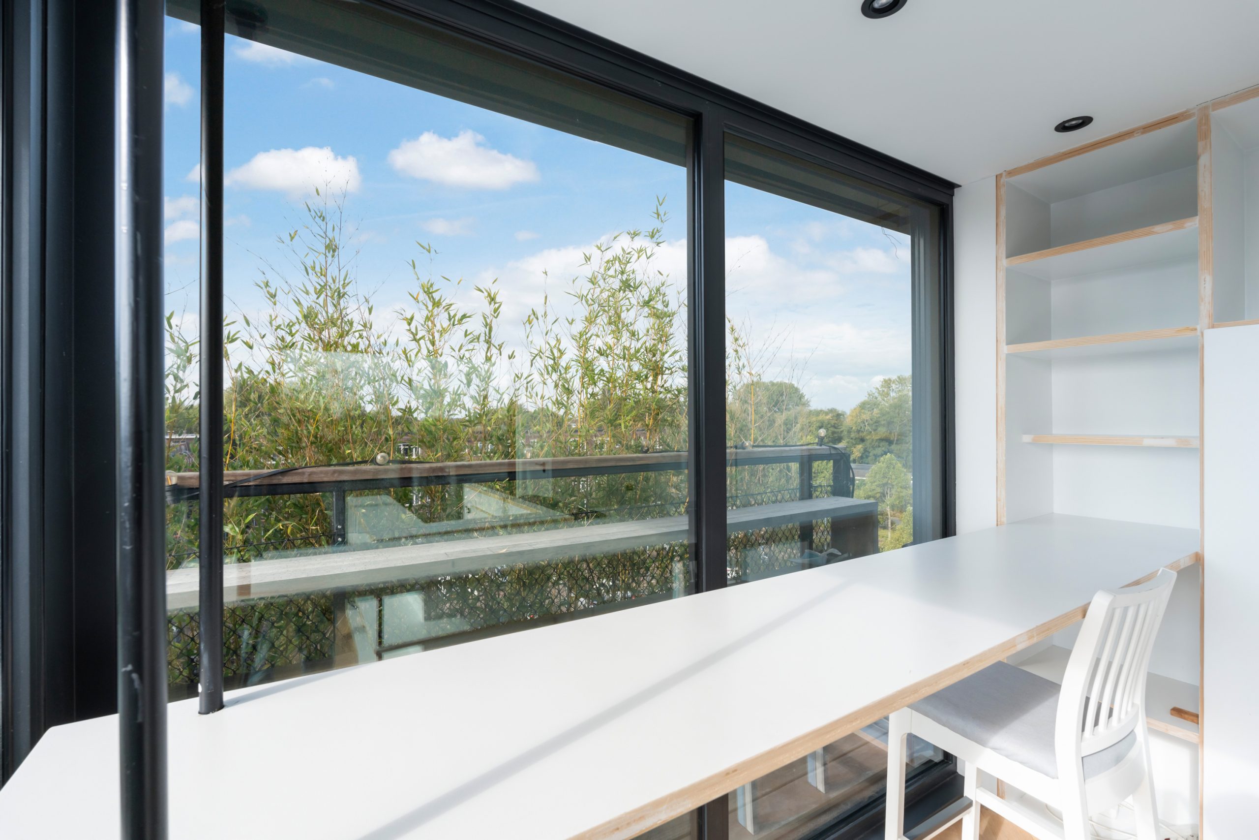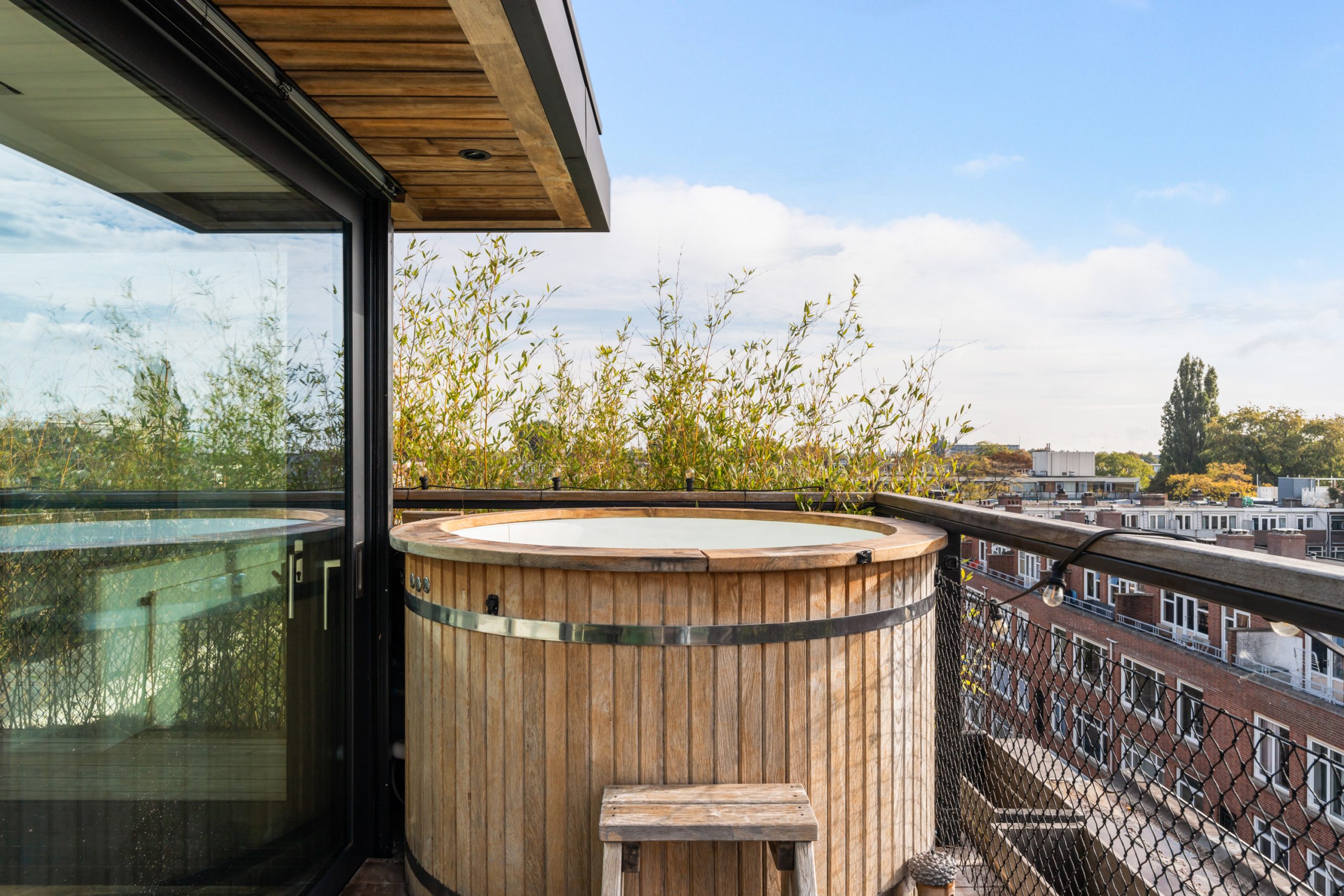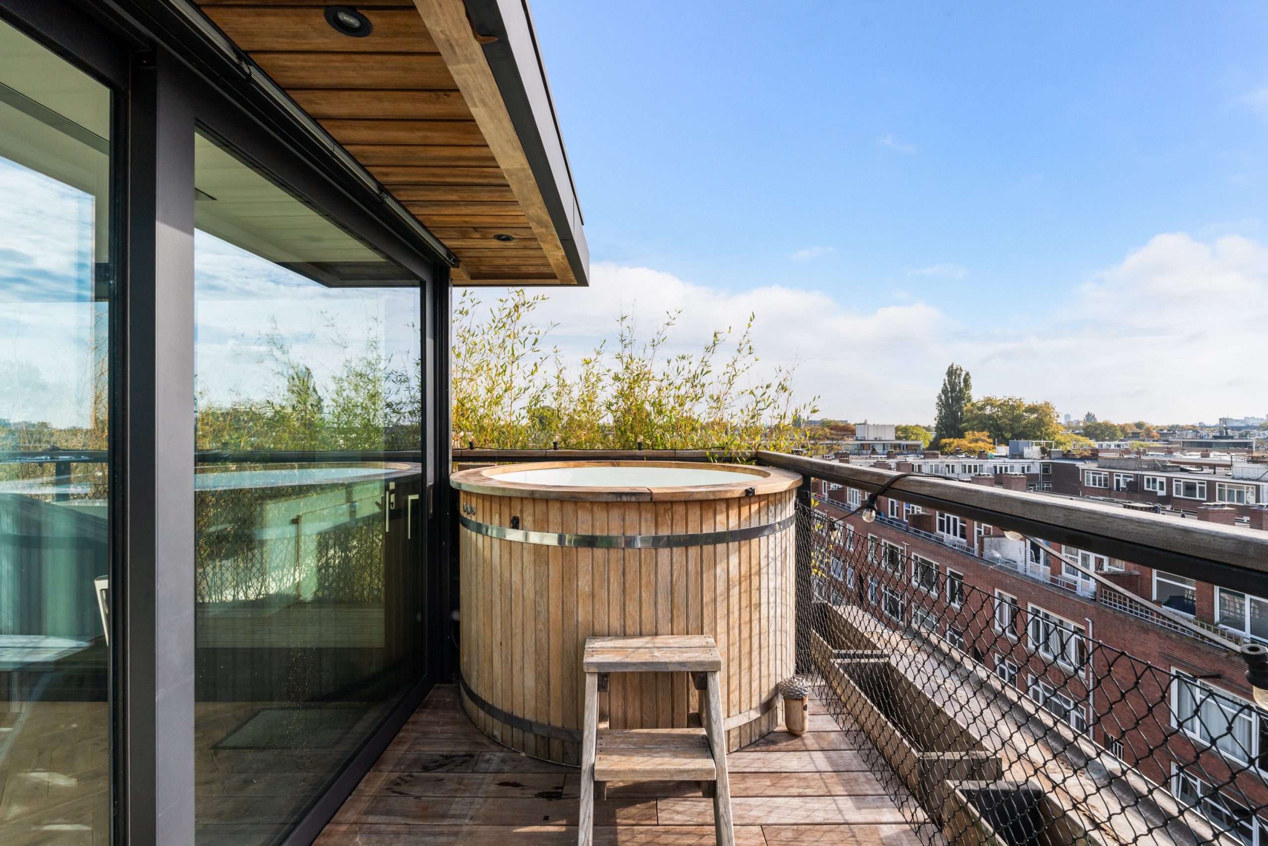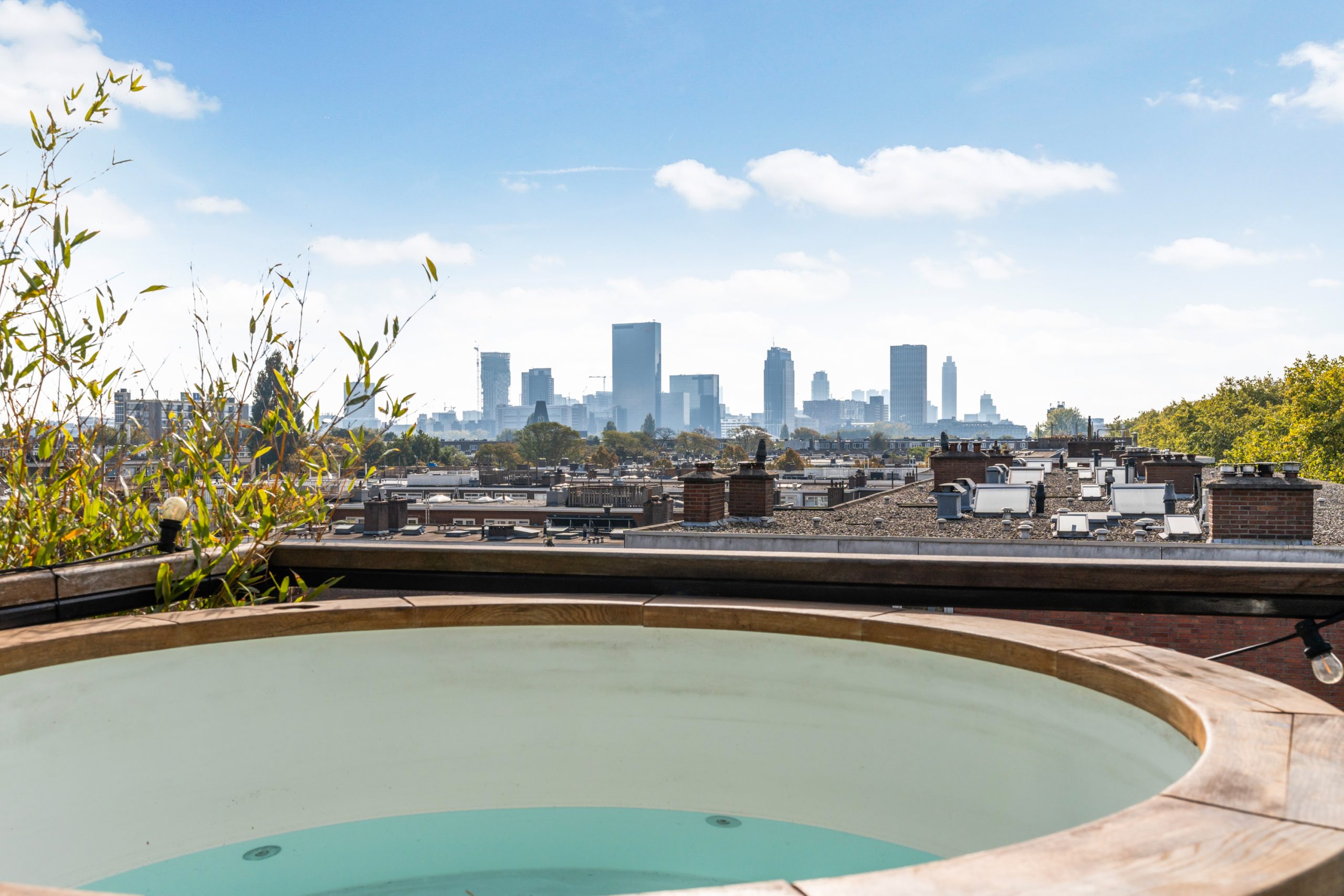 De master bedroom met vaste kasten is gelegen op de bovenste verdieping en heeft een mooie uitkijk over de skyline van Rotterdam. In de ruimte staat een hoge tafel en biedt een prettige werkplek, waar je in alle rust kunt werken. Dankzij de lichte kasten en de grote raampartijen voelt de ruimte bijzonder licht en rustgevend aan, met een prettige, open sfeer. Via een schuifdeur bereik je het dakterras. Het dakterras ziet er erg verzorgd uit en beschikt over een jacuzzi, buitendouche, kraan en genoeg ruimte voor een riante loungeset.