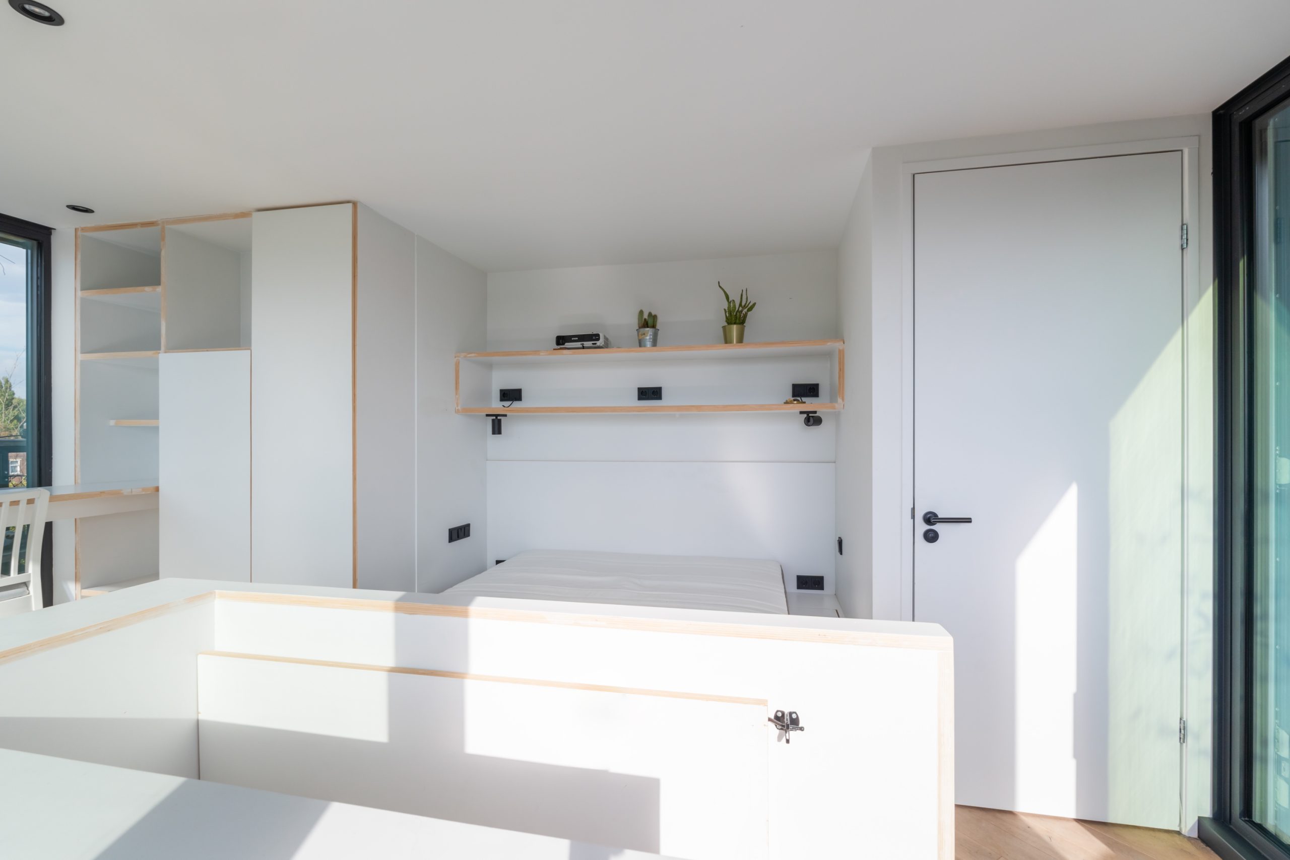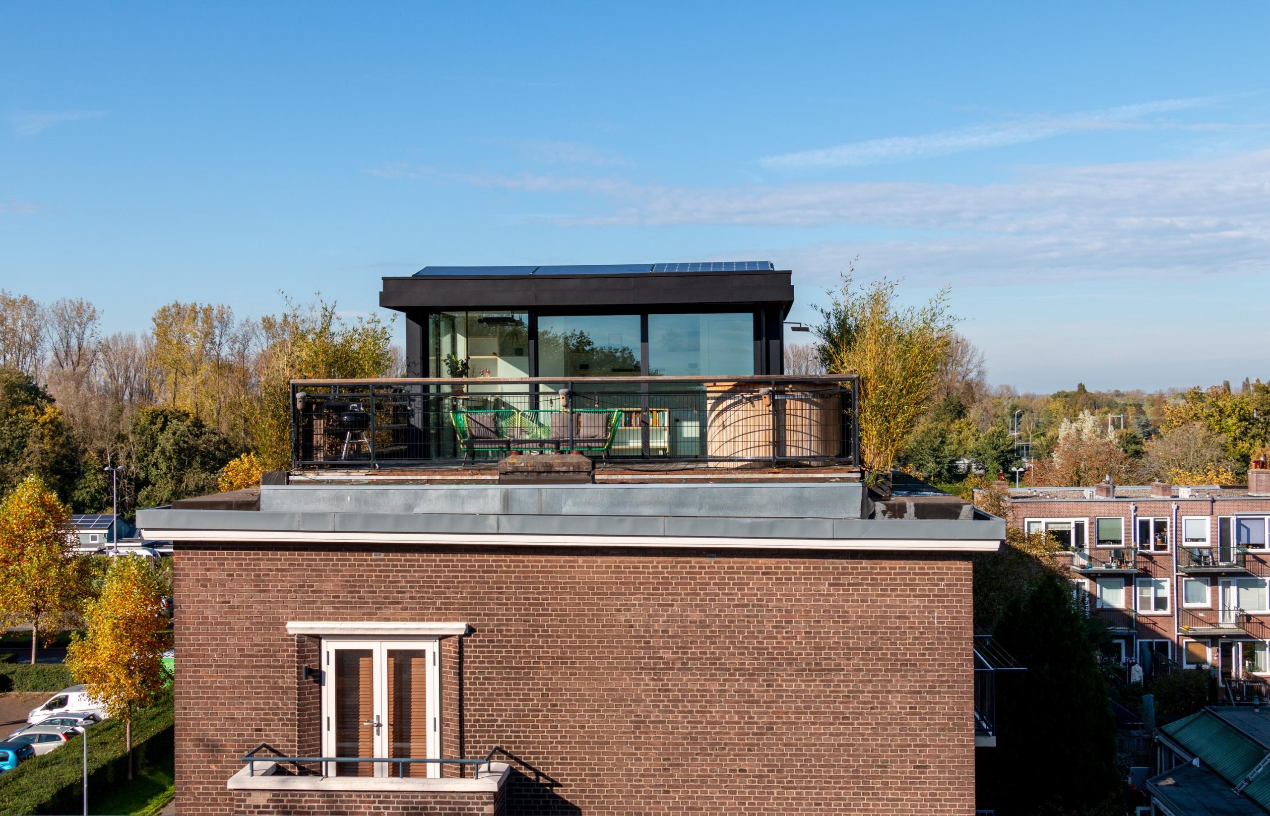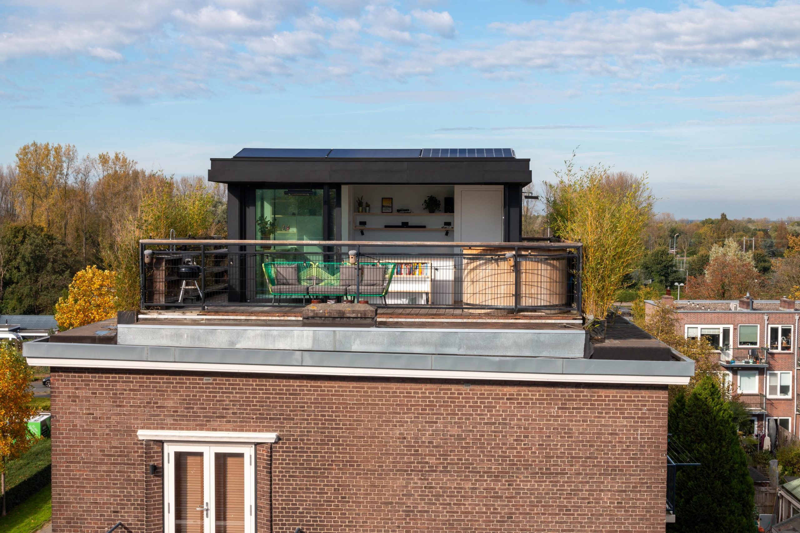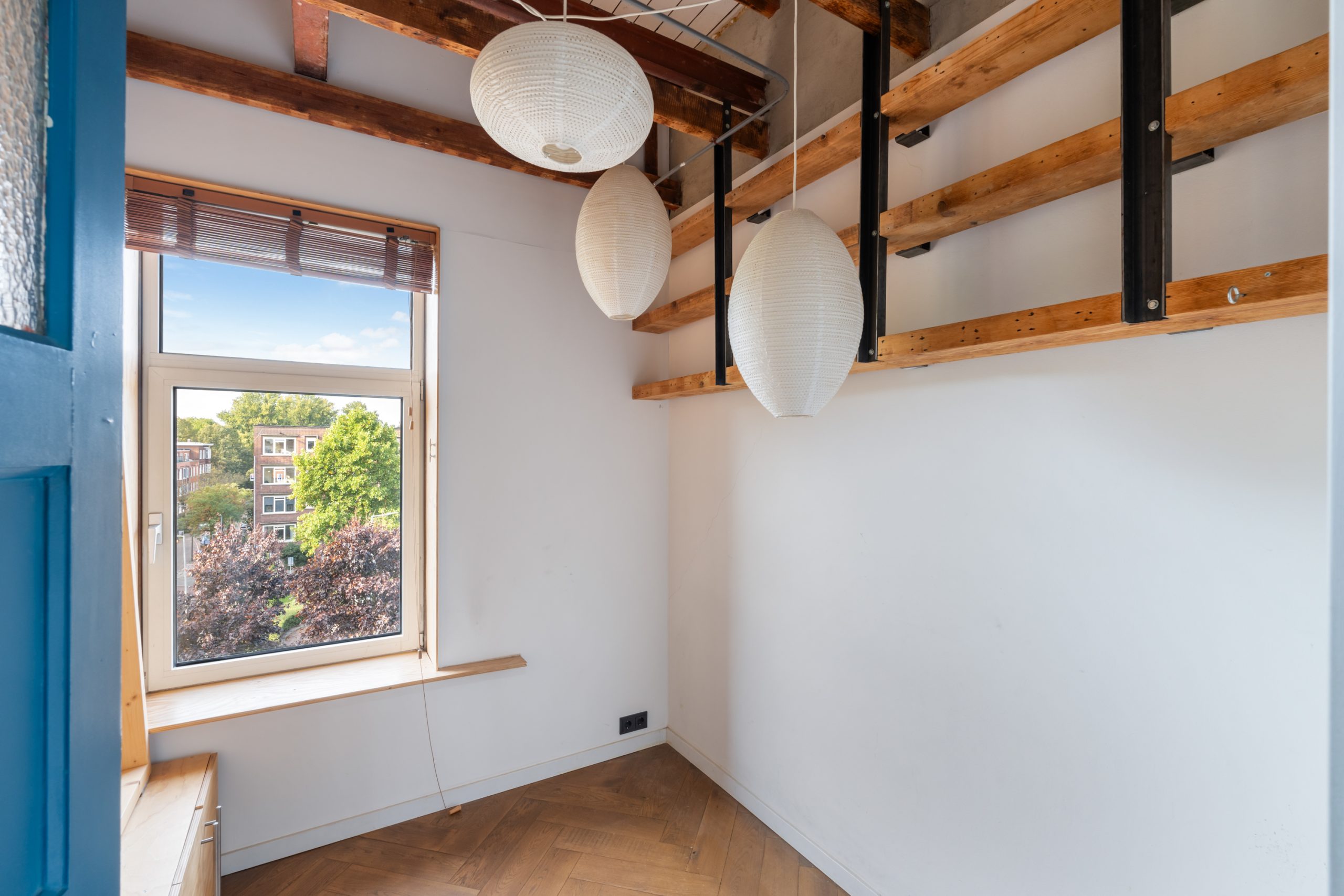 De master bedroom met vaste kasten is gelegen op de bovenste verdieping en heeft een mooie uitkijk over de skyline van Rotterdam. In de ruimte staat een hoge tafel en biedt een prettige werkplek, waar je in alle rust kunt werken. Dankzij de lichte kasten en de grote raampartijen voelt de ruimte bijzonder licht en rustgevend aan, met een prettige, open sfeer. Via een schuifdeur bereik je het dakterras. Het dakterras ziet er erg verzorgd uit en beschikt over een jacuzzi, buitendouche, kraan en genoeg ruimte voor een riante loungeset.