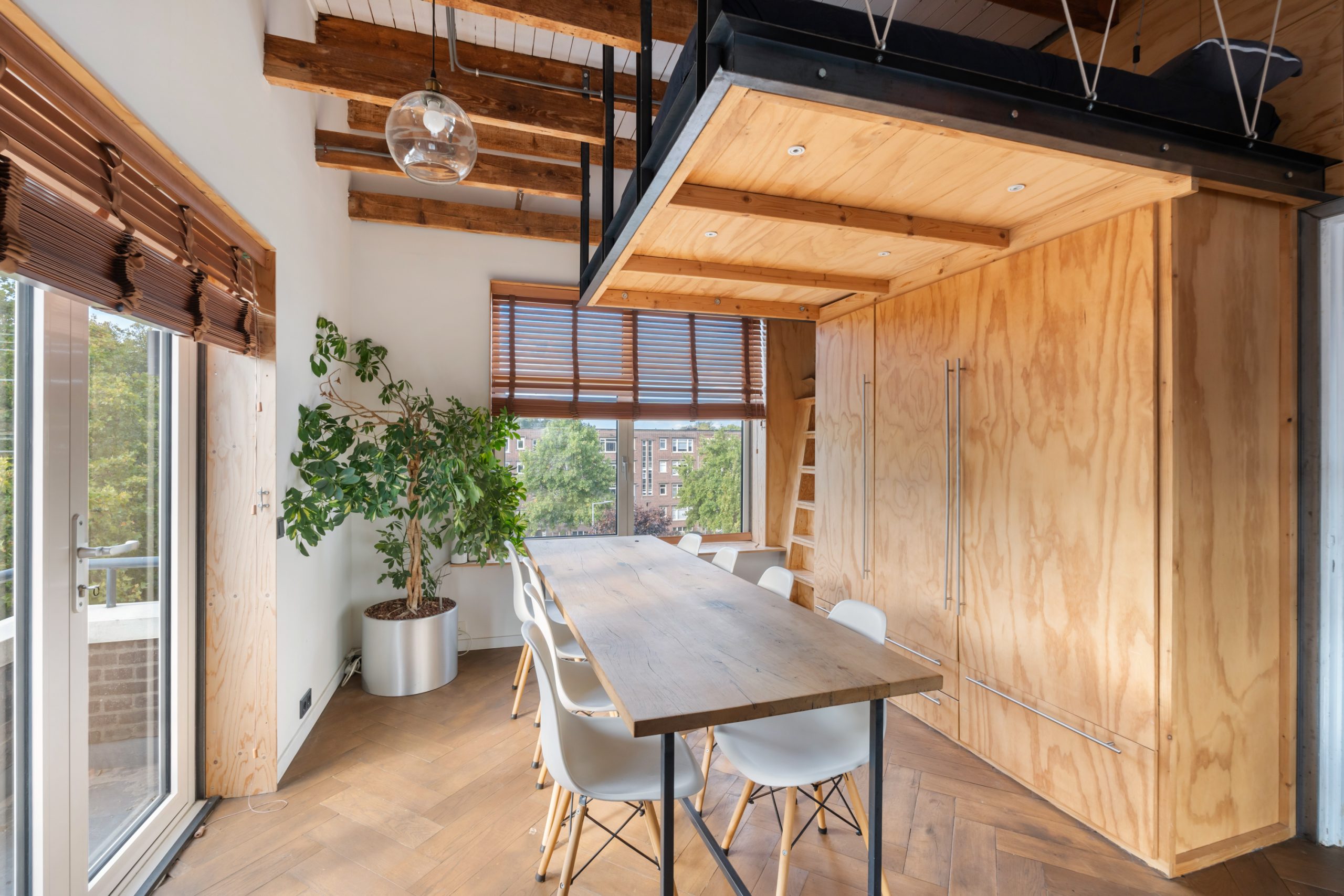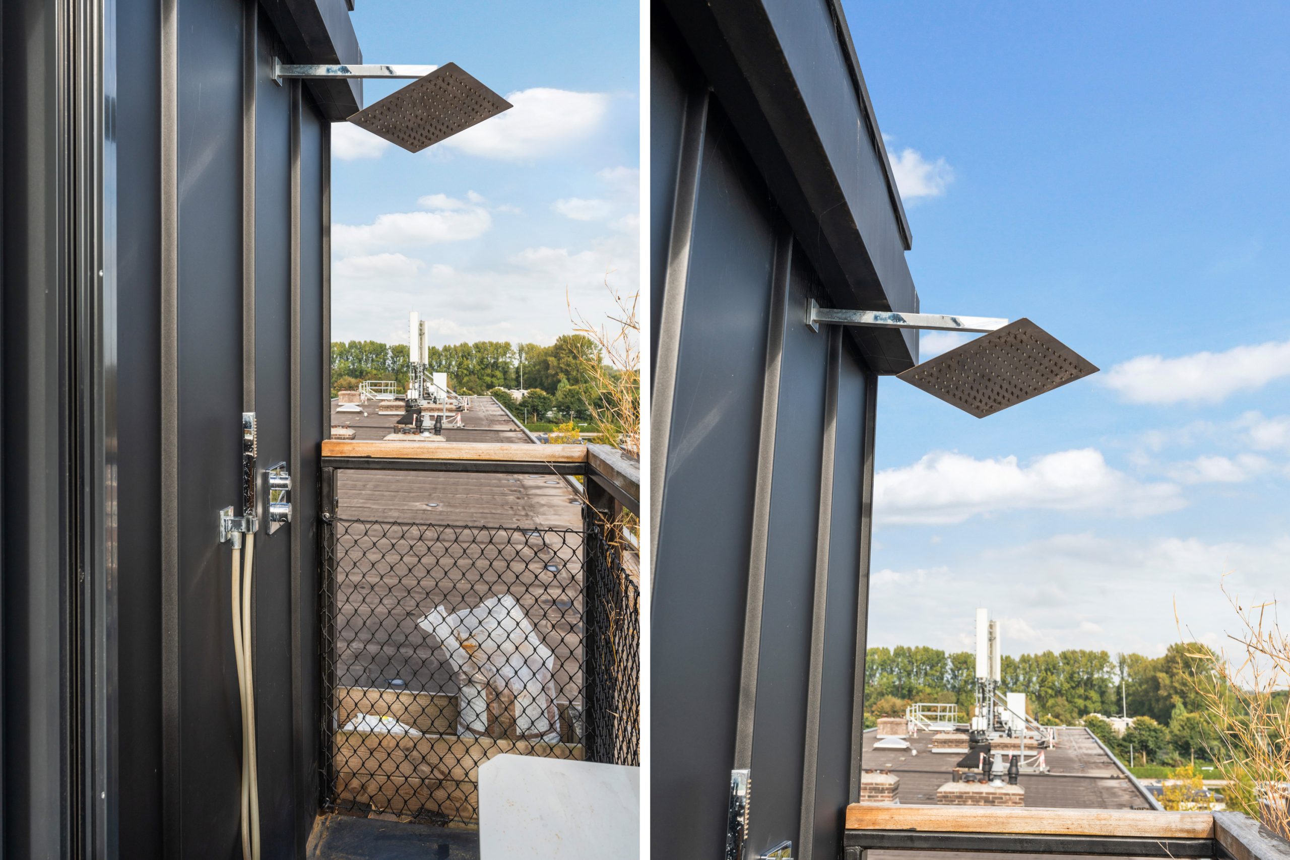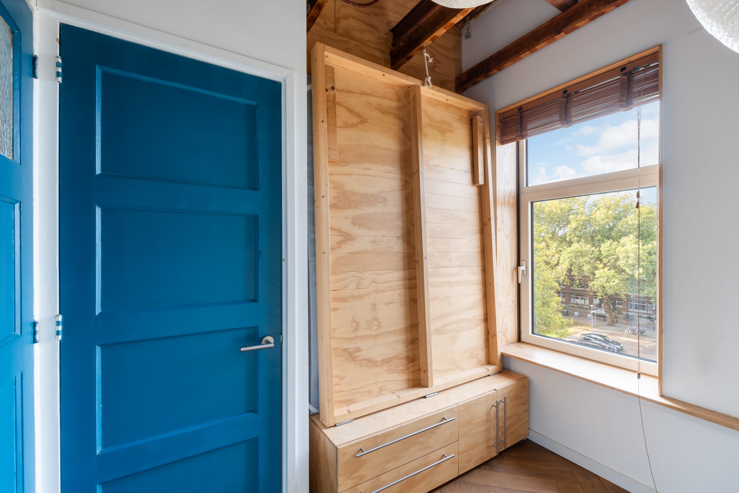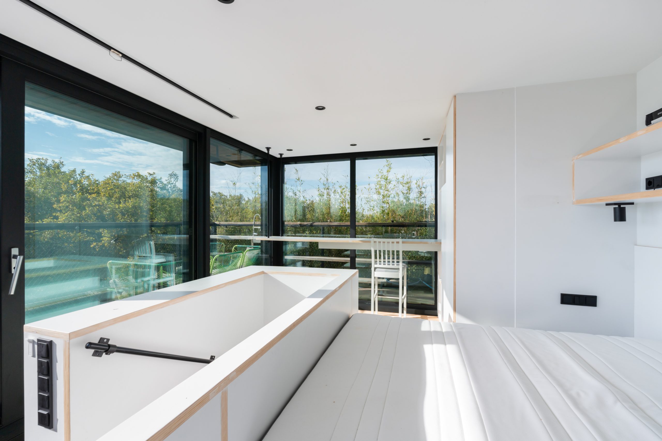 De master bedroom met vaste kasten is gelegen op de bovenste verdieping en heeft een mooie uitkijk over de skyline van Rotterdam. In de ruimte staat een hoge tafel en biedt een prettige werkplek, waar je in alle rust kunt werken. Dankzij de lichte kasten en de grote raampartijen voelt de ruimte bijzonder licht en rustgevend aan, met een prettige, open sfeer. Via een schuifdeur bereik je het dakterras. Het dakterras ziet er erg verzorgd uit en beschikt over een jacuzzi, buitendouche, kraan en genoeg ruimte voor een riante loungeset.