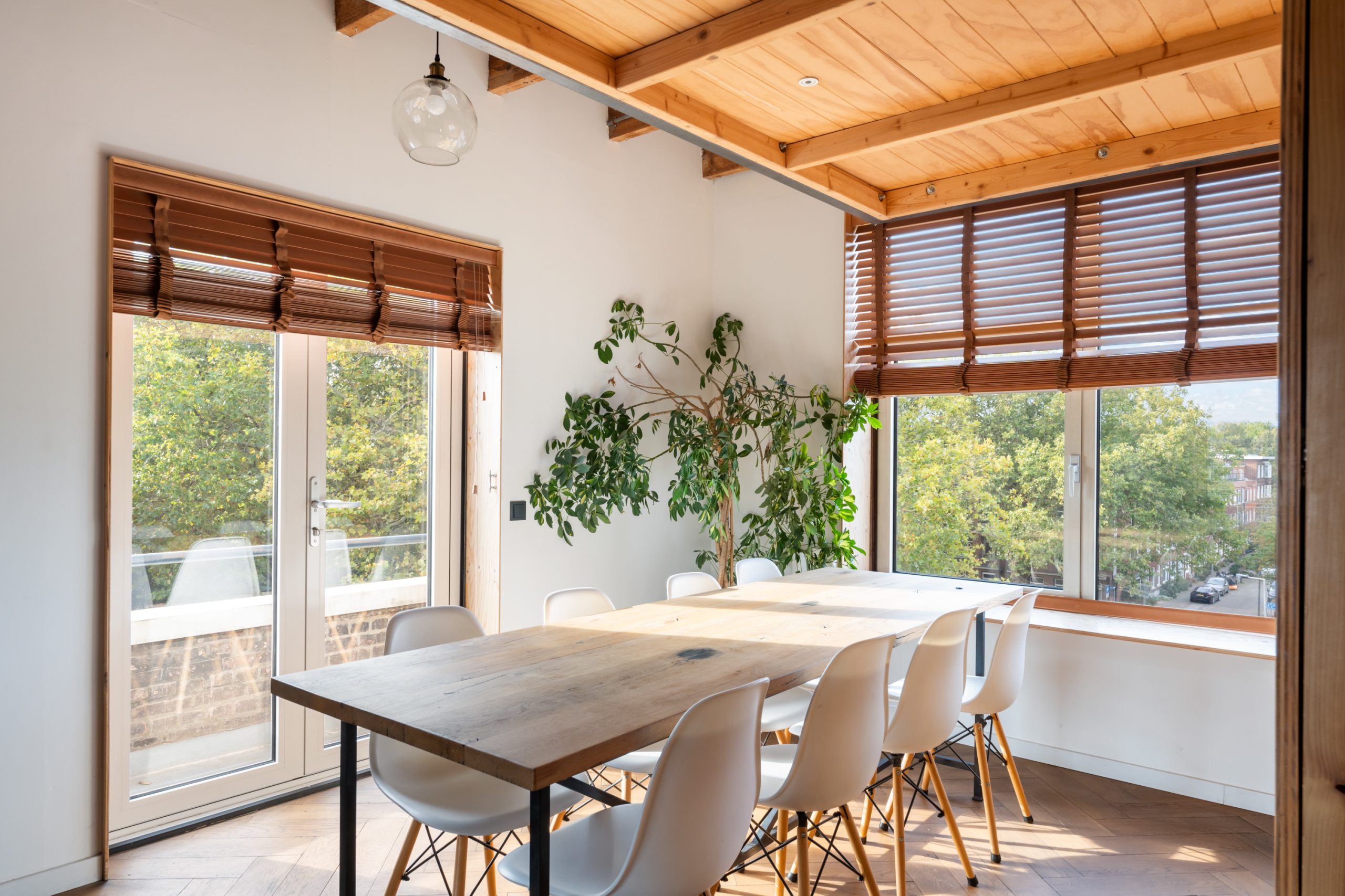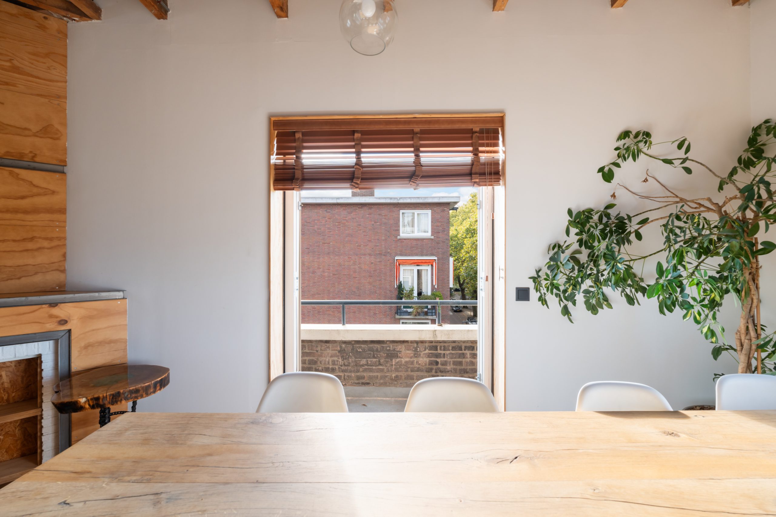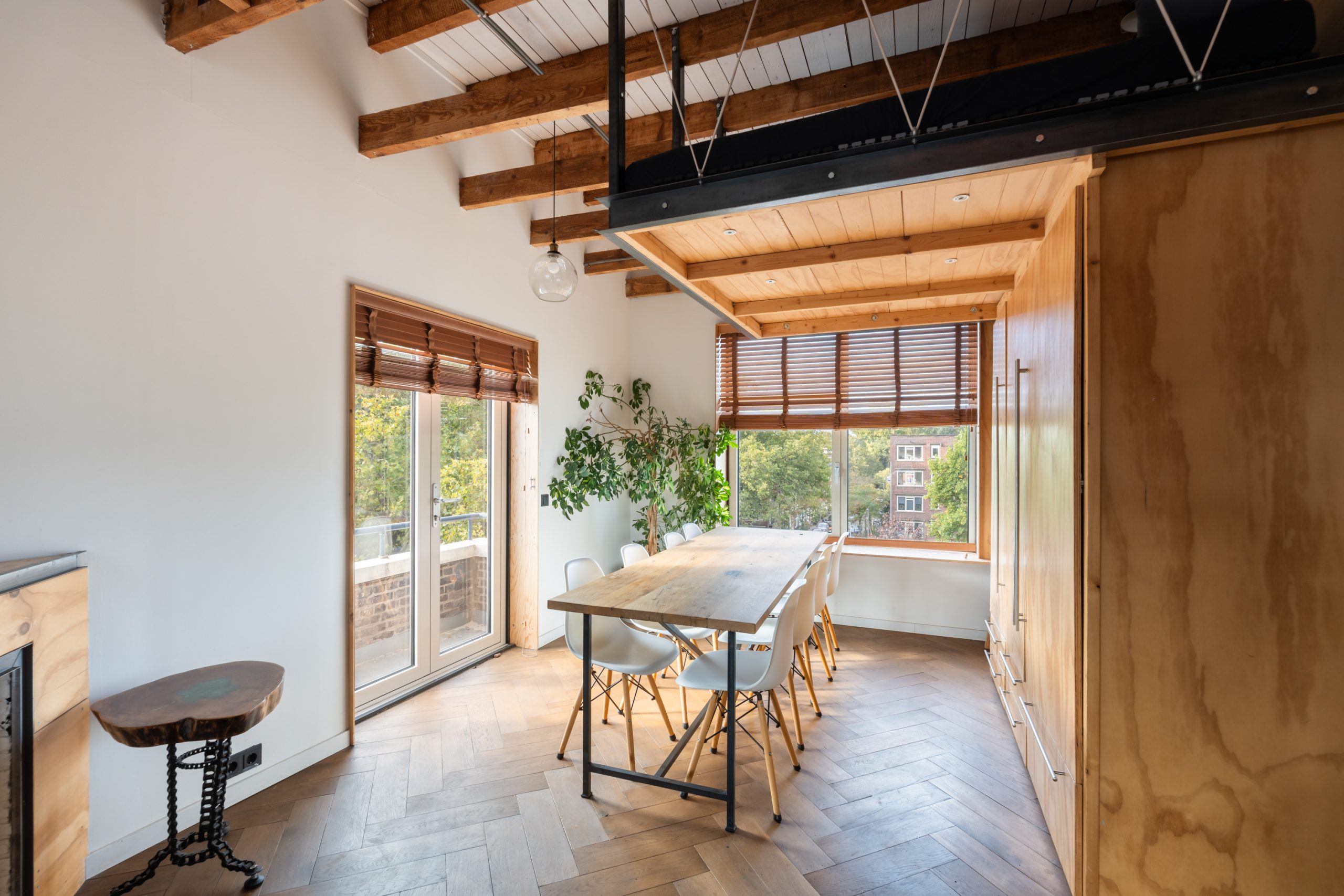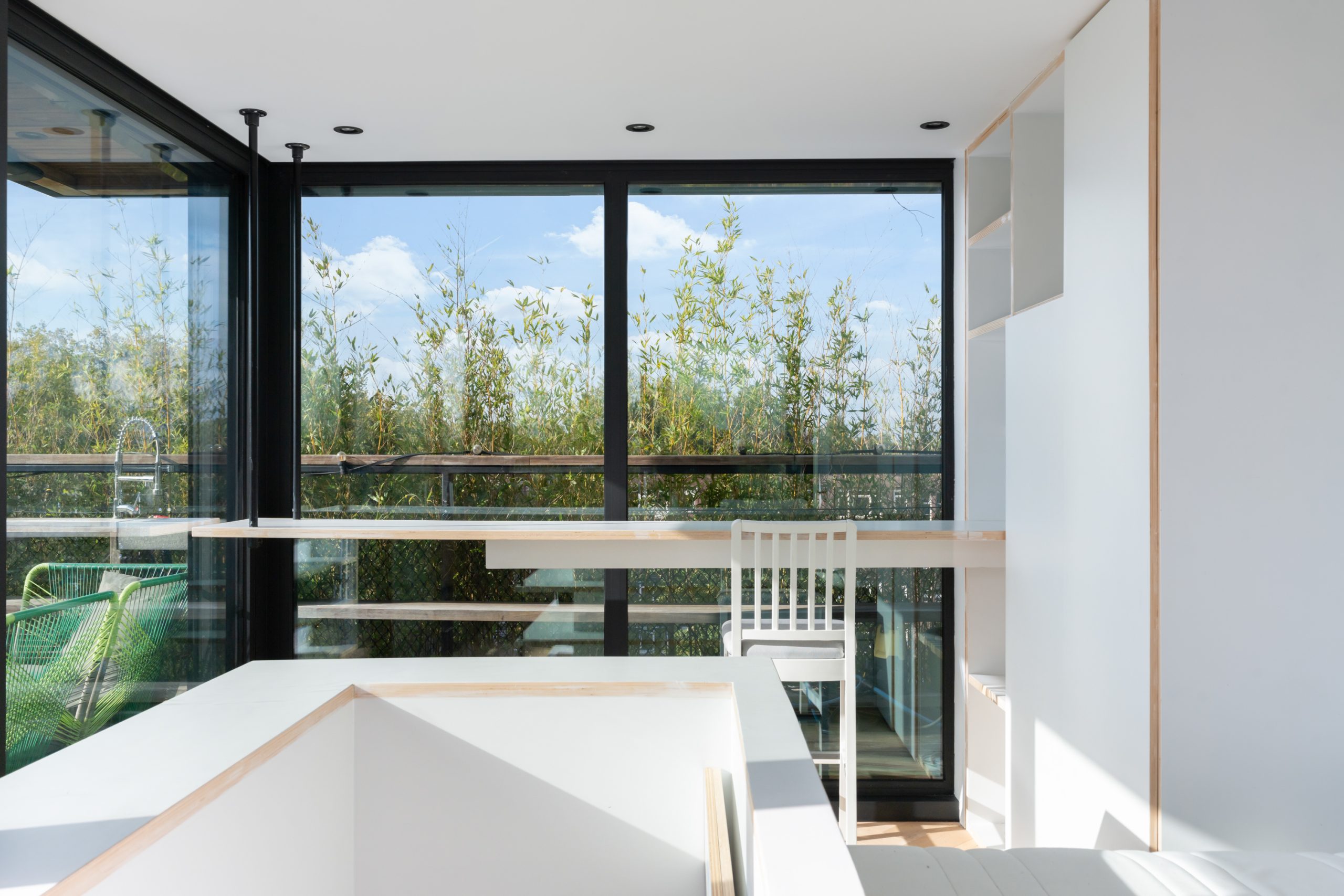 De master bedroom met vaste kasten is gelegen op de bovenste verdieping en heeft een mooie uitkijk over de skyline van Rotterdam. In de ruimte staat een hoge tafel en biedt een prettige werkplek, waar je in alle rust kunt werken. Dankzij de lichte kasten en de grote raampartijen voelt de ruimte bijzonder licht en rustgevend aan, met een prettige, open sfeer. Via een schuifdeur bereik je het dakterras. Het dakterras ziet er erg verzorgd uit en beschikt over een jacuzzi, buitendouche, kraan en genoeg ruimte voor een riante loungeset.