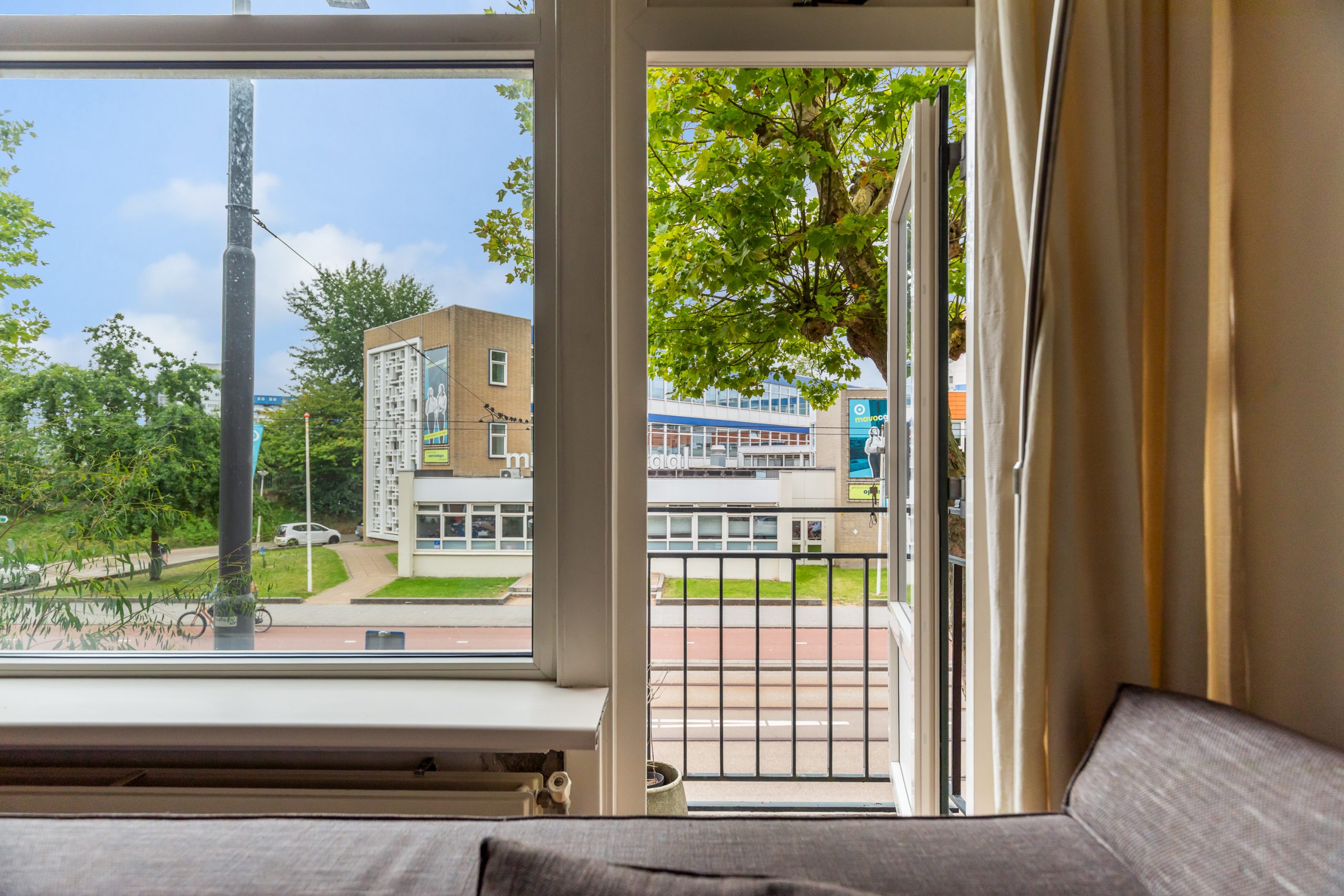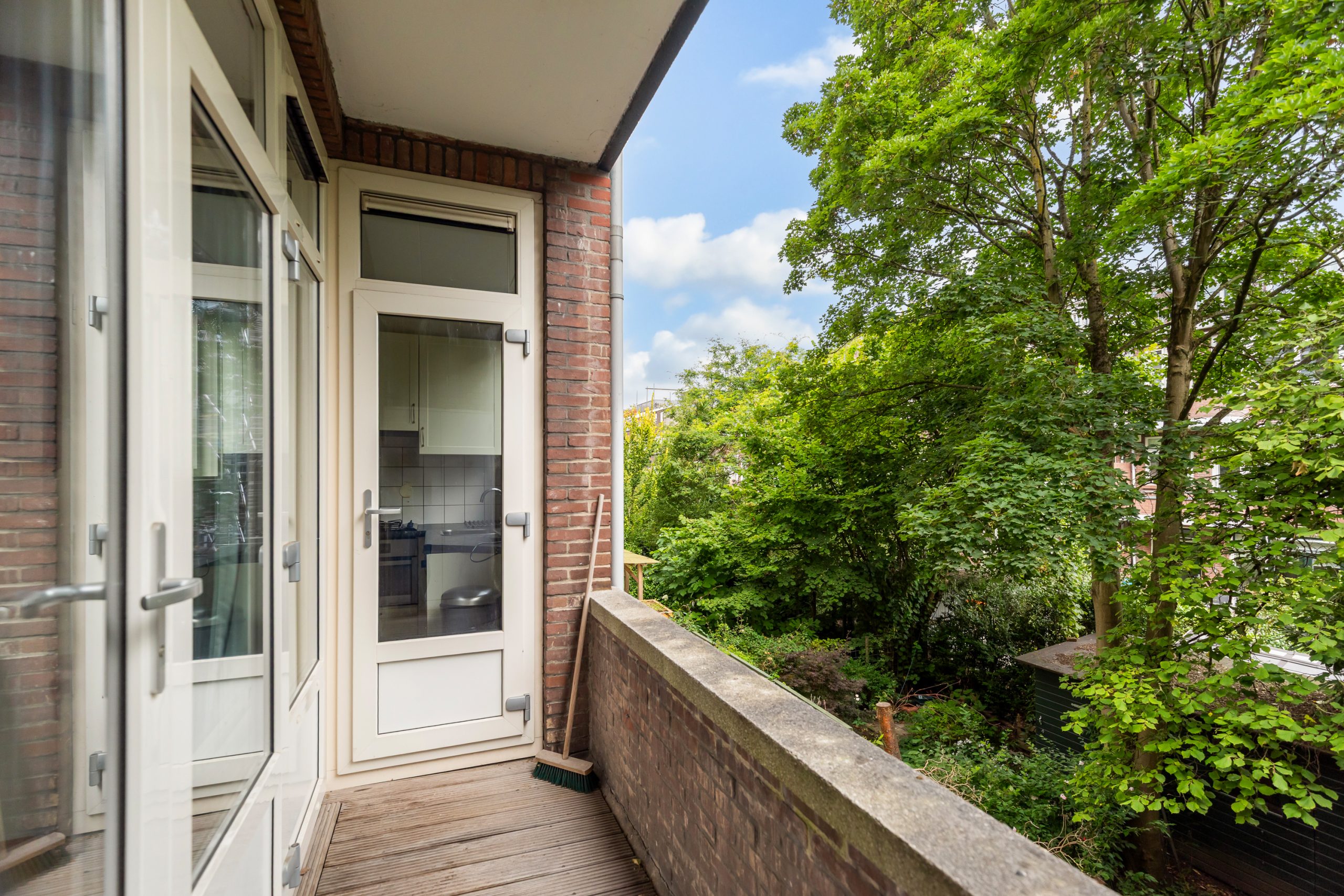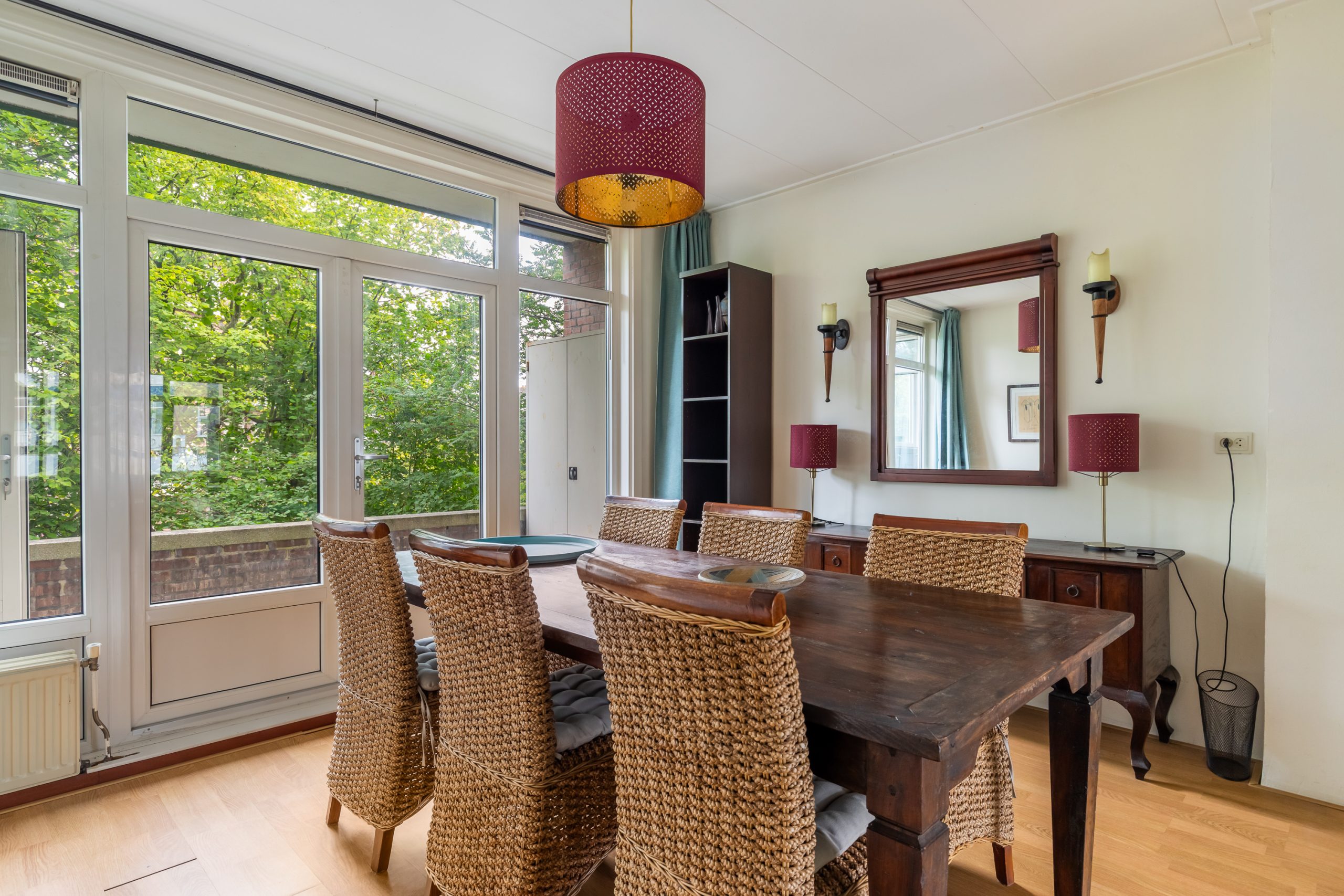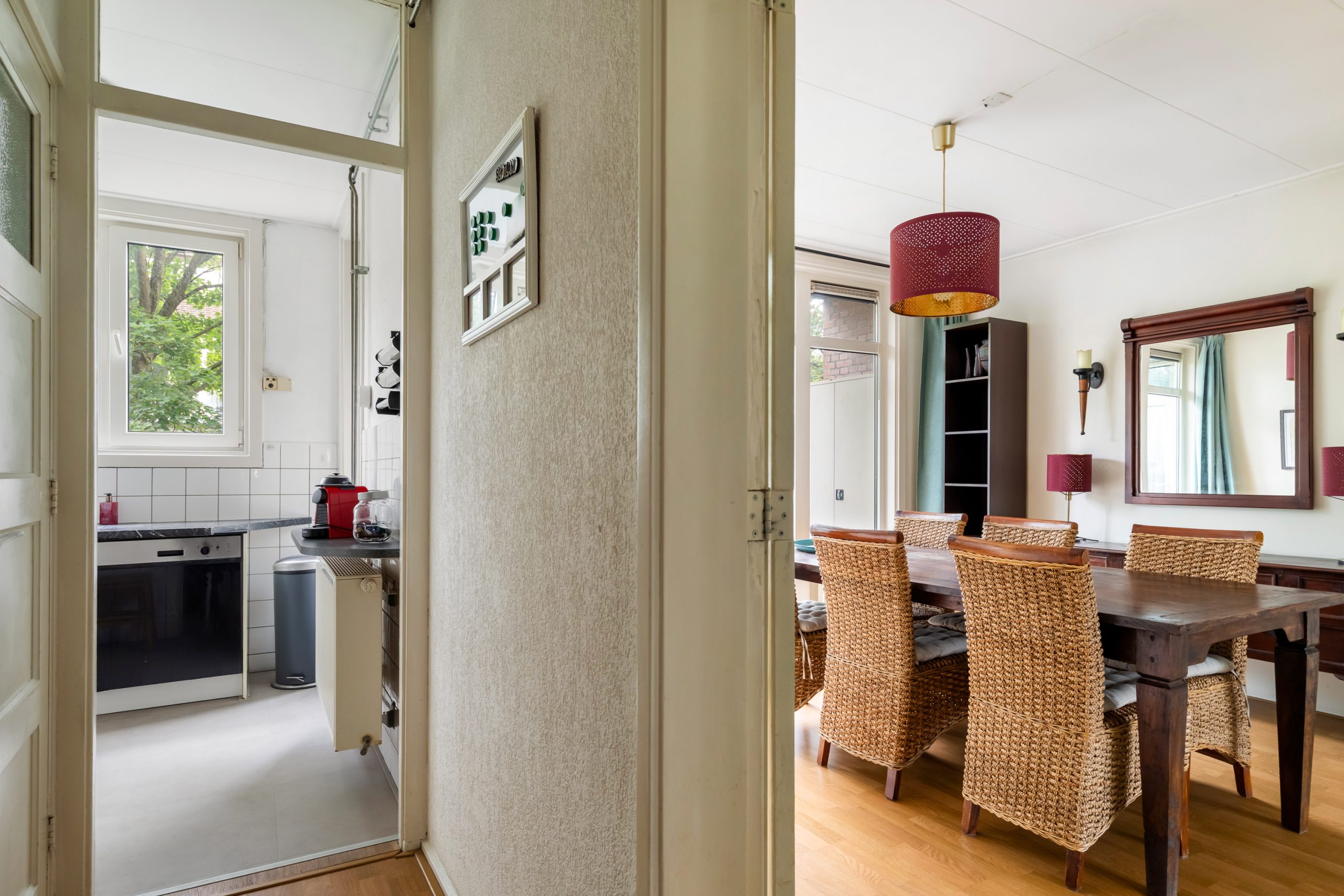 Ruime hal/entree met vaste kast, separaat toilet en toegang tot alle vertrekken op deze verdieping. De royale woonkamer en suite heeft maar liefst een lengte van ca. 12 meter! Dankzij de karakteristieke en suite schuifdeuren is de ruimte flexibel in te delen, met een mooie scheiding tussen het woongedeelte en het eetgedeelte. Dit is ideaal als je de openheid van de leefruimten wilt behouden, maar toch een visuele scheiding tussen de ruimtes wenst. Het woongedeelte is gelegen aan de voorzijde van de woning. Hier heb je toegang tot een pittoresk Frans balkon, gelegen op het zuidwesten. Aan de achterzijde van de woning bevindt zich het eetgedeelte. Via openslaande deuren bereik je het 2e balkon, gelegen op het noordoosten. ’s Morgens kun je hier heerlijk genieten van een kop koffie en de zon! De keuken beschikt over diverse inbouwapparatuur, zoals een 4-pits gasfornuis met afzuigkap, oven, vaatwasser en een koel-/vriescombinatie. Middels een deur in de keuken heb je ook toegang tot het balkon aan de achterzijde. Aan de voorzijde van de woning bevindt zich een lichte werkkamer, ideaal als thuiswerkplek, studeerruimte of hobbykamer.