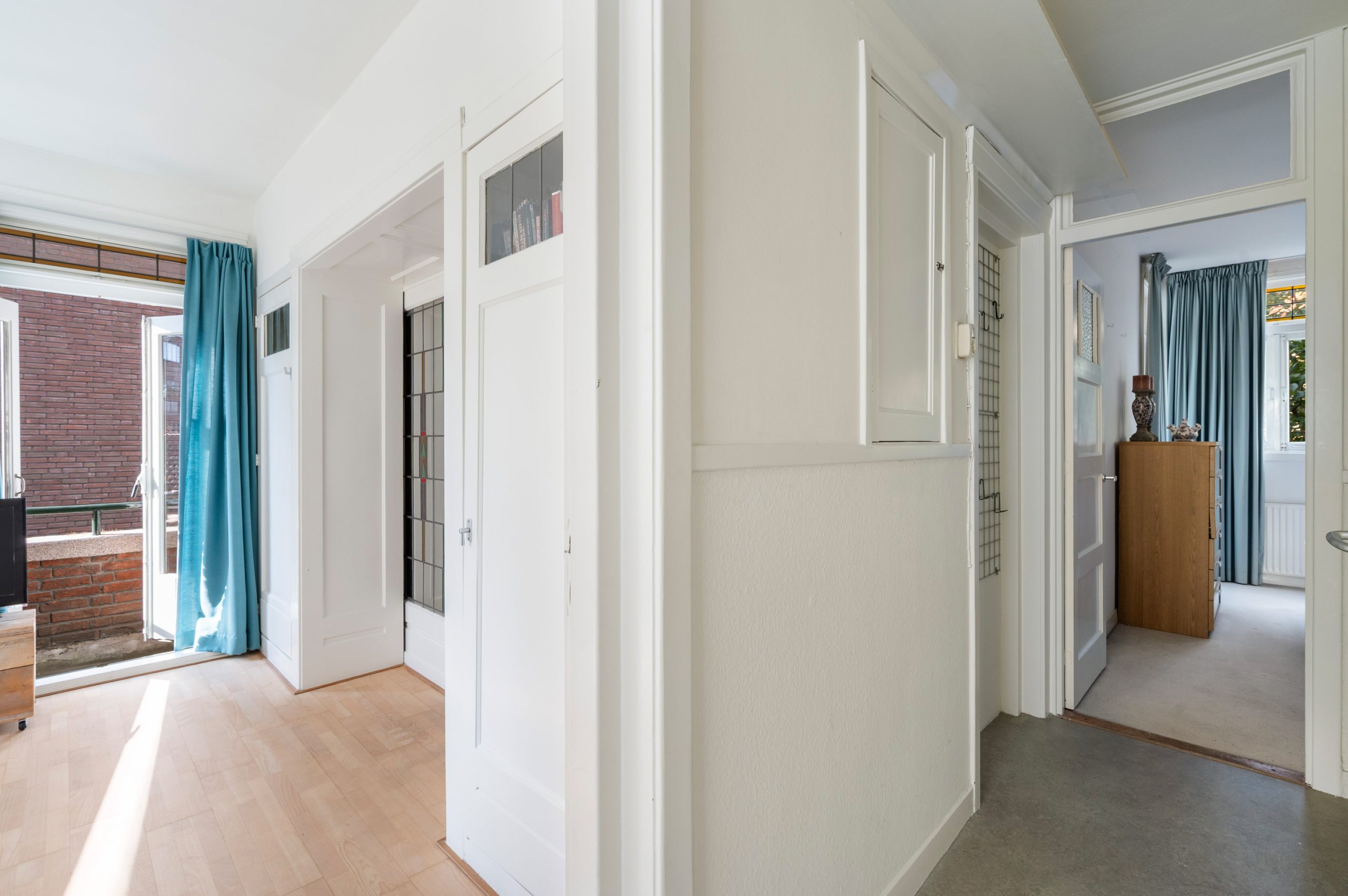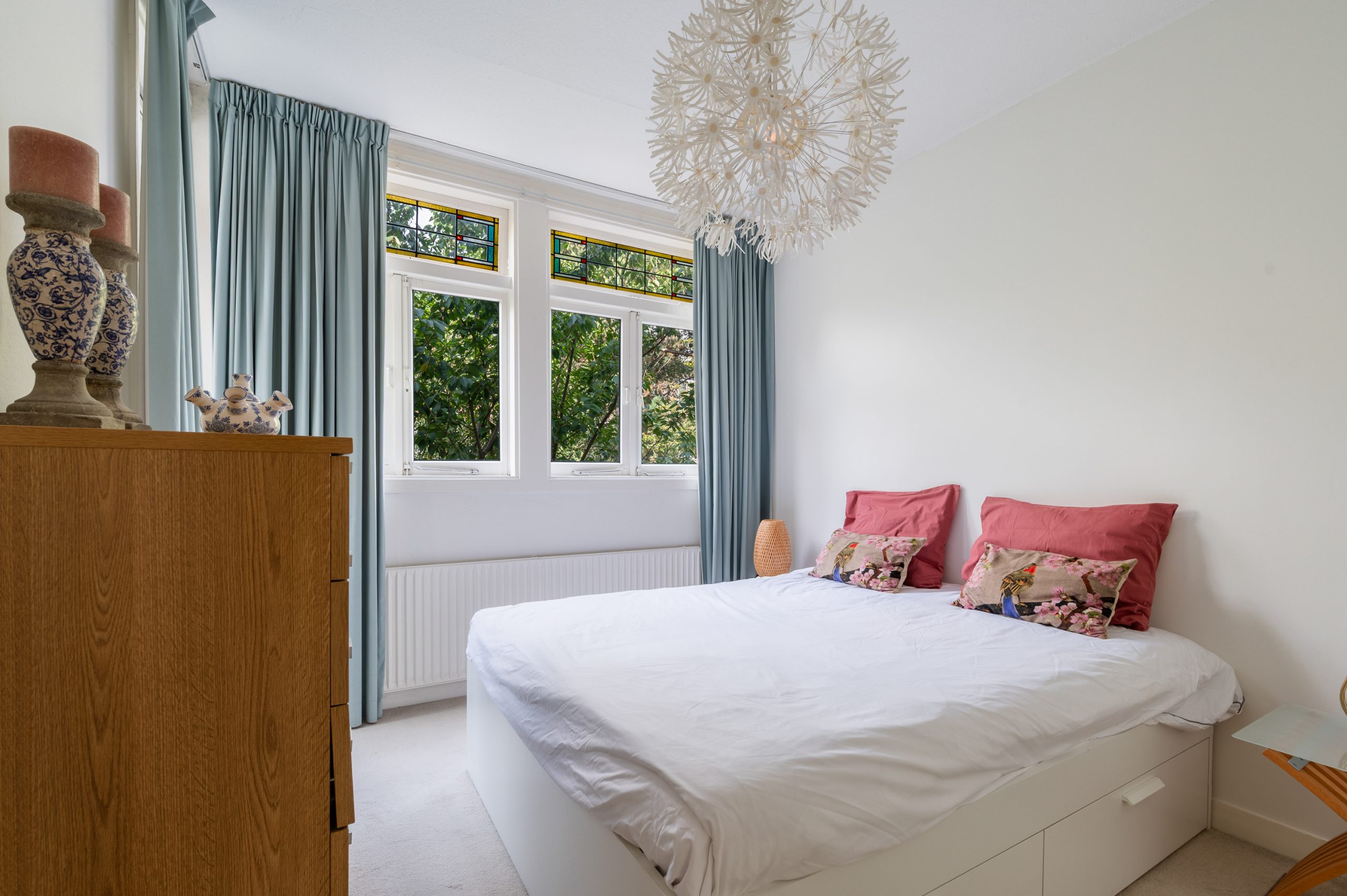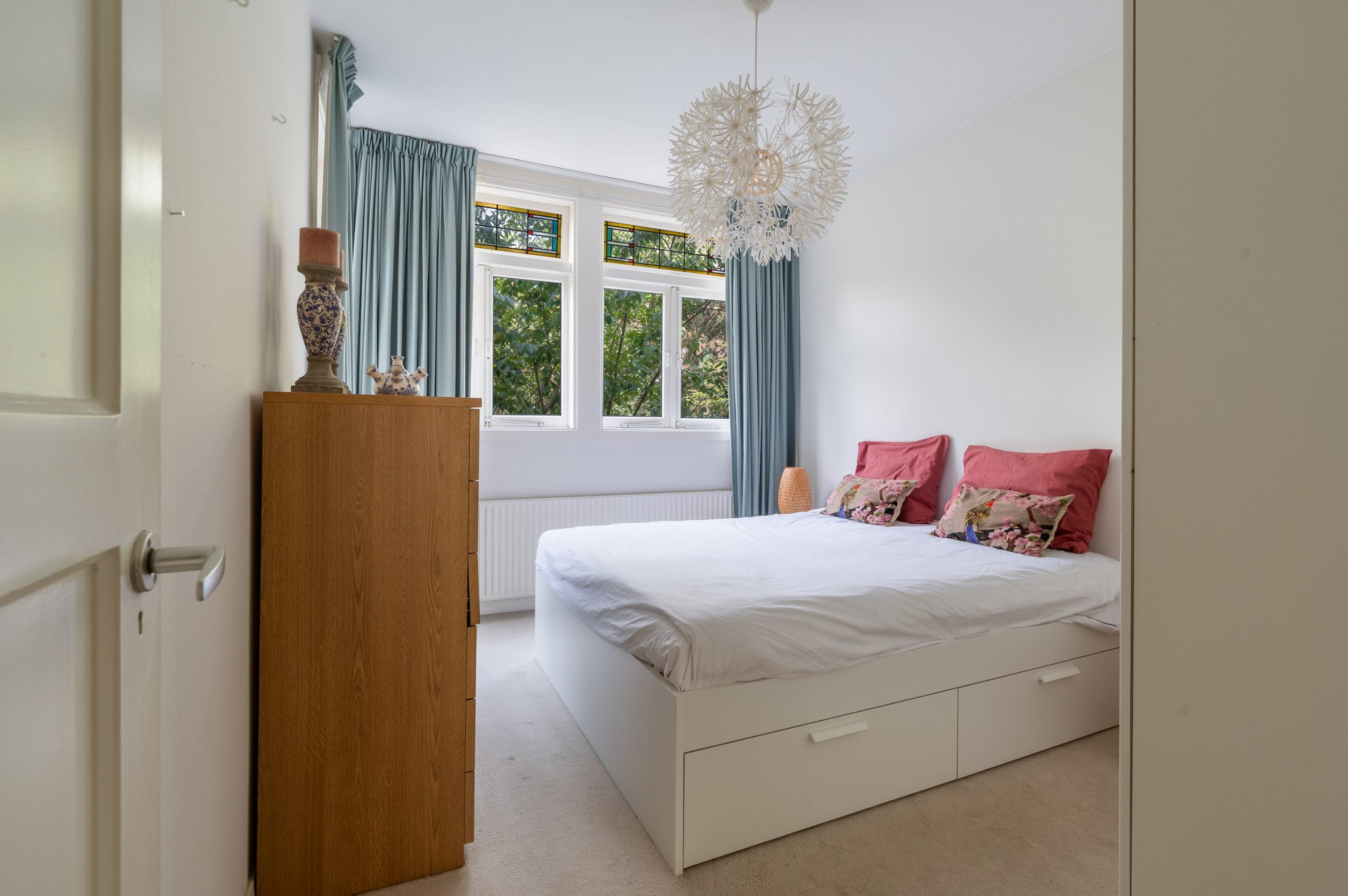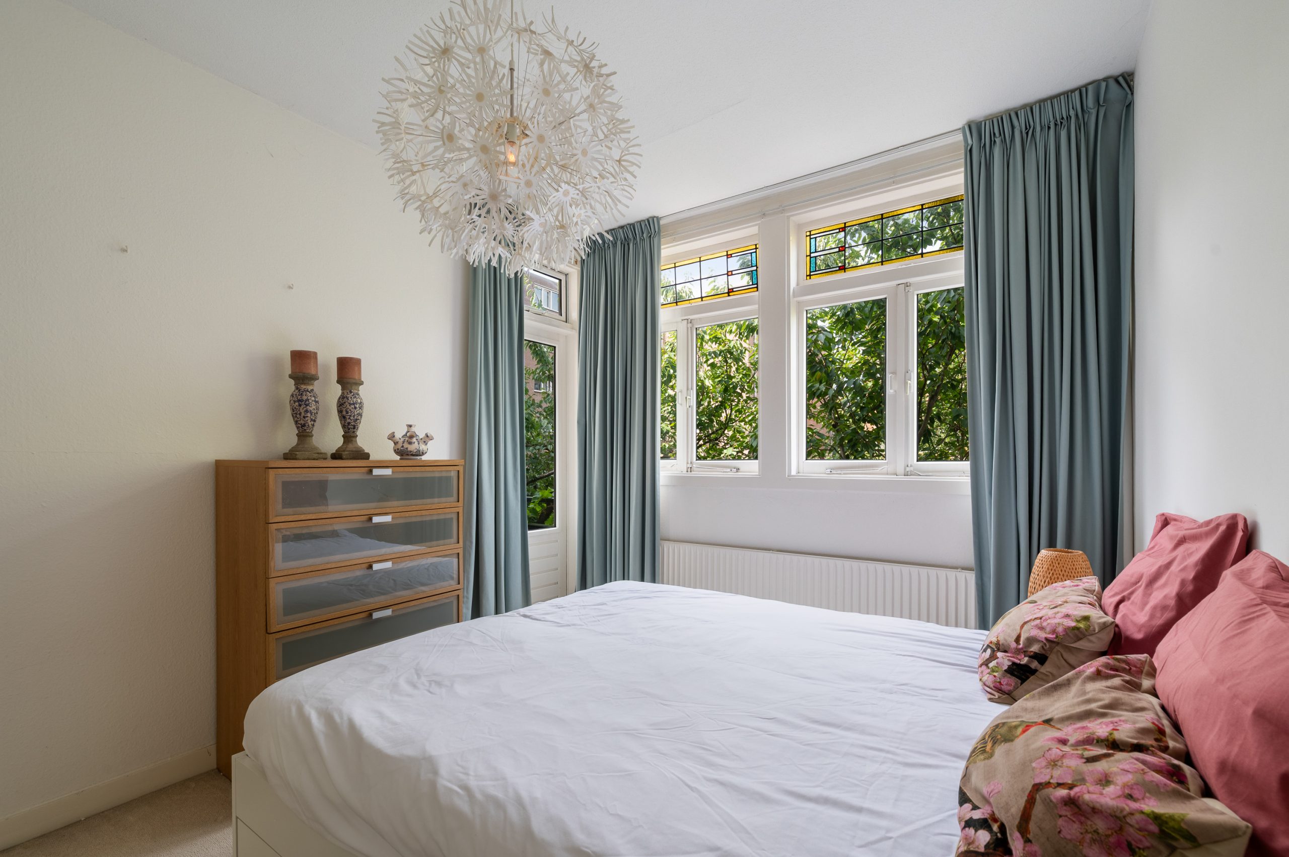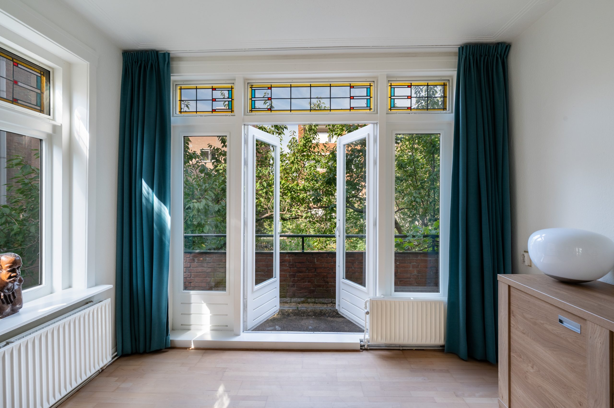 Ruime hal/entree met bergkast, meterkast en toegang tot alle vertrekken. De woonkamer is gelegen aan de voorzijde en heeft mede door de hoekligging een prachtige natuurlijke lichtinval. Wat direct opvalt zijn de originele jaren ’30 details zoals de glas-in-lood ramen, paneeldeuren, schouw en de en suite, wat het ontzettend sfeervol maakt. Het balkon aan de zijkant van het appartement zorgt voor een mooie verbinding tussen het binnen- en buitenleven. Door de en suite (met 4 inbouwkasten en CV-opstelling) wordt het woongedeelte gescheiden van het eetgedeelte. Indien gewenst, kan hier ook een extra slaapkamer worden gecreëerd. Vanuit de eetkamer bereik je het 2e balkon, gelegen op het zonnige westen. De nette keuken is gelegen aan de voorzijde en beschikt over diverse inbouwapparatuur zoals een 4-pits gasfornuis, afzuigkap oven en koel-/vriescombinatie. Ook bevindt zich in de keuken de wasmachineaansluiting. De master bedroom is gelegen aan de achterzijde en is ruim genoeg voor een tweepersoonsbed en een kledingkast. Vanuit de slaapkamer is er tevens toegang tot het balkon. Ook hier maken de glas-in-lood ramen het tot een karakteristieke ruimte. De badkamer is bereikbaar vanuit de hal en is voorzien van een douche, wastafel en toilet.