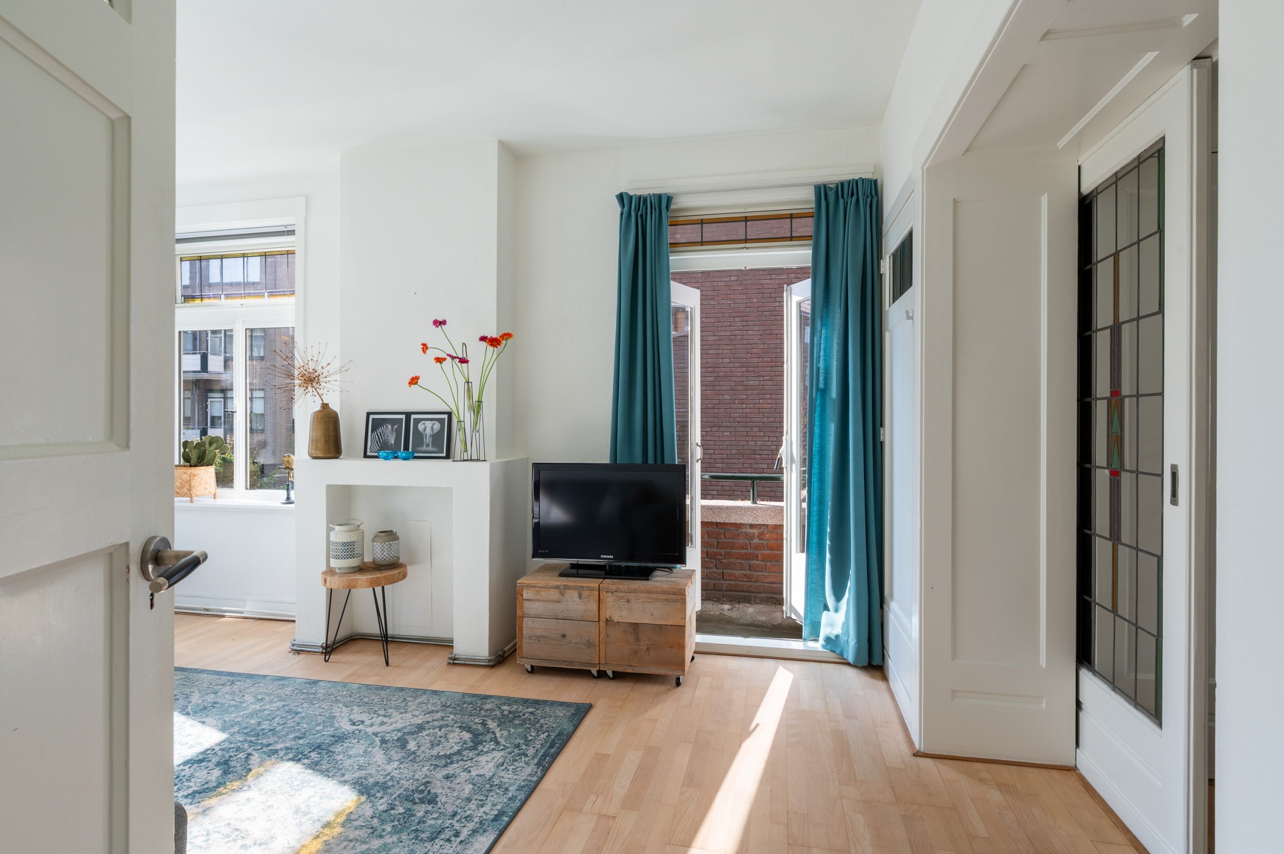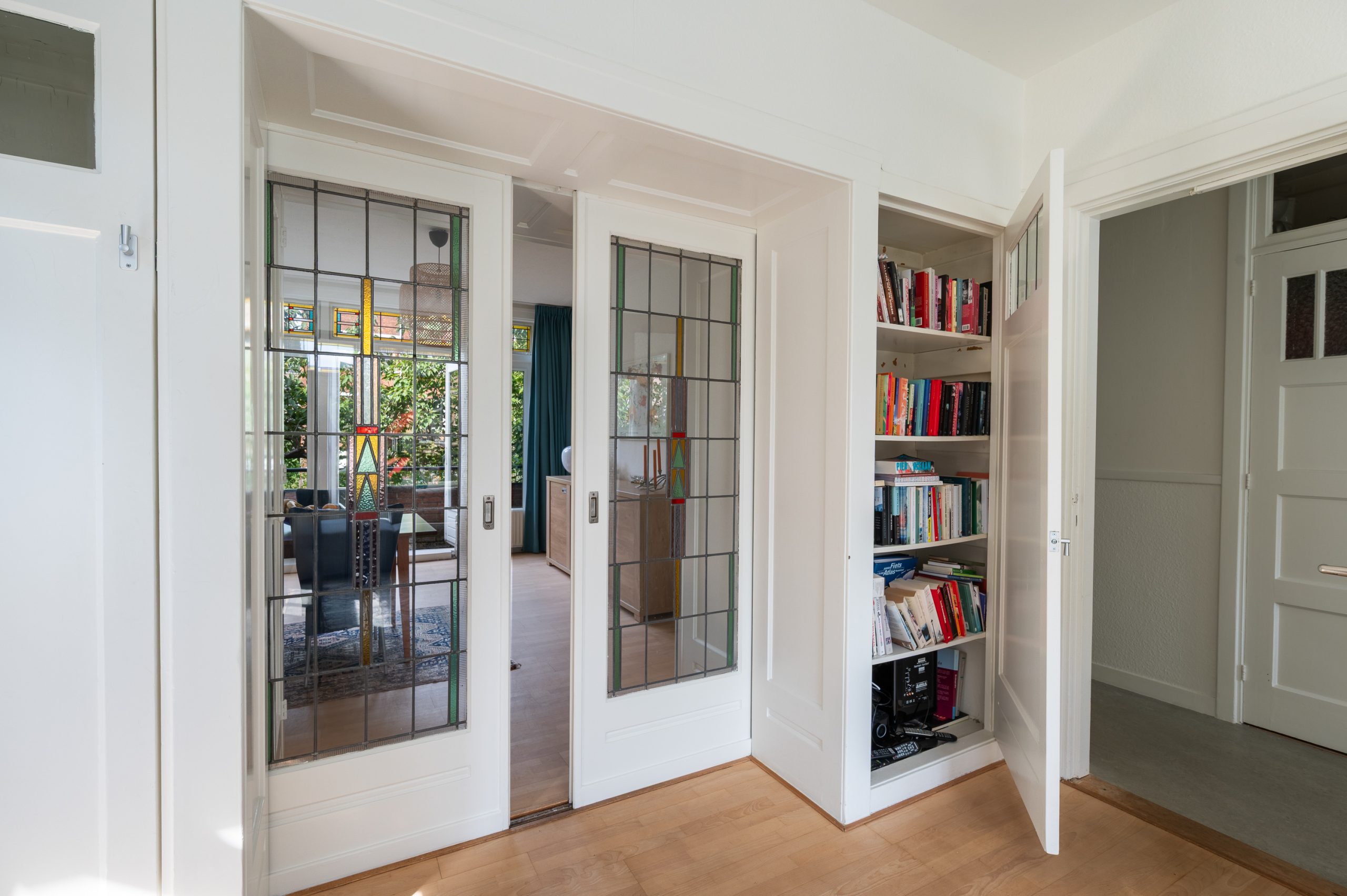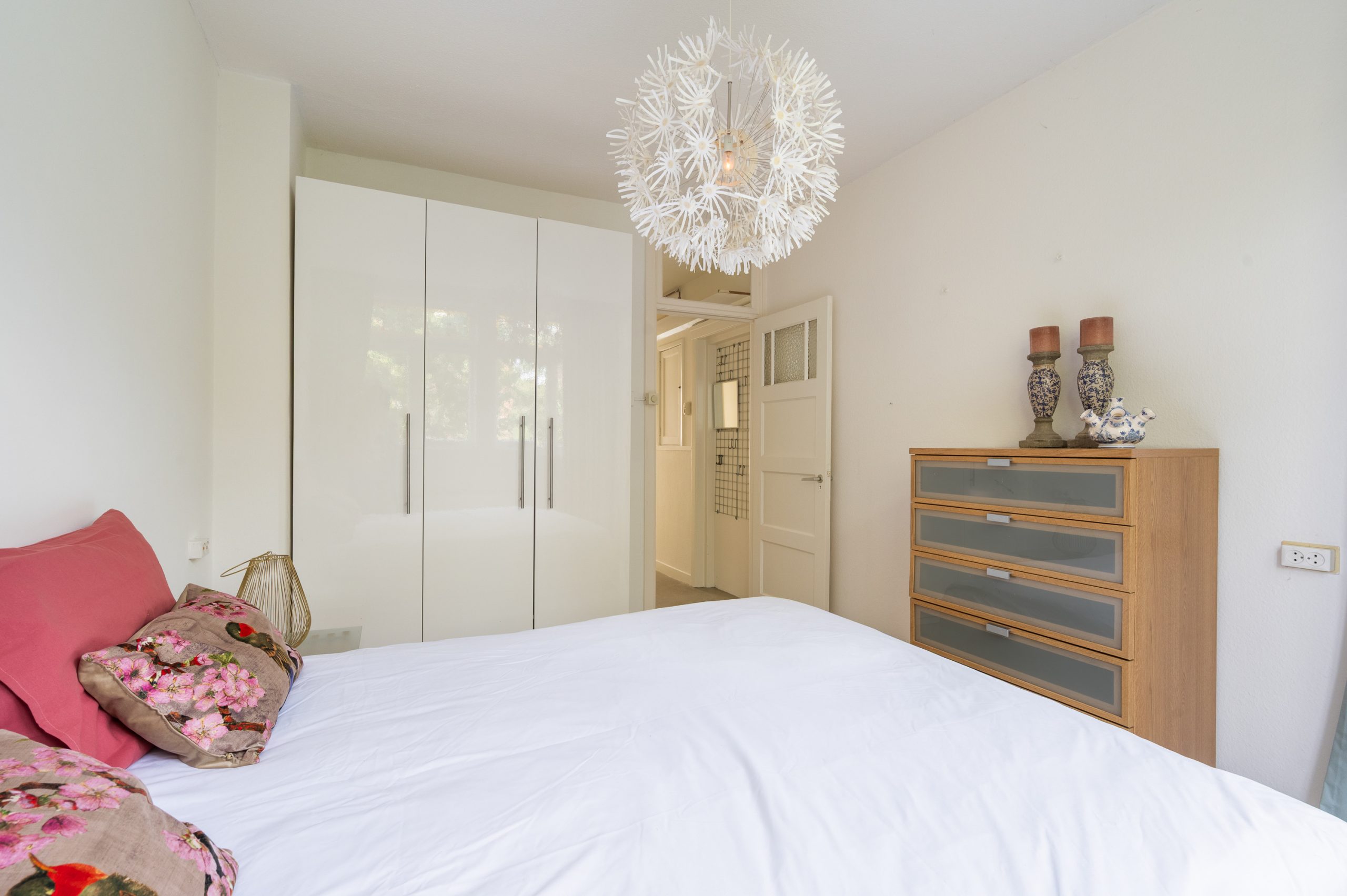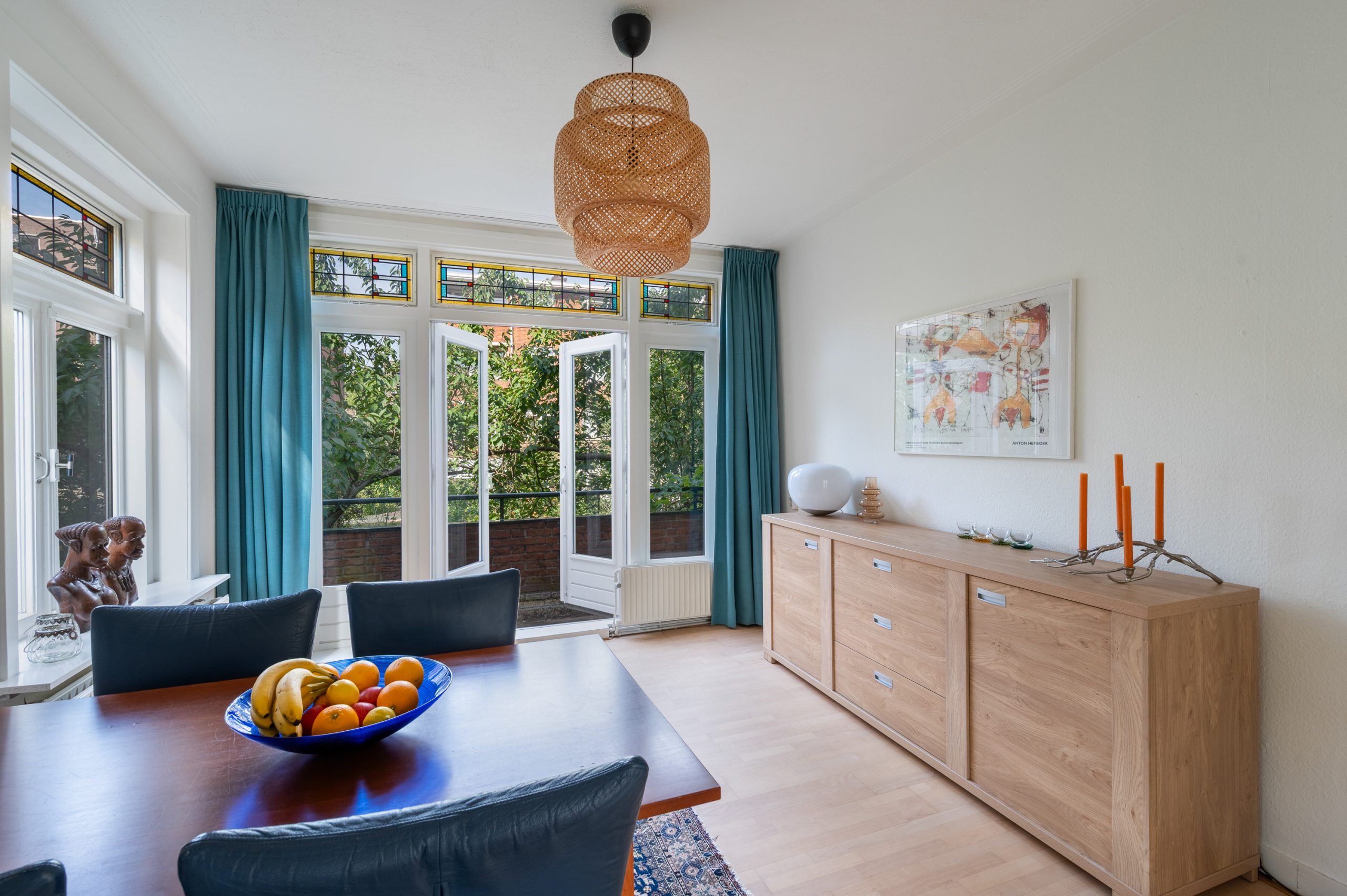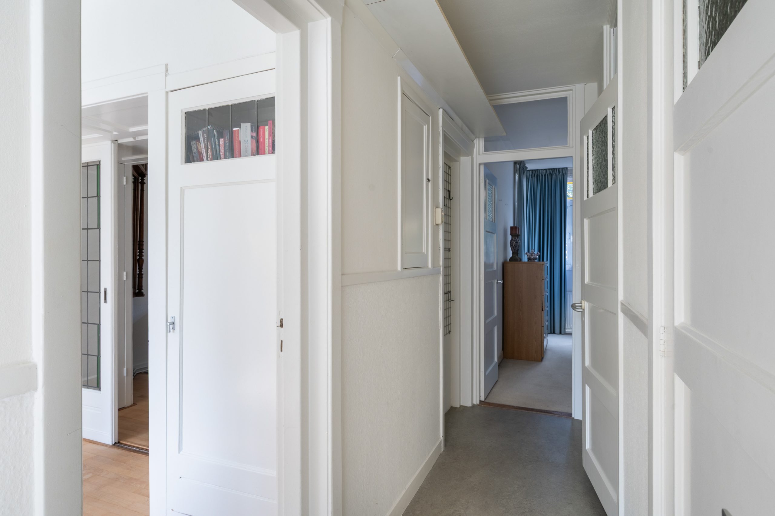 Ruime hal/entree met bergkast, meterkast en toegang tot alle vertrekken. De woonkamer is gelegen aan de voorzijde en heeft mede door de hoekligging een prachtige natuurlijke lichtinval. Wat direct opvalt zijn de originele jaren ’30 details zoals de glas-in-lood ramen, paneeldeuren, schouw en de en suite, wat het ontzettend sfeervol maakt. Het balkon aan de zijkant van het appartement zorgt voor een mooie verbinding tussen het binnen- en buitenleven. Door de en suite (met 4 inbouwkasten en CV-opstelling) wordt het woongedeelte gescheiden van het eetgedeelte. Indien gewenst, kan hier ook een extra slaapkamer worden gecreëerd. Vanuit de eetkamer bereik je het 2e balkon, gelegen op het zonnige westen. De nette keuken is gelegen aan de voorzijde en beschikt over diverse inbouwapparatuur zoals een 4-pits gasfornuis, afzuigkap oven en koel-/vriescombinatie. Ook bevindt zich in de keuken de wasmachineaansluiting. De master bedroom is gelegen aan de achterzijde en is ruim genoeg voor een tweepersoonsbed en een kledingkast. Vanuit de slaapkamer is er tevens toegang tot het balkon. Ook hier maken de glas-in-lood ramen het tot een karakteristieke ruimte. De badkamer is bereikbaar vanuit de hal en is voorzien van een douche, wastafel en toilet.