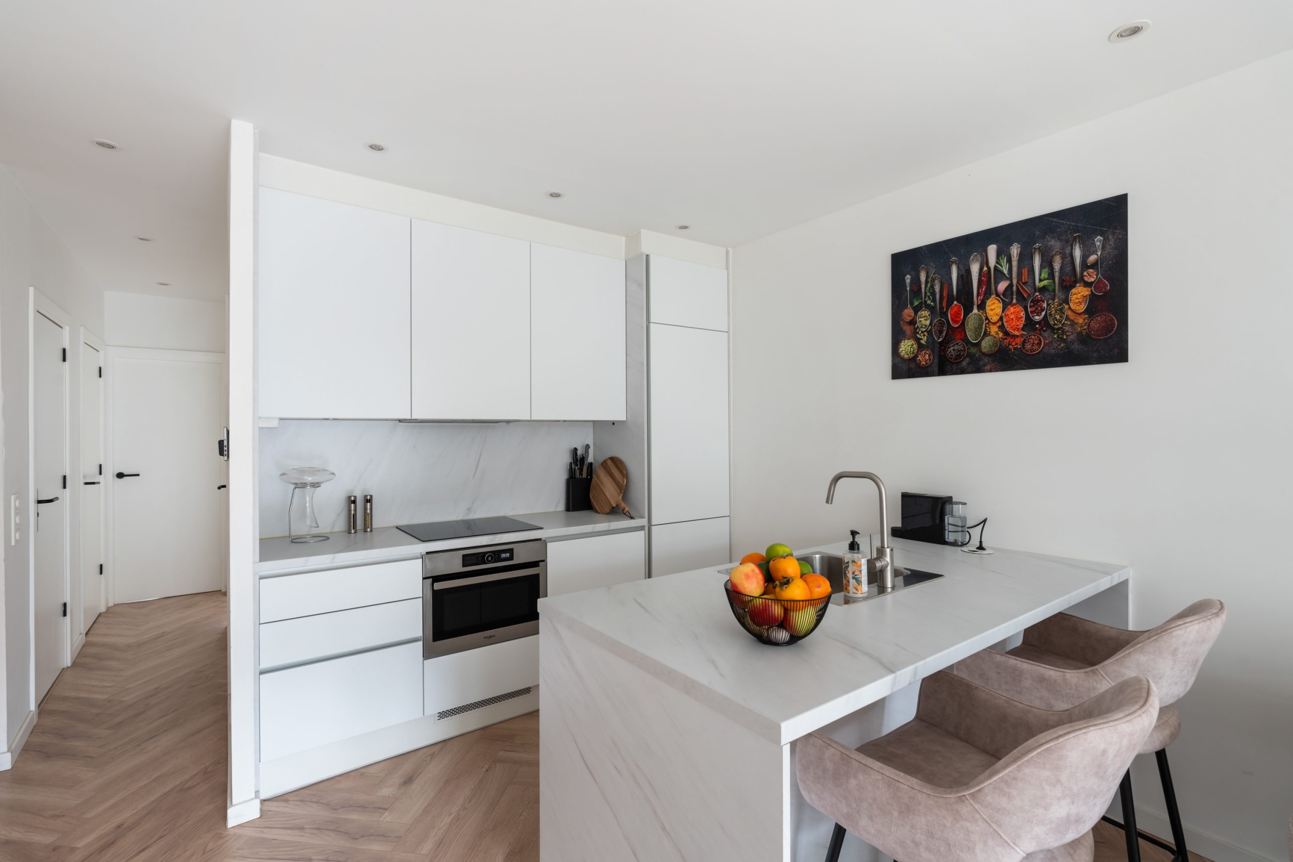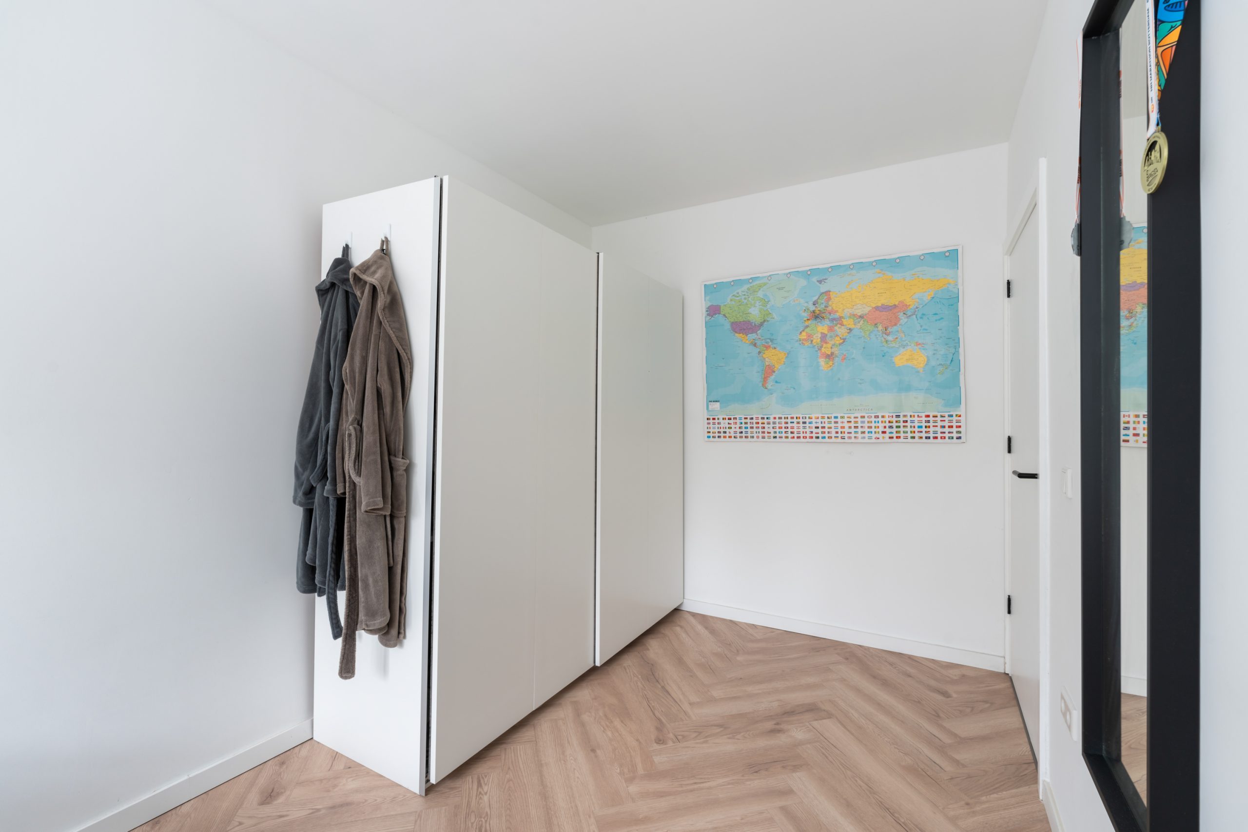 Entree met ruime overloop (separaat toilet en vaste kast) toegang tot alle vertrekken. De ruime woonkamer met open keuken is gelegen aan de voorzijde. Door de grote raampartij aan de voorzijde treedt er veel natuurlijk licht de woning binnen. Er is meer dan genoeg ruimte om een mooie zithoek te creëren. De open keuken beschikt over diverse inbouwapparatuur zoals een 4-pits elektrische kookplaat met afzuigkap, koel-/vriescombinatie, oven, vaatwasser en een spoeleiland. Via de gang zijn beide slaapkamers te bereiken. De “master bedroom” is gelegen aan de achterzijde en is erg ruim te noemen. De kamer biedt voldoende ruimte voor een royaal bed en een kast. Daarnaast ligt de tweede slaapkamer. Deze kamer is goed te gebruiken als kasten kamer of home office. Tevens biedt deze kamer toegang tot het ruime terras waar heerlijk van de ochtendzon genoten kan worden. Hier kun je op warme zomeravonden heerlijk genieten en lang tafelen met gezelschap. De volledig betegelde badkamer beschikt over een inloop(regen)douche, design handdoekradiator en een dubbelewastafel met meubel.